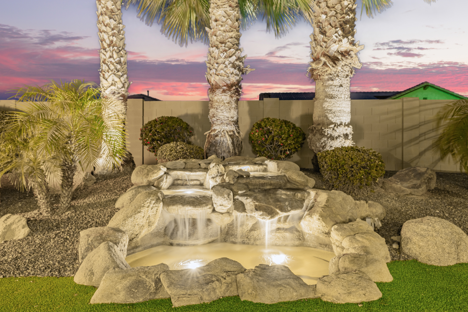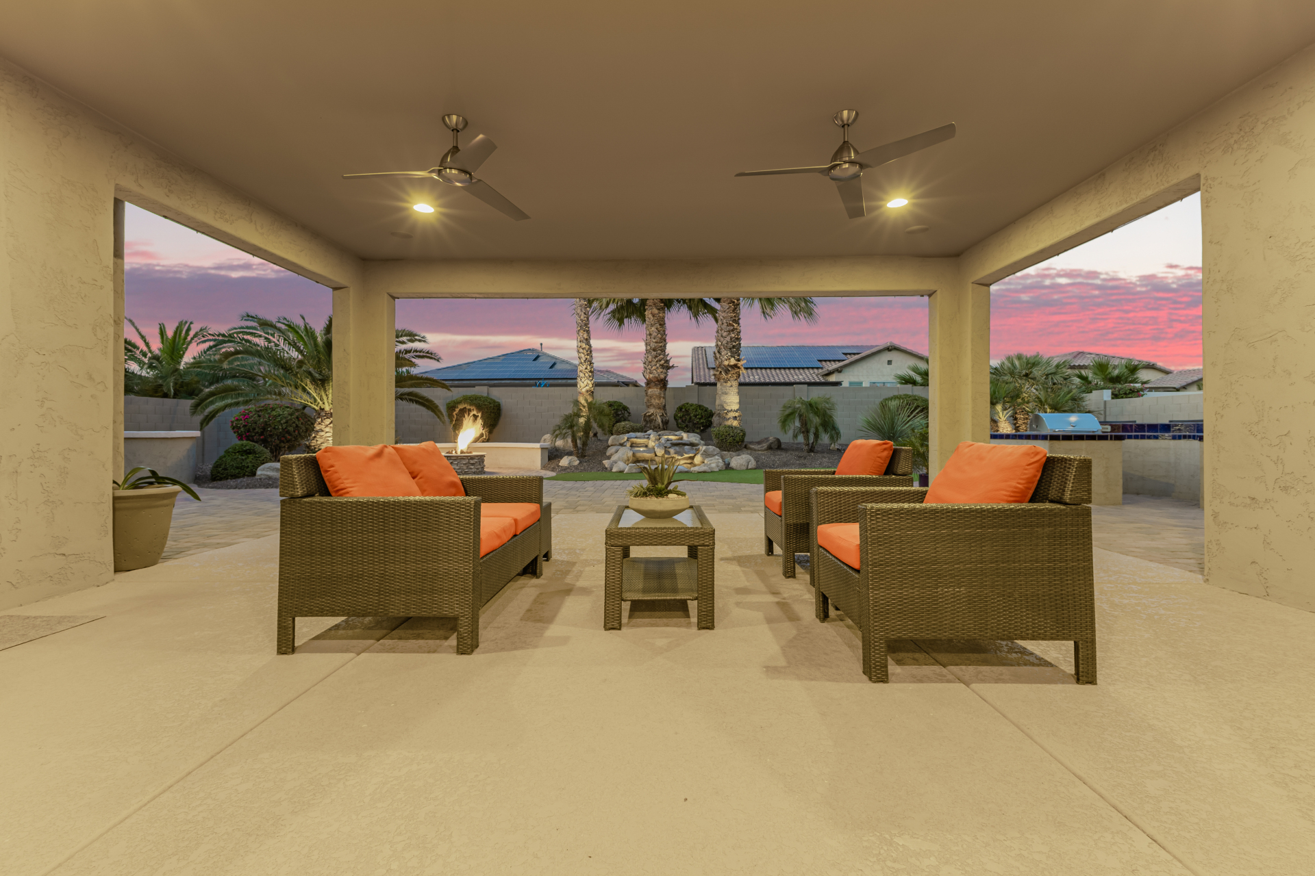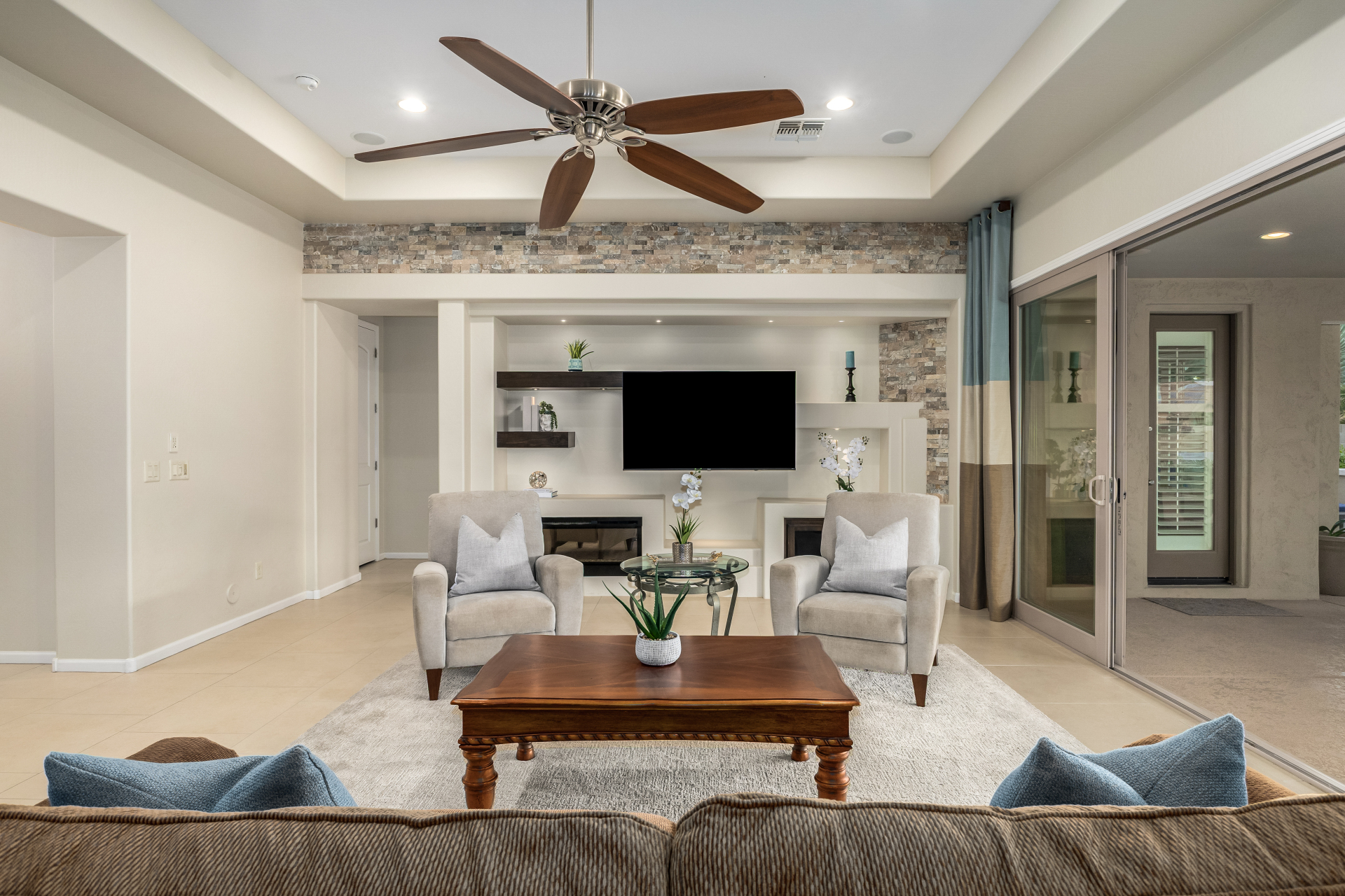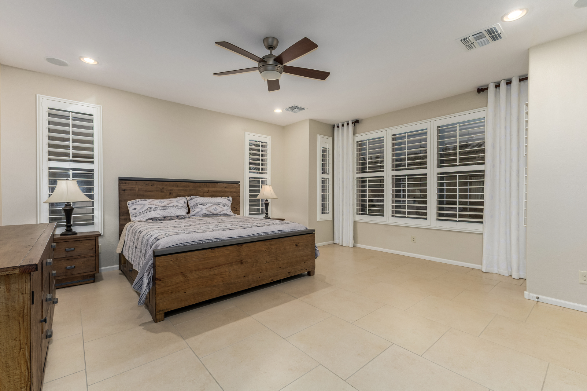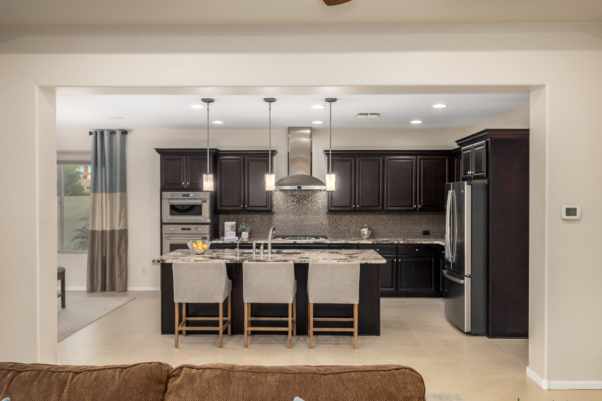 Welcome to this beautifully adorned, meticulously maintained home in PebbleCreek Golf Community. NEW Tesla Inverter and Solar Panels!! This extended Treviso model has it all! The gorgeous professional front landscape leads to the warmth of the front foyer to the open living area which allows you to take in the resort style back yard. A gourmet kitchen with large island, walk in pantry, & extended eat in kitchen makes entertaining family and friends easy! The spacious floor plan boasts 24'' tile floors throughout, Plantation Shutters, custom stacked stone feature wall with surround sound throughout the home, custom espresso kitchen cabinets with mosaic tile black splash, GE Monogram gas cook top, new refrigerator & more. Additional features include the newer garage cabinetry, epoxy garage floors, addt'l overhead storage & extended garages! OWNED SOLAR is another PLUS! Enjoy the professionally landscaped PRIVATE back yard, boasting a large covered patio with cobblestone pavers, serene rock waterfall.