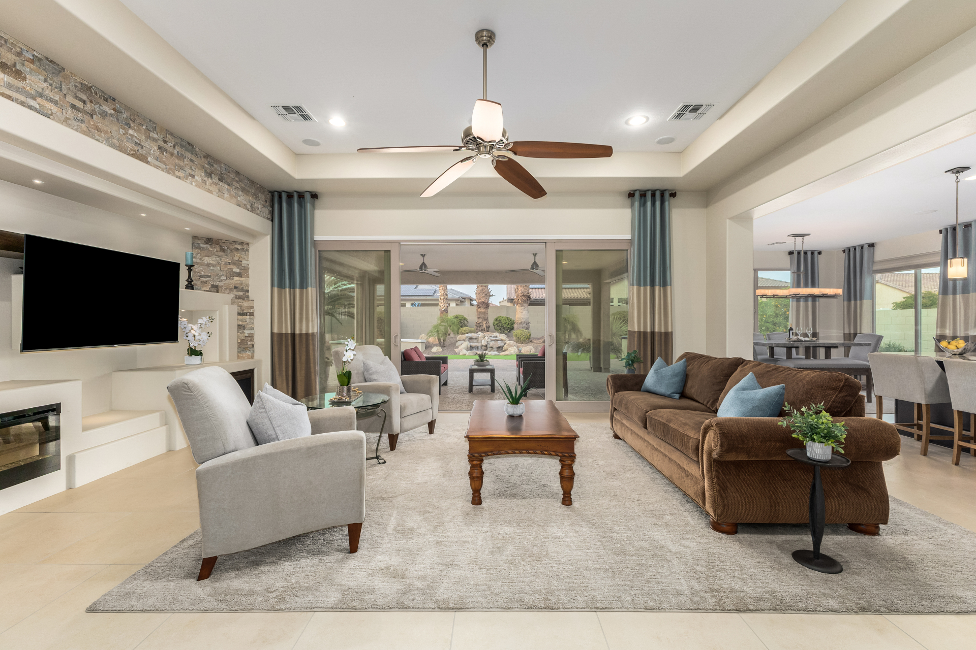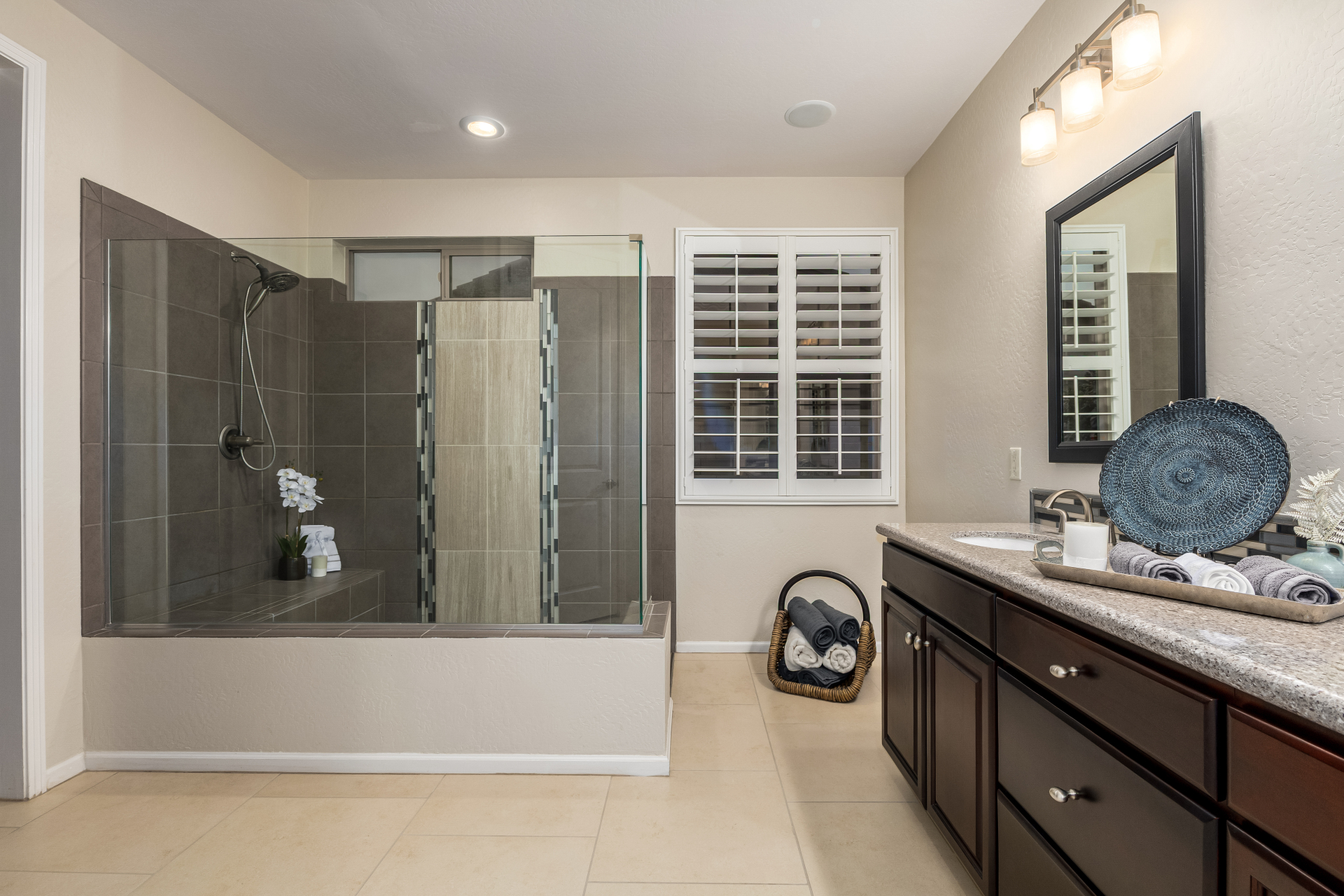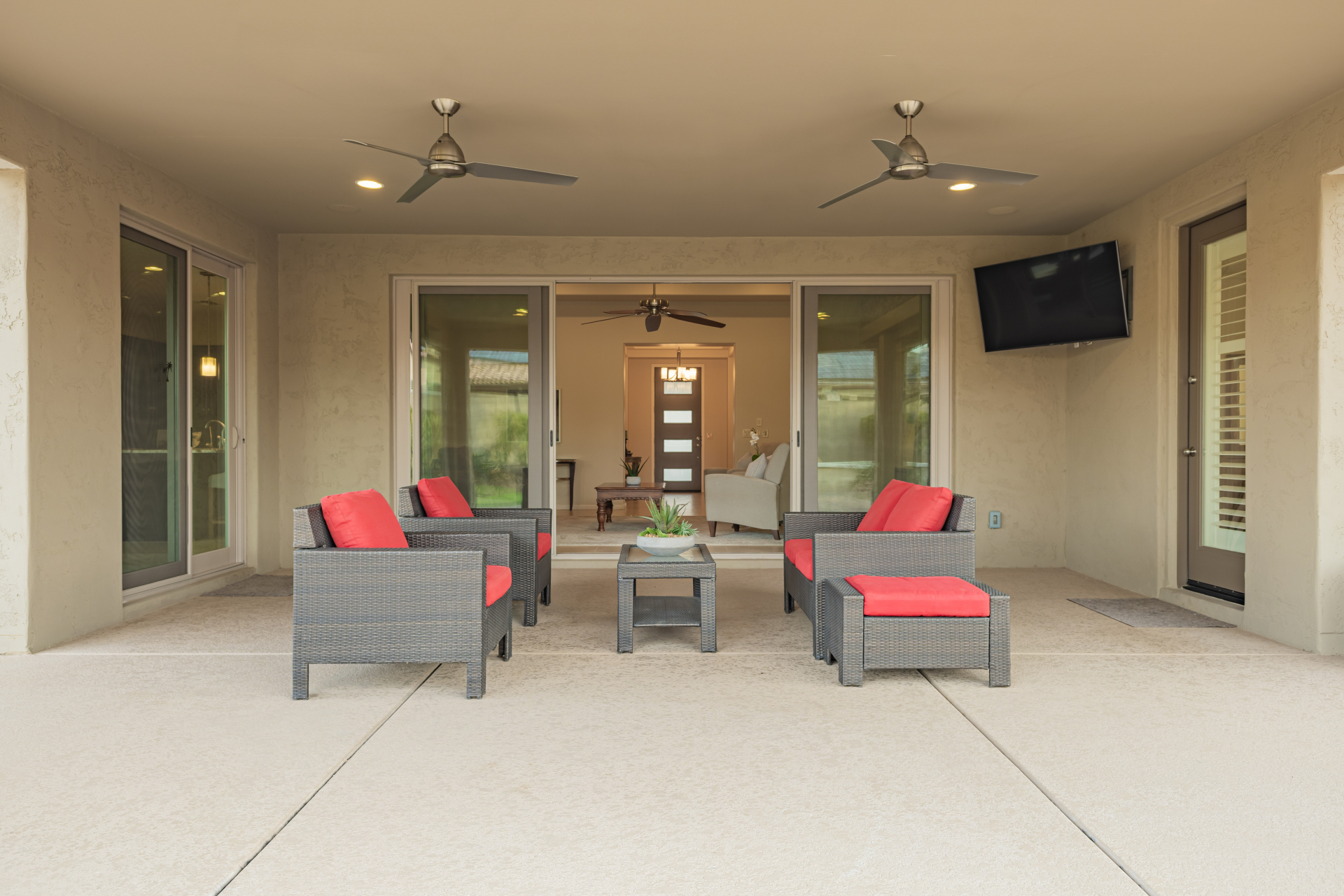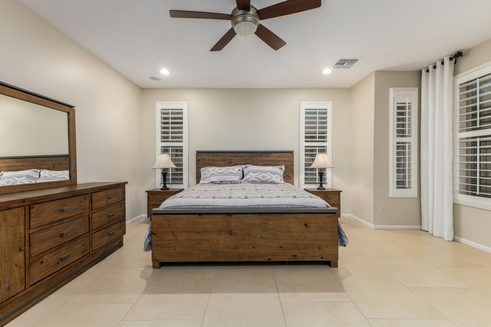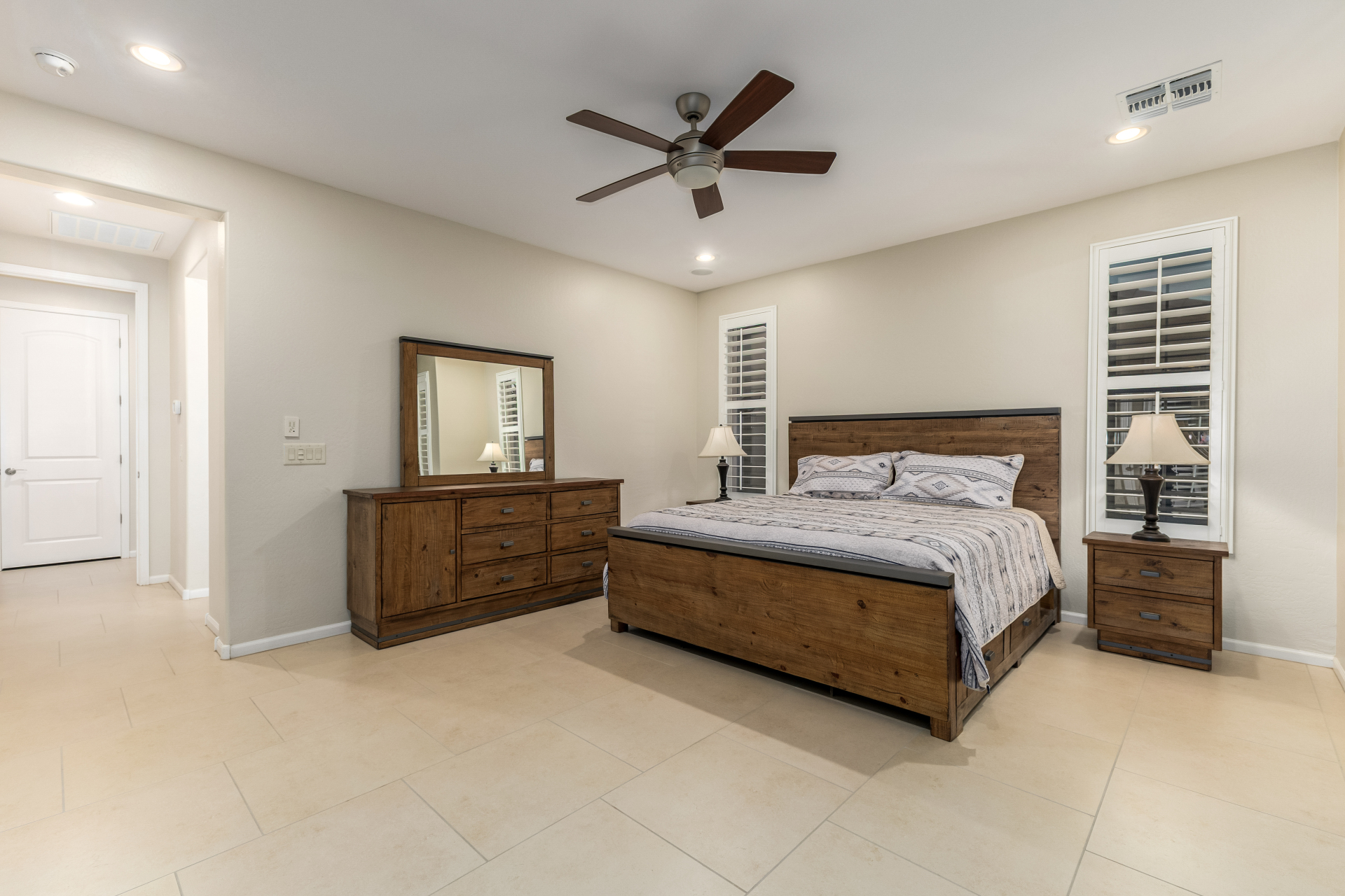 Welcome to this beautifully adorned, meticulously maintained home in PebbleCreek Golf Community. NEW Tesla Inverter and Solar Panels!! This extended Treviso model has it all! The gorgeous professional front landscape leads to the warmth of the front foyer to the open living area which allows you to take in the resort style back yard. A gourmet kitchen with large island, walk in pantry, & extended eat in kitchen makes entertaining family and friends easy! The spacious floor plan boasts 24'' tile floors throughout, Plantation Shutters, custom stacked stone feature wall with surround sound throughout the home, custom espresso kitchen cabinets with mosaic tile black splash, GE Monogram gas cook top, new refrigerator & more. Additional features include the newer garage cabinetry, epoxy garage floors, addt'l overhead storage & extended garages! OWNED SOLAR is another PLUS! Enjoy the professionally landscaped PRIVATE back yard, boasting a large covered patio with cobblestone pavers, serene rock waterfall.