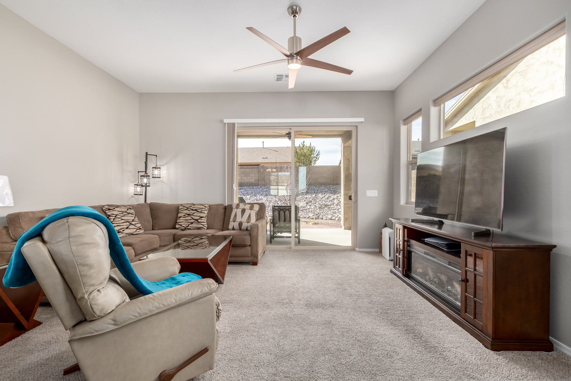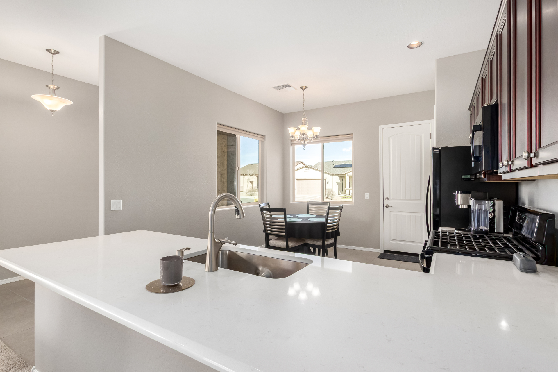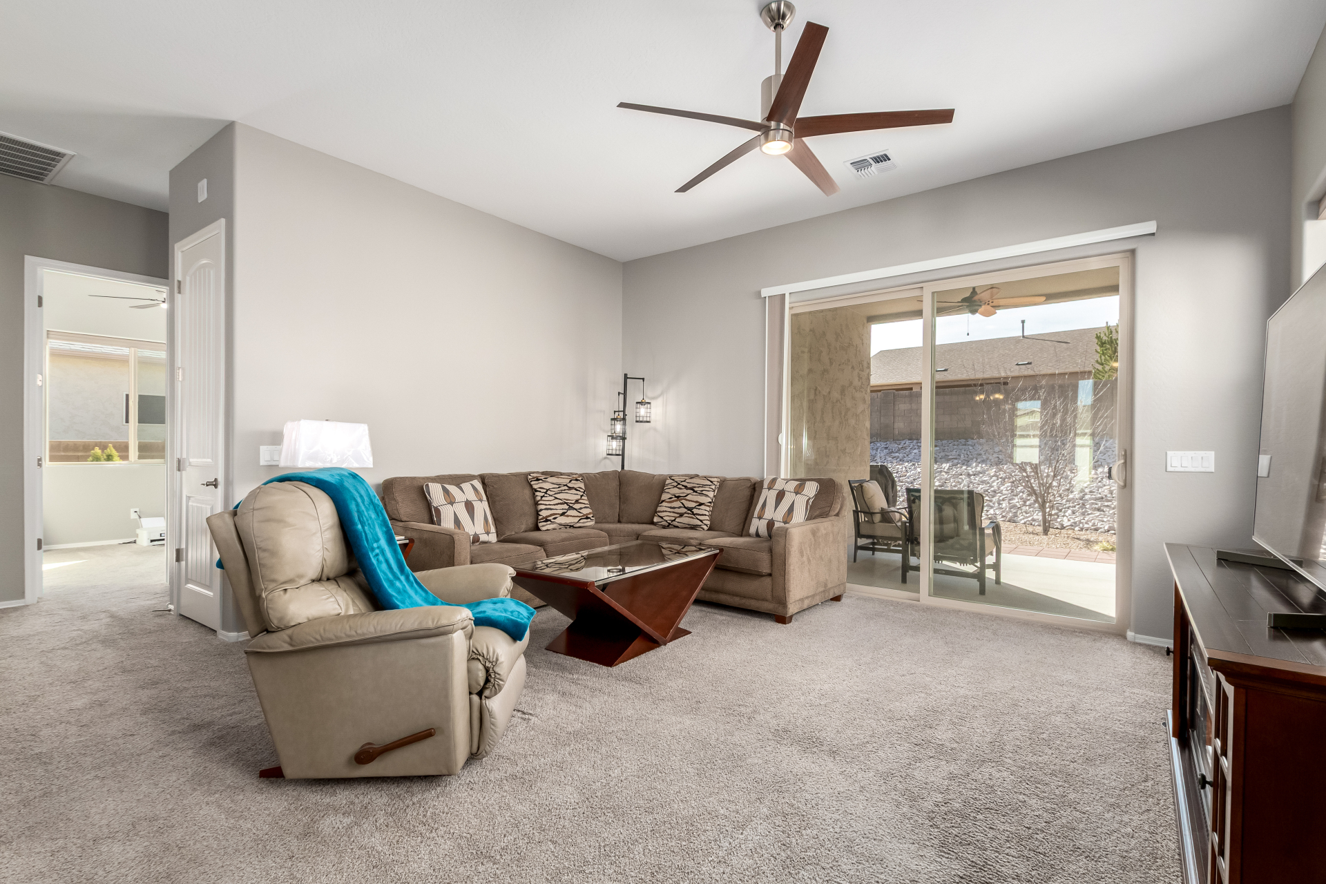 What an inviting home looking for a new owner! Enjoy charming curb appeal, low-maintenance desert landscaping, and a 2-car garage. Inside, the welcoming living room with soft carpet opens to the backyard through sliding glass doors for easy indoor-outdoor living. The eat-in kitchen features a breakfast bar, pantry, built-in appliances, crown-molded cabinetry, and quartz countertops added in 2023. The primary bedroom offers a walk-in closet and private ensuite with dual sinks and a grab bar in the shower. Relax in the easy-care backyard with covered patio and landscaping completed in 2021. Built in 2019 with interior paint updated in 2025. Leased solar at just $47/month with warranties included. Community amenities includes, 3 pools, spa, fitness center & more. Move-in ready—act now!