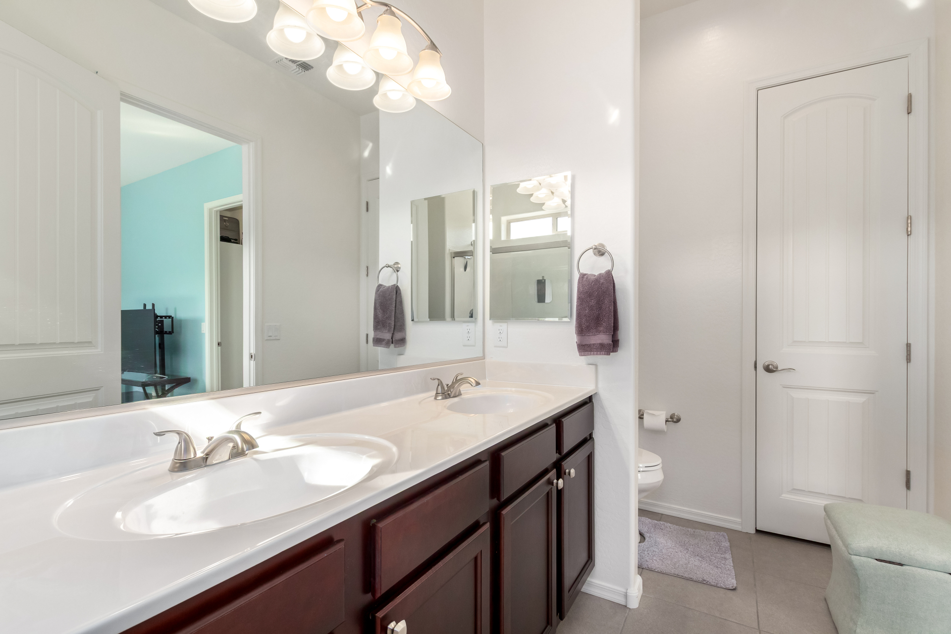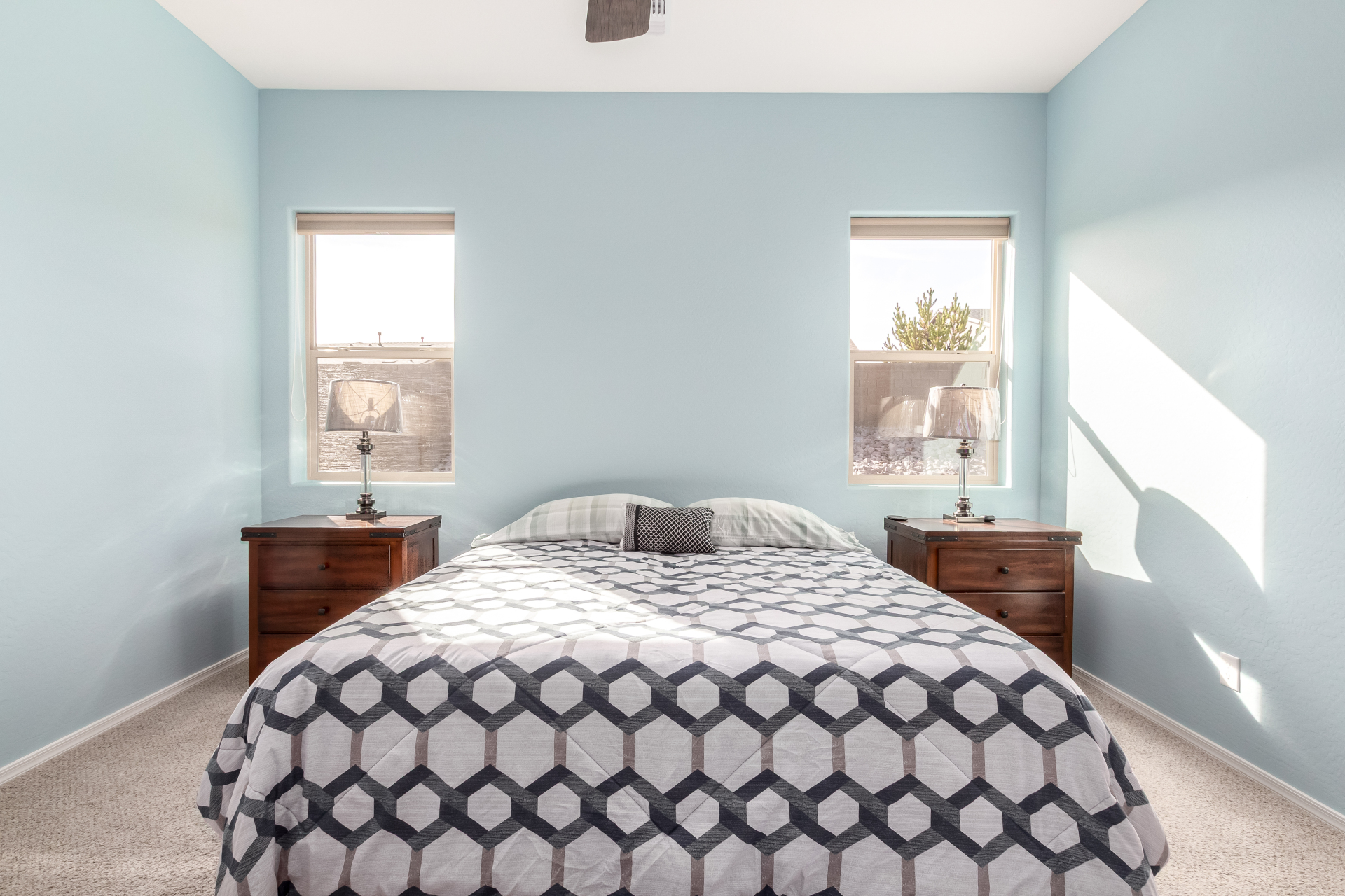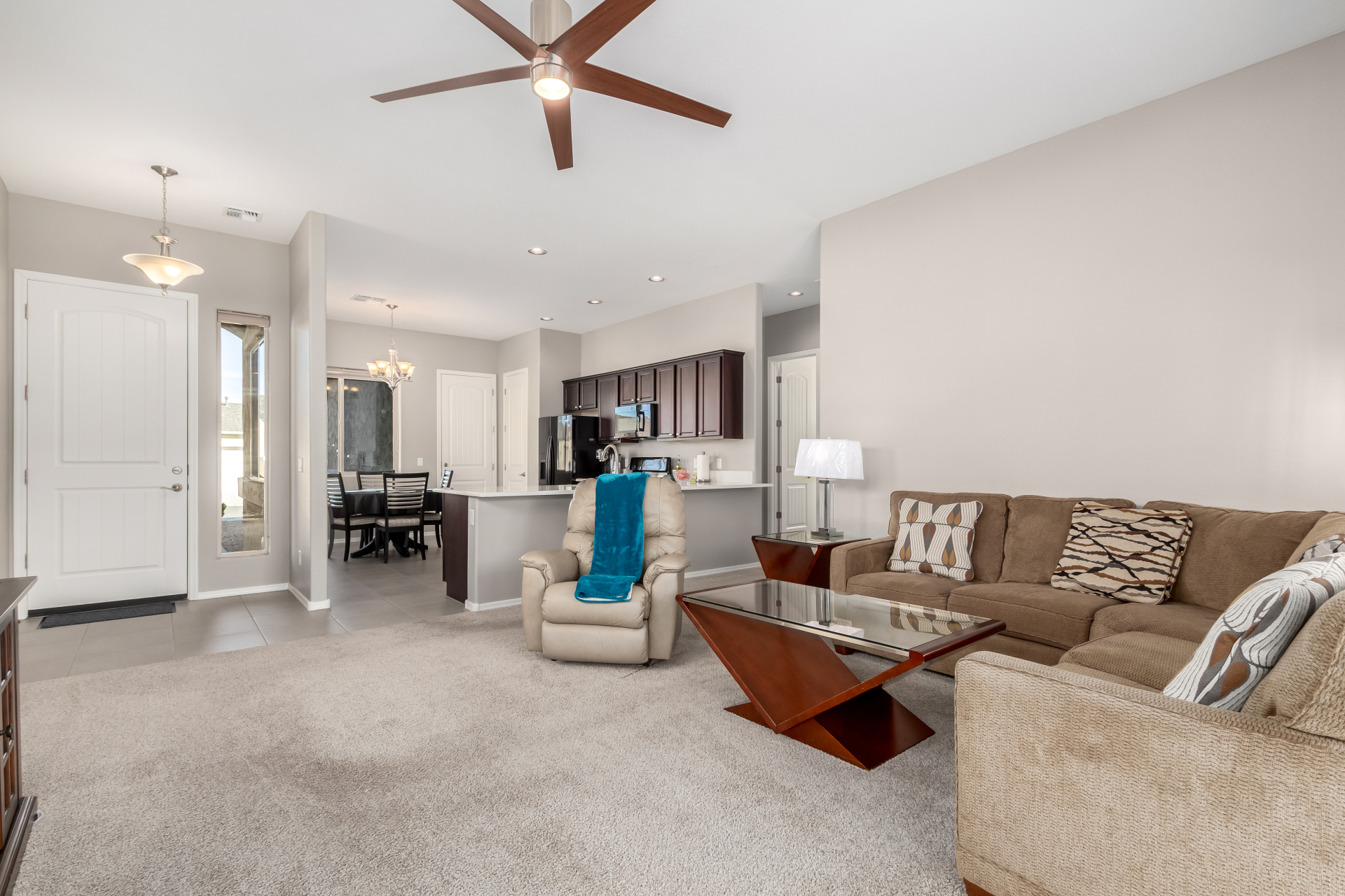 What an inviting home looking for a new owner! Enjoy charming curb appeal, low-maintenance desert landscaping, and a 2-car garage. Inside, the welcoming living room with soft carpet opens to the backyard through sliding glass doors for easy indoor-outdoor living. The eat-in kitchen features a breakfast bar, pantry, built-in appliances, crown-molded cabinetry, and quartz countertops added in 2023. The primary bedroom offers a walk-in closet and private ensuite with dual sinks and a grab bar in the shower. Relax in the easy-care backyard with covered patio and landscaping completed in 2021. Built in 2019 with interior paint updated in 2025. Leased solar at just $47/month with warranties included. Community amenities includes, 3 pools, spa, fitness center & more. Move-in ready—act now!