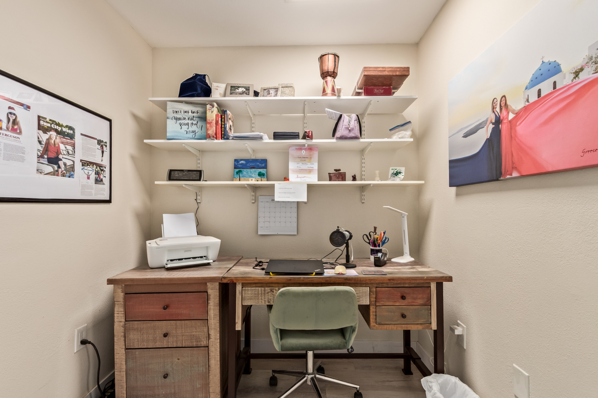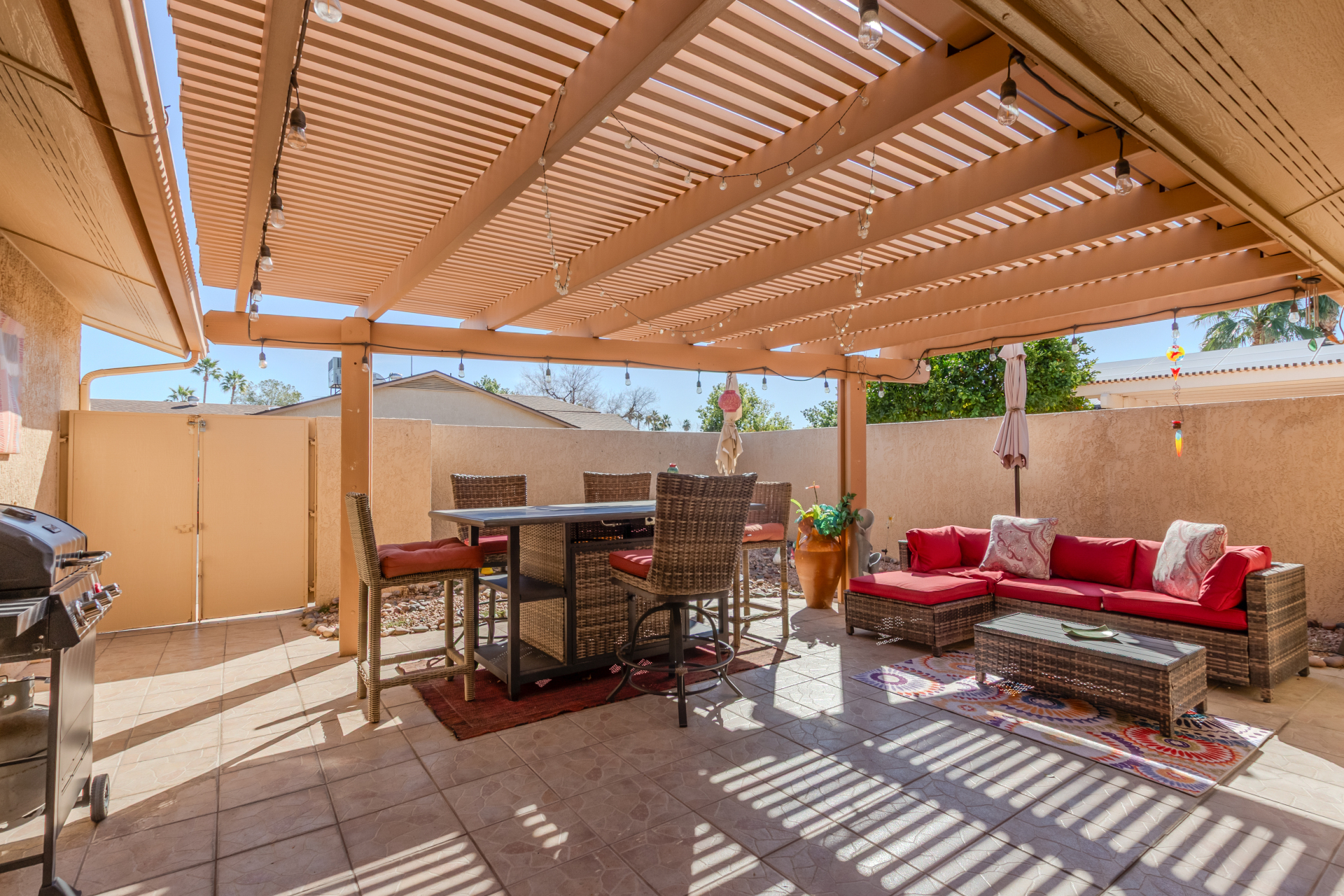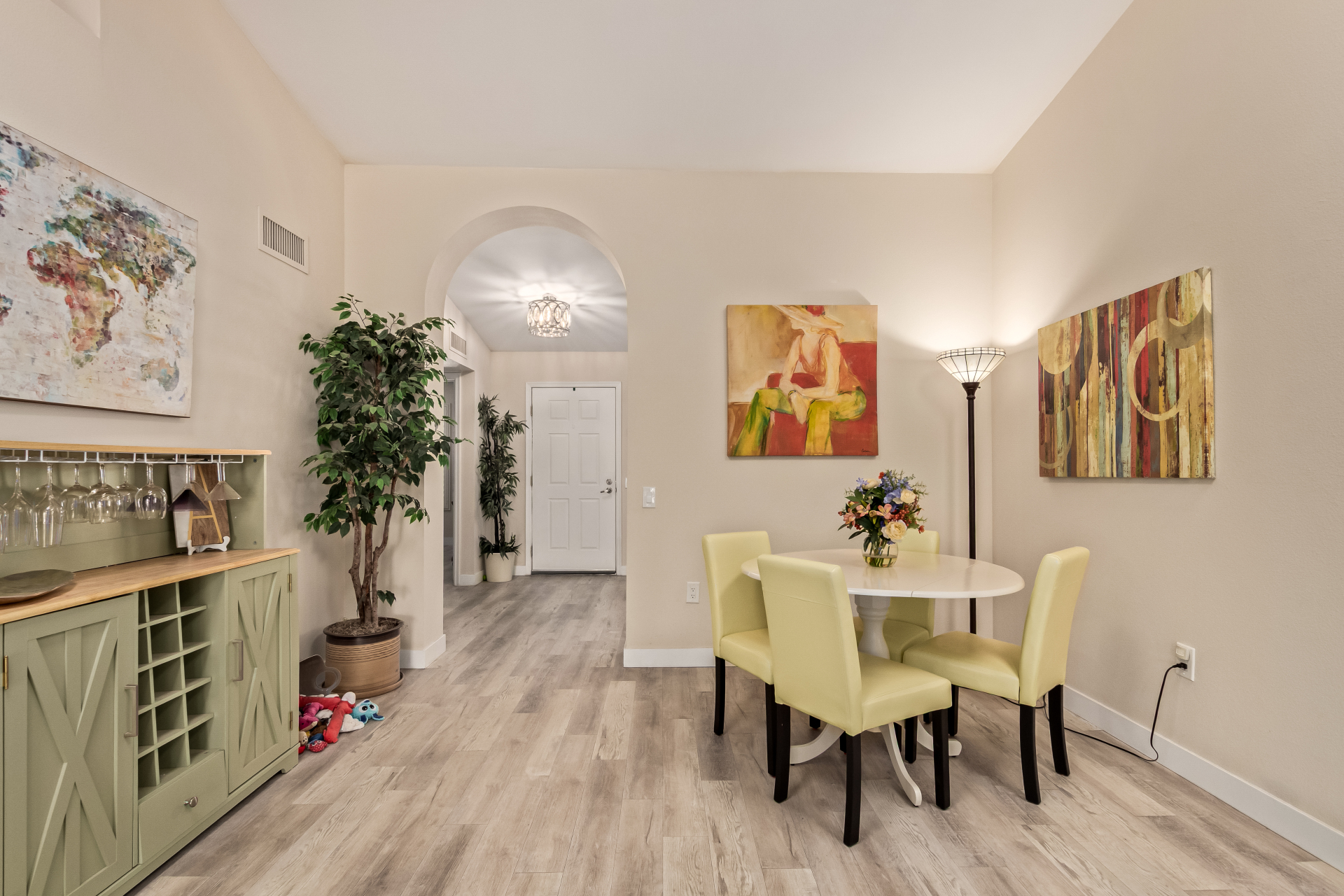 This highly upgraded end-unit residence offers 2 bedrooms, 2 baths, and a 1-car garage. Luxury vinyl plank flooring flows seamlessly throughout the home, complemented by upgraded hardware, designer shutters on every window, and modern ceiling fans. The kitchen features granite countertops, a breakfast bar, white cabinetry, and a custom backsplash. The living room showcases a built-in electric fireplace with multiple settings, creating a warm, inviting ambiance. A dedicated office area includes built-in cabinetry for added functionality. The primary bedroom opens to a private rear patio, while the bath offers dual sinks and a custom built walk-in closet. The tiled patio is enhanced by a pergola, providing a private outdoor retreat. It is in Immaculate and truly move-in ready.