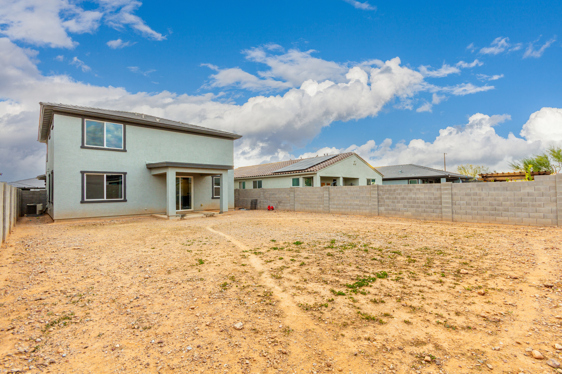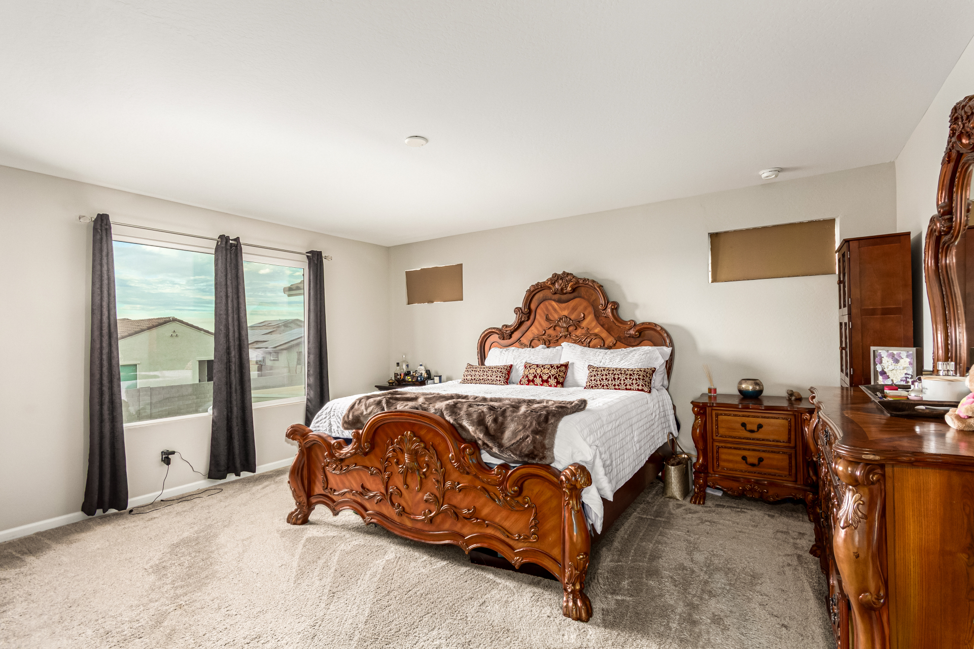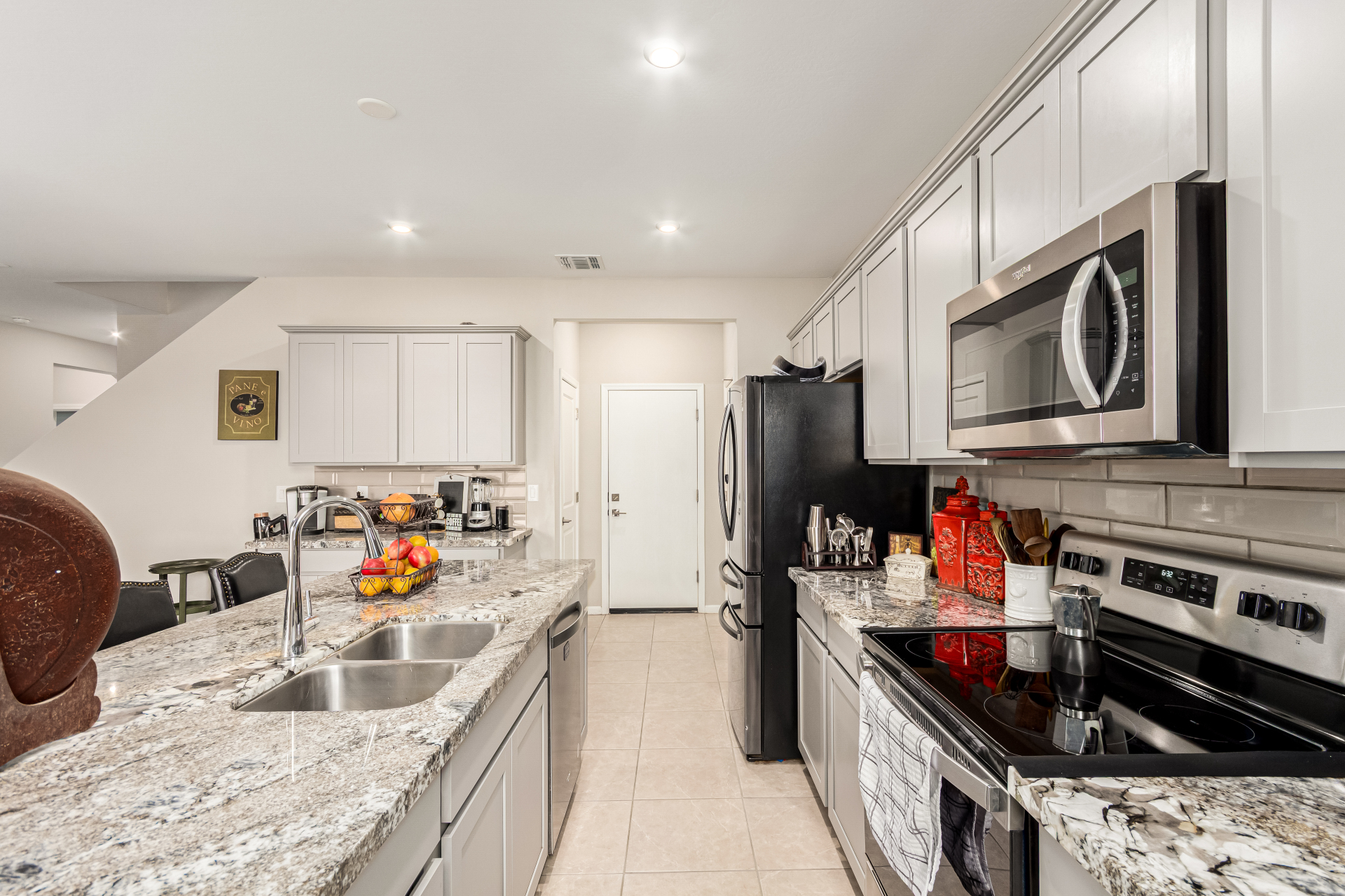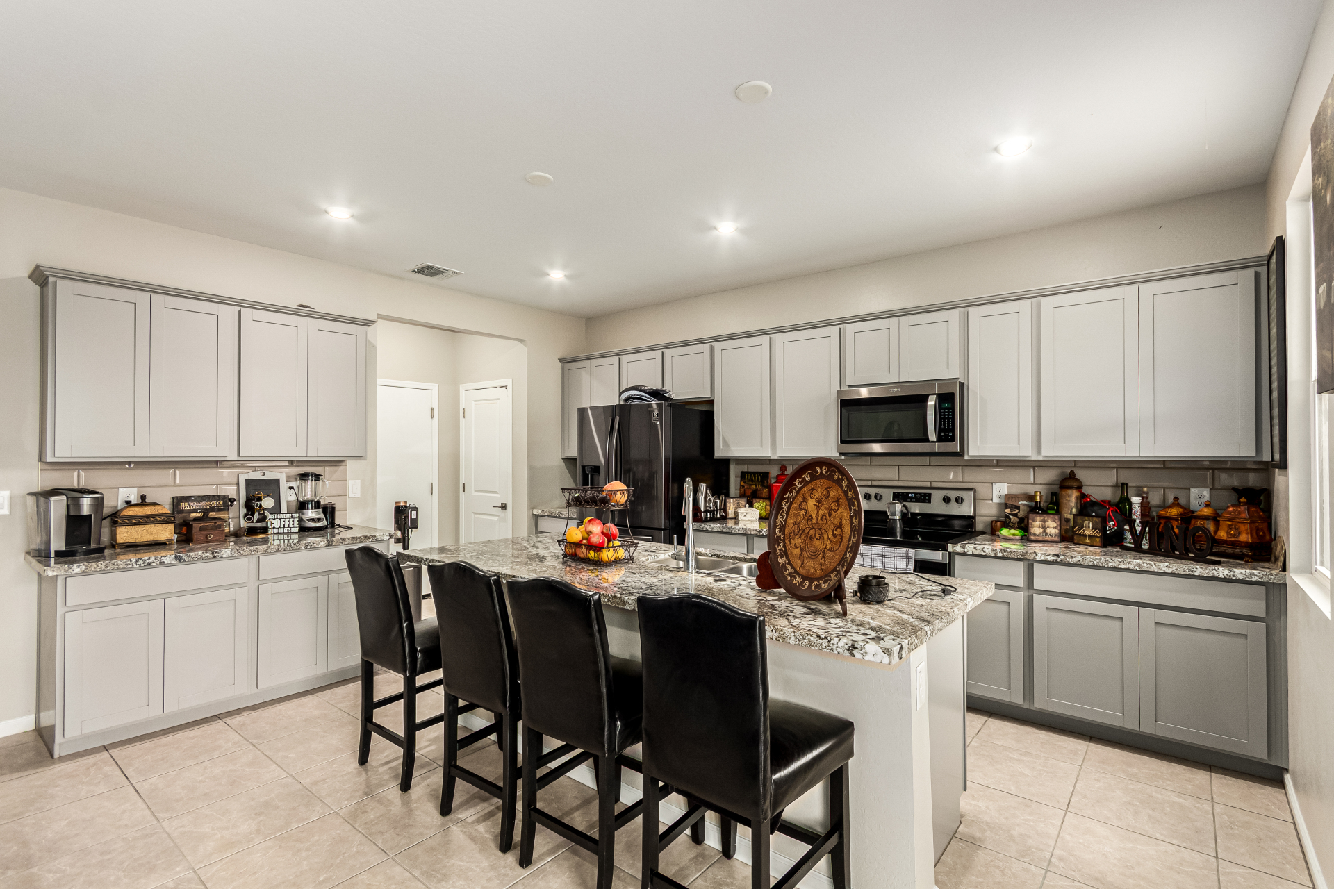 Welcome to your new home in Surprise, AZ! Thoughtfully designed with comfort and style in mind, this gem is packed with features you're sure to love. Inside, the desirable open floor plan is filled with tons of natural light. Custom palette creates a warm, inviting ambiance, enhanced by tile flooring and ceiling fans. Lovely kitchen boasts stainless steel appliances, subway tile backsplash, ample cabinetry topped with crown moulding, granite counters, a prep island with a breakfast bar, and recessed lighting. Continue upstairs to find a flexible loft, ideal for work or play. Large primary bedroom offers plush carpet, a private bathroom with dual sinks, and a walk-in closet. Enjoy a refreshing drink in the spacious backyard, complete with a covered patio. Don't let this gem pass you by!