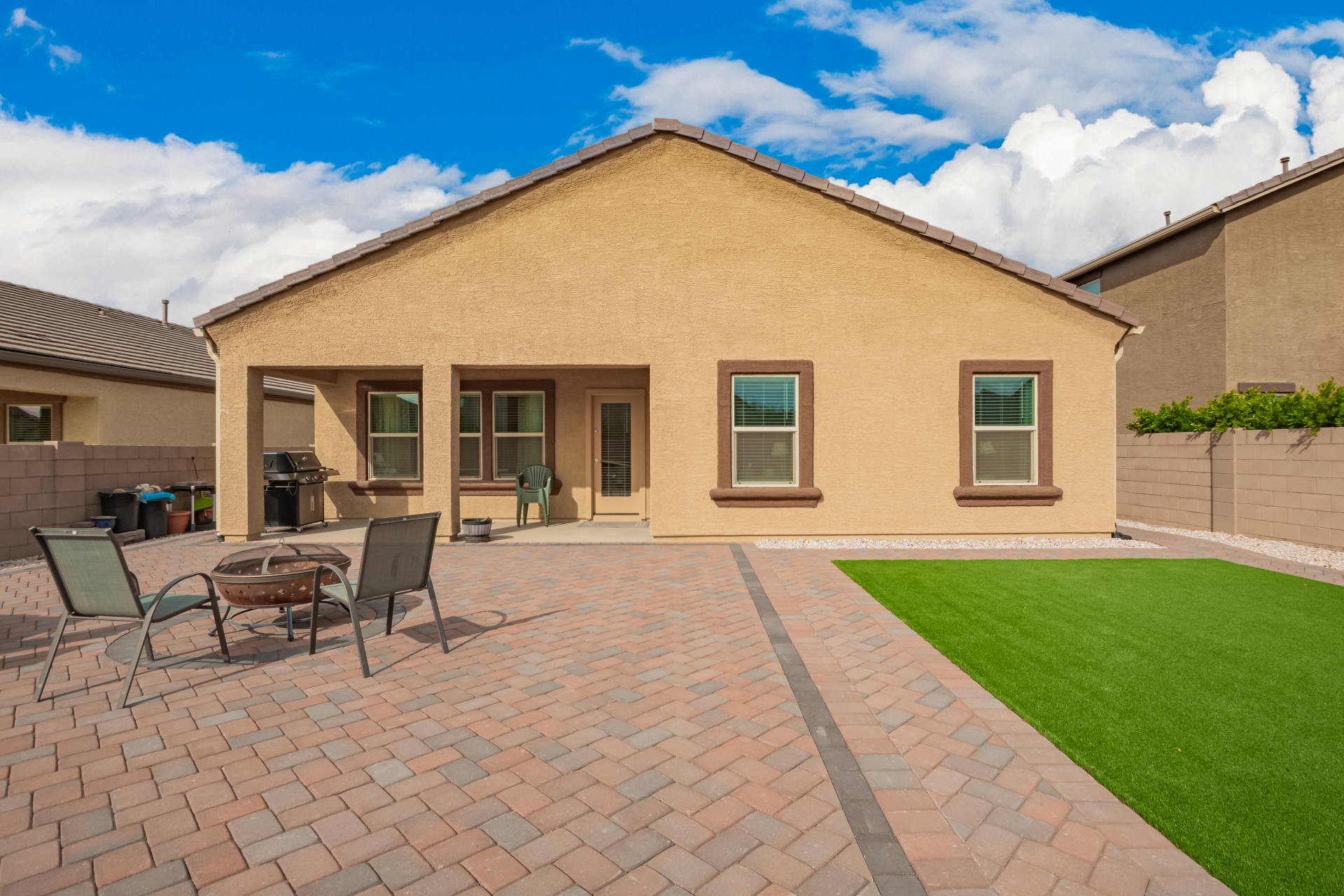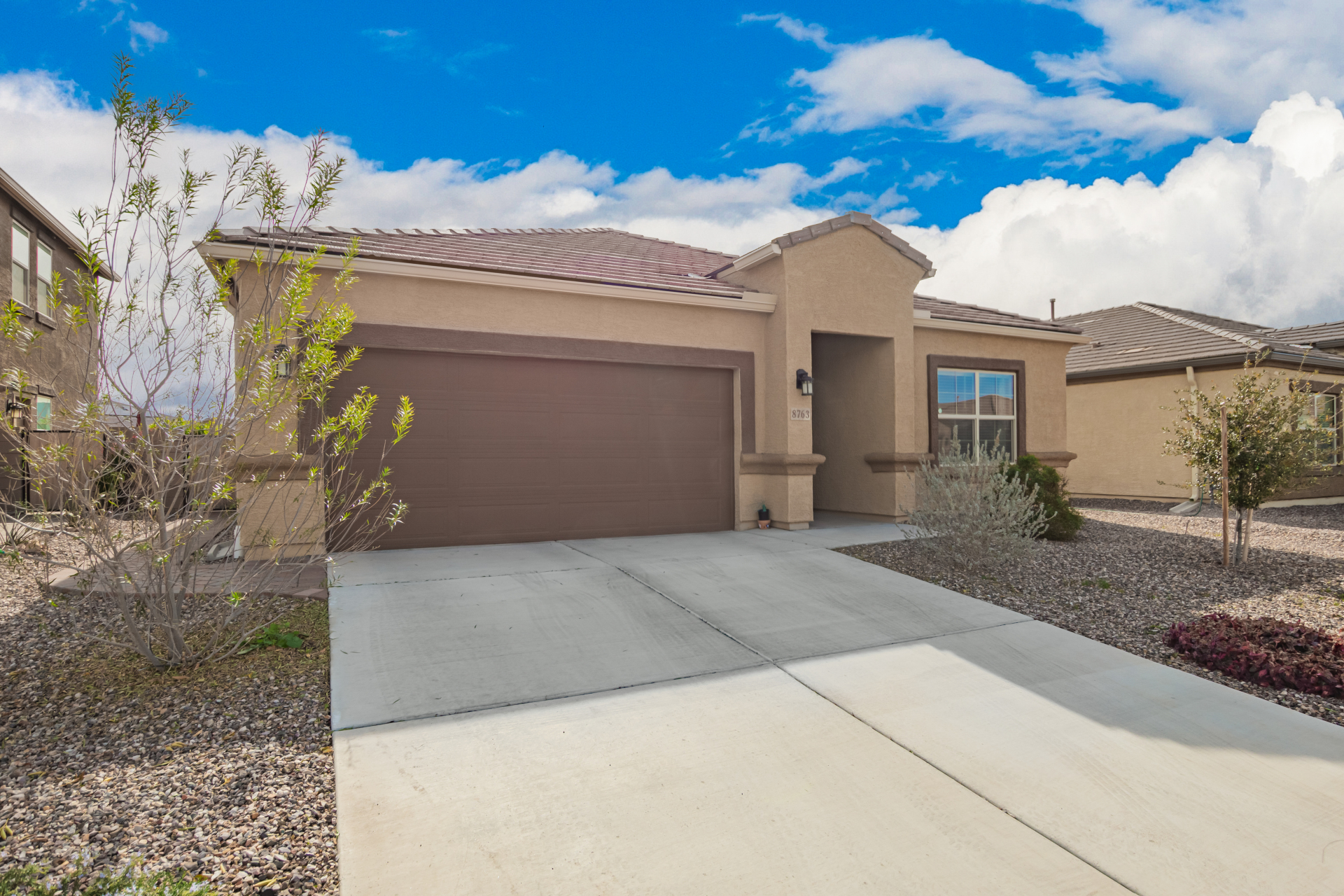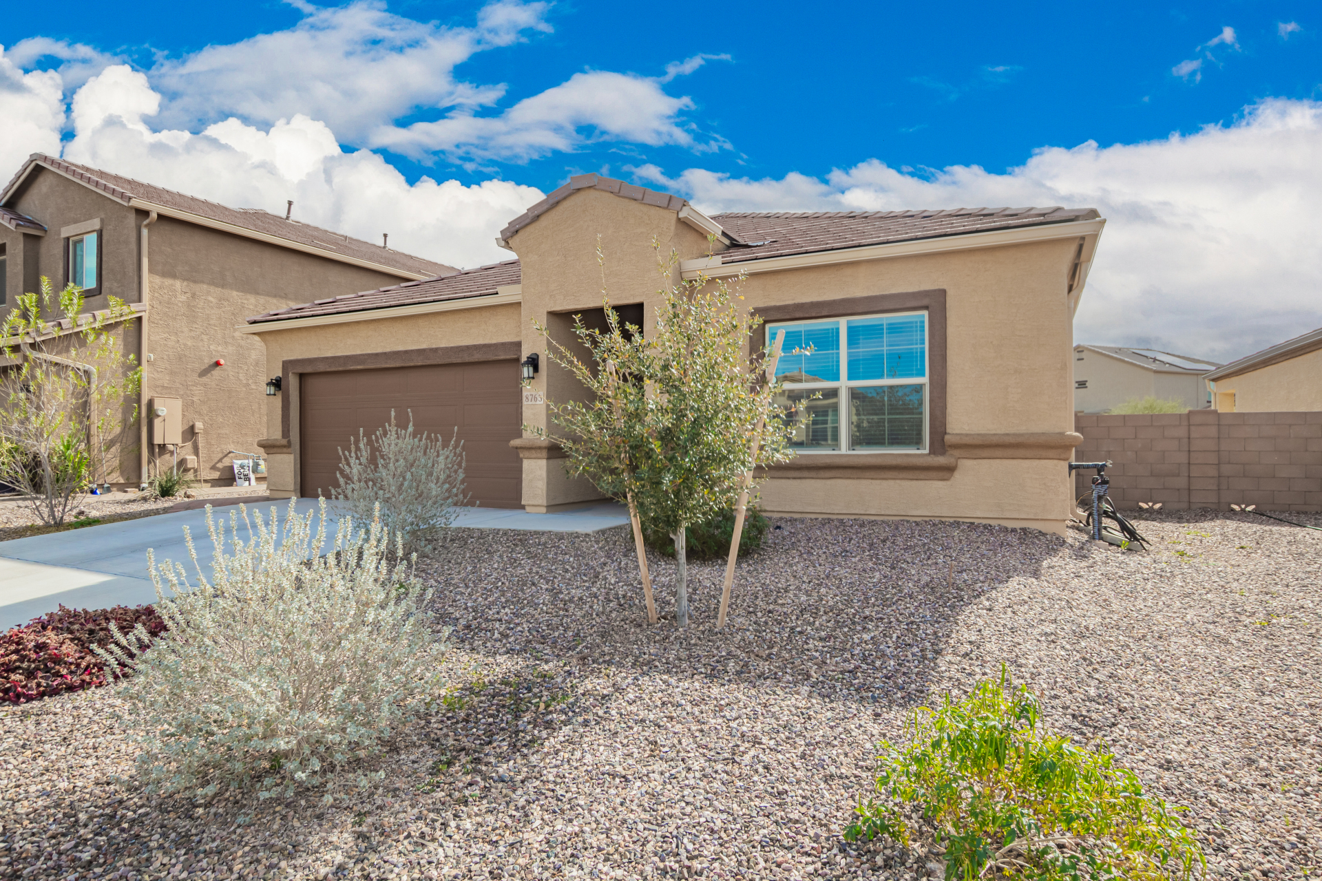 Nestled in the foothills of the Tucson Mountains, this stunning 4-bed residence in Cholla Ridge at Saguaro Bloom offers the perfect blend of luxury & privacy. The home features a desert landscape with auto drip irrigation, covered porch, and 2-car garage. Inside, the sought-after Justin floor plan impresses with abundant natural light, tall ceilings, recessed lighting, 12x24'' tile flooring, and 8' sliding glass patio doors. The kitchen showcases shaker cabinets, granite counters, and SS appliances. The owner's suite includes an ensuite with an executive height dual vanity. The spacious backyard with covered patio & pavers is perfect for outdoor entertaining with no rear neighbors & mountain views. Saguaro Bloom includes clubhouse, two pools, fitness center, splash pad, and much more!
