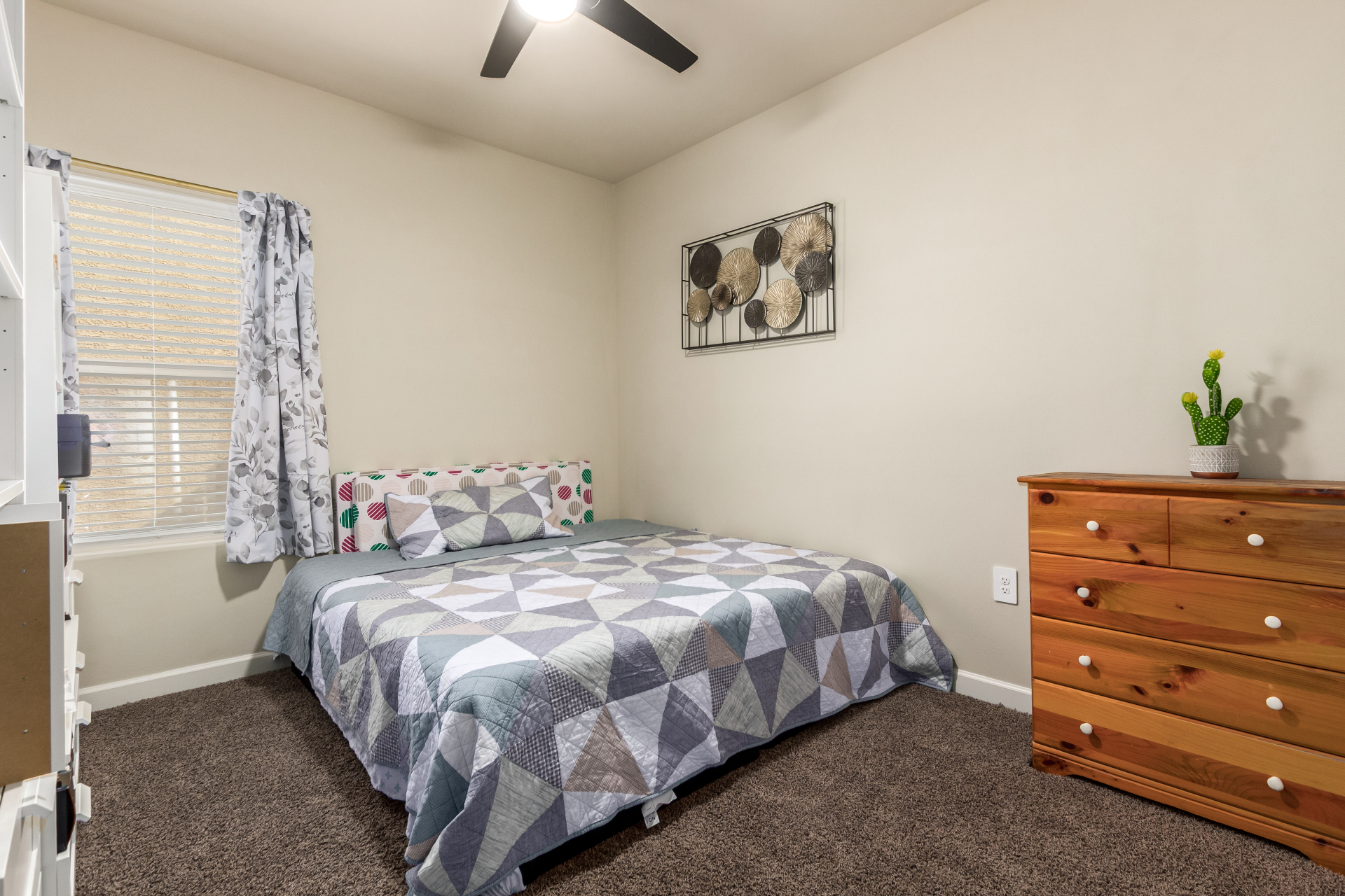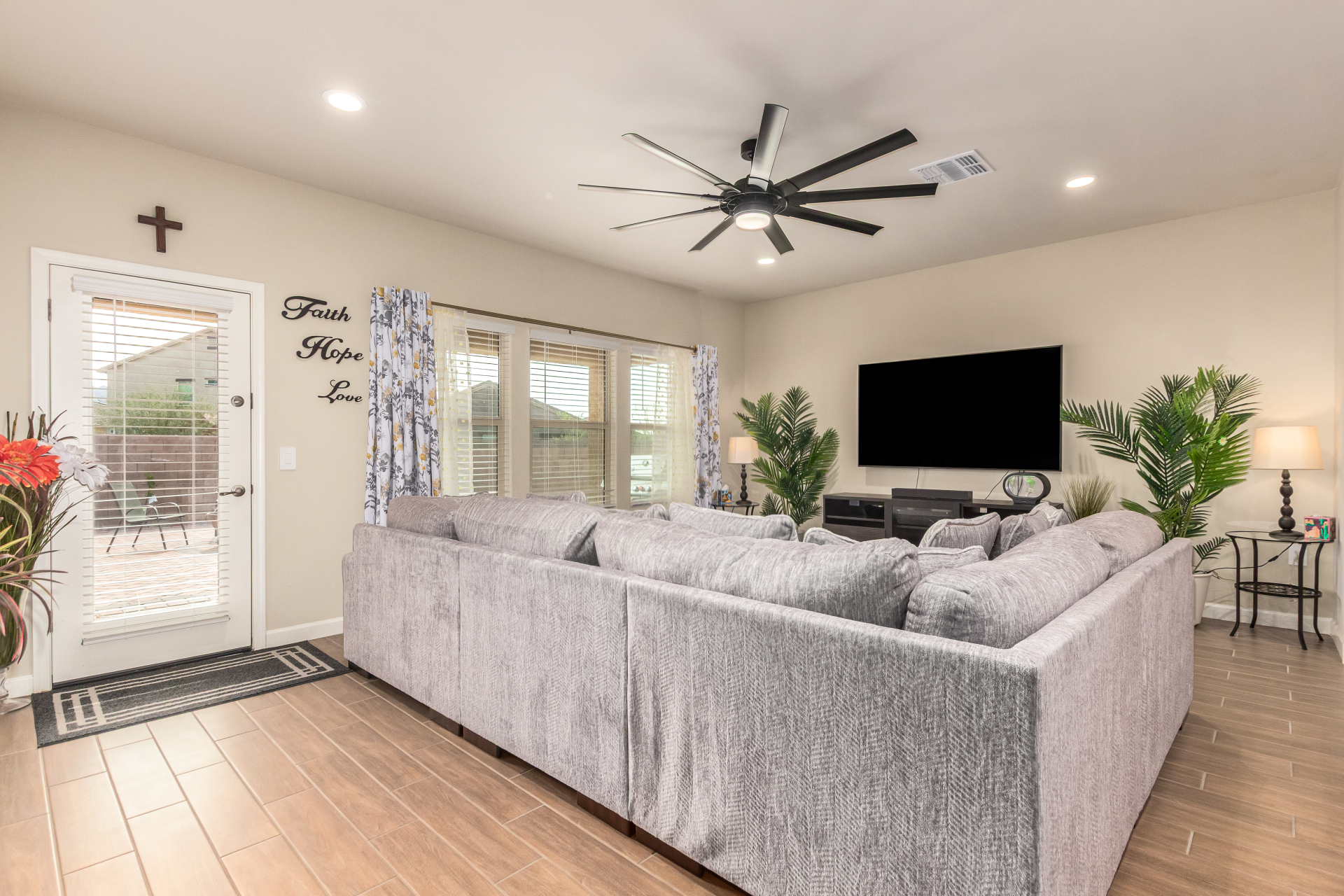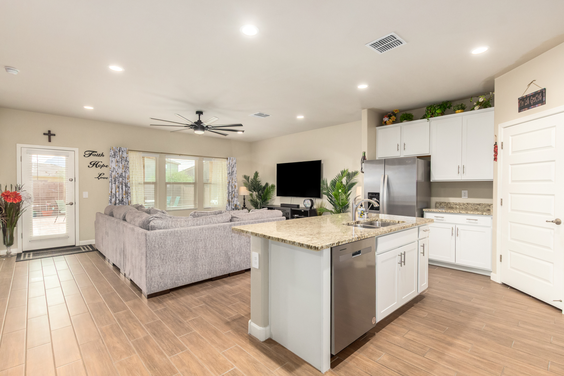 Nestled in the foothills of the Tucson Mountains, this stunning 4-bed residence in Cholla Ridge at Saguaro Bloom offers the perfect blend of luxury & privacy. The home features a desert landscape with auto drip irrigation, covered porch, and 2-car garage. Inside, the sought-after Justin floor plan impresses with abundant natural light, tall ceilings, recessed lighting, 12x24'' tile flooring, and 8' sliding glass patio doors. The kitchen showcases shaker cabinets, granite counters, and SS appliances. The owner's suite includes an ensuite with an executive height dual vanity. The spacious backyard with covered patio & pavers is perfect for outdoor entertaining with no rear neighbors & mountain views. Saguaro Bloom includes clubhouse, two pools, fitness center, splash pad, and much more!