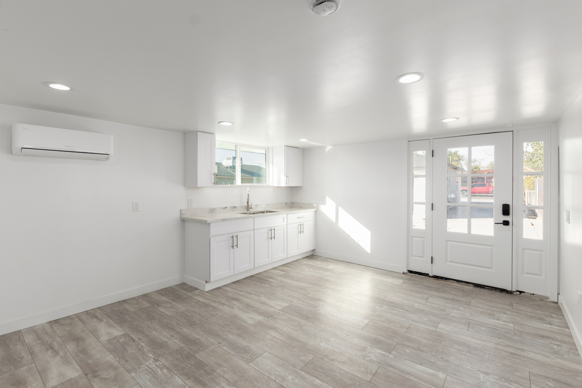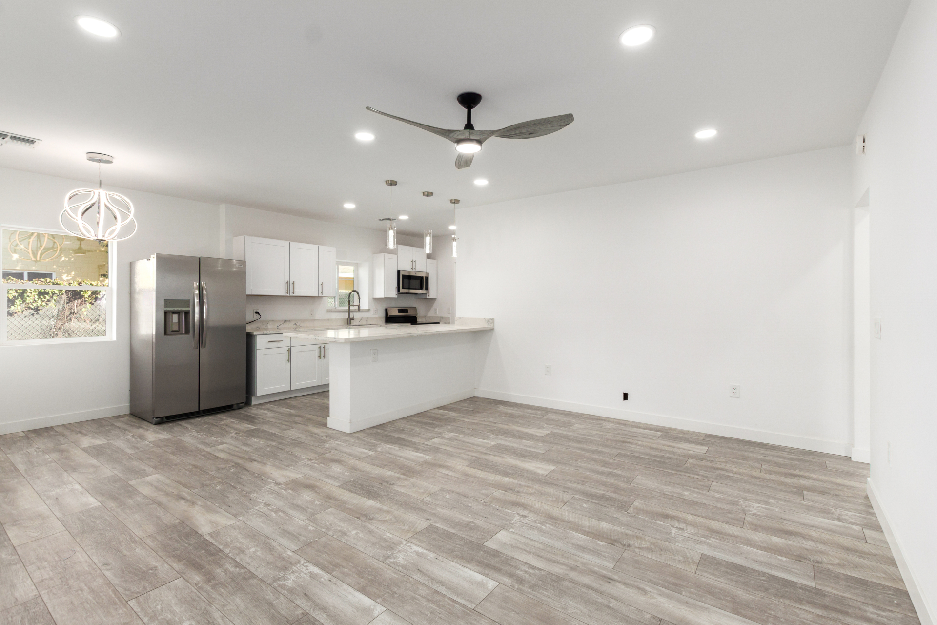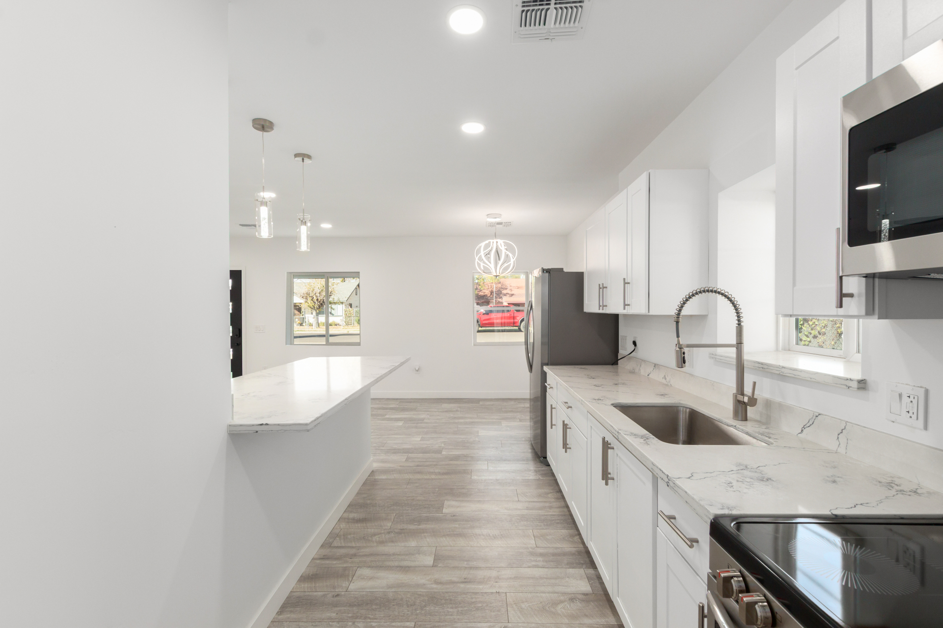 Home, sweet home! This thoughtfully upgraded 3-bedroom property welcomes you w/ an extended driveway for ample open parking, pristine artificial turf, & stylish pavers. You'll be delighted by the renovated open layout w/ high ceilings, recessed lighting throughout, a soothing palette, & attractive wood-look flooring. The impeccable kitchen comes w/ quartz counters, white shaker cabinets, chic pendant lighting, stainless steel appliances, & a peninsula w/ a breakfast bar for casual meals. The primary bedroom includes a private bathroom for added comfort. You'll also find a detached guest house, perfect for visiting loved ones or a rental opportunity. The sizeable backyard includes a spacious patio, an RV gate leading to the alley, & ample space for outdoor gatherings. Make this gem yours!