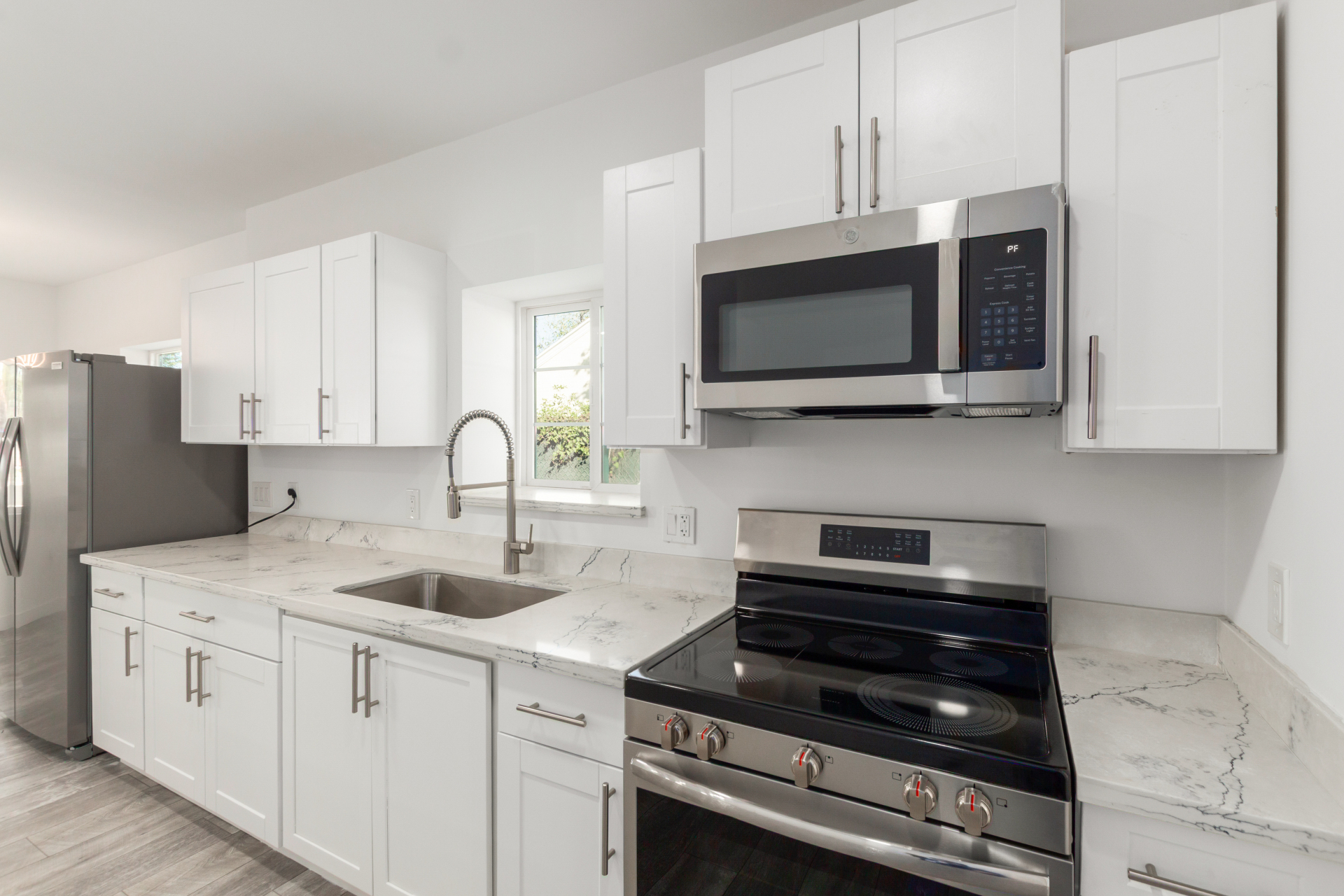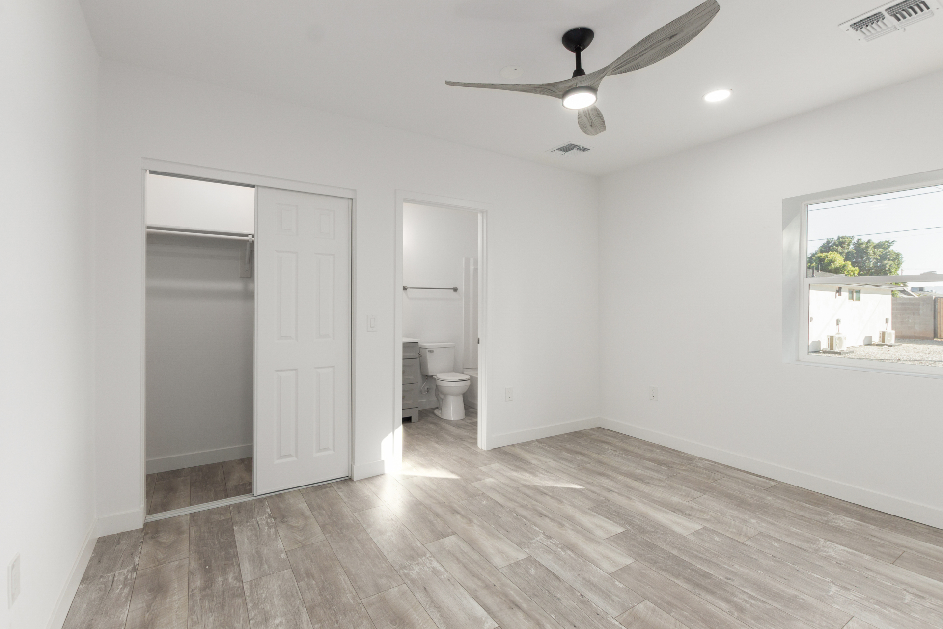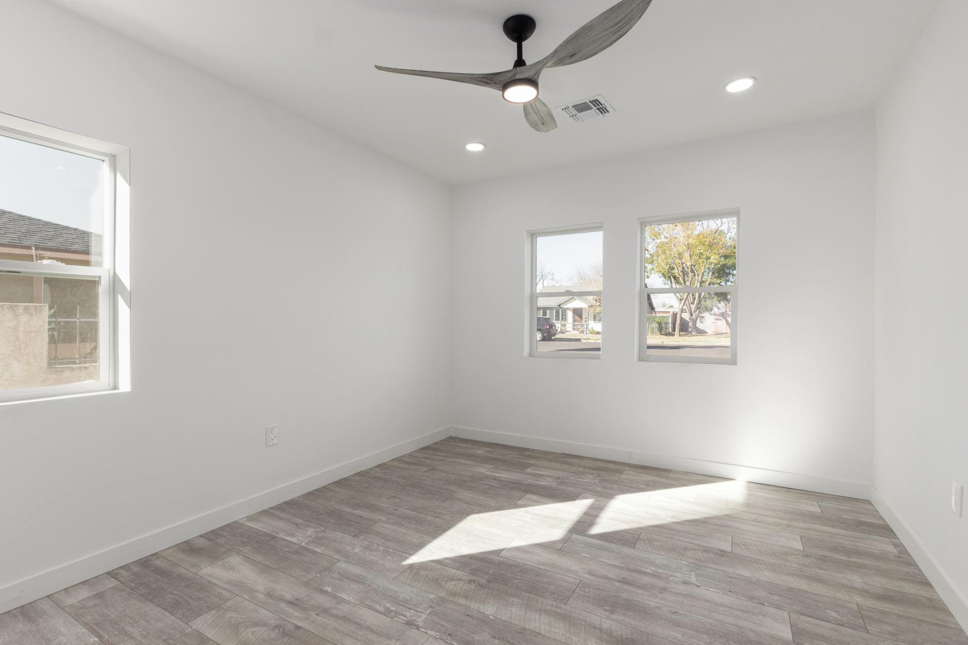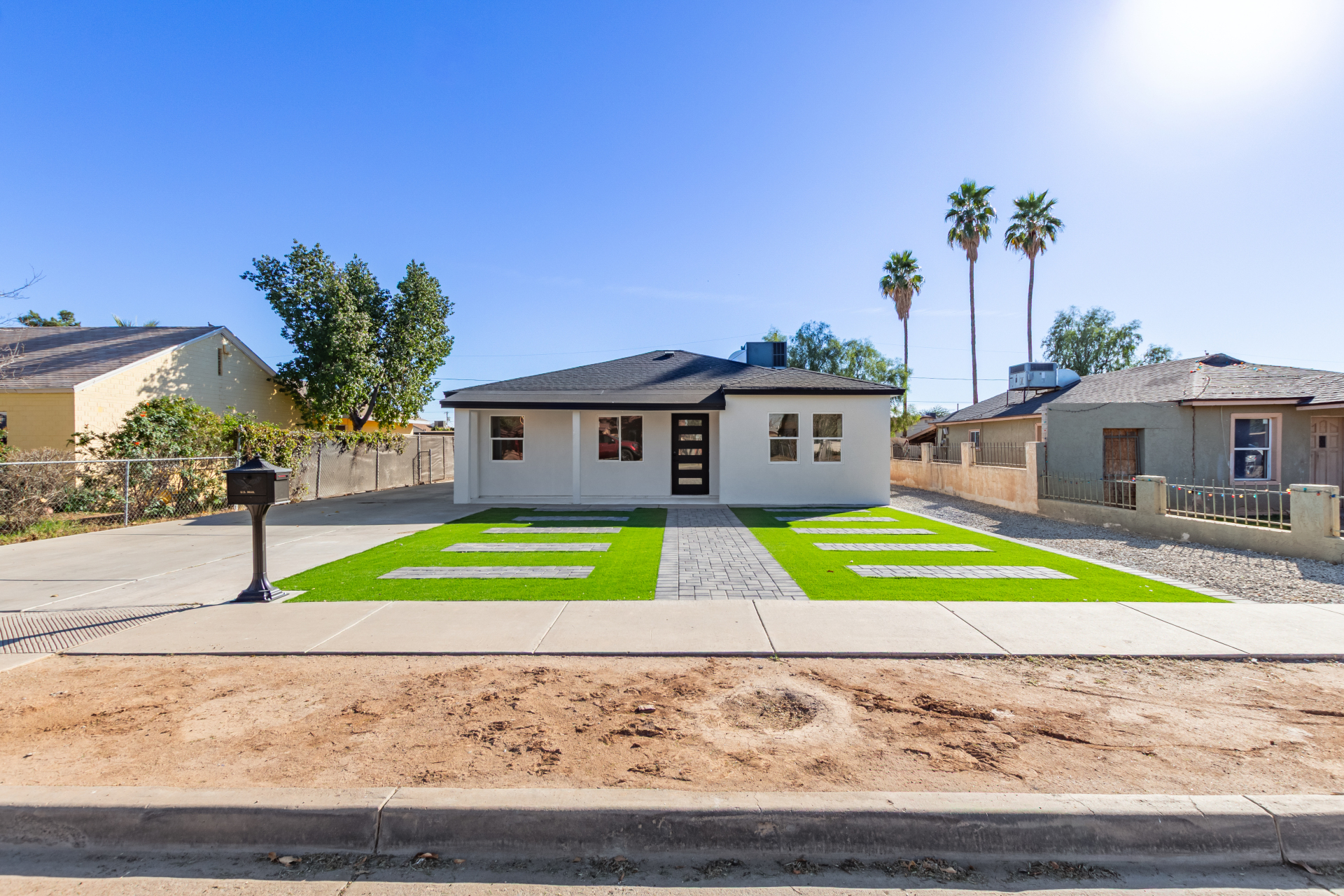 Home, sweet home! This thoughtfully upgraded 3-bedroom property welcomes you w/ an extended driveway for ample open parking, pristine artificial turf, & stylish pavers. You'll be delighted by the renovated open layout w/ high ceilings, recessed lighting throughout, a soothing palette, & attractive wood-look flooring. The impeccable kitchen comes w/ quartz counters, white shaker cabinets, chic pendant lighting, stainless steel appliances, & a peninsula w/ a breakfast bar for casual meals. The primary bedroom includes a private bathroom for added comfort. You'll also find a detached guest house, perfect for visiting loved ones or a rental opportunity. The sizeable backyard includes a spacious patio, an RV gate leading to the alley, & ample space for outdoor gatherings. Make this gem yours!