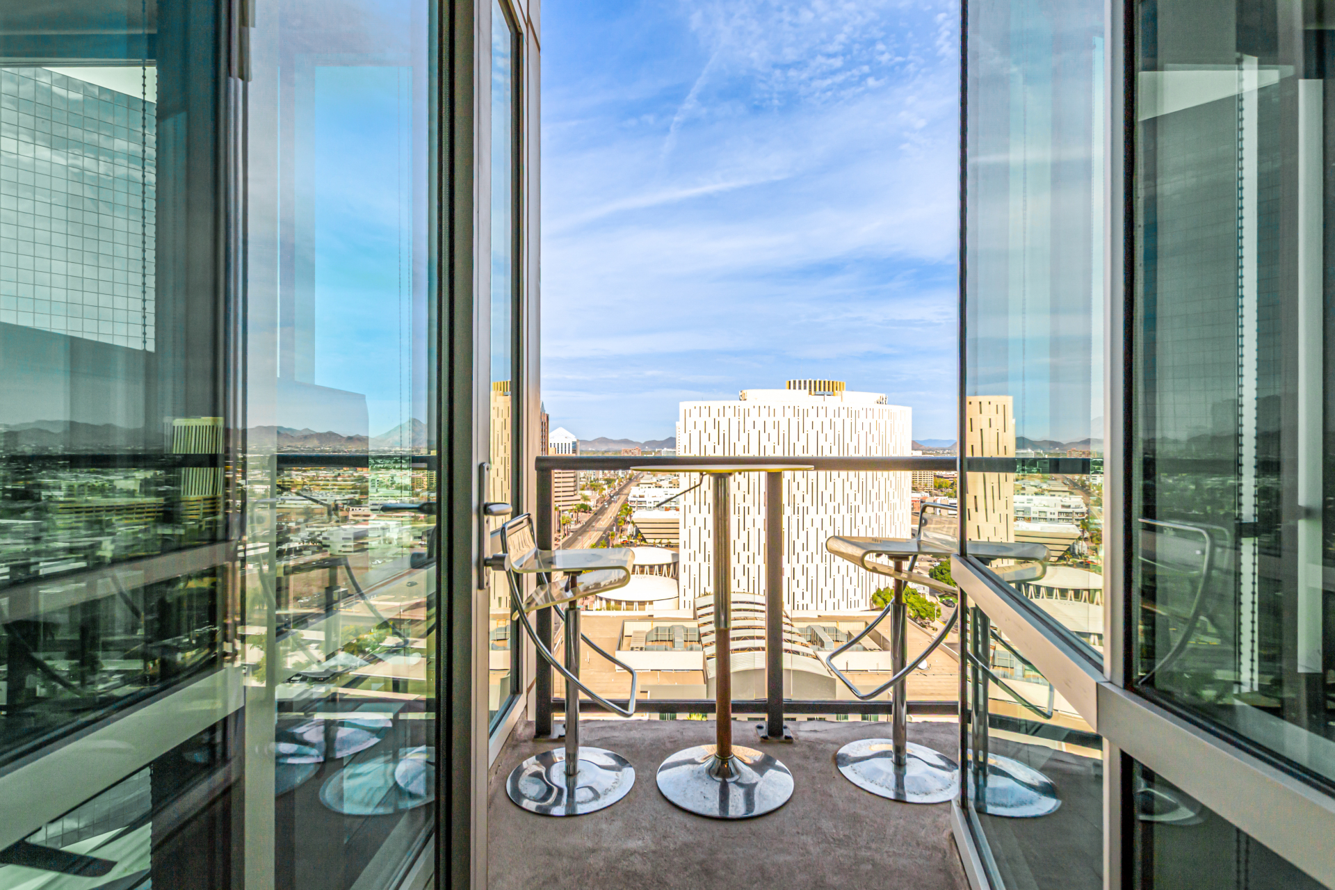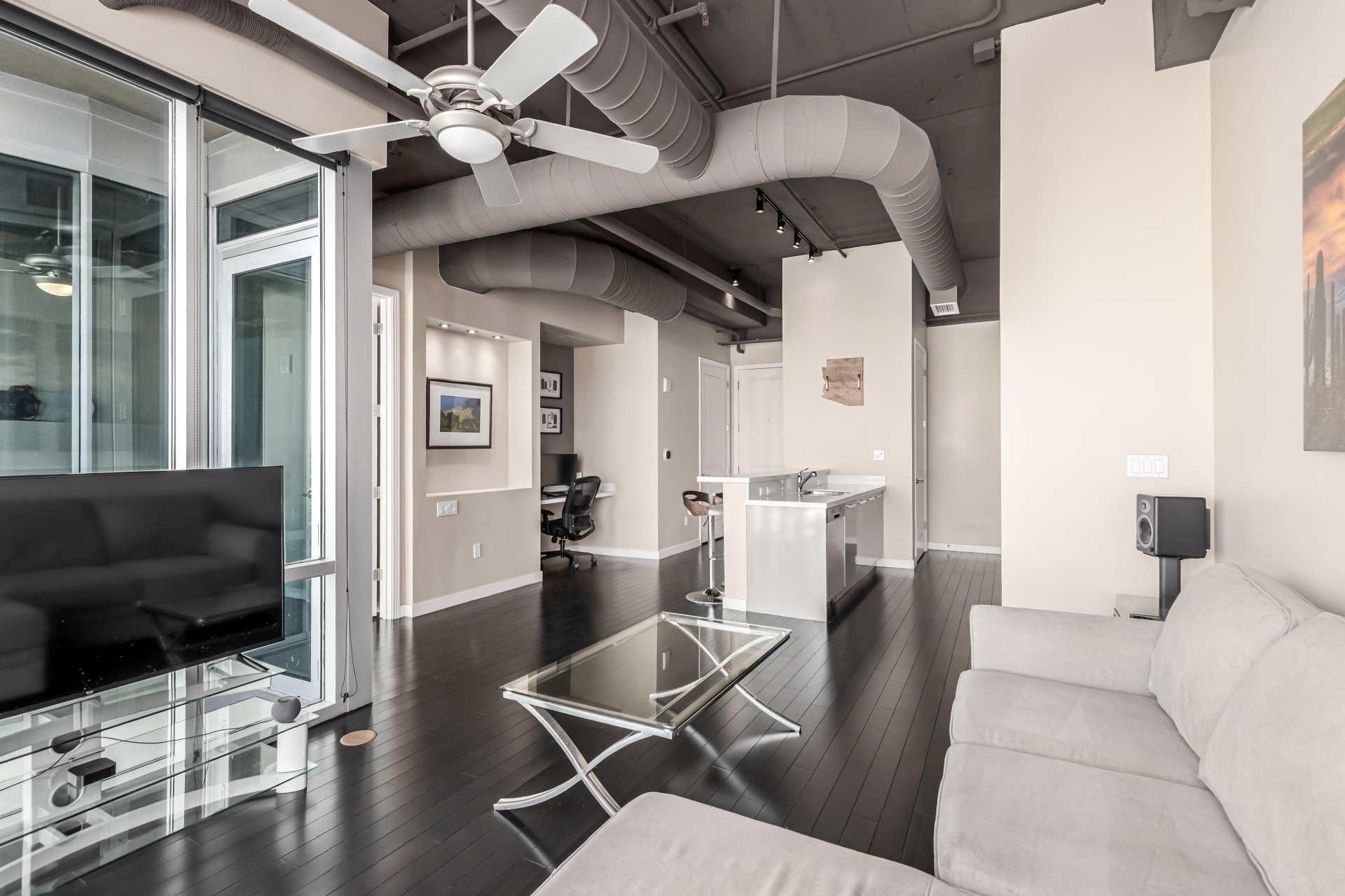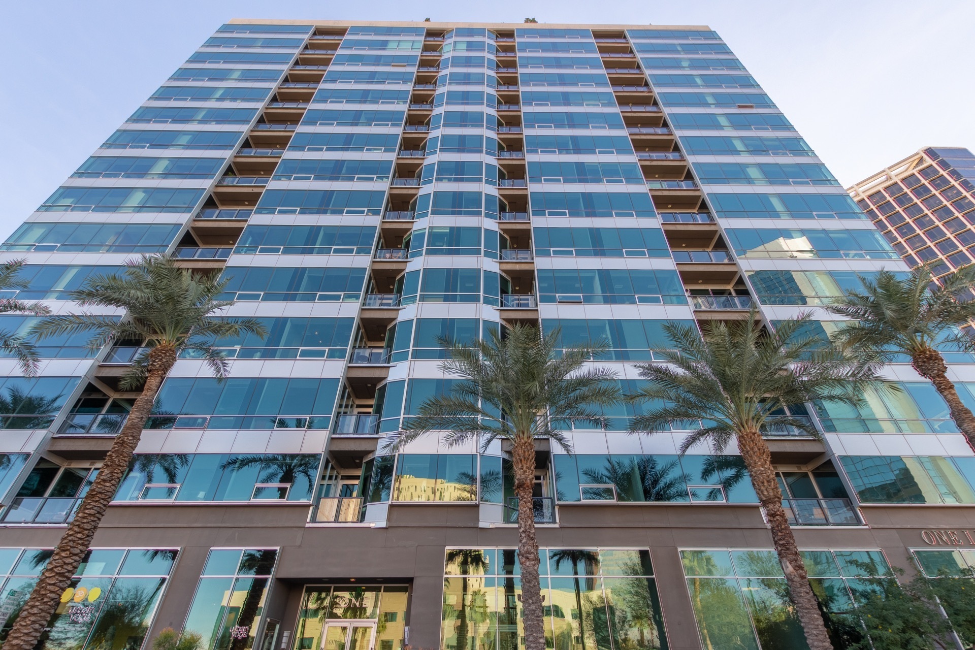 Seize the opportunity to be the proud owner of this gorgeous apartment in a high-rise with a fantastic location close to restaurants, shopping, parks, and golfing! The interior features an open layout with wood-look floors, ceilings with exposed ductwork to promote a modern industrial vibe, floor-to-ceiling windows to let ample natural light pour in, offering amazing views, and neutral tones throughout. The impeccable kitchen comes equipped with plentiful storage cabinetry, tile backsplash, solid-surface counters, and stainless steel appliances. You'll love the spacious bedroom and bathroom. The balcony is the perfect spot for relaxing with the amazing views while enjoying your favorite drink. This apartment comes with 2 assigned parking spots, and you'll have access to all the community's features, including a sparkling pool, spa, media room & clubhouse, just to mention a few! Check it out before it's too late!