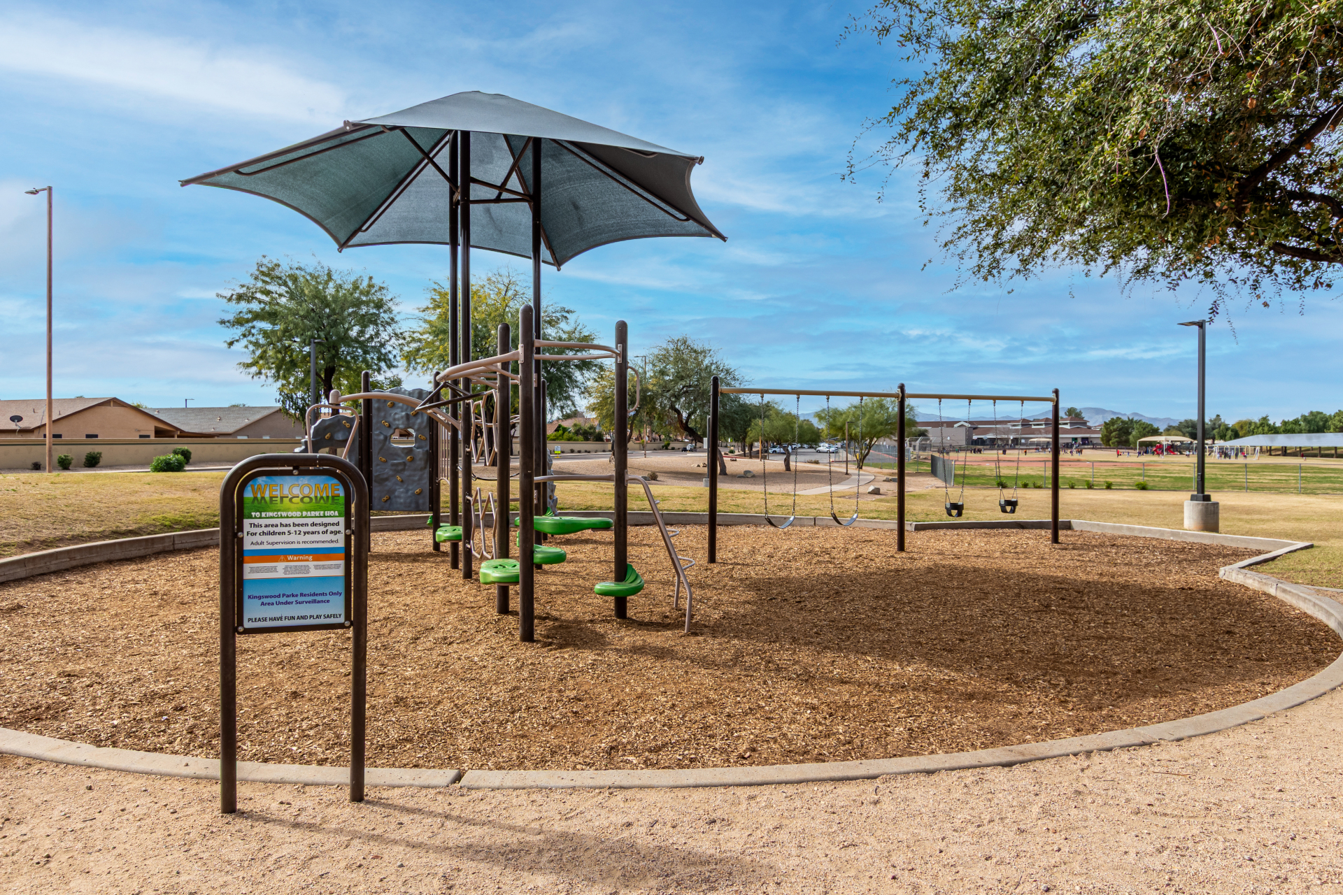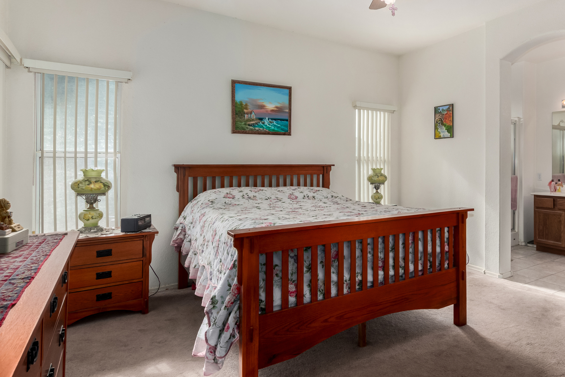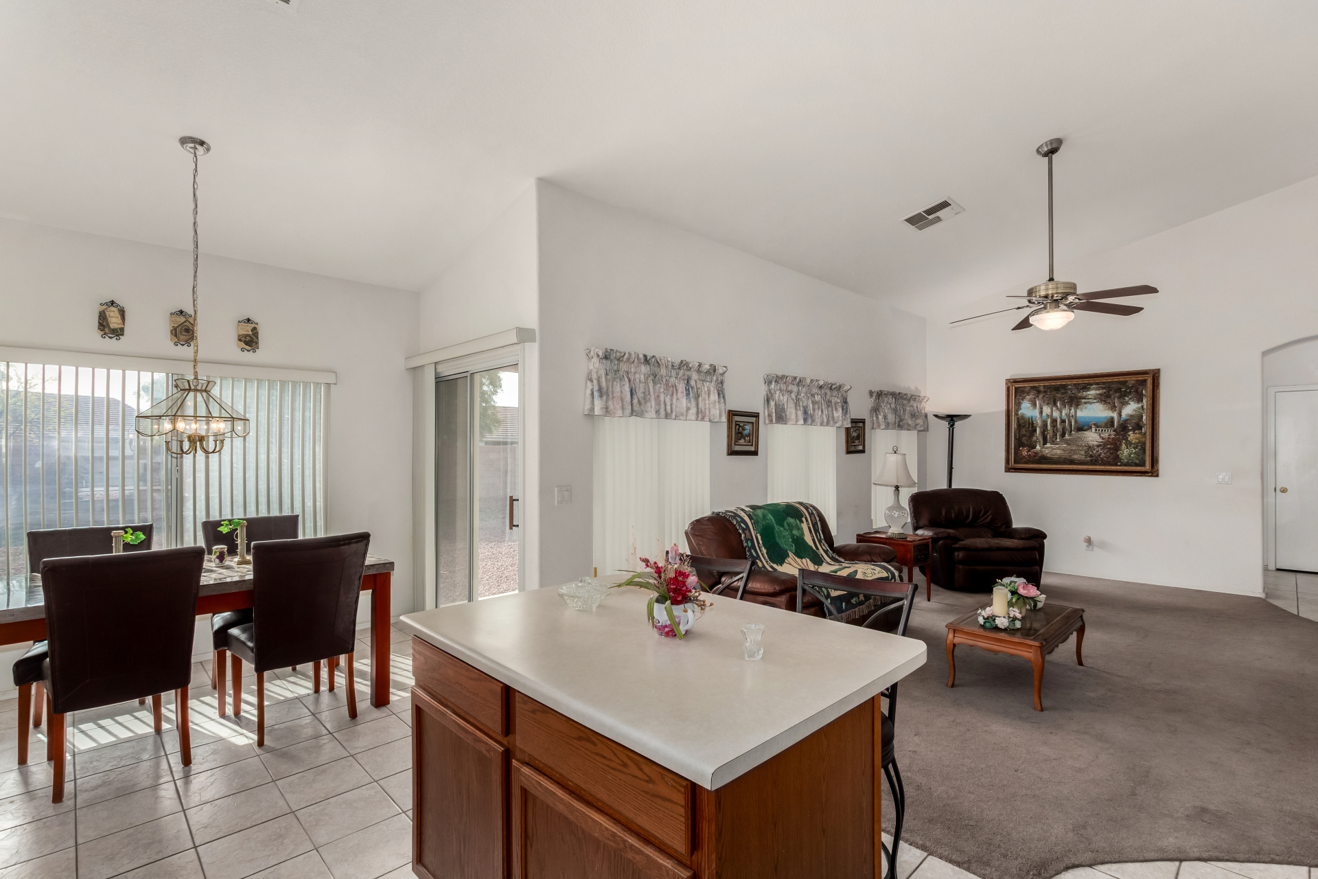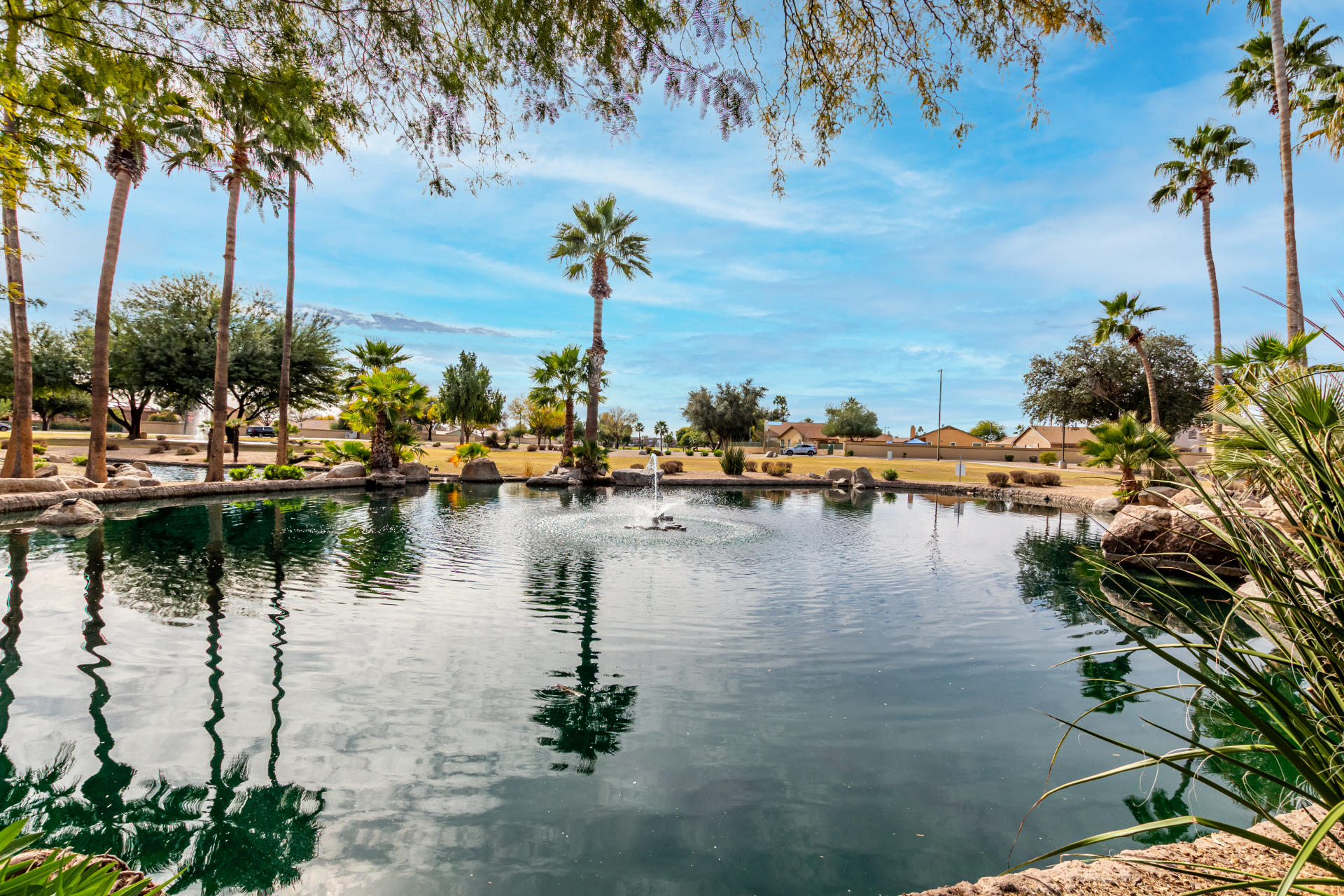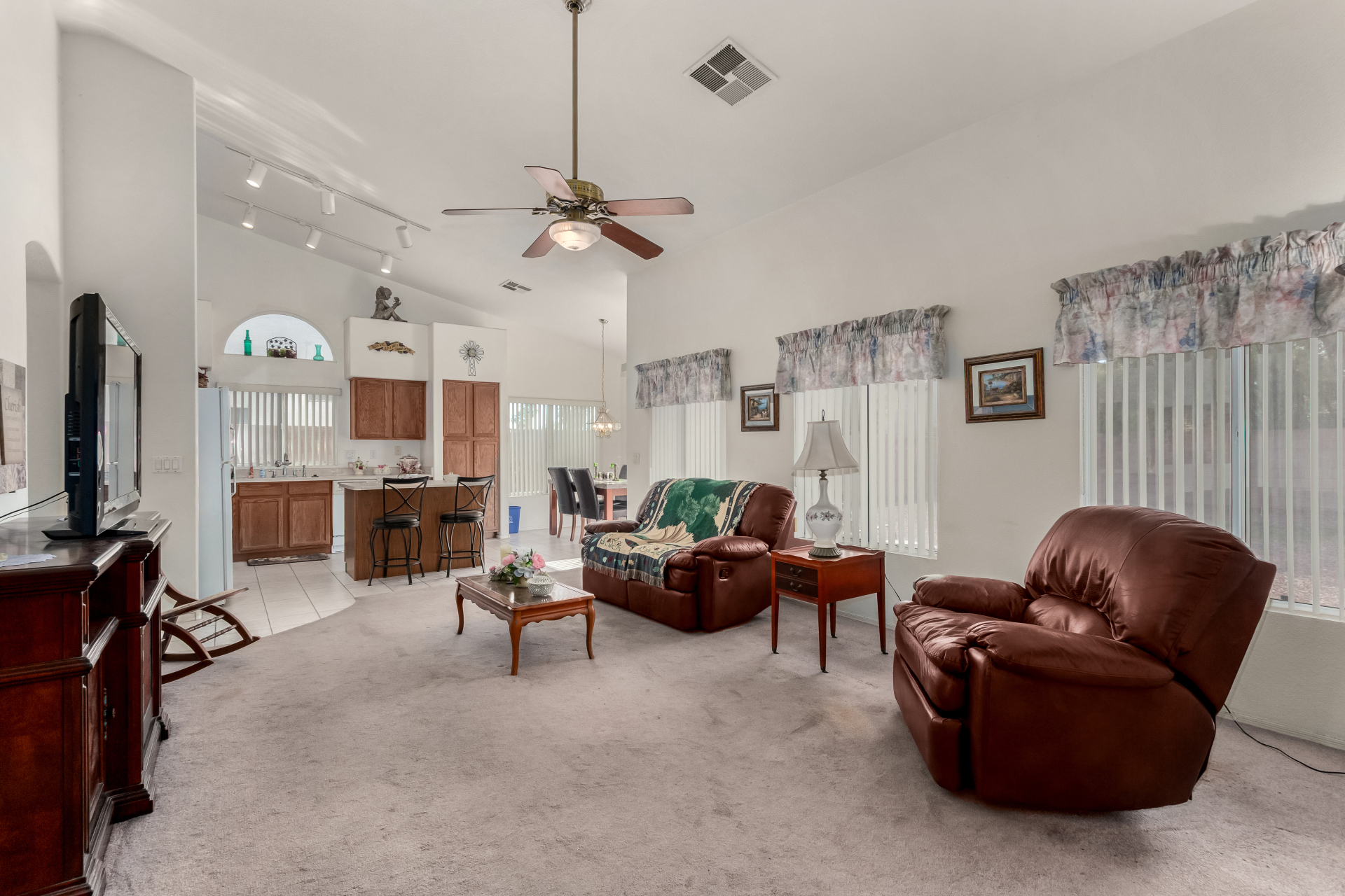 Seize the opportunity to own this charming 3-bedroom, 2-bath home with a NEW ROOF (2025)! The inviting living room features vaulted ceilings, a neutral palette, vertical blinds, and a combination of tile and soft carpeting. The well-designed kitchen offers ample wood cabinetry, track lighting, built-in appliances, and a center island with breakfast bar seating. The primary suite includes double-door entry, a walk-in closet, and an en-suite bath with dual sinks. Step outside to a spacious backyard with a covered patio, perfect for relaxing or entertaining. Community amenities include a park, playground, and serene lake views. Don't miss it!