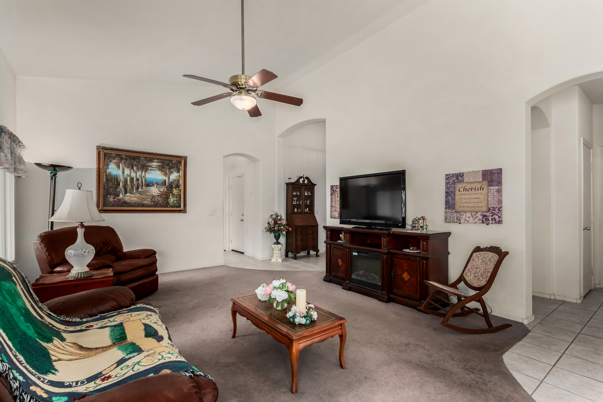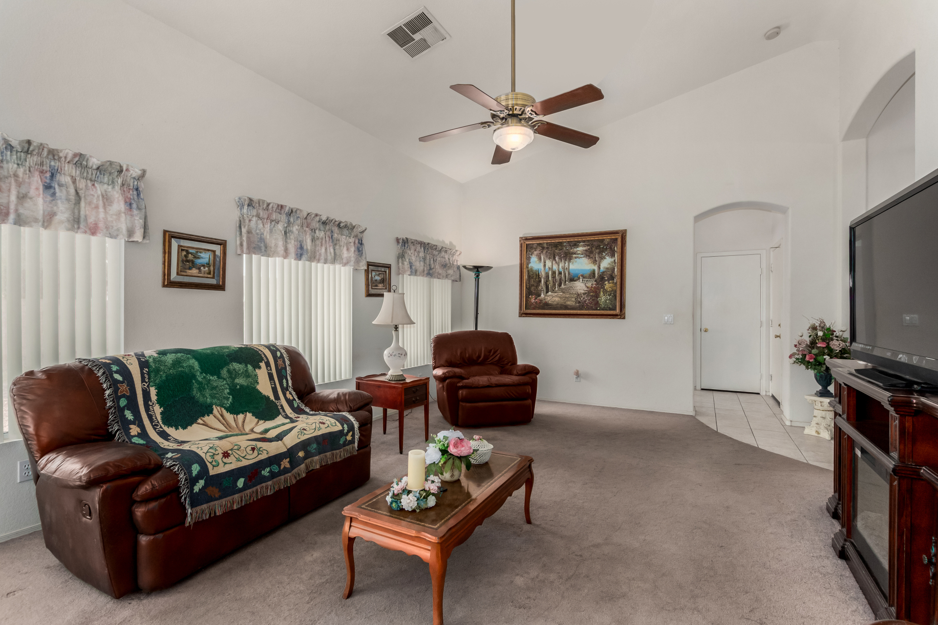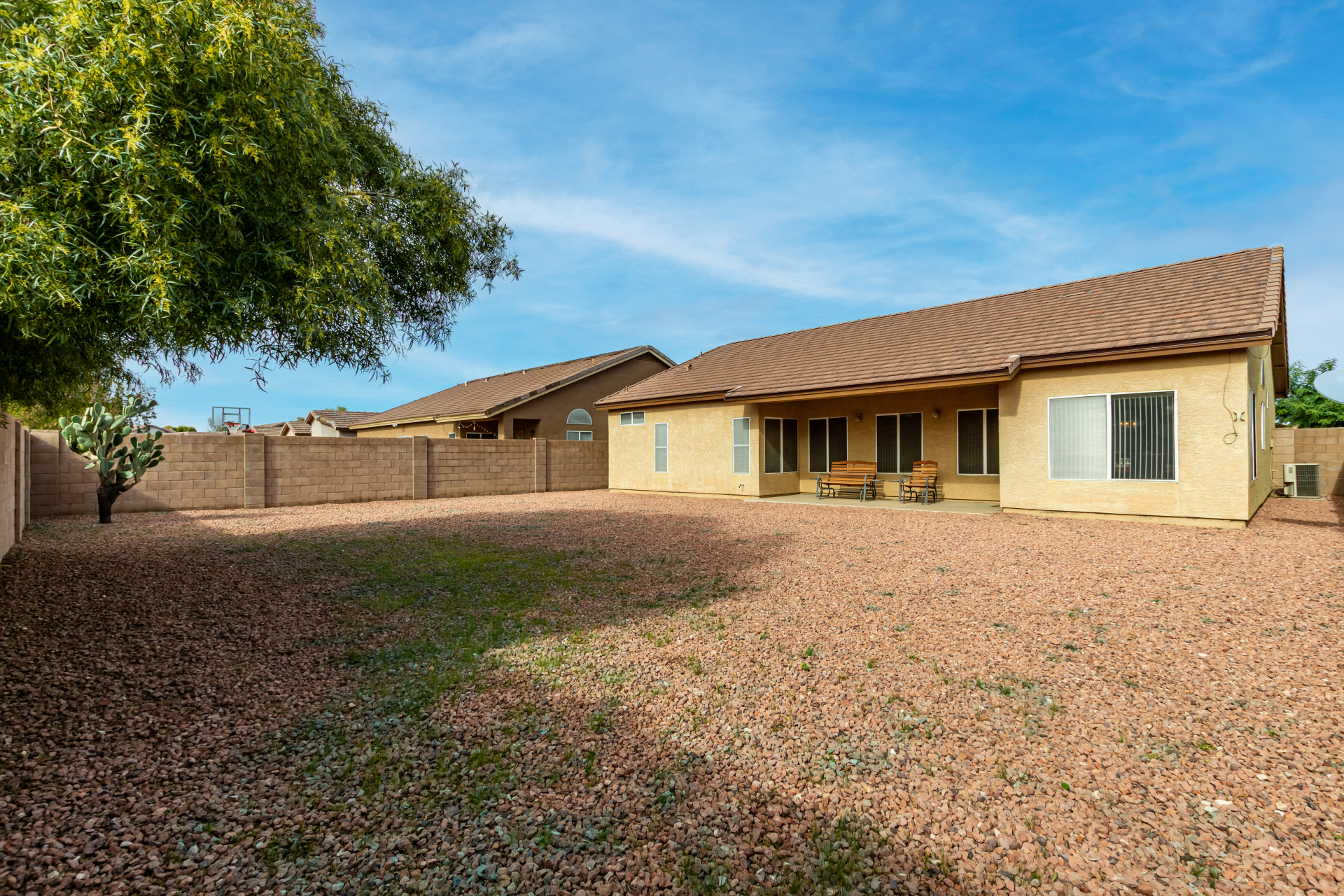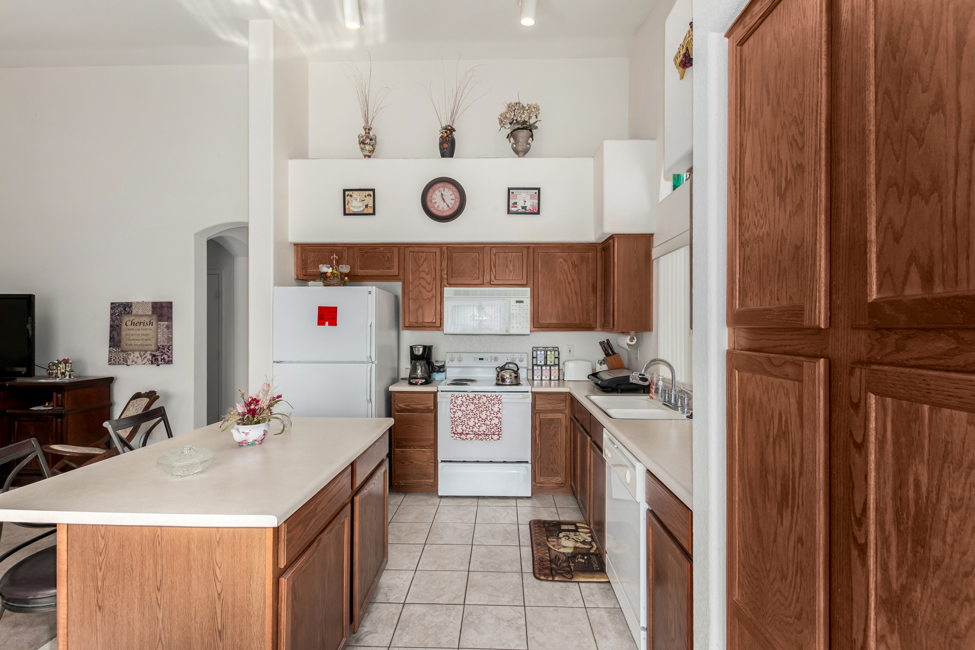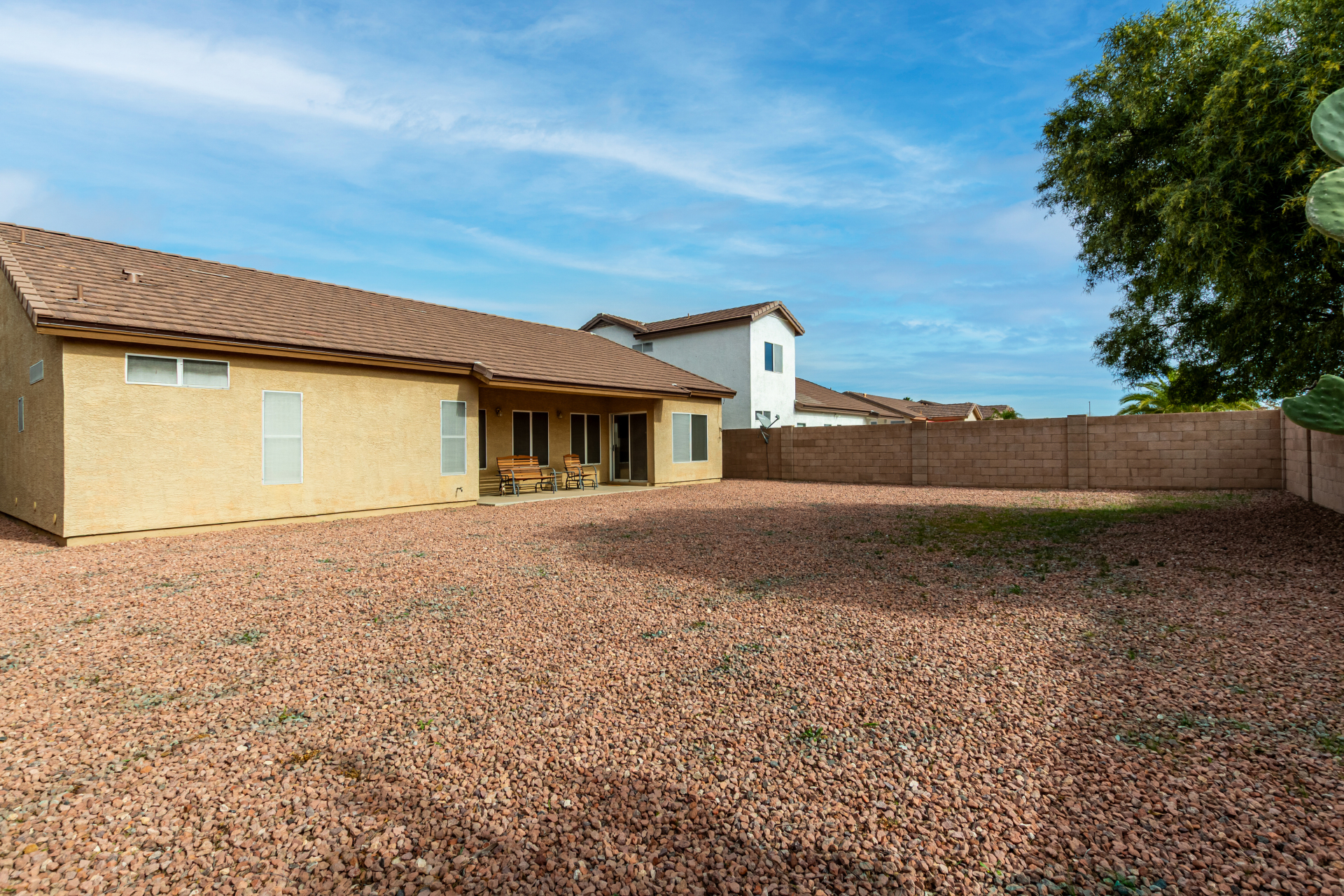 Seize the opportunity to own this charming 3-bedroom, 2-bath home with a NEW ROOF (2025)! The inviting living room features vaulted ceilings, a neutral palette, vertical blinds, and a combination of tile and soft carpeting. The well-designed kitchen offers ample wood cabinetry, track lighting, built-in appliances, and a center island with breakfast bar seating. The primary suite includes double-door entry, a walk-in closet, and an en-suite bath with dual sinks. Step outside to a spacious backyard with a covered patio, perfect for relaxing or entertaining. Community amenities include a park, playground, and serene lake views. Don't miss it!