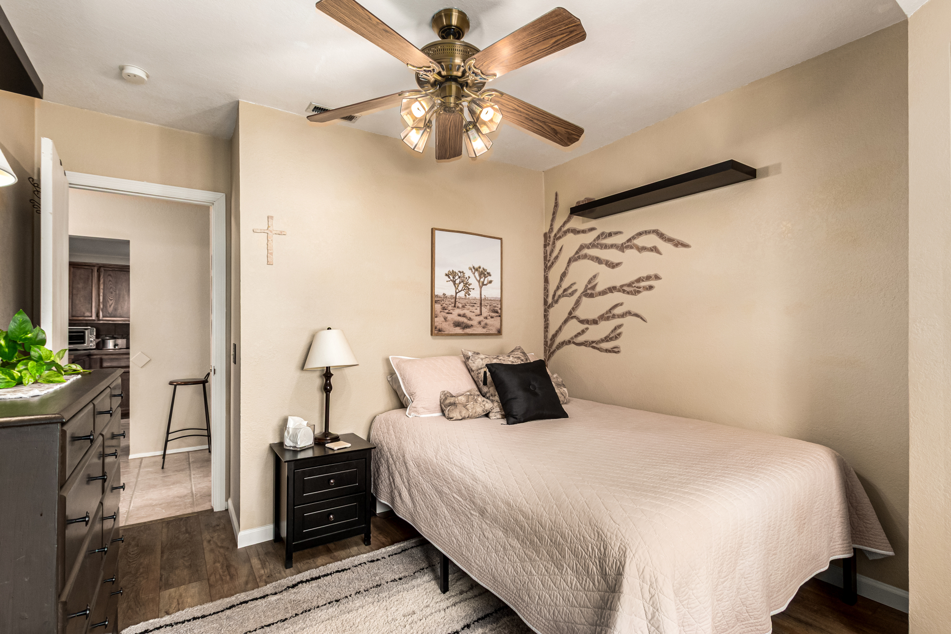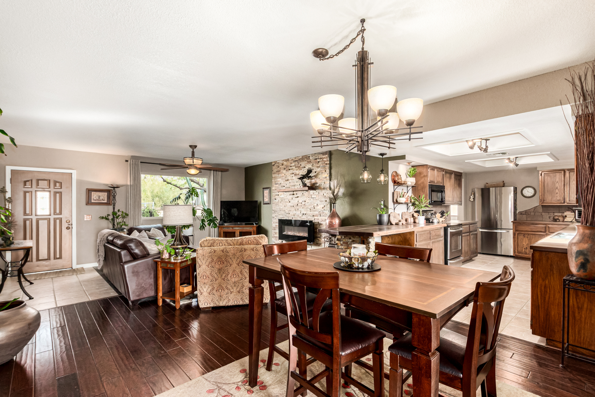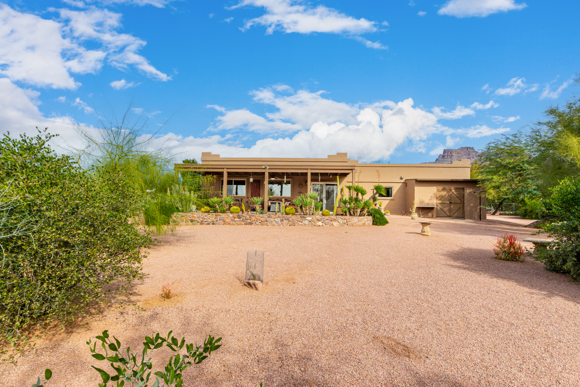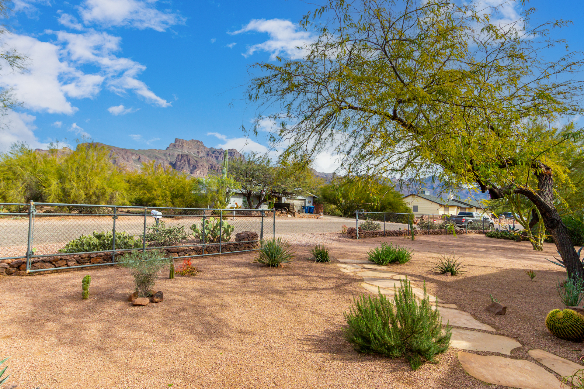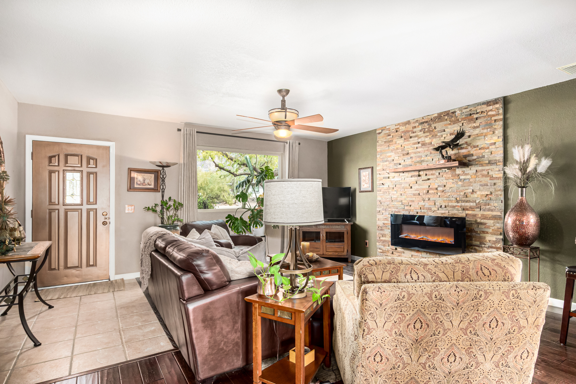 Your dream home is here! This stunning 4-bedroom property welcomes you with a lovely desert landscape, tasteful stone accents, a front patio, and majestic mountain views. Discover a spacious living room with a fresh palette, attractive wood-look flooring, and a cozy fireplace for intimate moments with loved ones. The impeccable kitchen comes with tile counters with a matching backsplash, ample wood cabinetry, stainless steel appliances, and a walk-in pantry for storing culinary essentials. The primary bedroom includes an ensuite with double sinks and a convenient walk-in closet. Unwind at the end of a long day in the sizeable backyard, offering a covered patio and abundant space for outdoor gatherings. Don't miss your chance to own this incredible gem!