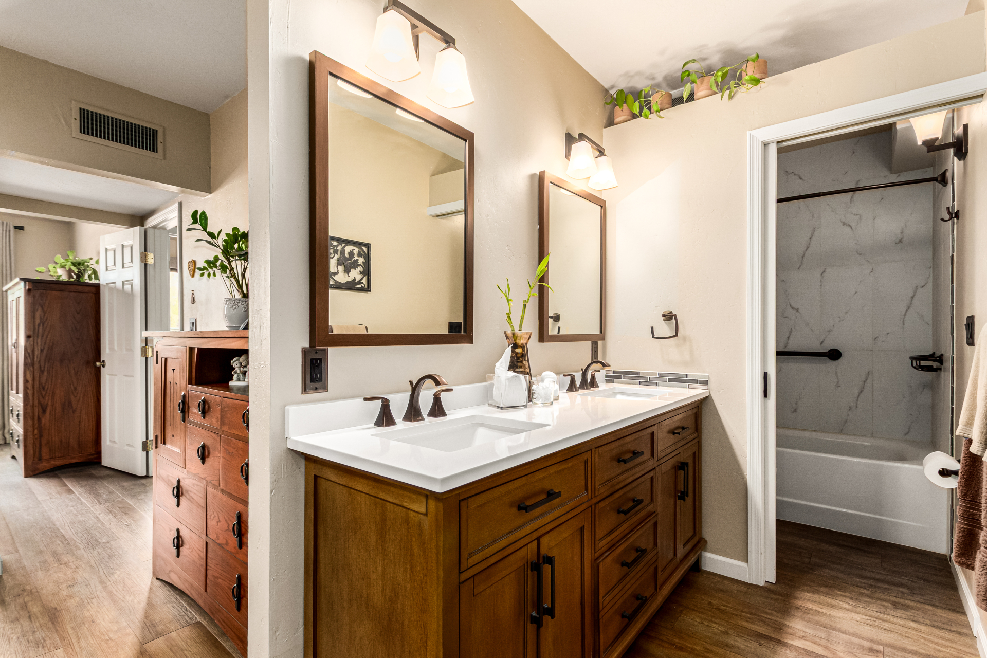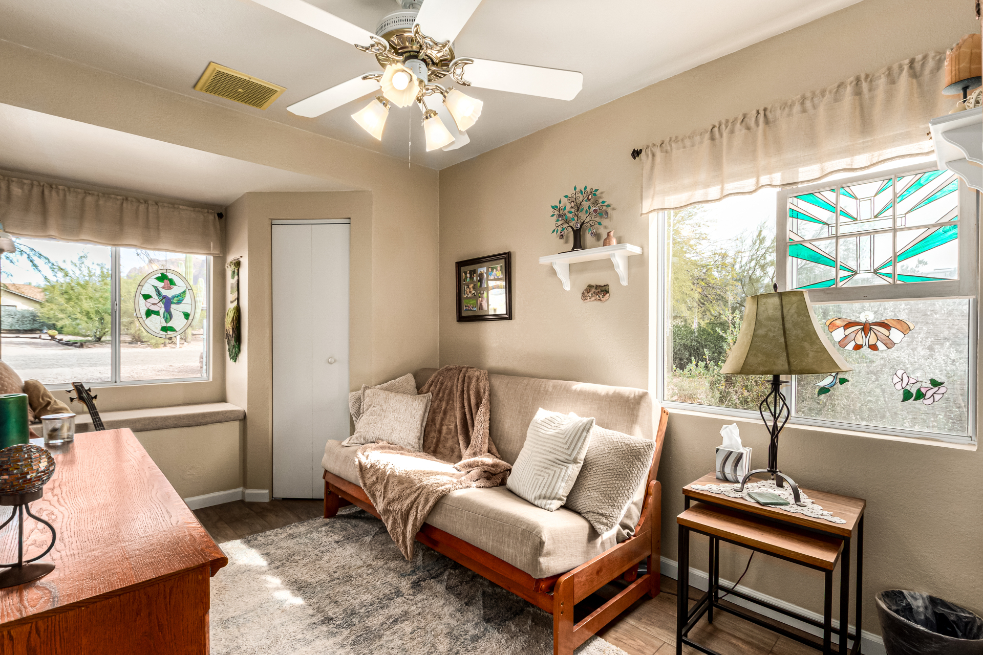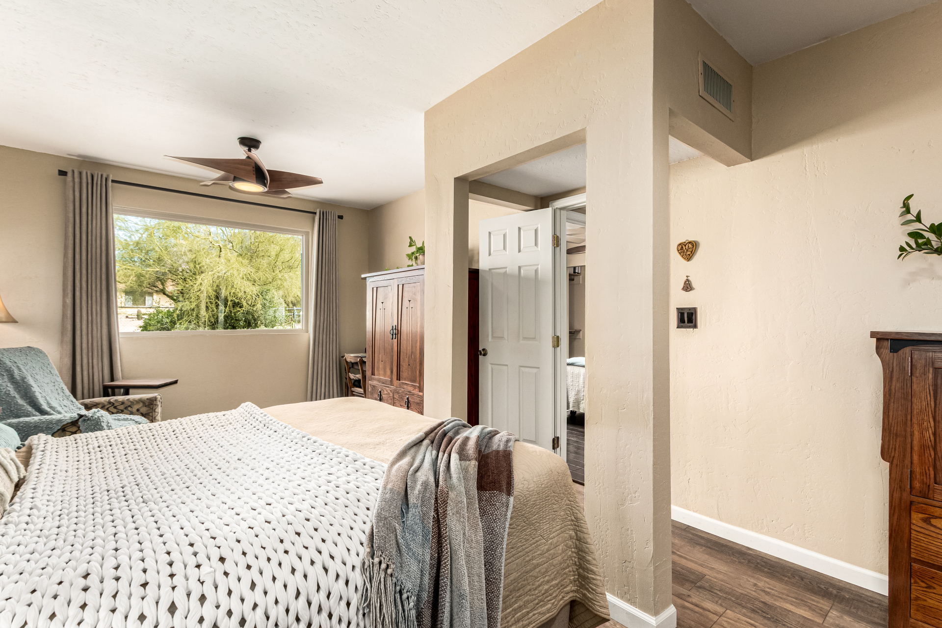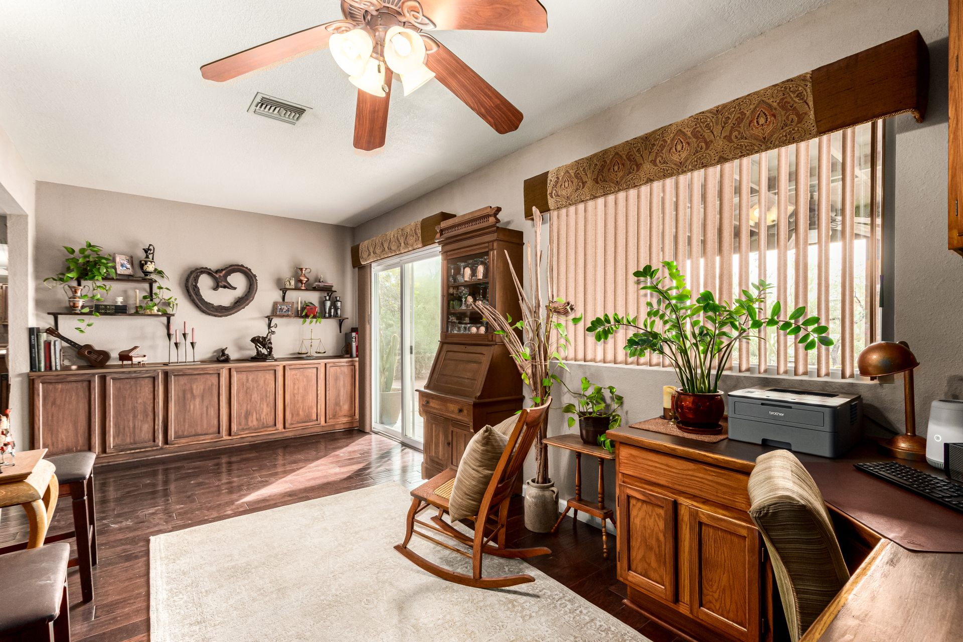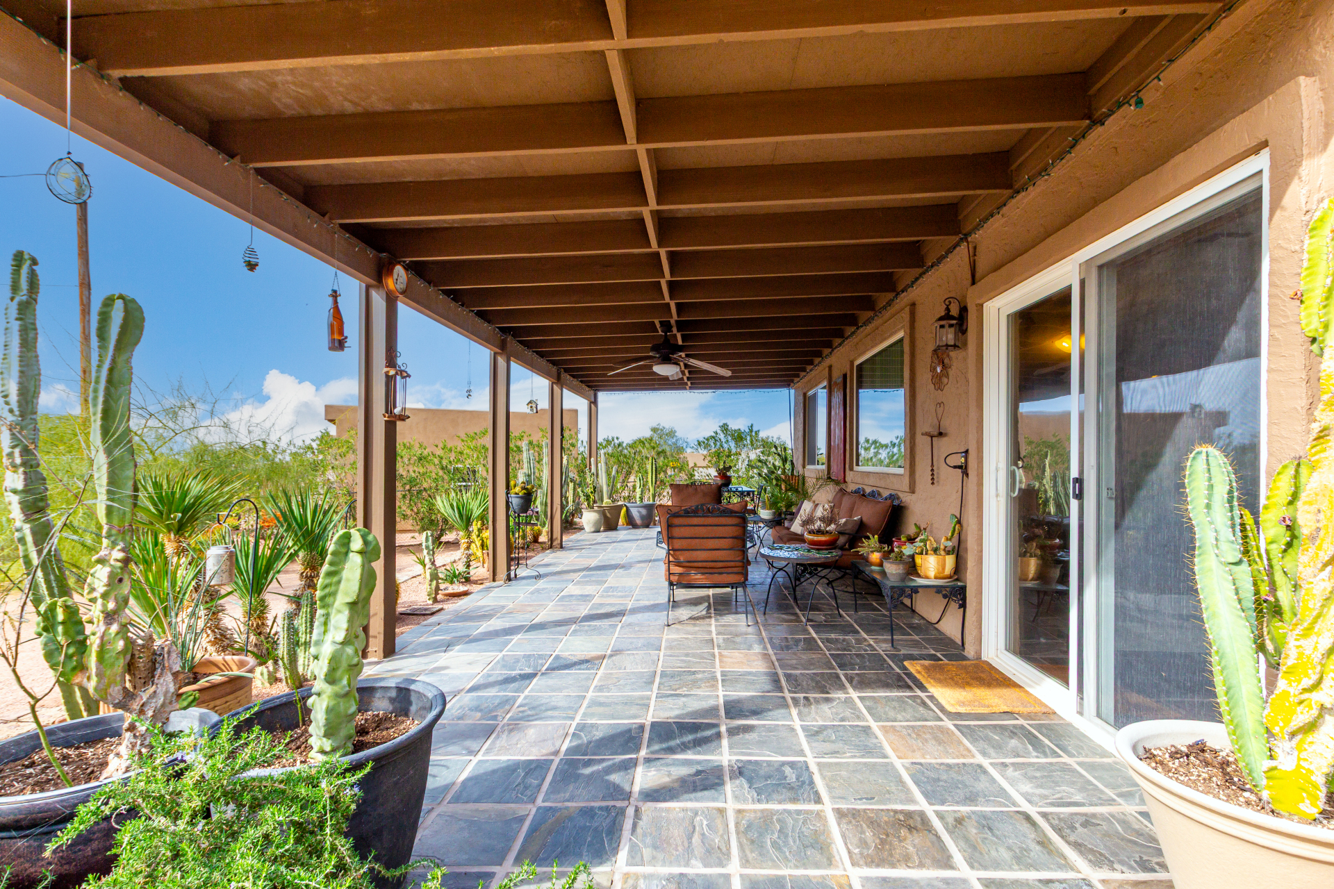 Your dream home is here! This stunning 4-bedroom property welcomes you with a lovely desert landscape, tasteful stone accents, a front patio, and majestic mountain views. Discover a spacious living room with a fresh palette, attractive wood-look flooring, and a cozy fireplace for intimate moments with loved ones. The impeccable kitchen comes with tile counters with a matching backsplash, ample wood cabinetry, stainless steel appliances, and a walk-in pantry for storing culinary essentials. The primary bedroom includes an ensuite with double sinks and a convenient walk-in closet. Unwind at the end of a long day in the sizeable backyard, offering a covered patio and abundant space for outdoor gatherings. Don't miss your chance to own this incredible gem!