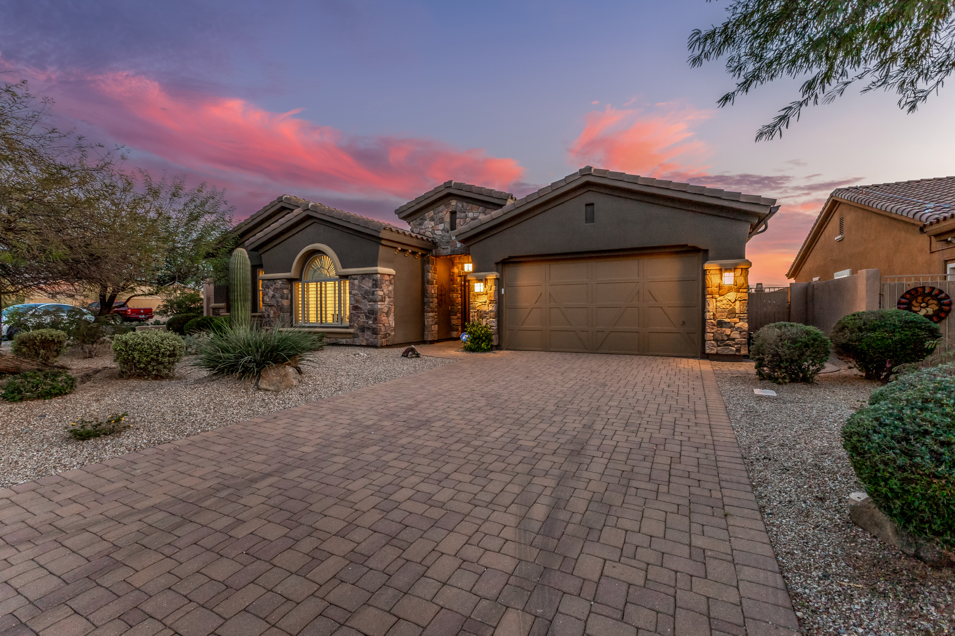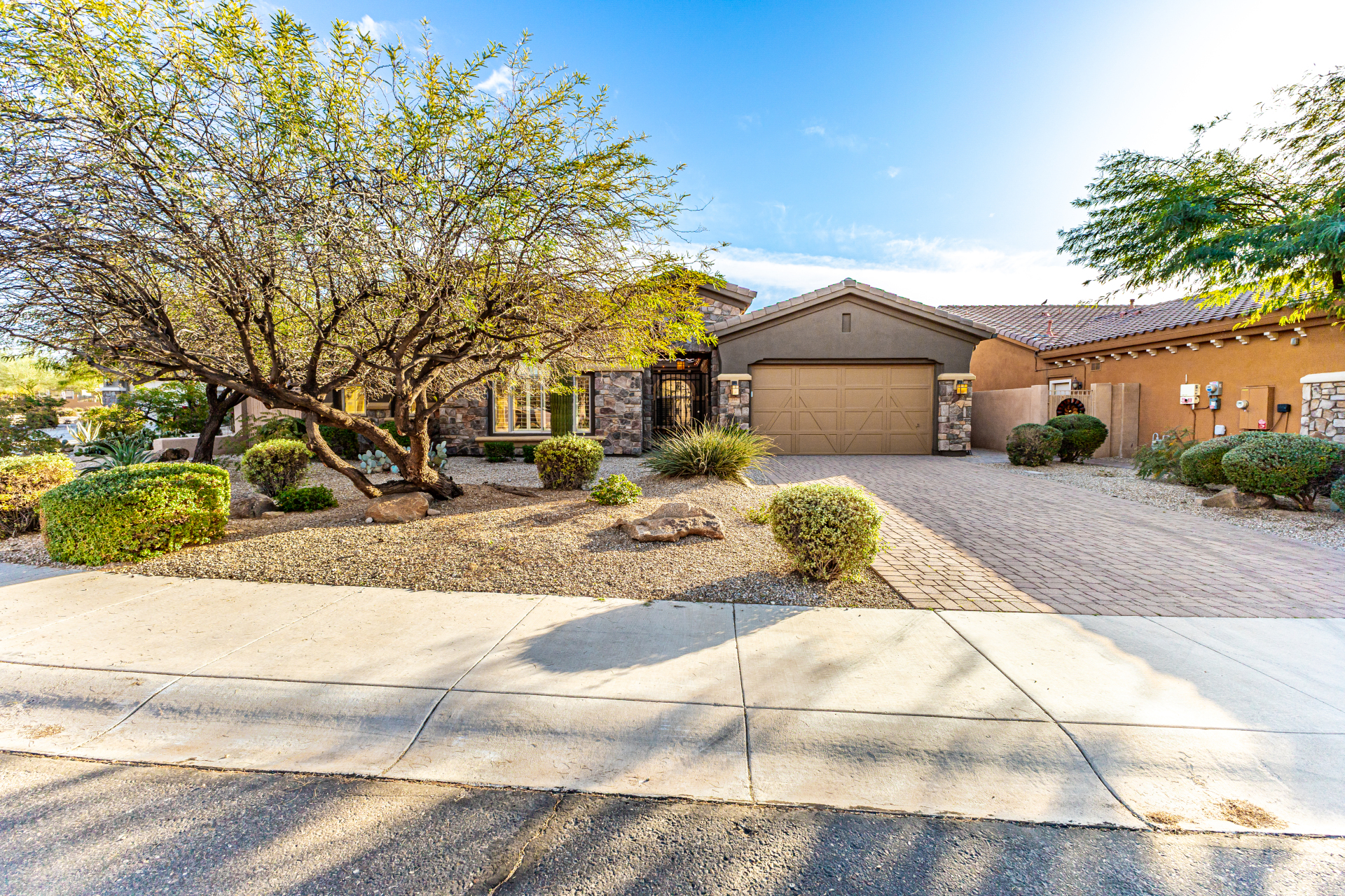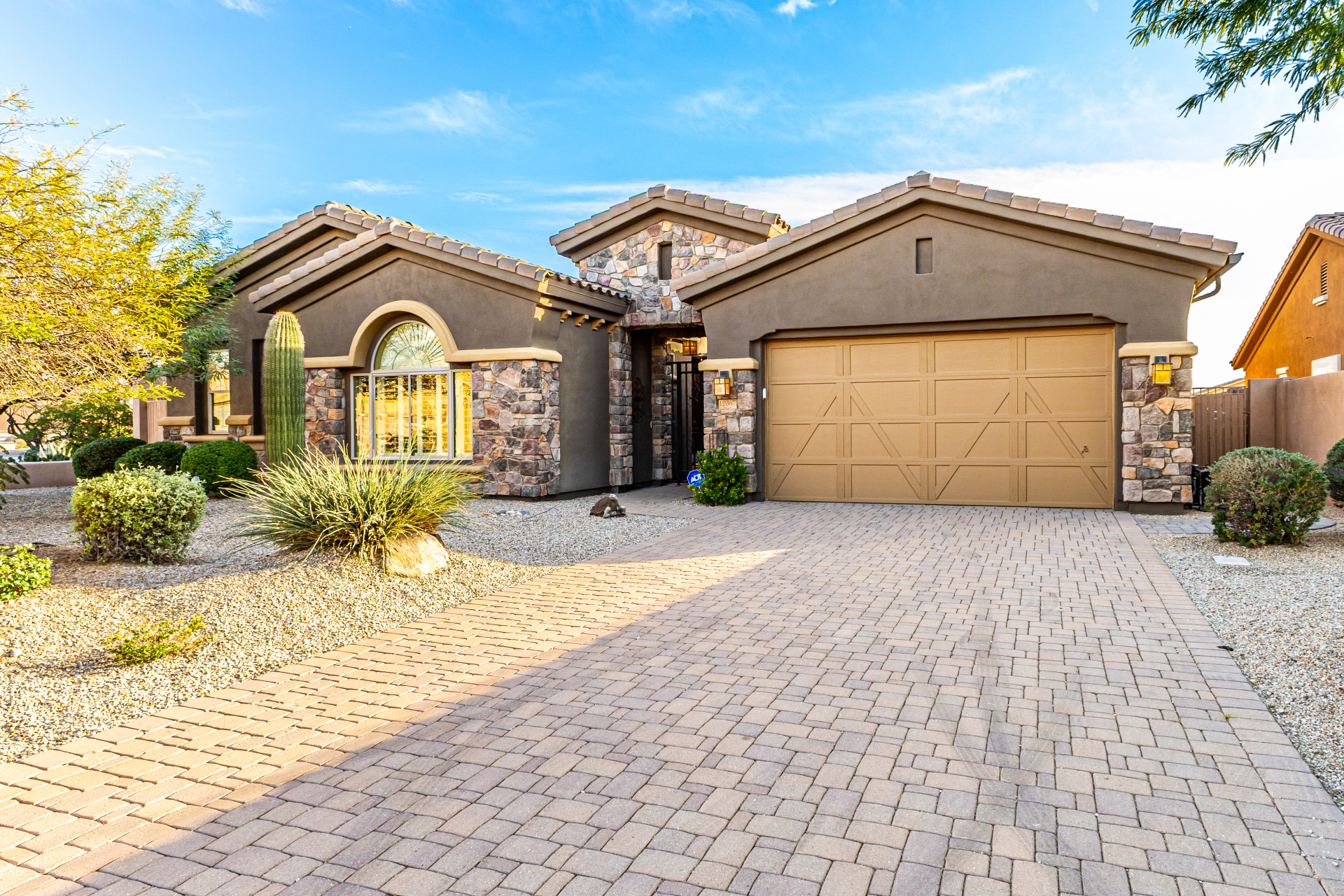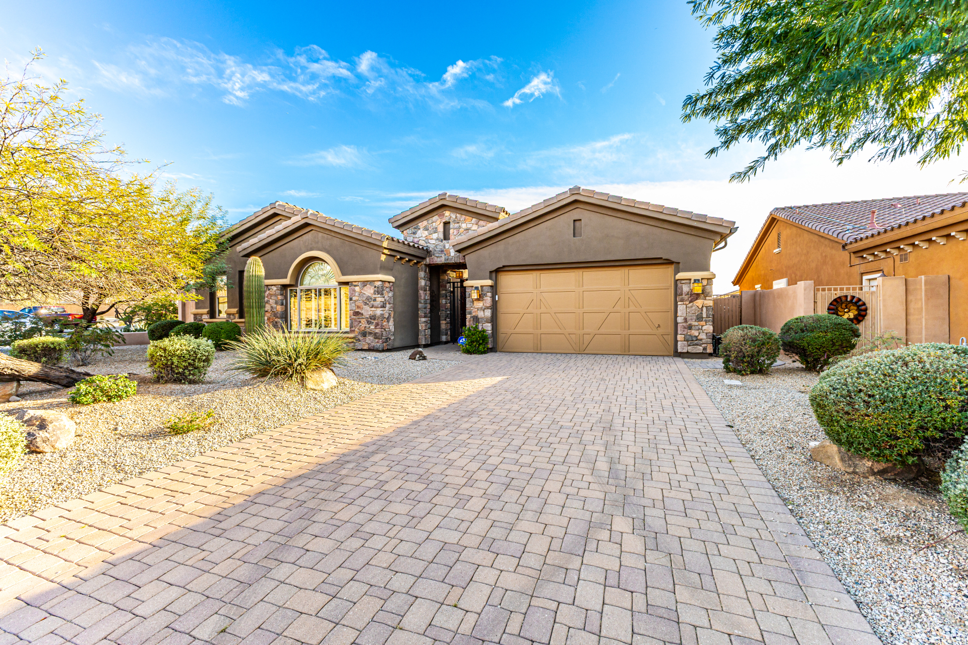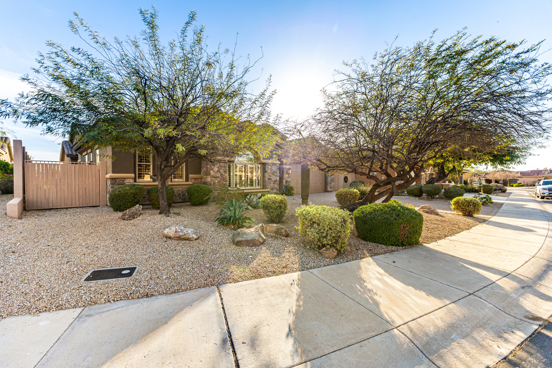 Welcome to this stunning 4-bedroom estate on a tranquil cul-de-sac in the highly sought-after Estrella Mountain Ranch! From the moment you arrive, you'll be captivated by the Tuscan-inspired curb appeal, featuring meticulously maintained desert landscaping and an extended paver driveway. Step through the gated courtyard into a welcoming foyer that opens into an amazing living/dining room. Rich wood flooring & a custom dry bar create the perfect setting for entertaining. The thoughtfully designed interior includes tile flooring in high-traffic areas, stylish lighting throughout, and a versatile den with closet space. The inviting family room showcases a dramatic stone-accented fireplace & multi-slide glass doors that blur the lines between indoor & outdoor living.