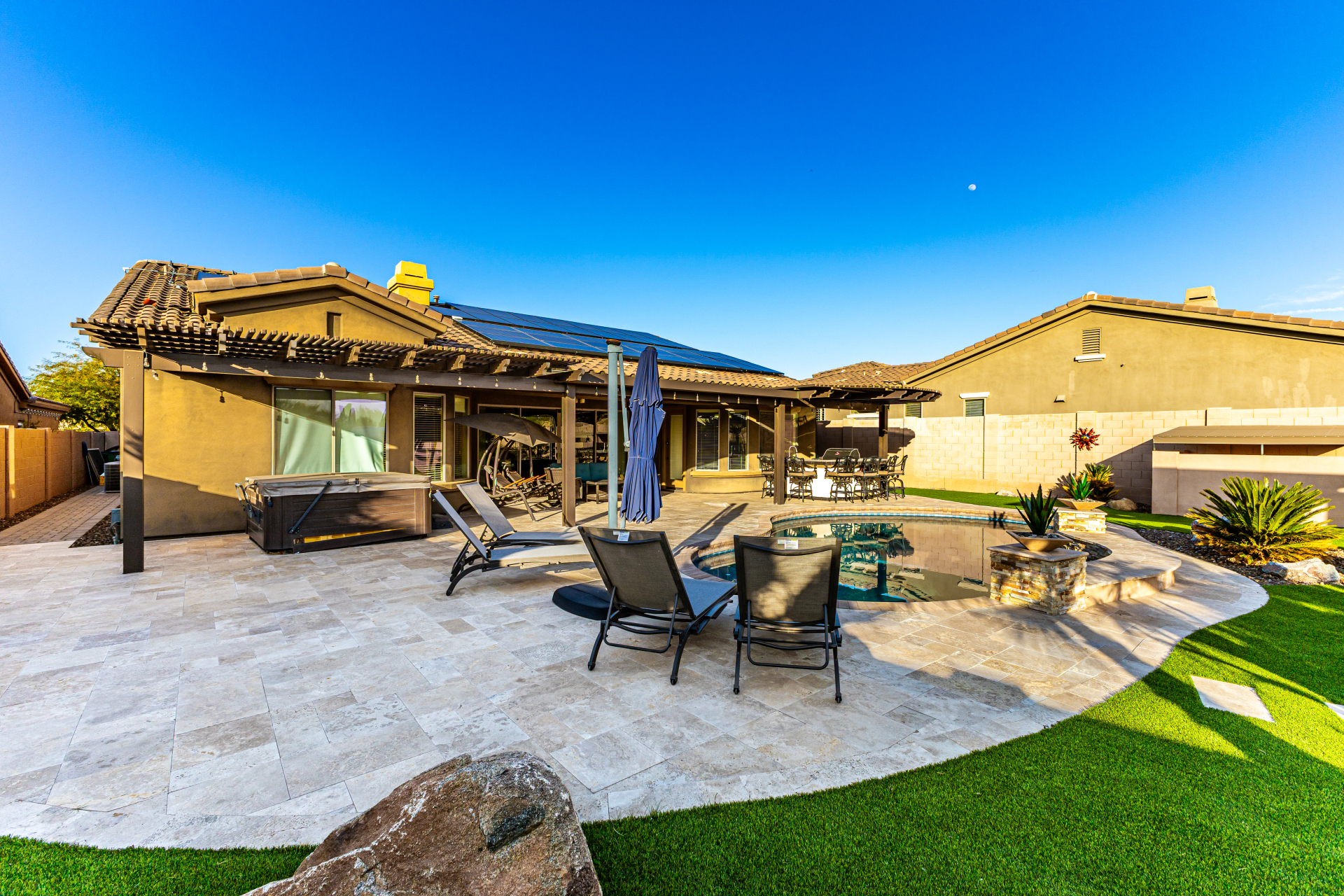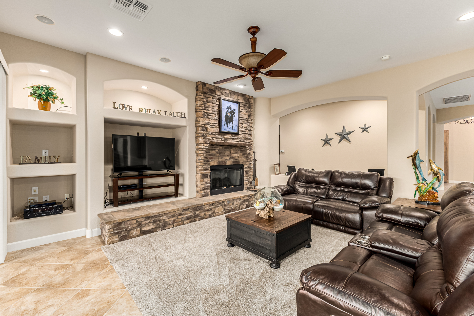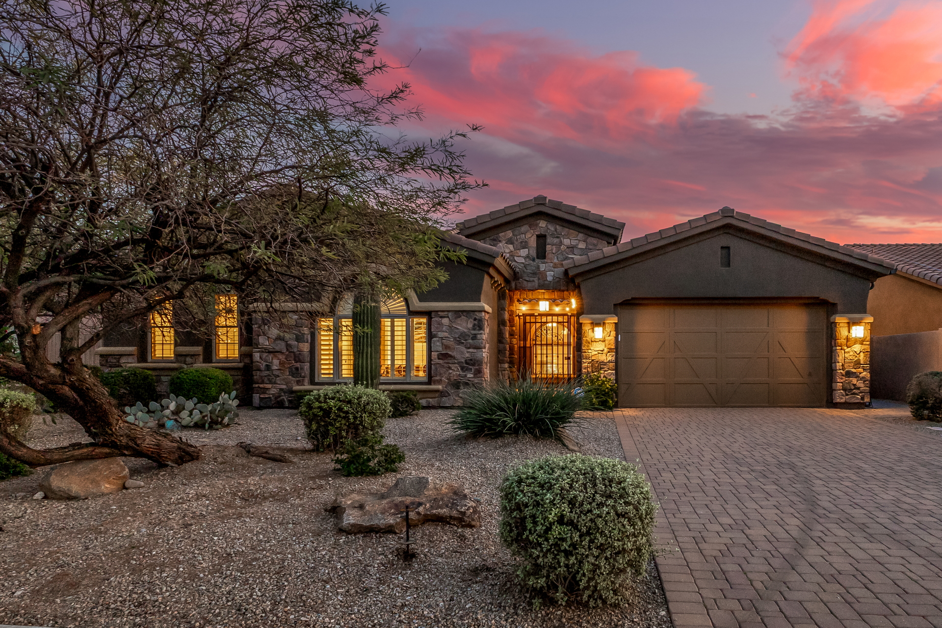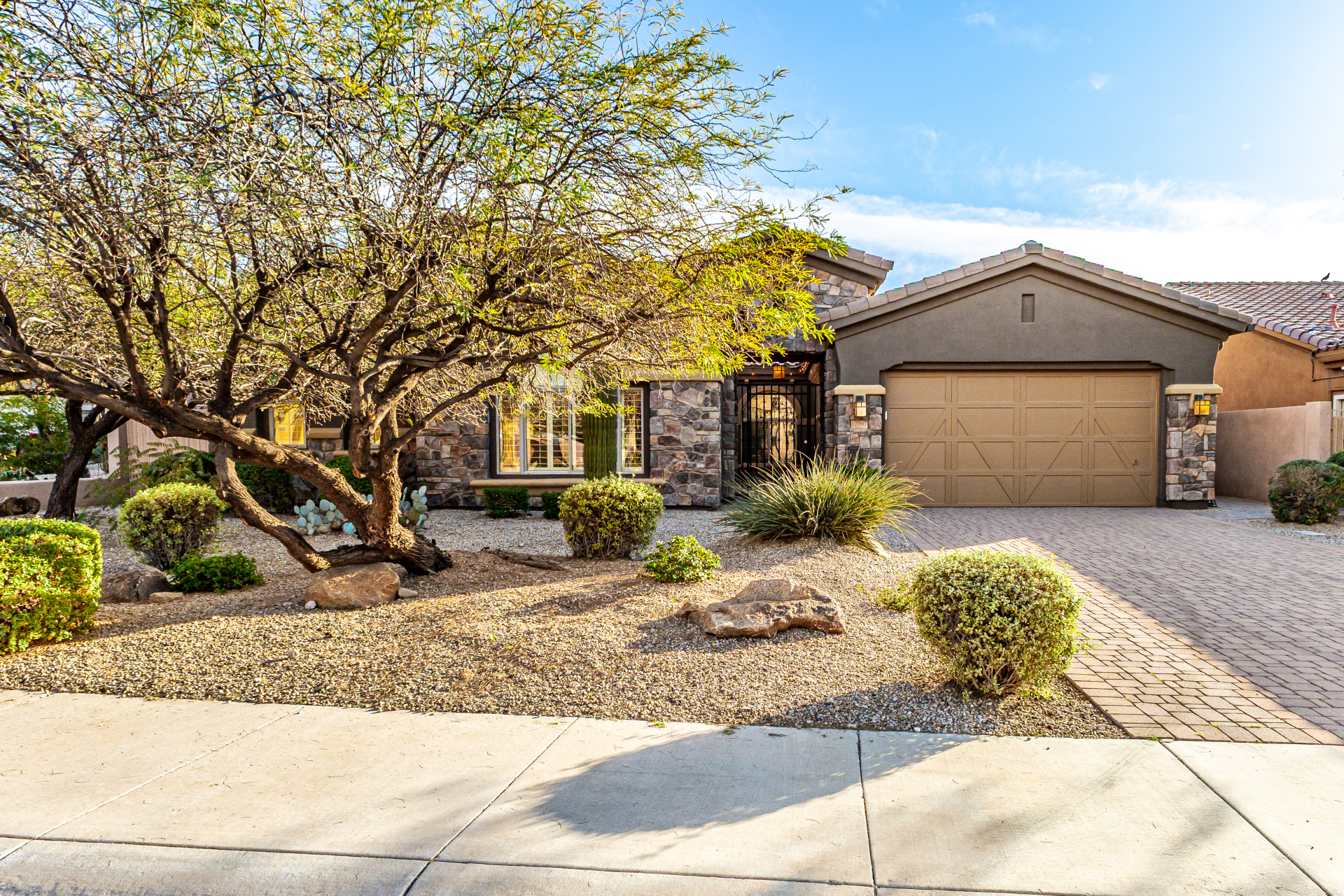 Welcome to this stunning 4-bedroom estate on a tranquil cul-de-sac in the highly sought-after Estrella Mountain Ranch! From the moment you arrive, you'll be captivated by the Tuscan-inspired curb appeal, featuring meticulously maintained desert landscaping and an extended paver driveway. Step through the gated courtyard into a welcoming foyer that opens into an amazing living/dining room. Rich wood flooring & a custom dry bar create the perfect setting for entertaining. The thoughtfully designed interior includes tile flooring in high-traffic areas, stylish lighting throughout, and a versatile den with closet space. The inviting family room showcases a dramatic stone-accented fireplace & multi-slide glass doors that blur the lines between indoor & outdoor living.