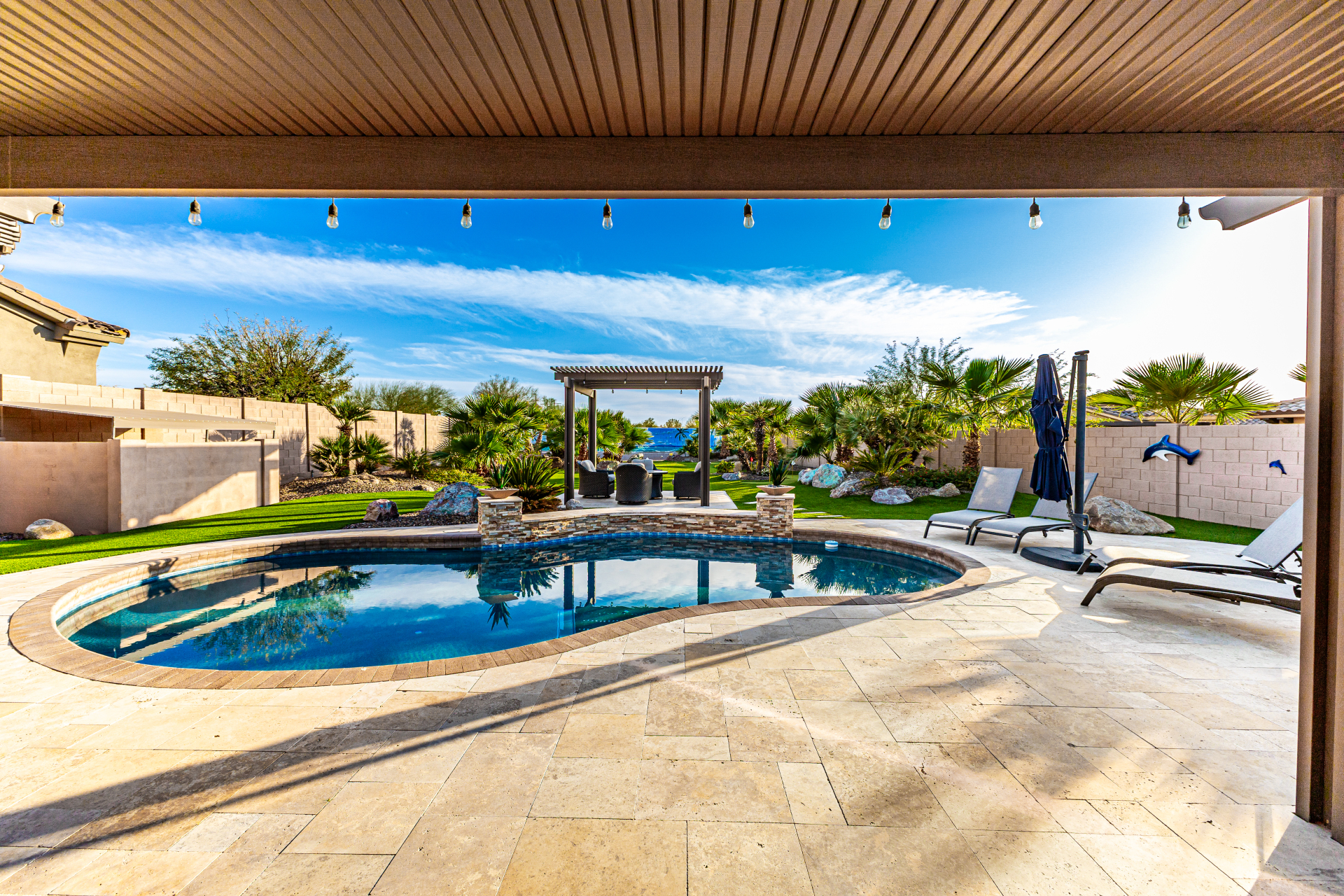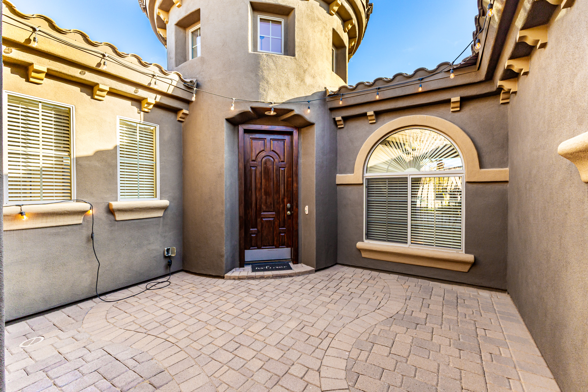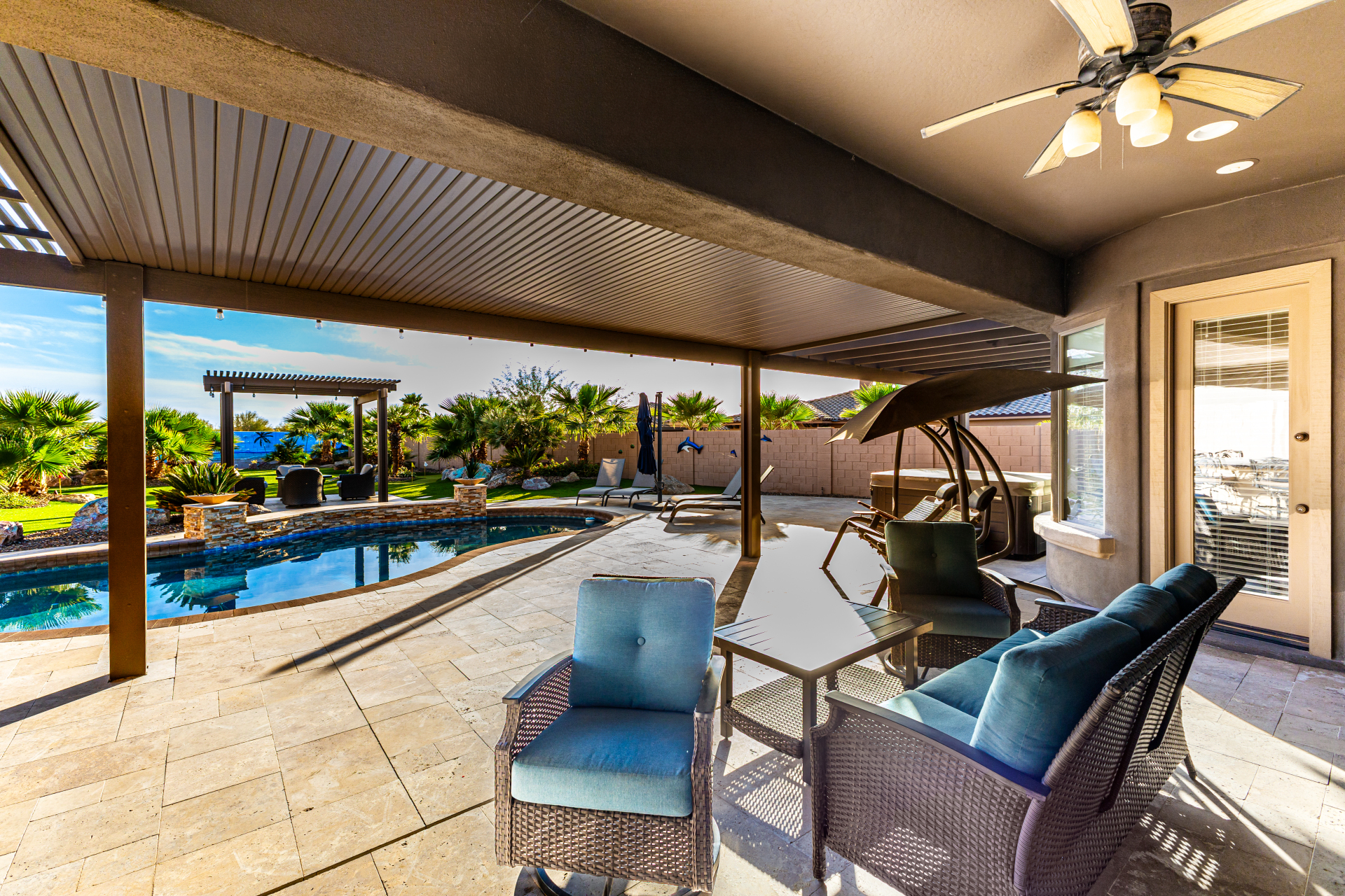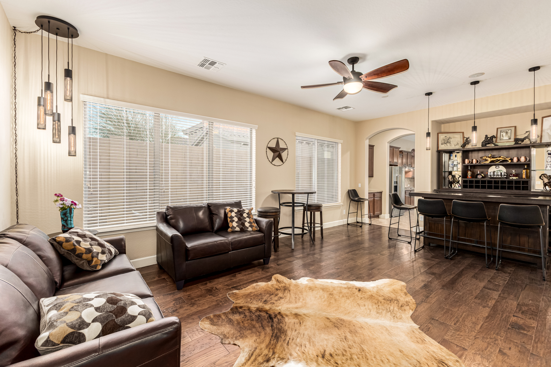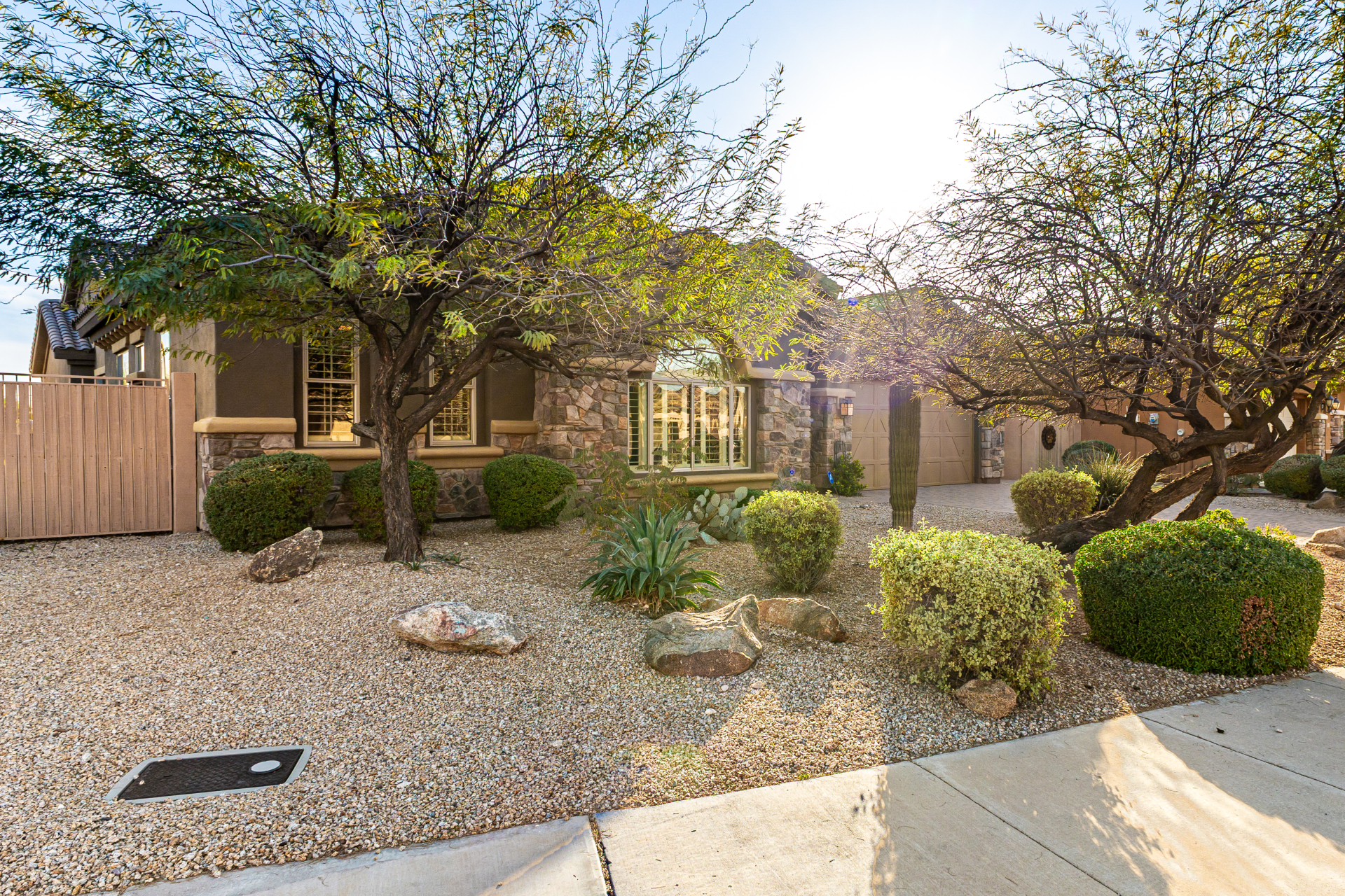 Welcome to this stunning 4-bedroom estate on a tranquil cul-de-sac in the highly sought-after Estrella Mountain Ranch! From the moment you arrive, you'll be captivated by the Tuscan-inspired curb appeal, featuring meticulously maintained desert landscaping and an extended paver driveway. Step through the gated courtyard into a welcoming foyer that opens into an amazing living/dining room. Rich wood flooring & a custom dry bar create the perfect setting for entertaining. The thoughtfully designed interior includes tile flooring in high-traffic areas, stylish lighting throughout, and a versatile den with closet space. The inviting family room showcases a dramatic stone-accented fireplace & multi-slide glass doors that blur the lines between indoor & outdoor living.