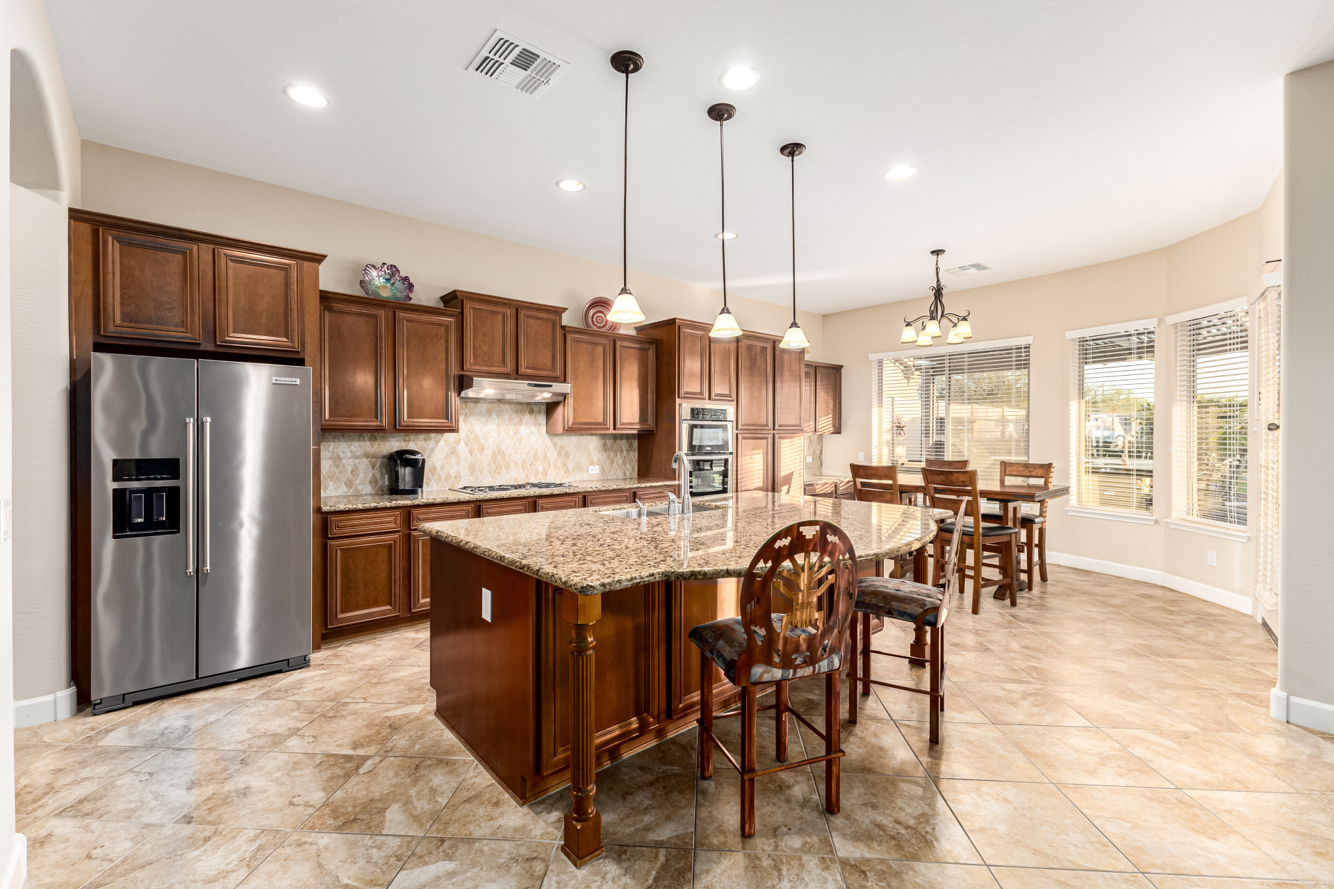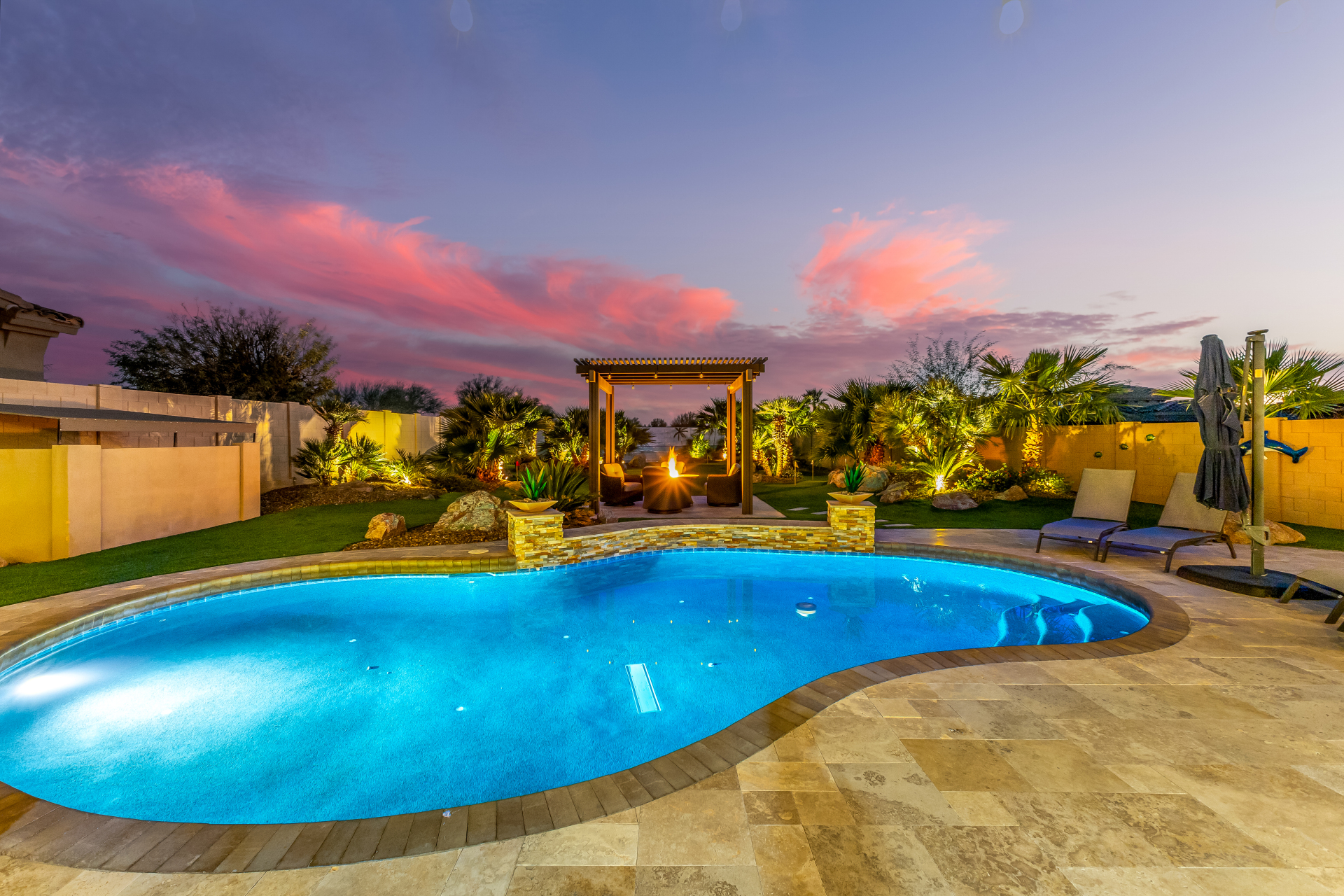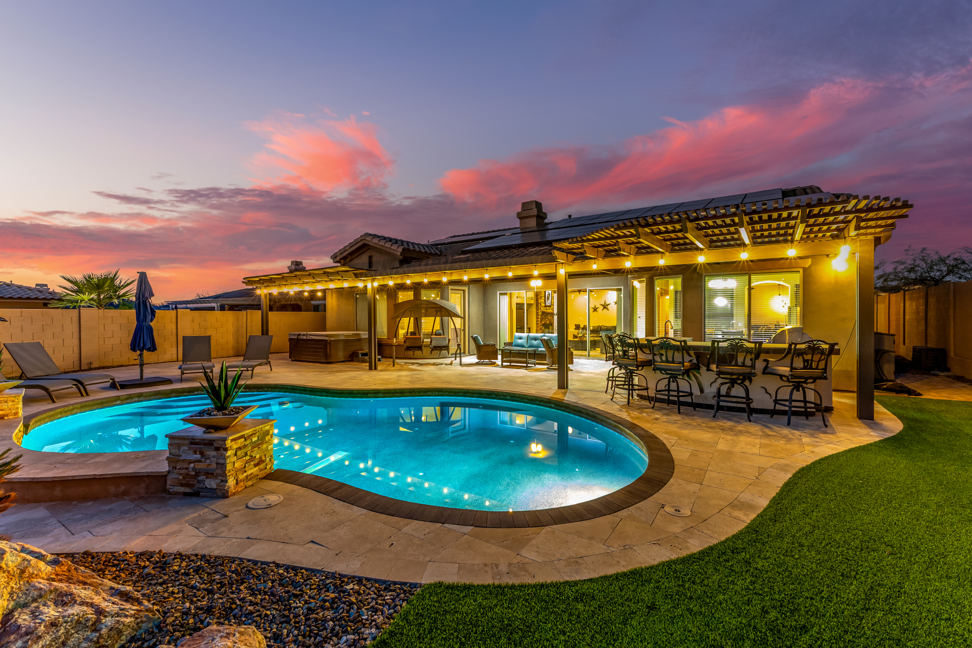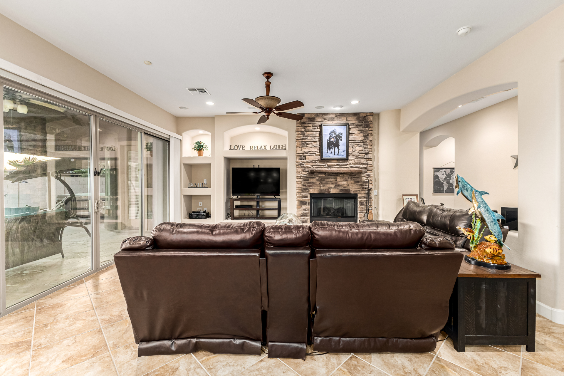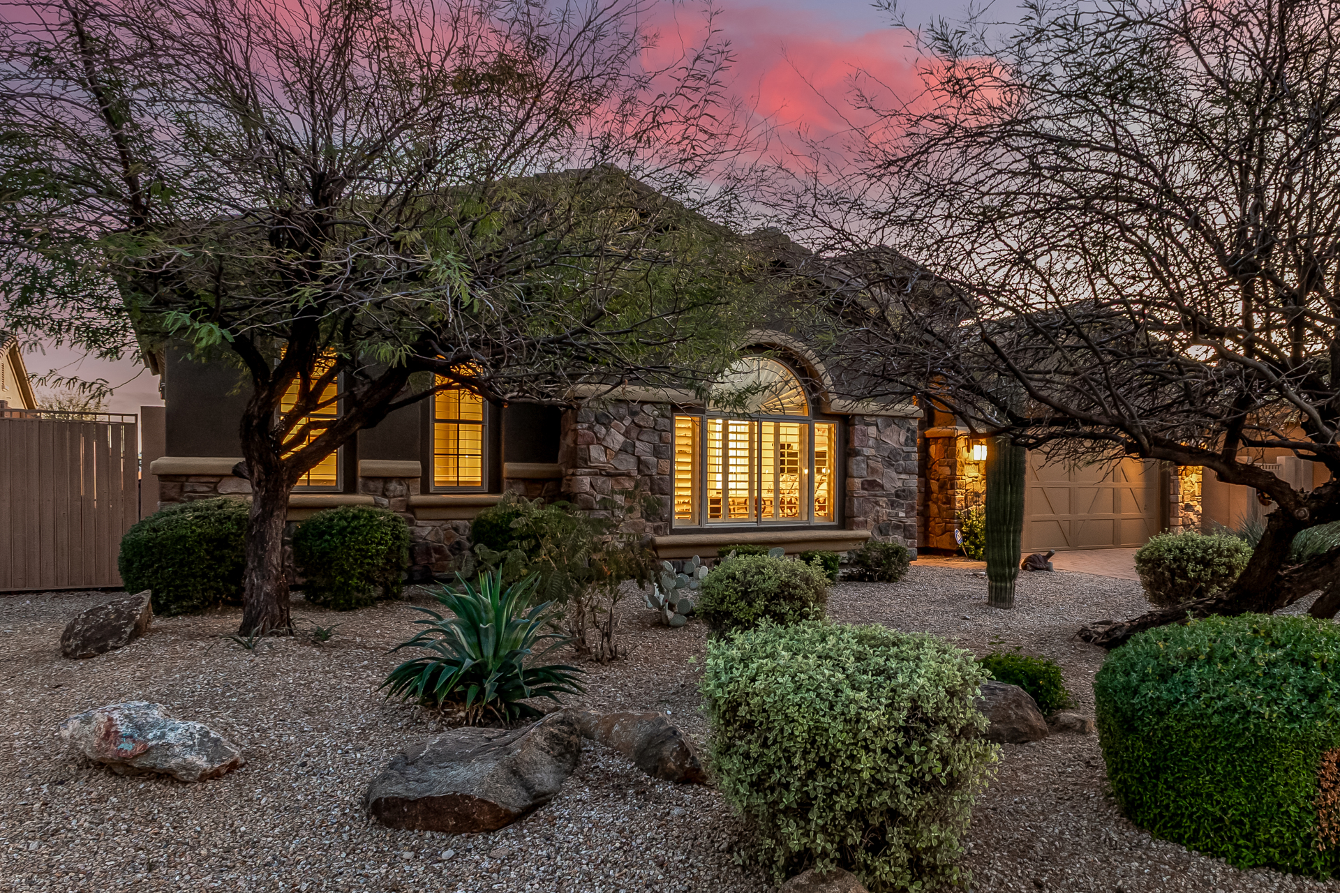Welcome to this stunning 4-bedroom estate on a tranquil cul-de-sac in the highly sought-after Estrella Mountain Ranch! From the moment you arrive, you'll be captivated by the Tuscan-inspired curb appeal, featuring meticulously maintained desert landscaping and an extended paver driveway. Step through the gated courtyard into a welcoming foyer that opens into an amazing living/dining room. Rich wood flooring & a custom dry bar create the perfect setting for entertaining. The thoughtfully designed interior includes tile flooring in high-traffic areas, stylish lighting throughout, and a versatile den with closet space. The inviting family room showcases a dramatic stone-accented fireplace & multi-slide glass doors that blur the lines between indoor & outdoor living.