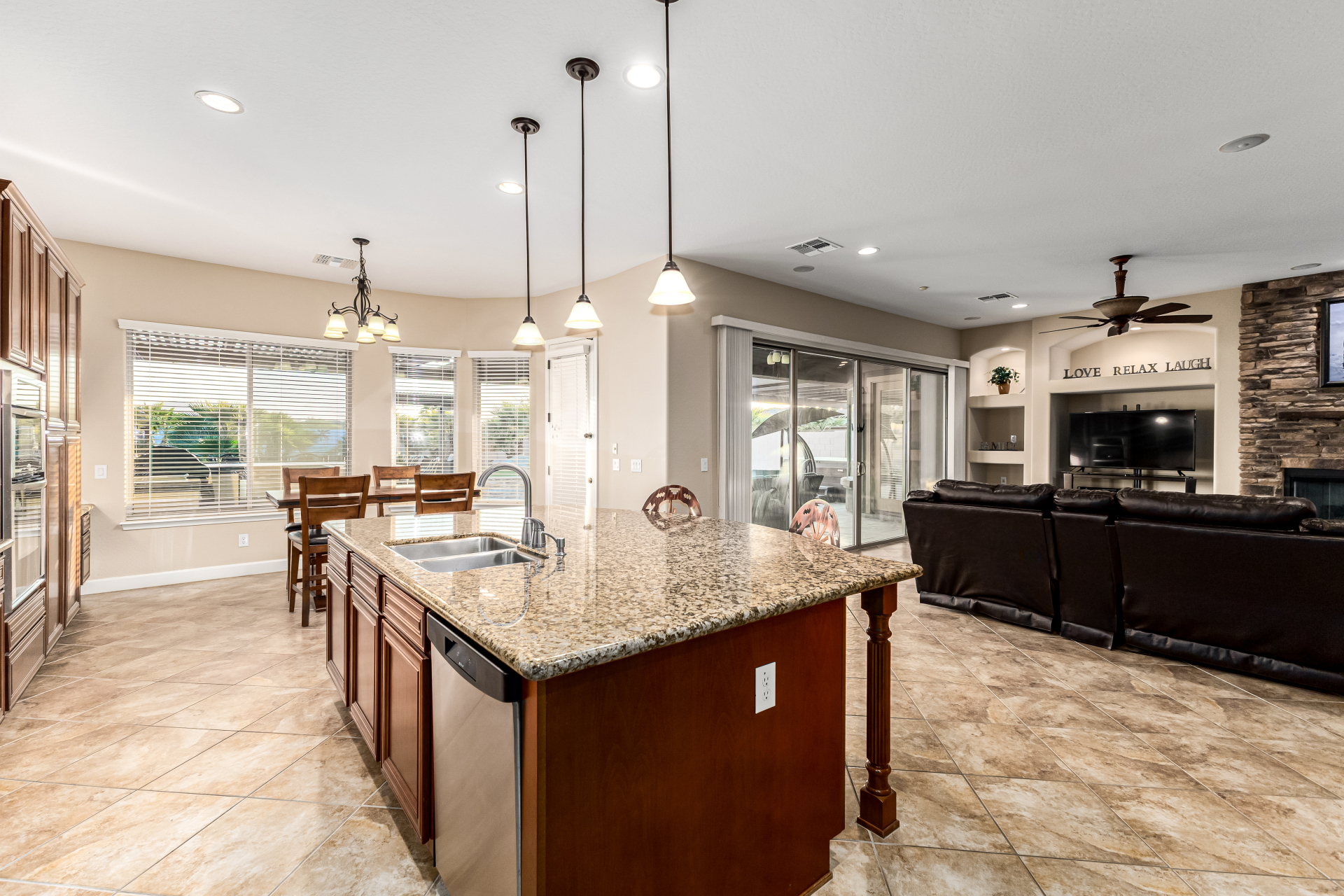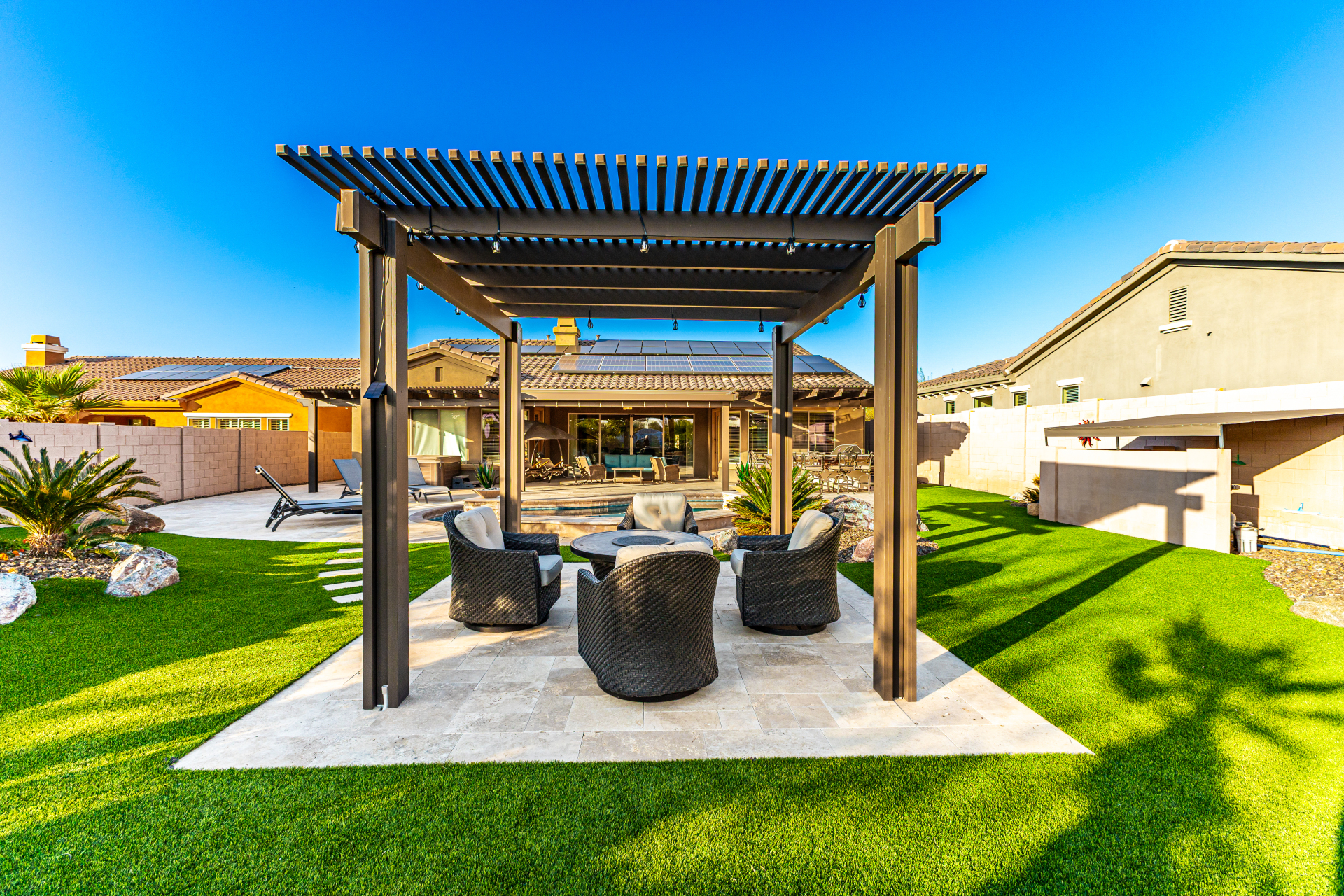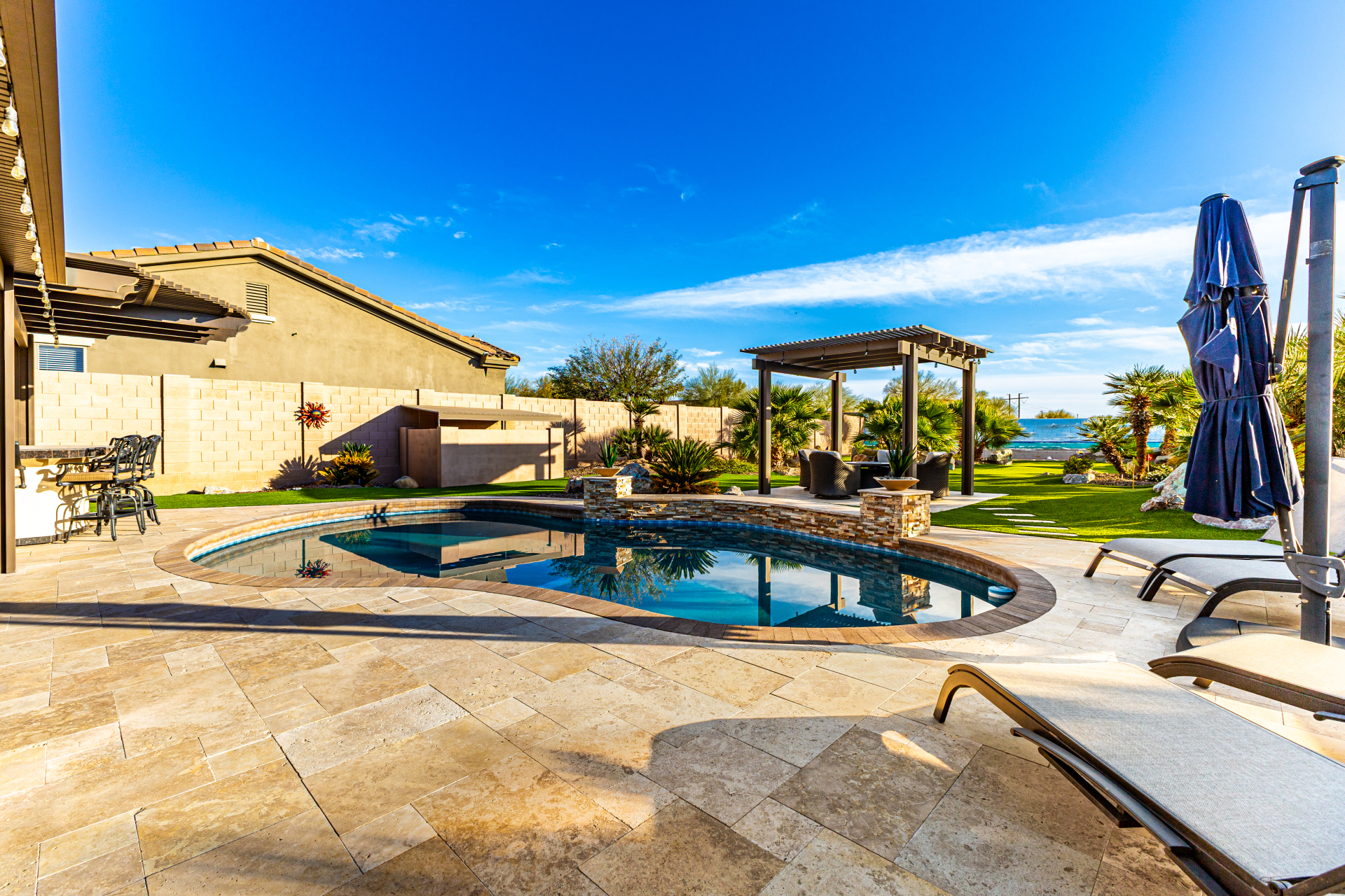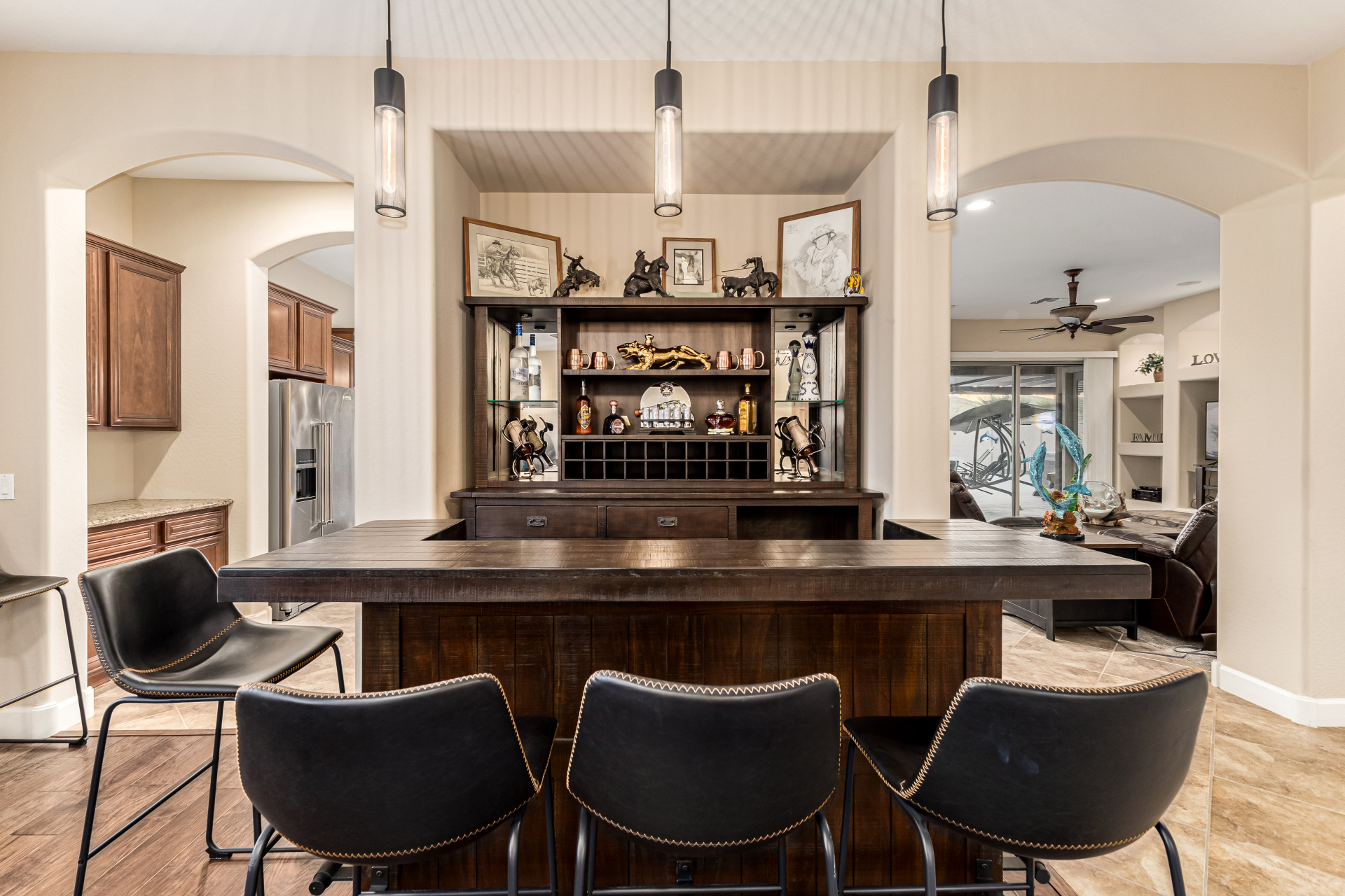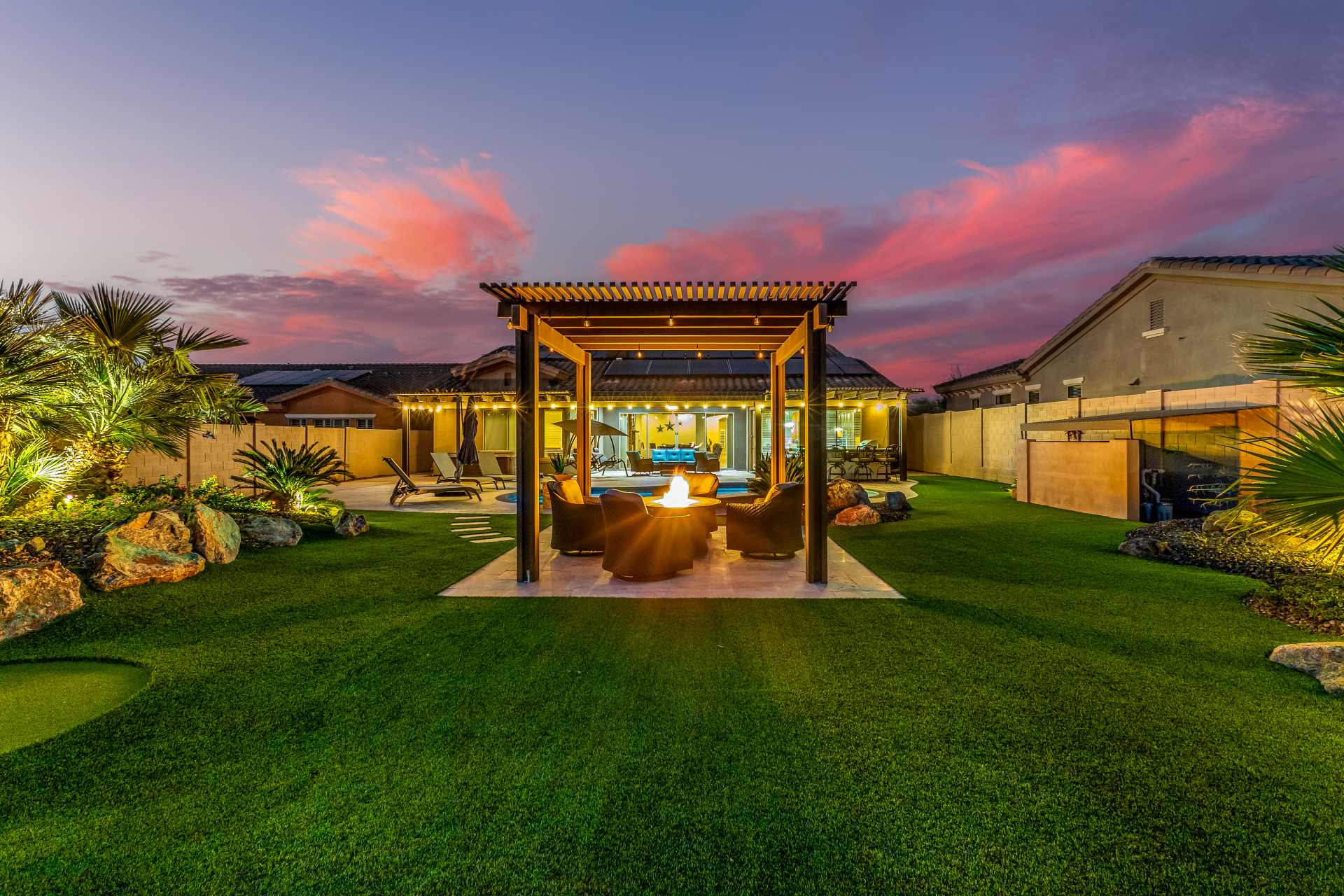 Welcome to this stunning 4-bedroom estate on a tranquil cul-de-sac in the highly sought-after Estrella Mountain Ranch! From the moment you arrive, you'll be captivated by the Tuscan-inspired curb appeal, featuring meticulously maintained desert landscaping and an extended paver driveway. Step through the gated courtyard into a welcoming foyer that opens into an amazing living/dining room. Rich wood flooring & a custom dry bar create the perfect setting for entertaining. The thoughtfully designed interior includes tile flooring in high-traffic areas, stylish lighting throughout, and a versatile den with closet space. The inviting family room showcases a dramatic stone-accented fireplace & multi-slide glass doors that blur the lines between indoor & outdoor living.