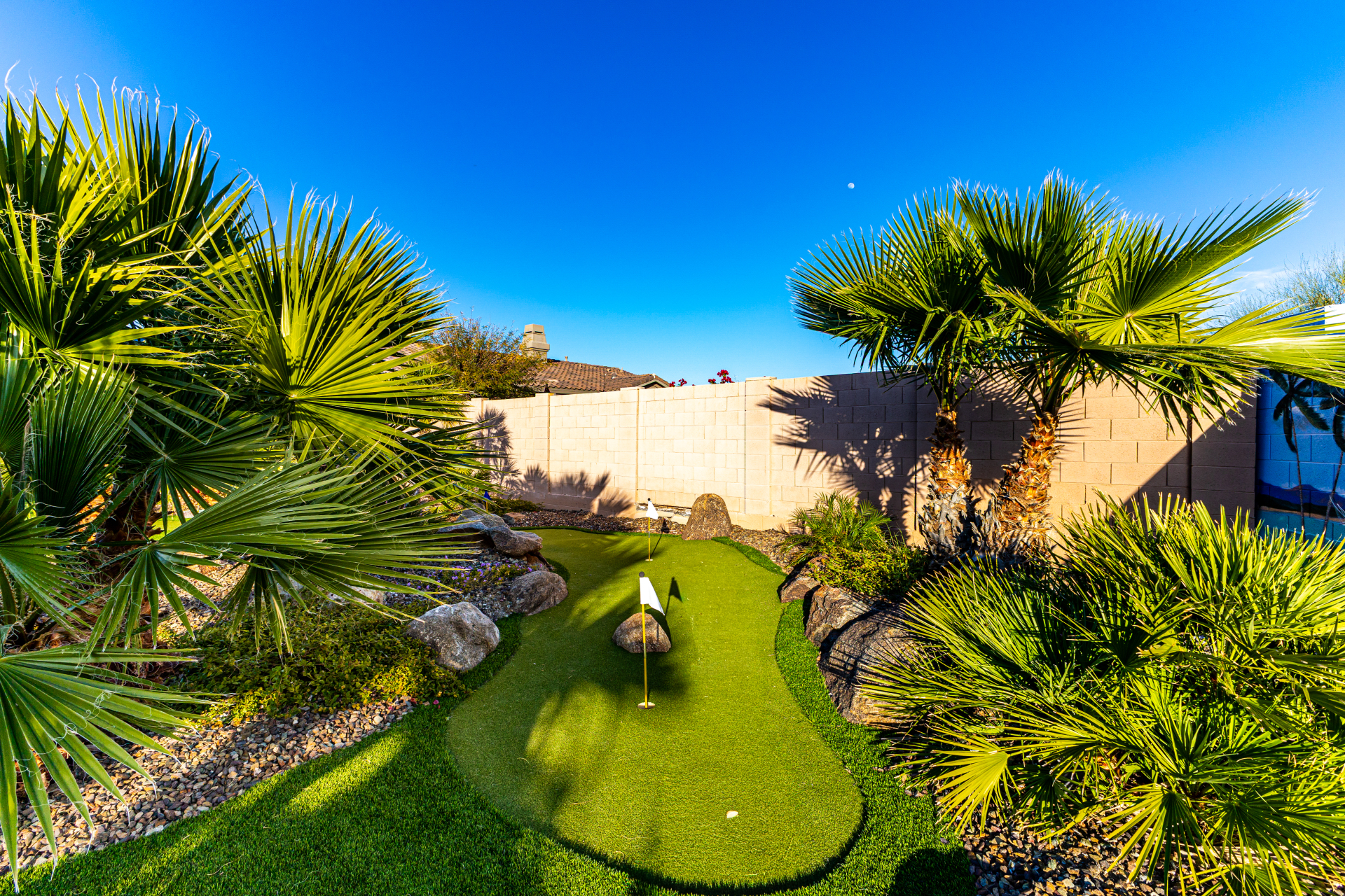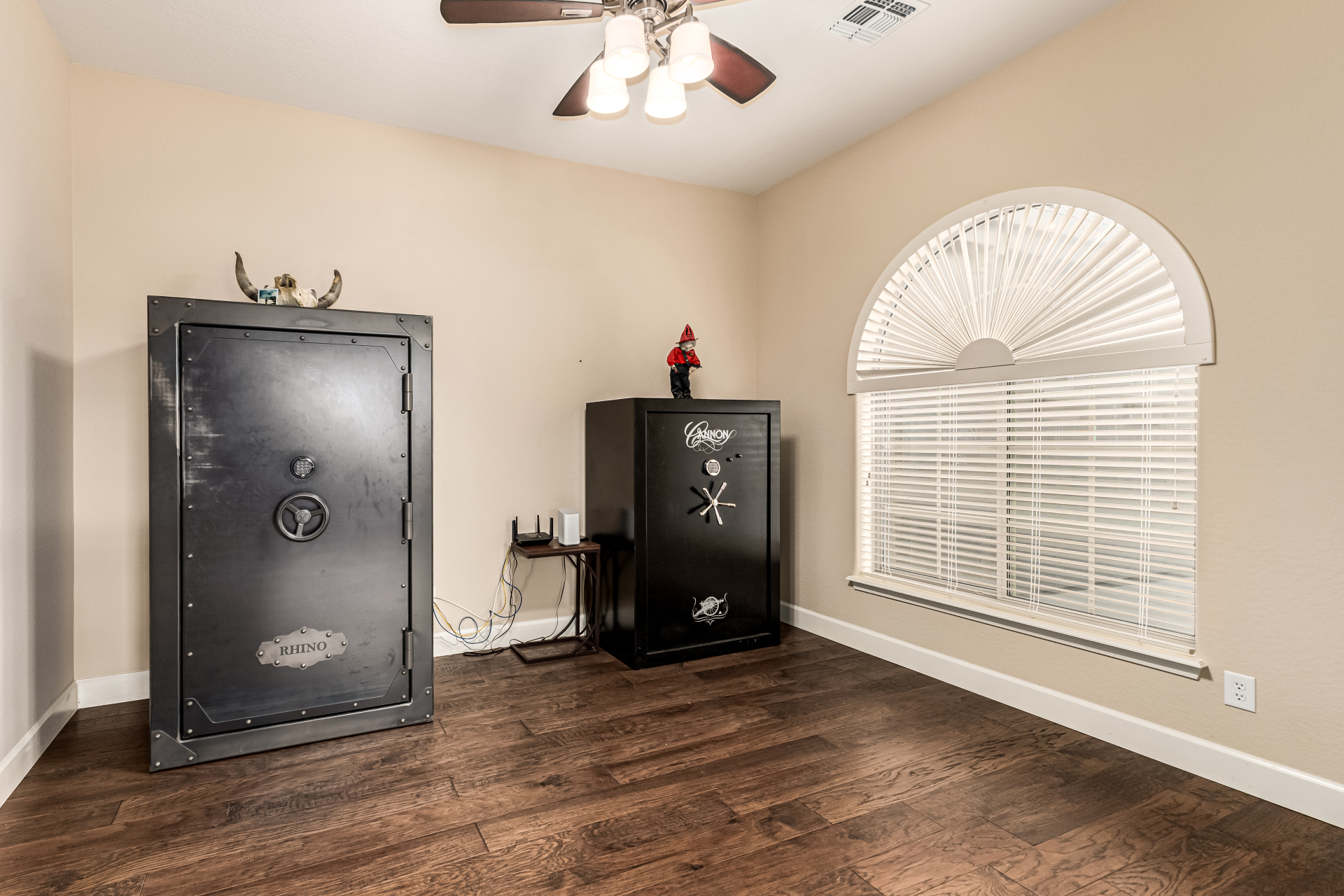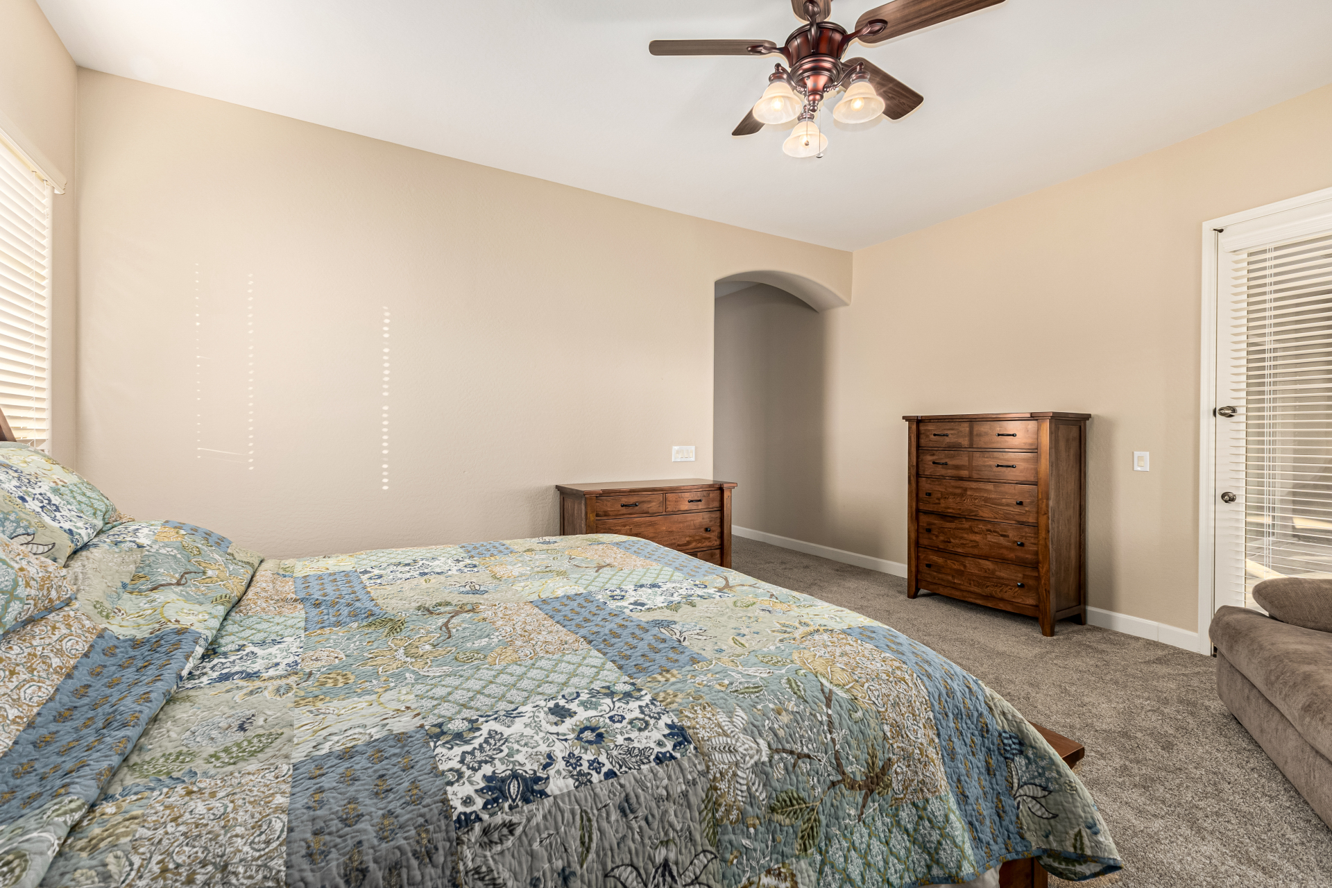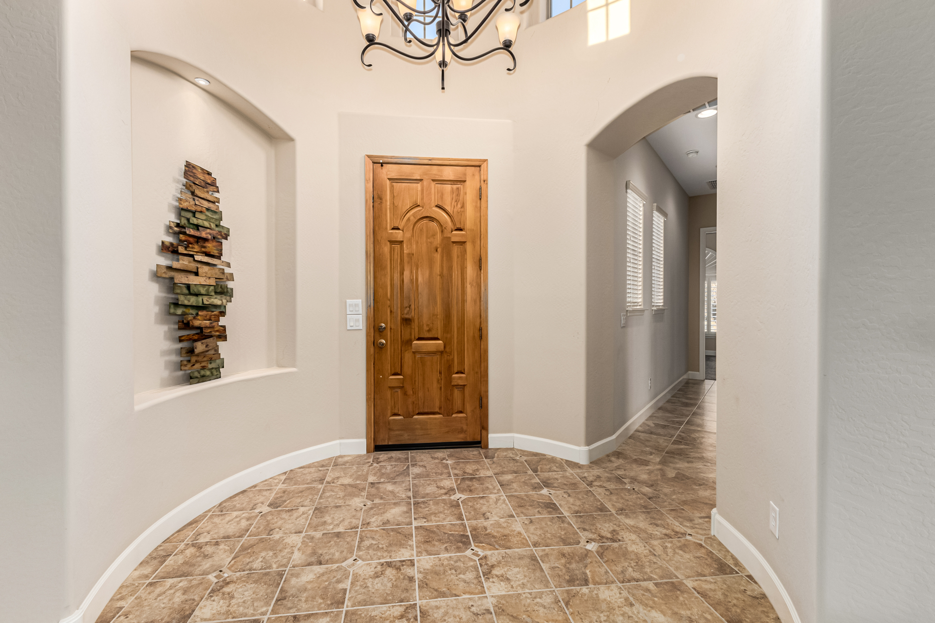Welcome to this stunning 4-bedroom estate on a tranquil cul-de-sac in the highly sought-after Estrella Mountain Ranch! From the moment you arrive, you'll be captivated by the Tuscan-inspired curb appeal, featuring meticulously maintained desert landscaping and an extended paver driveway. Step through the gated courtyard into a welcoming foyer that opens into an amazing living/dining room. Rich wood flooring & a custom dry bar create the perfect setting for entertaining. The thoughtfully designed interior includes tile flooring in high-traffic areas, stylish lighting throughout, and a versatile den with closet space. The inviting family room showcases a dramatic stone-accented fireplace & multi-slide glass doors that blur the lines between indoor & outdoor living.