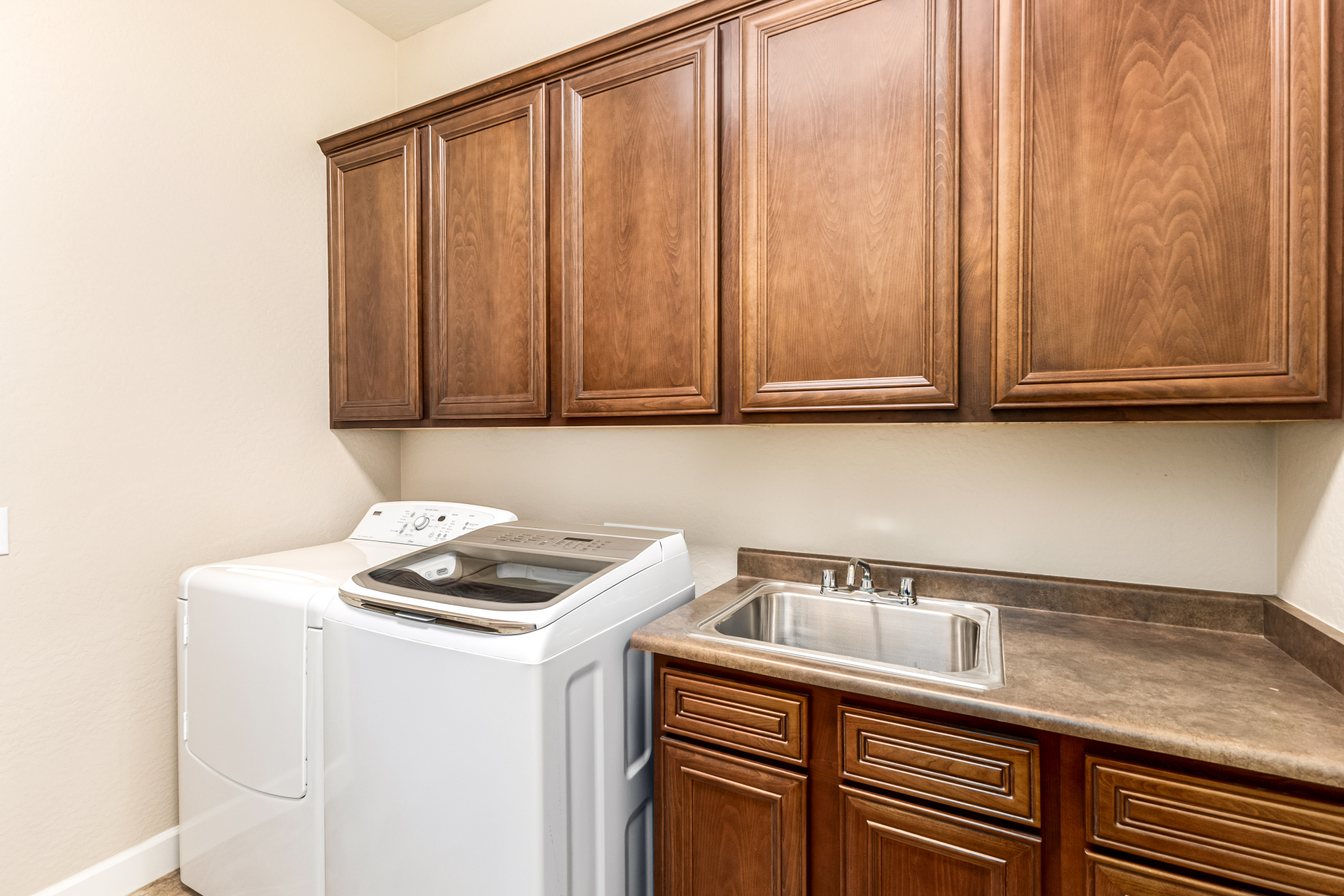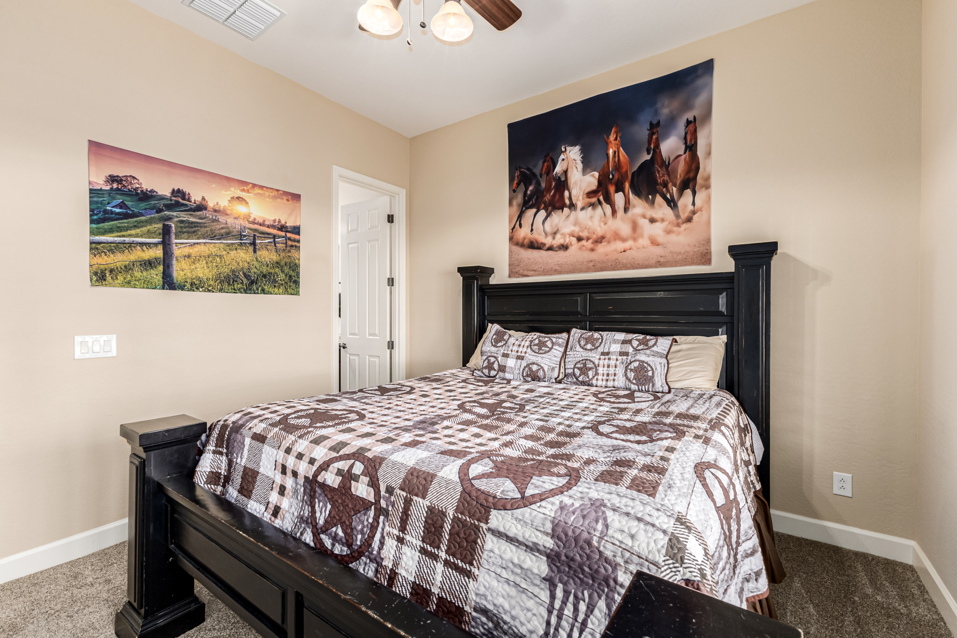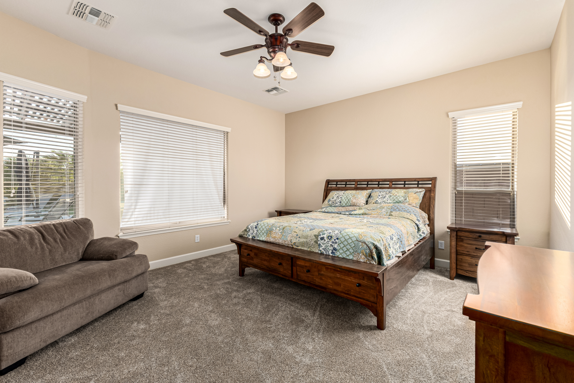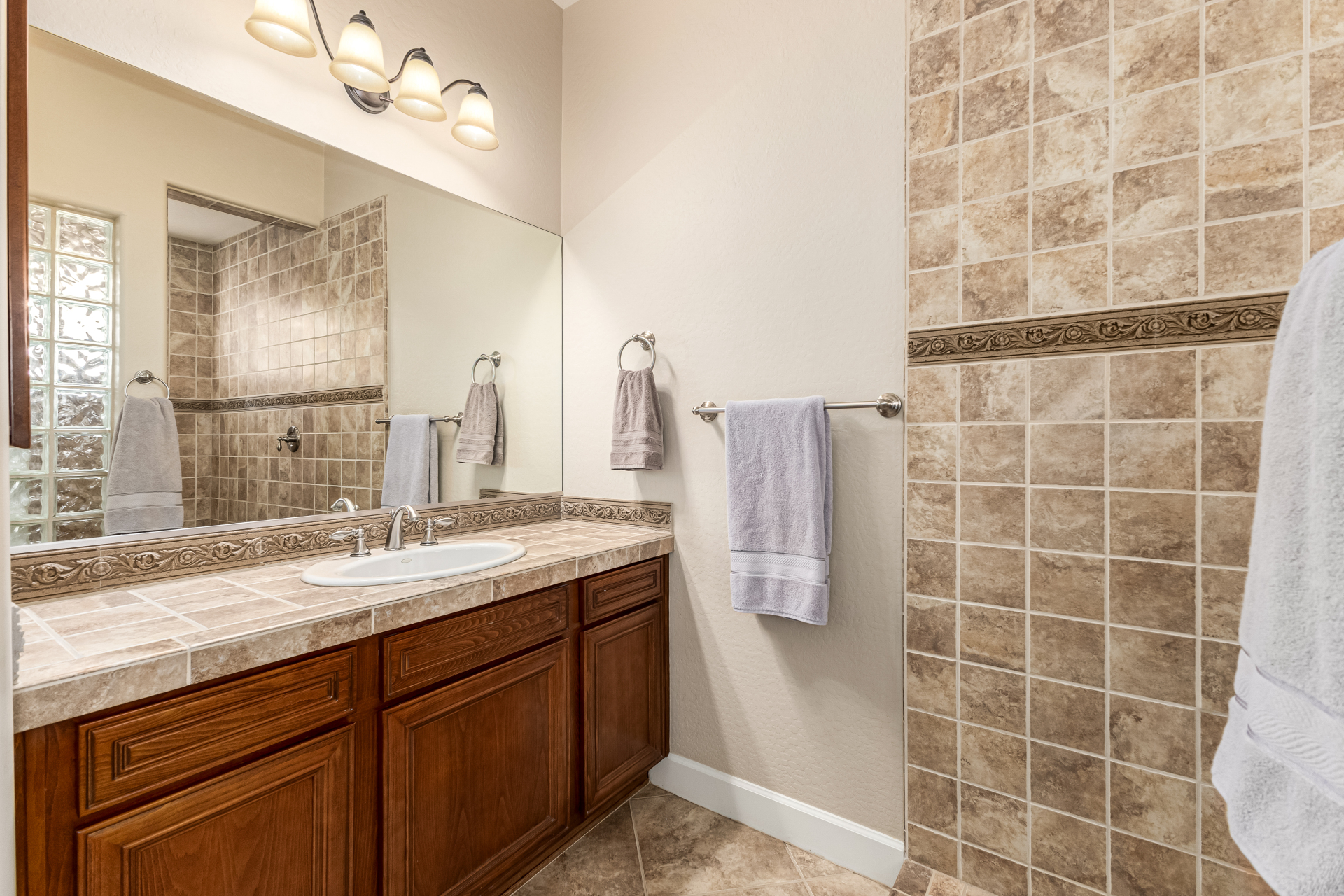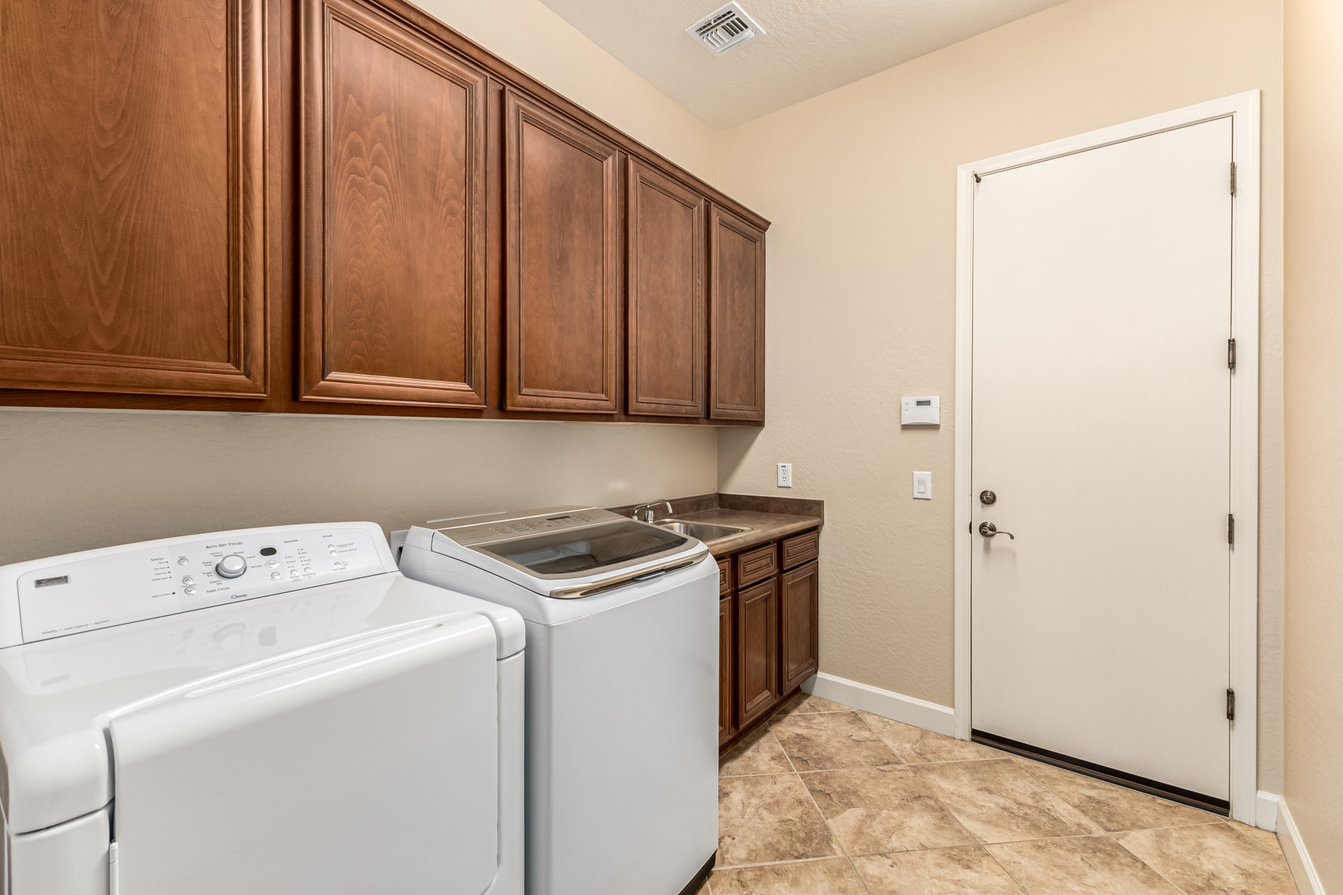 Welcome to this stunning 4-bedroom estate on a tranquil cul-de-sac in the highly sought-after Estrella Mountain Ranch! From the moment you arrive, you'll be captivated by the Tuscan-inspired curb appeal, featuring meticulously maintained desert landscaping and an extended paver driveway. Step through the gated courtyard into a welcoming foyer that opens into an amazing living/dining room. Rich wood flooring & a custom dry bar create the perfect setting for entertaining. The thoughtfully designed interior includes tile flooring in high-traffic areas, stylish lighting throughout, and a versatile den with closet space. The inviting family room showcases a dramatic stone-accented fireplace & multi-slide glass doors that blur the lines between indoor & outdoor living.
