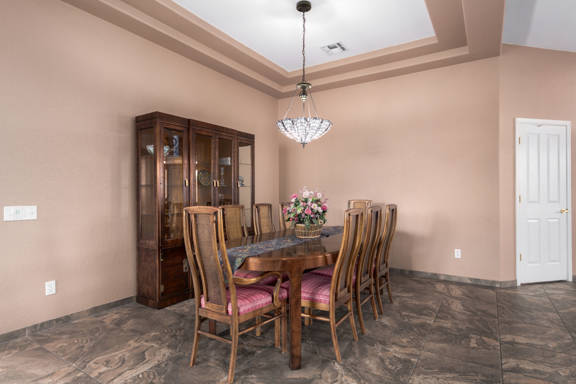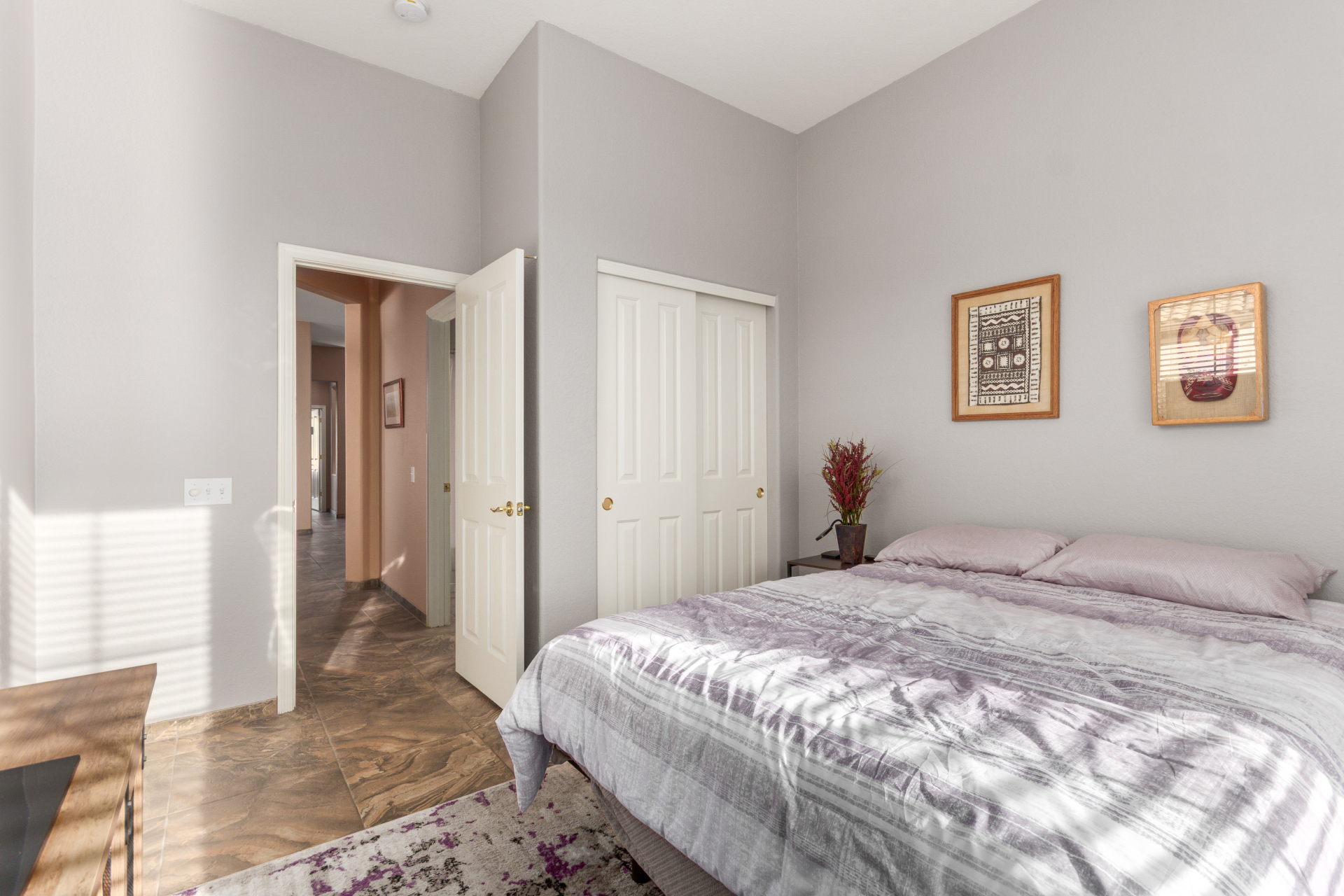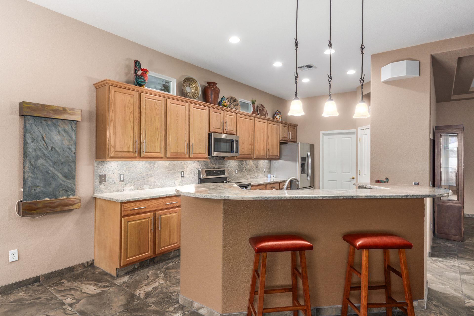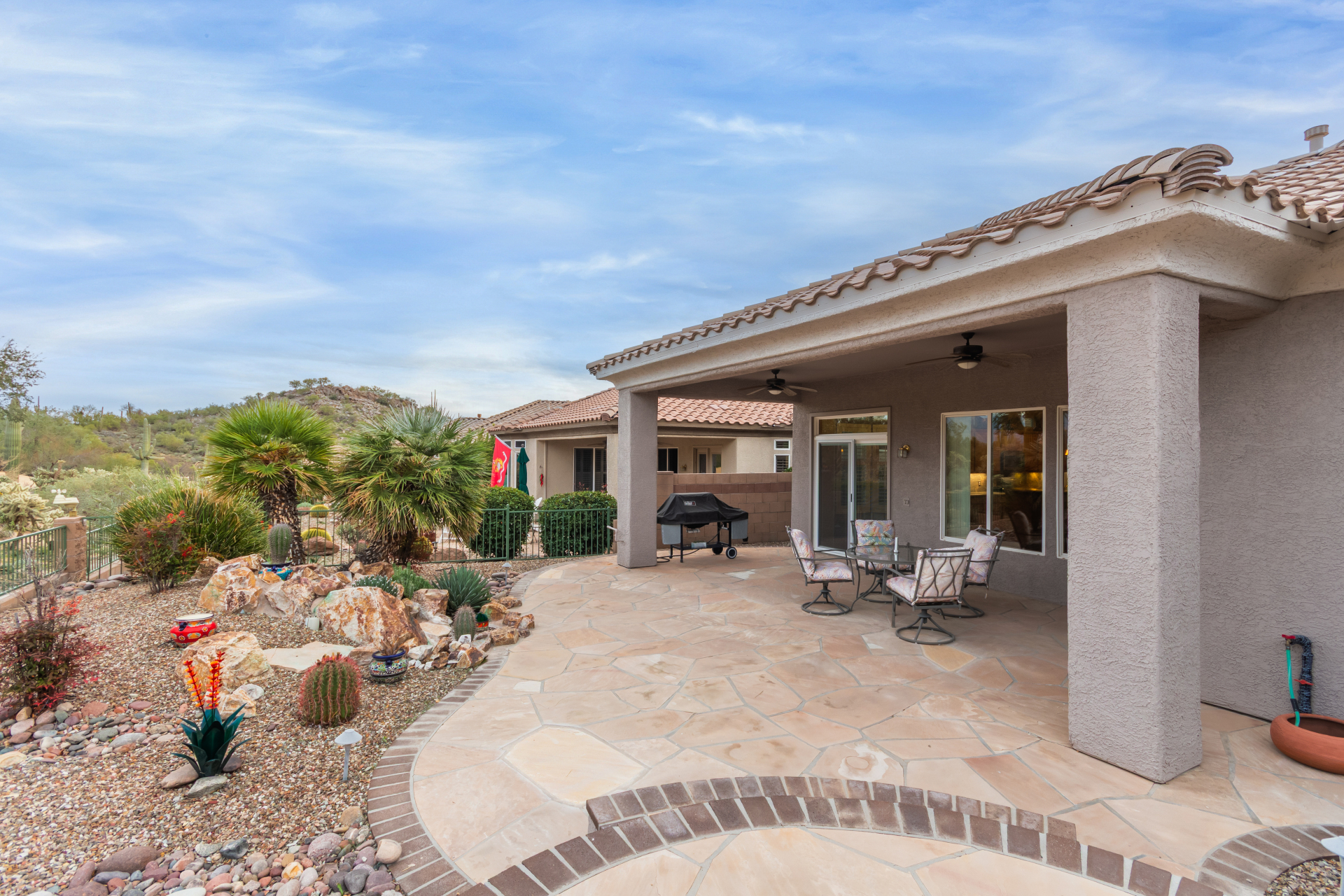 Extended Portland model with many upgrades- extended living/dining, extended garage & more. Beautifully landscaped, front courtyard, extended flagstone covered patio, raised sitting area & more on NE facing backyard with views of mountains & the 14th fairway! This beautifully updated home features 2 spacious bedrooms, remodeled primary bath, remodeled kitchen with eat in area and desk , large dining room, open den, and living room with a stone fireplace and built-in surround sound (equipment included).No carpet. Newer HVAC, water heater, and roof. Bay windows, garage with storage cabinets and water softener. Enjoy golf, pickleball, tennis, pool, hot tub, art and billiards room, restaurant and bar plus endless clubs and social activities. Many hiking and biking trails nearby.