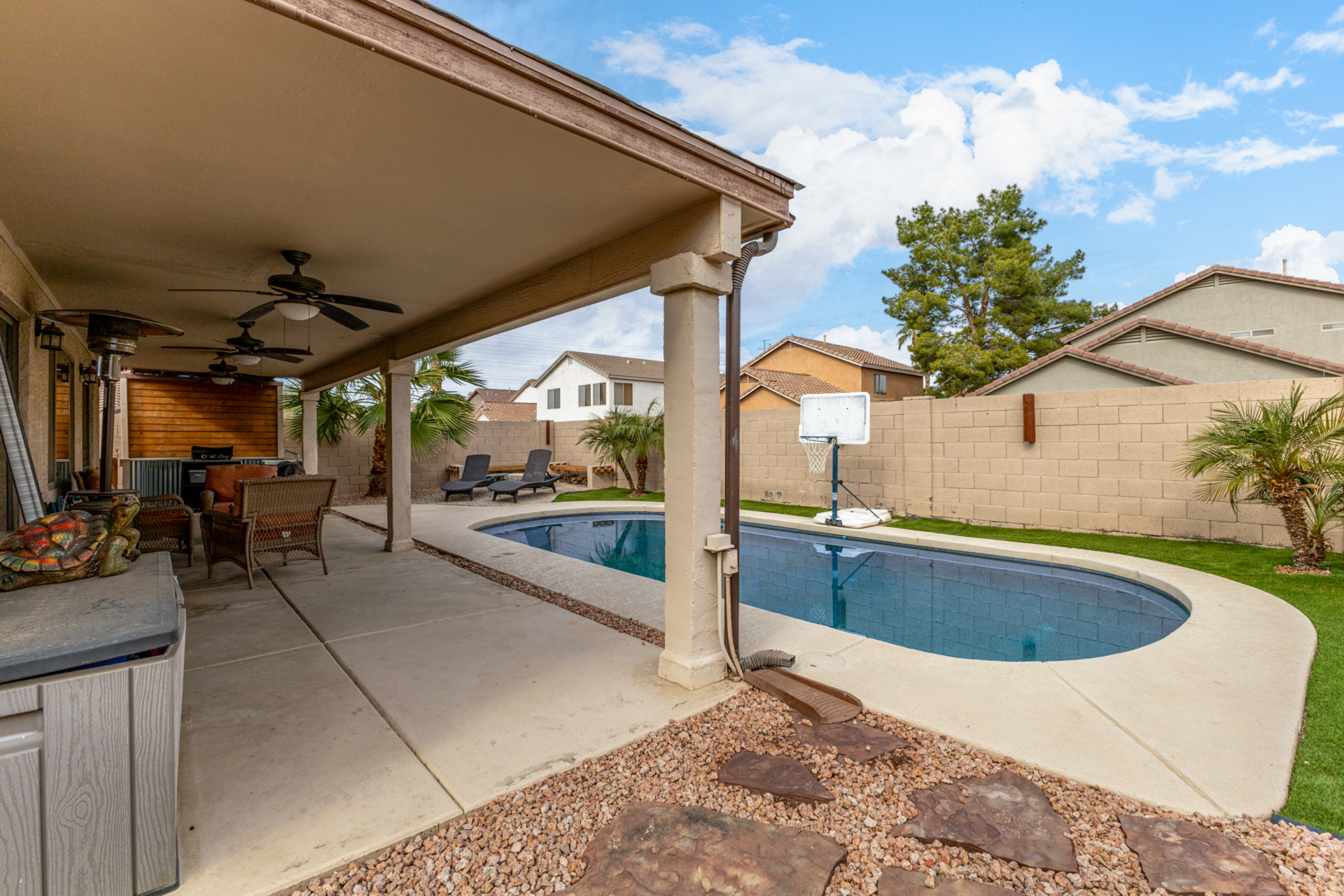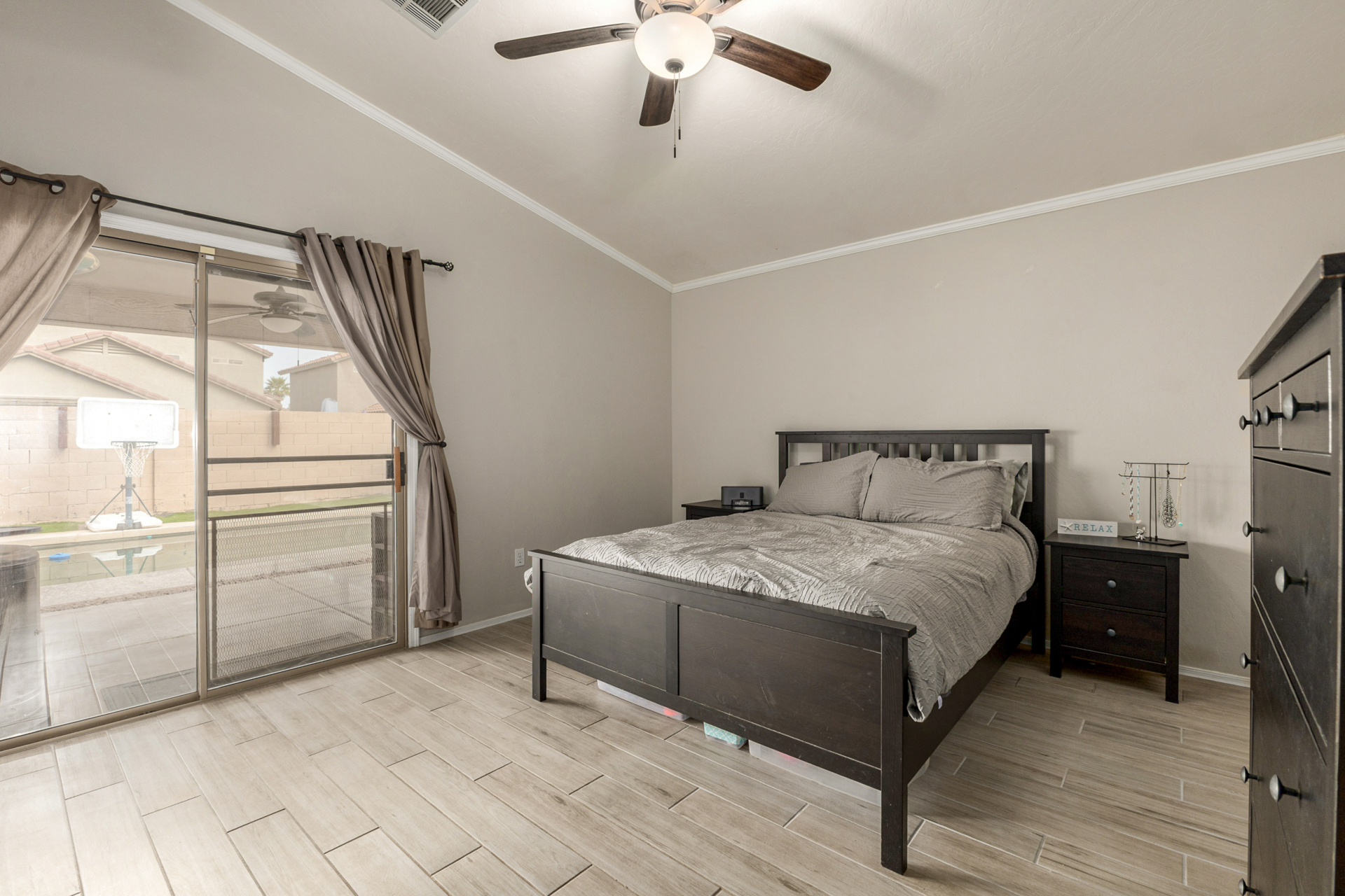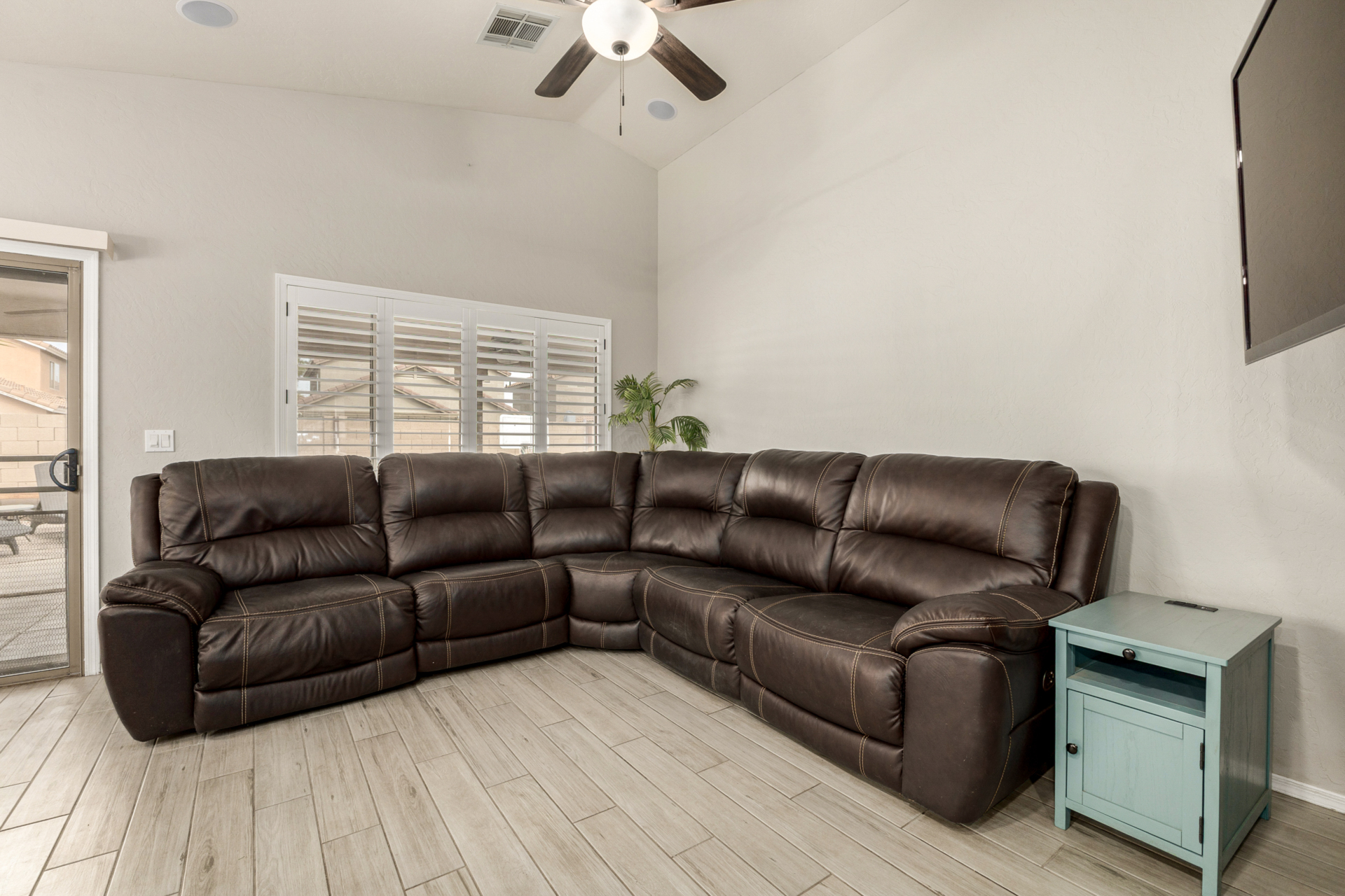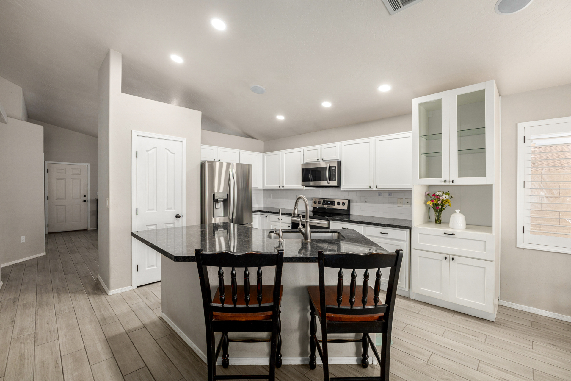 Welcome to this fantastic 3-bed, 2-bath home! Featuring a 2-car garage & a cozy front patio, ideal for enjoying quiet mornings. Fabulous interior showcases wood-look tile flooring, vaulted ceilings, plantation shutters, & an inviting living/dining room. Desirable great room enhanced by a fireplace & surround sound is designed for entertaining & everyday living. Spotless kitchen is a cook's delight, equipped w/stainless steel appliances, subway tile backsplash, a pantry, ample cabinets, granite counters, a custom island w/a breakfast bar, & a breakfast nook. Airy main bedroom offers outdoor access, an ensuite w/an enclosed glass shower, & a walk-in closet. Outside, the serene backyard is perfect for Arizona living, complete w/covered patio & enticing pool. This rare gem won't last long!