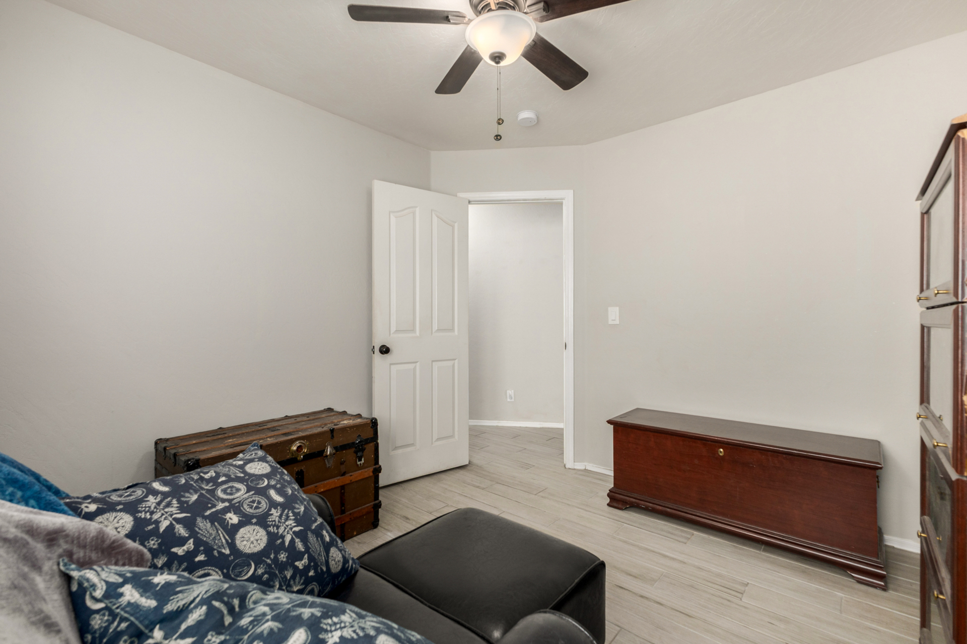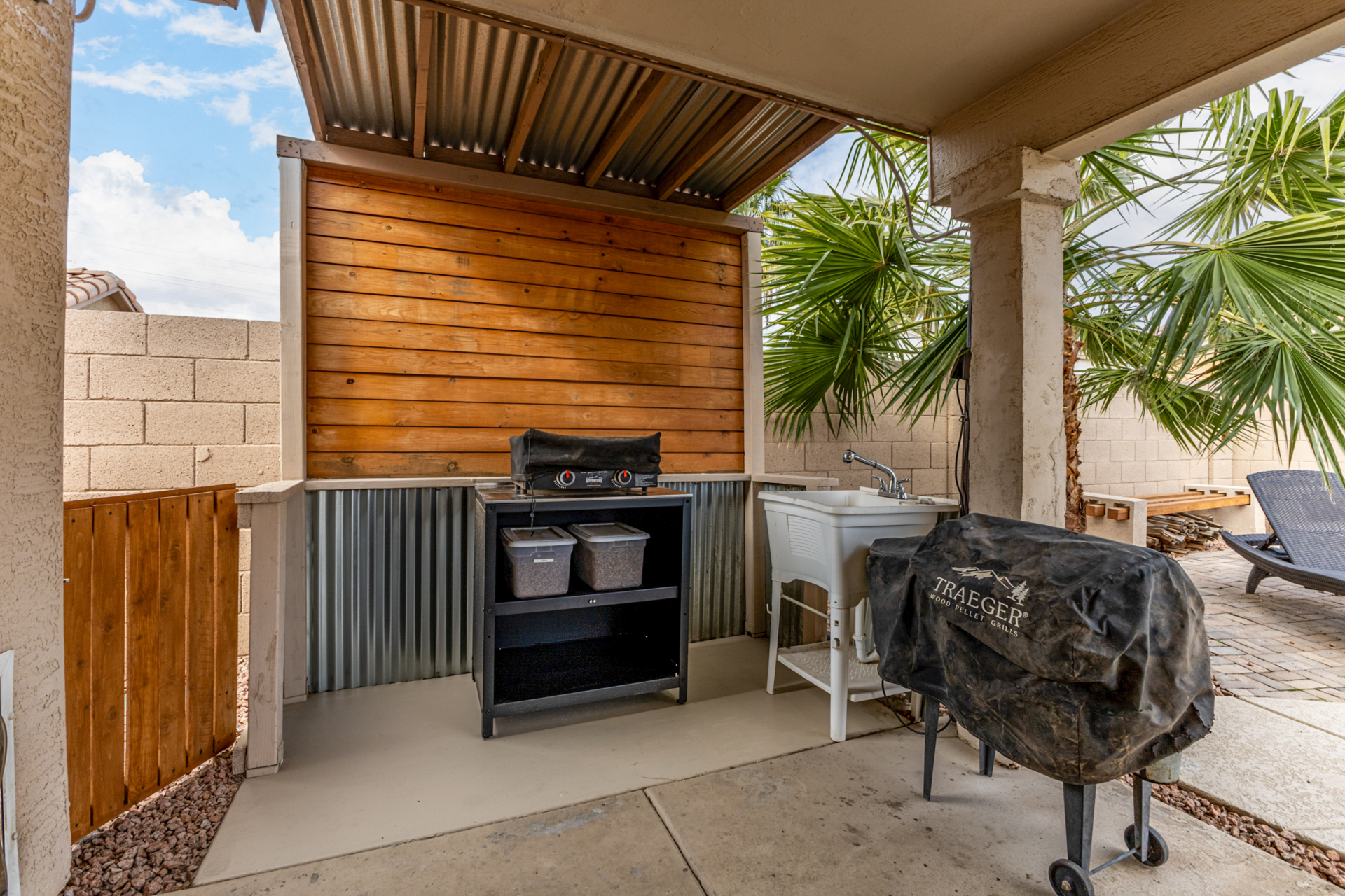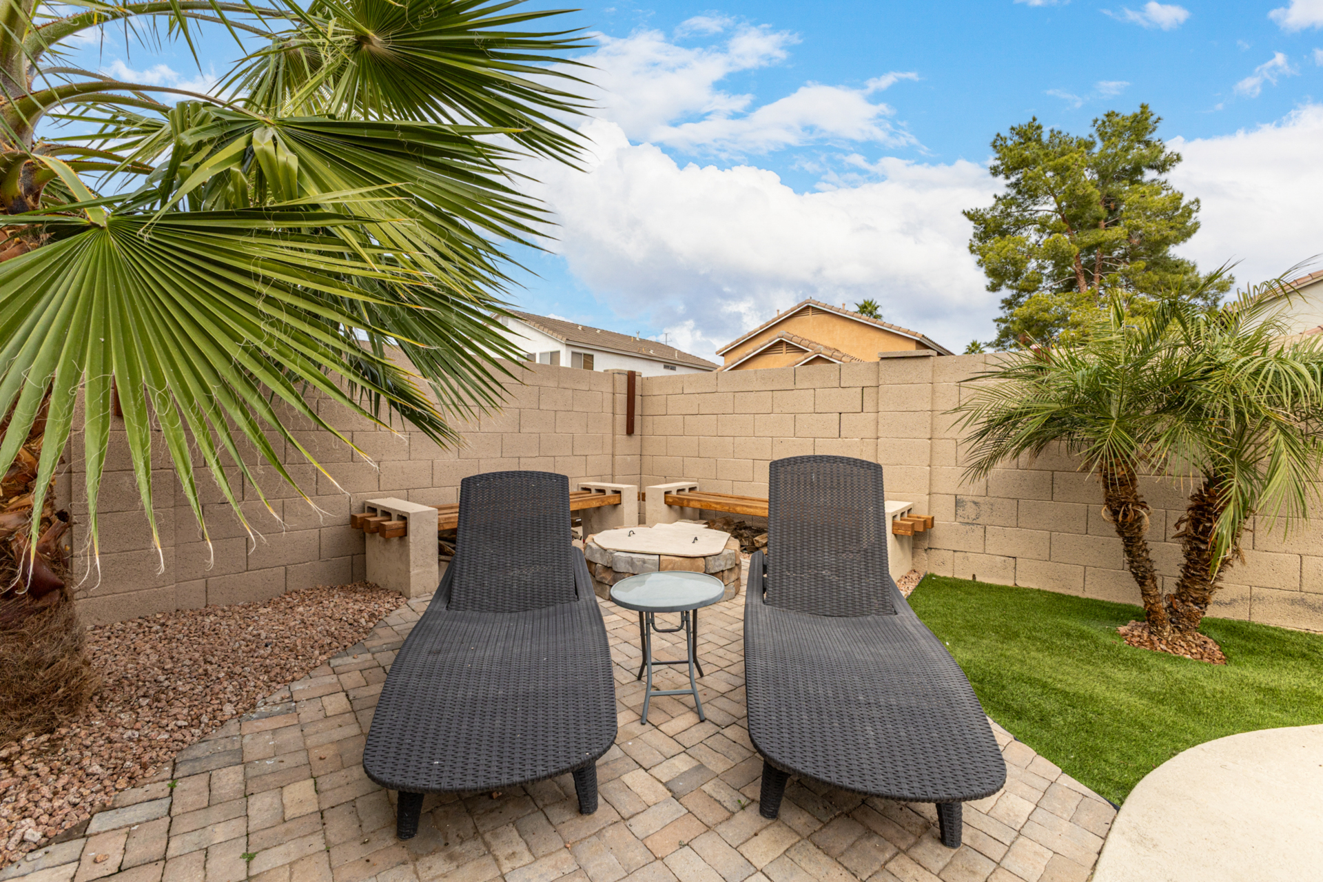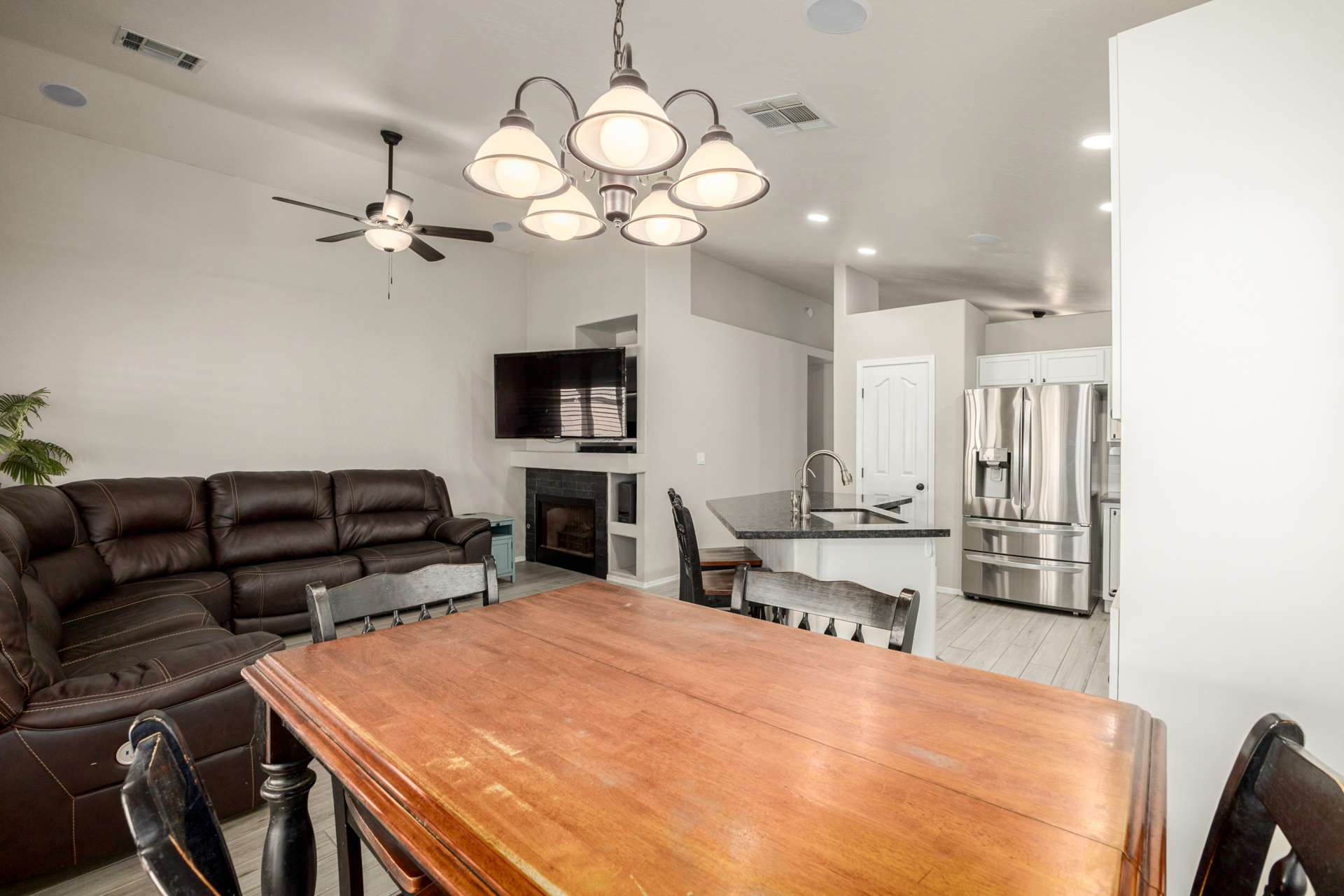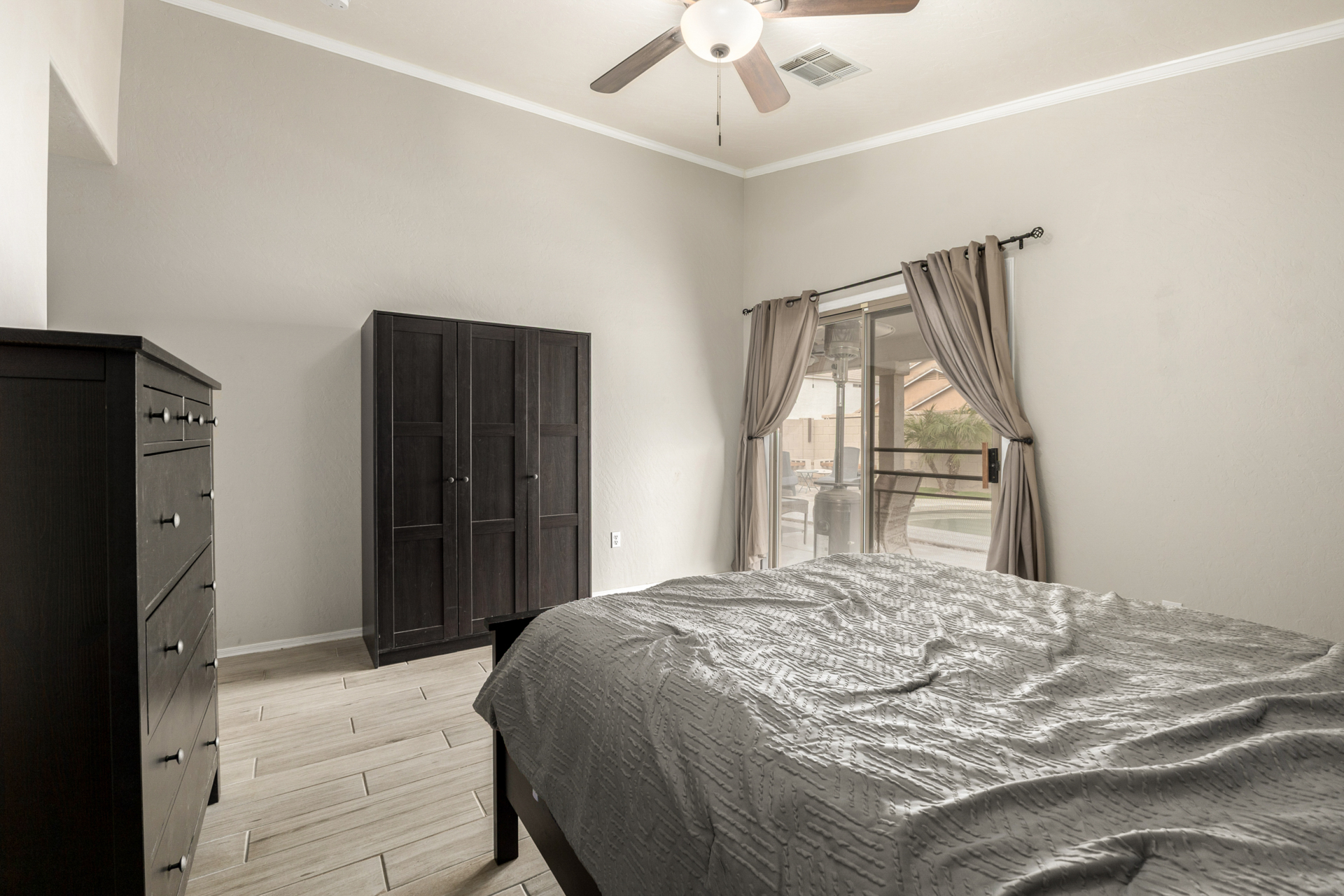 Welcome to this fantastic 3-bed, 2-bath home! Featuring a 2-car garage & a cozy front patio, ideal for enjoying quiet mornings. Fabulous interior showcases wood-look tile flooring, vaulted ceilings, plantation shutters, & an inviting living/dining room. Desirable great room enhanced by a fireplace & surround sound is designed for entertaining & everyday living. Spotless kitchen is a cook's delight, equipped w/stainless steel appliances, subway tile backsplash, a pantry, ample cabinets, granite counters, a custom island w/a breakfast bar, & a breakfast nook. Airy main bedroom offers outdoor access, an ensuite w/an enclosed glass shower, & a walk-in closet. Outside, the serene backyard is perfect for Arizona living, complete w/covered patio & enticing pool. This rare gem won't last long!