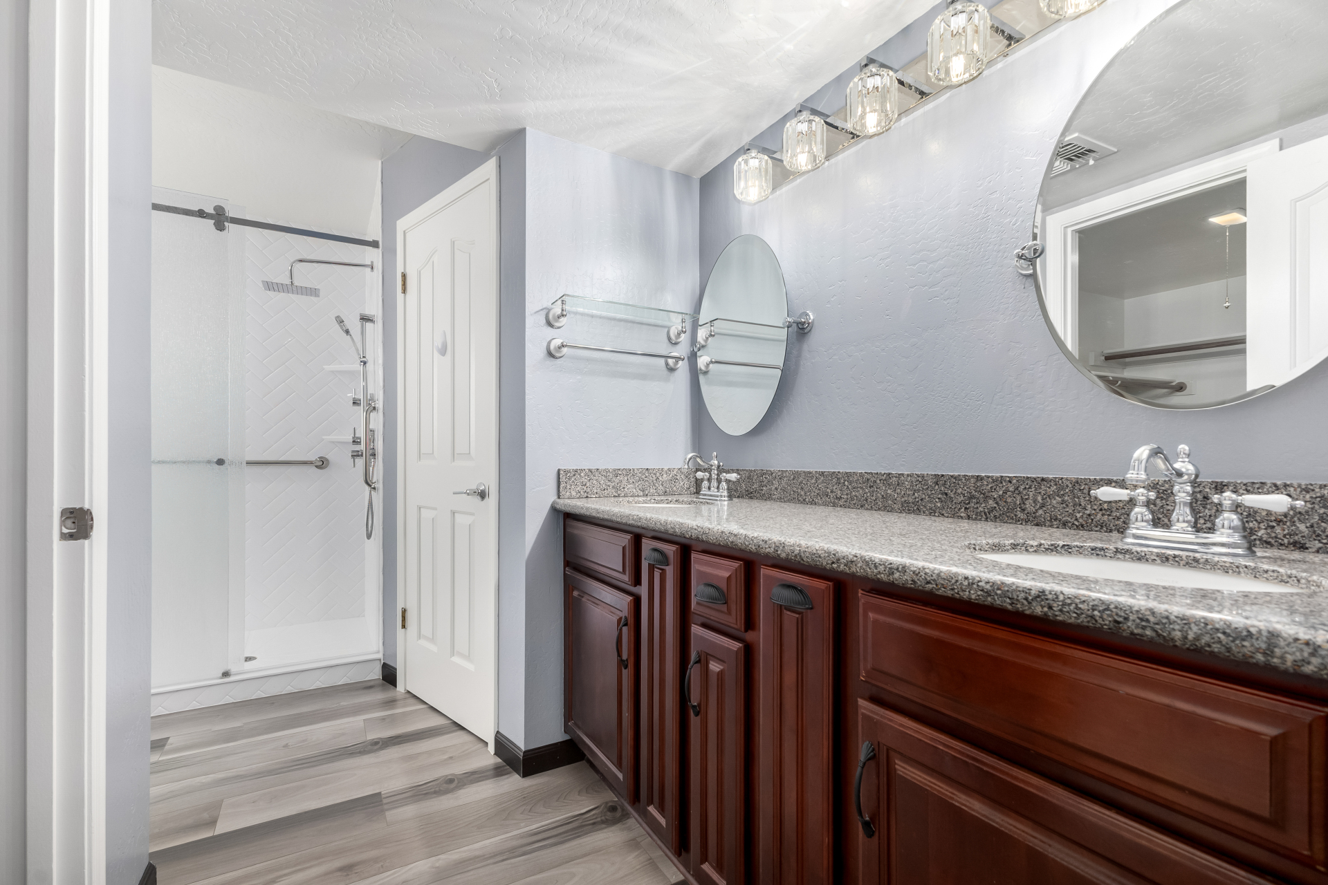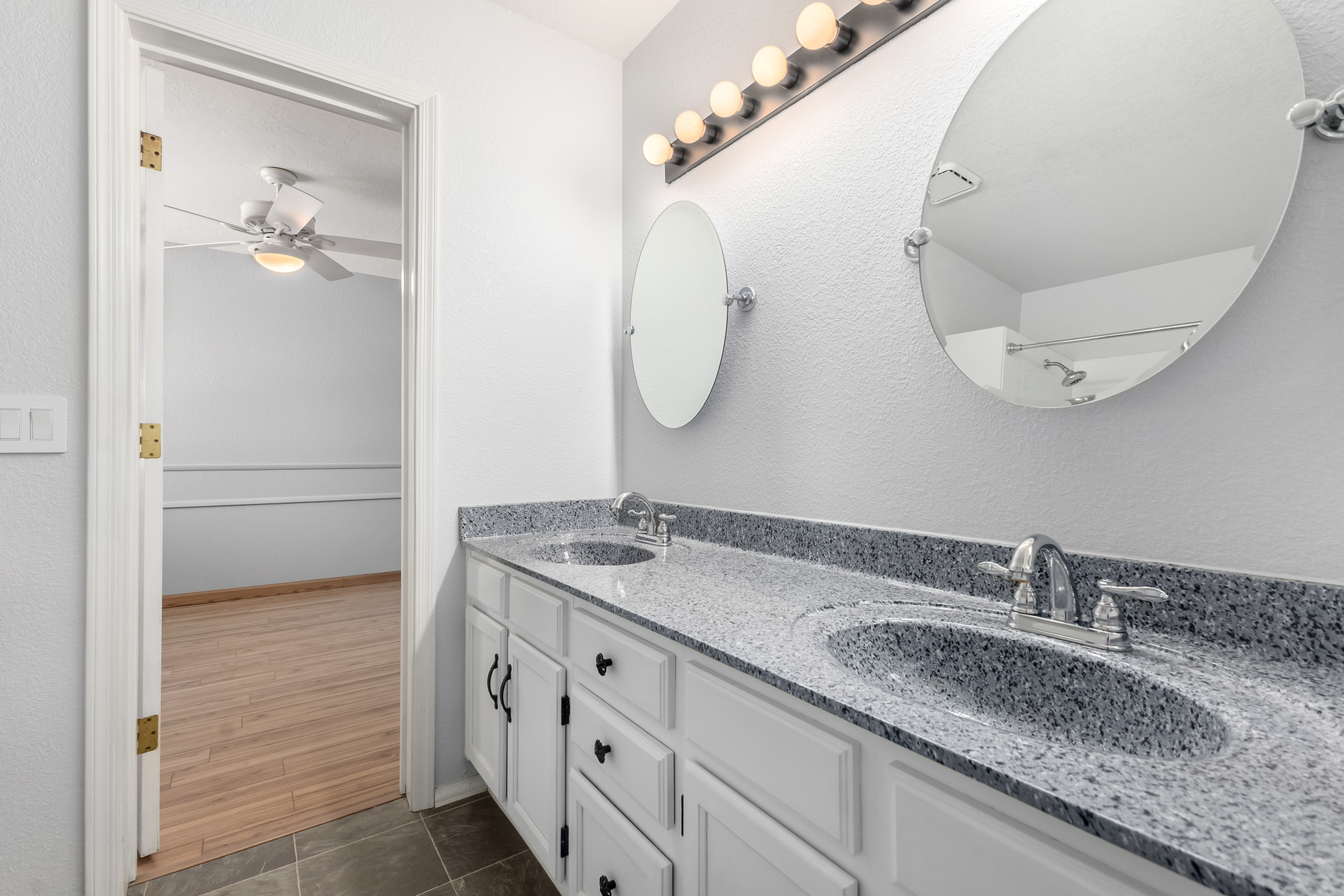 This well-maintained property has been lovingly maintained and updated by the original owners of 39 years! Featuring 4 bedrooms and 2.5 baths across two levels. Considered a tri-level with the main entry on the center level. Both the upstairs and downstairs have large main living areas with the kitchen, breakfast bar and dining area on the upper level. The lower level includes a spacious master suite, another full bedroom and the laundry room. The upper level offers 2 bedrooms with a shared Jack & Jill bath and a guest half bath in the hall. Updates include tile and laminate flooring throughout, dual pane tinted windows, maintenance-free aluminum overhangs, renovated kitchen and baths and upgraded fixtures everywhere. The landscaping is all professionally done. The front yard has a small retaining wall, a multitude of mature plants and trees and a welcoming courtyard for great curb appeal. The rear yard is impressive with an upper-level covered deck, covered patio, synthetic lawn, extensive use of pavers.