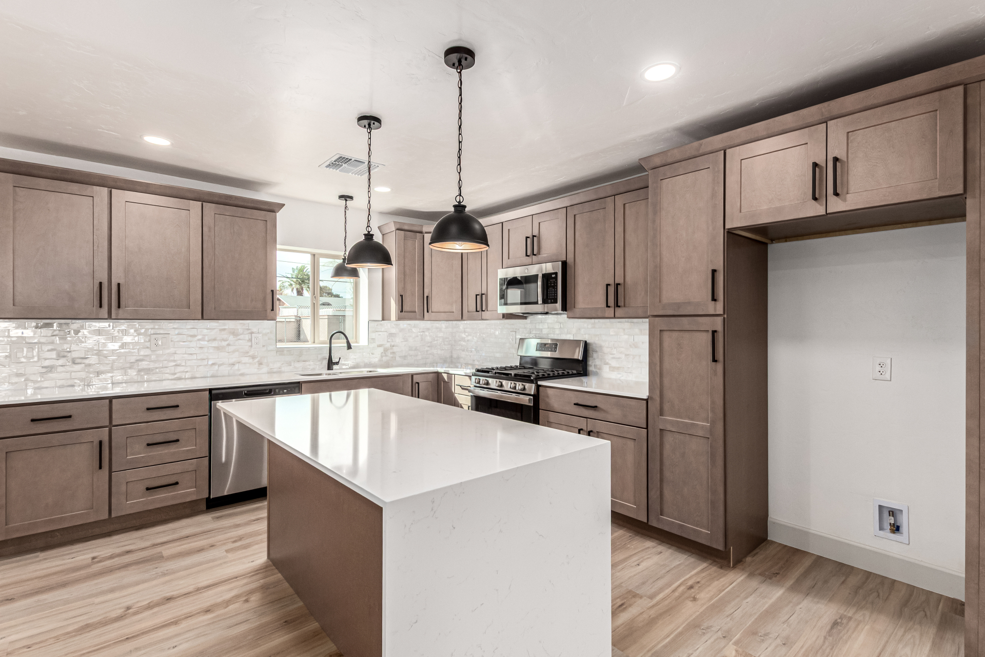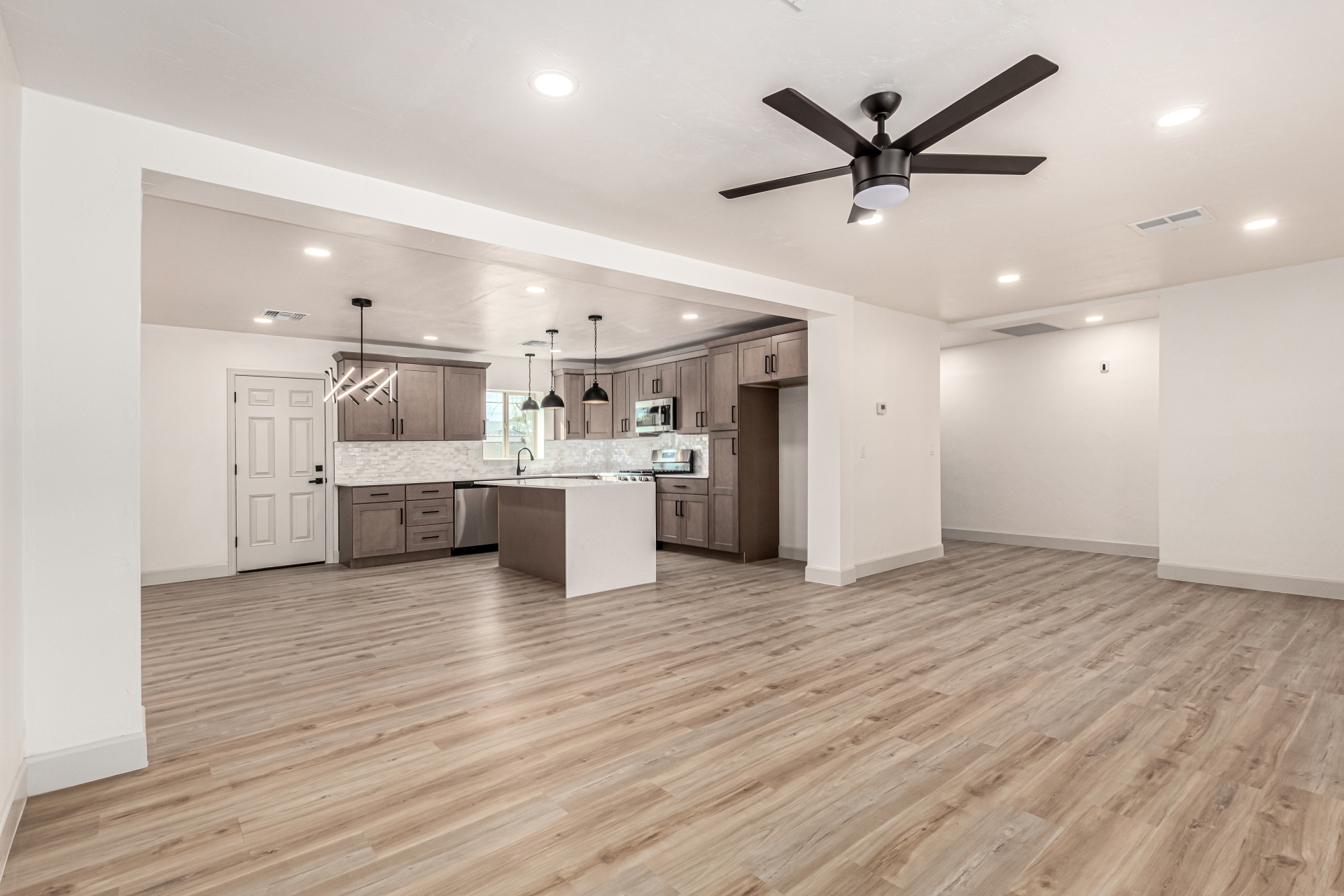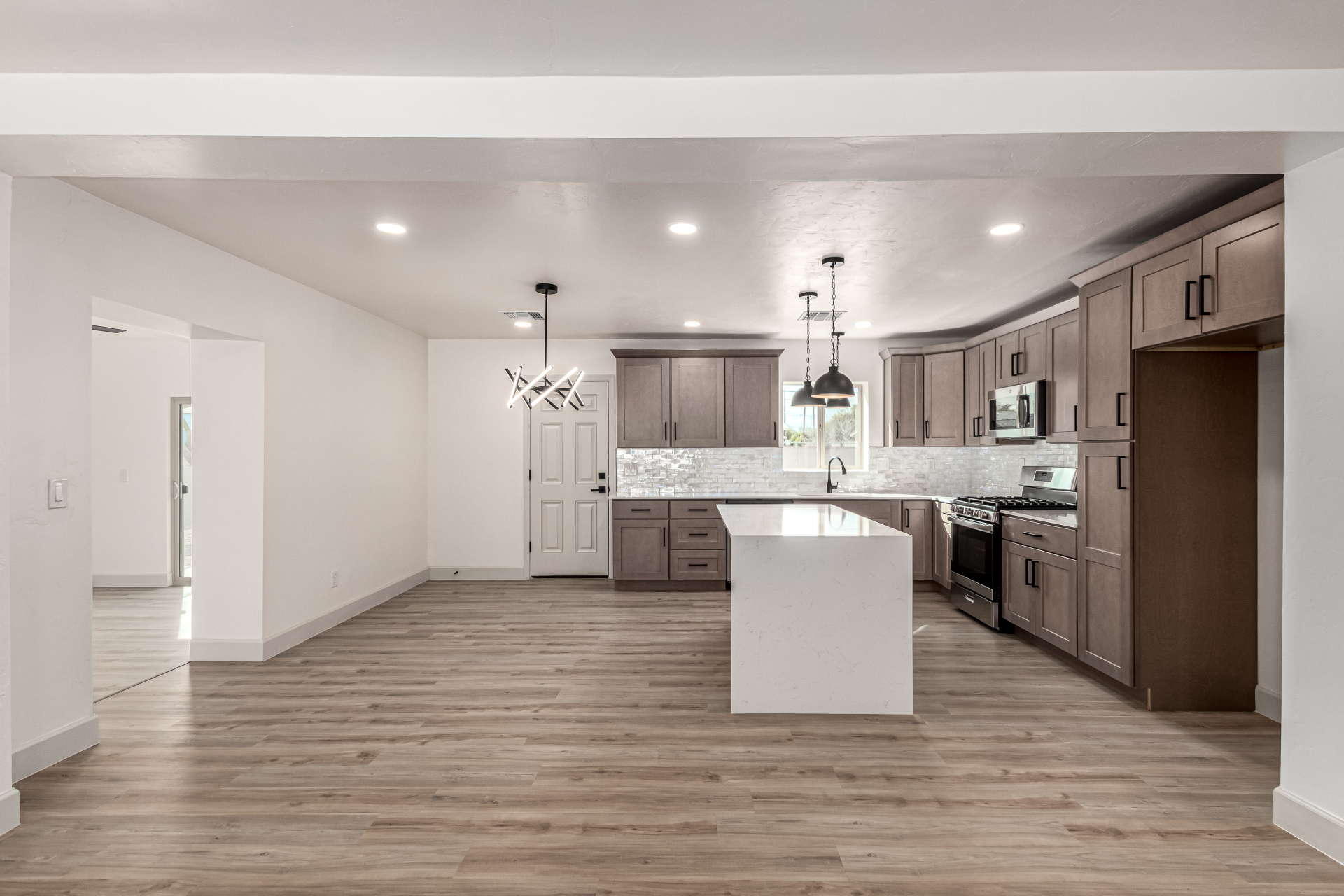 Discover this tastefully upgraded 4-bedroom home where modern comfort & style blend seamlessly! Come inside & fall in love w/ the HUGE open floor plan enhanced by wood-look flooring, abundant natural light, & fresh neutral paint t/out. A family room w/backyard access. Upscale kitchen offers recessed & pendant lighting, tile backsplash, plenty of cabinets w/crown moulding, sleek quartz counters, & a center island w/ a breakfast bar. Brand new SS appliances are gas range, dishwasher & OTR microwave (installed). Serene primary bedroom w/a trendy barn door that opens to a pristine ensuite showcasing a floor-to-ceiling tiled shower. Finally, the spacious backyard provides the ideal setting for hosting memorable gatherings w/ loved ones & friends. Don't let this gem slip by! Hurry! Agent/Owner