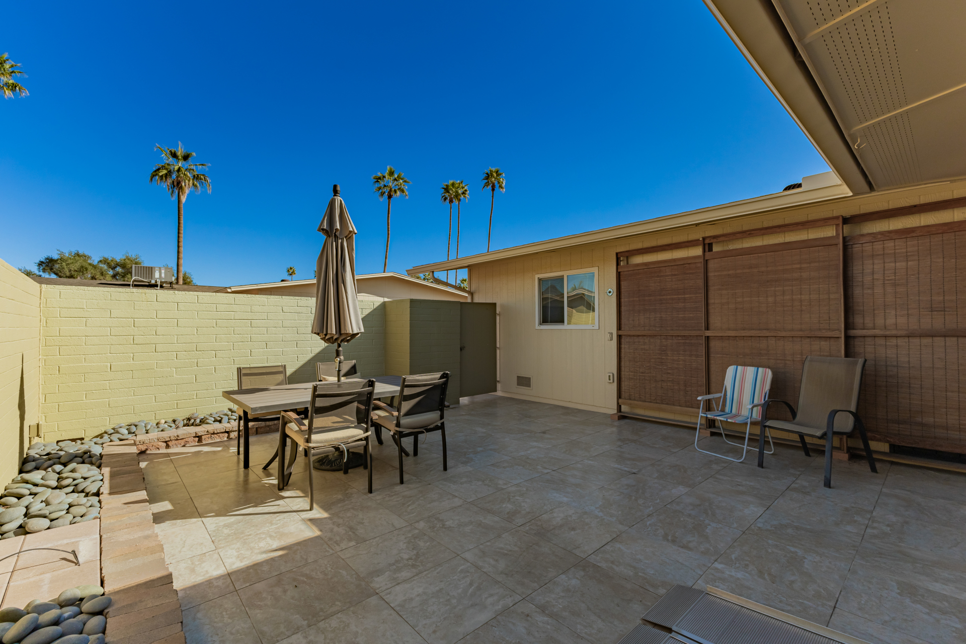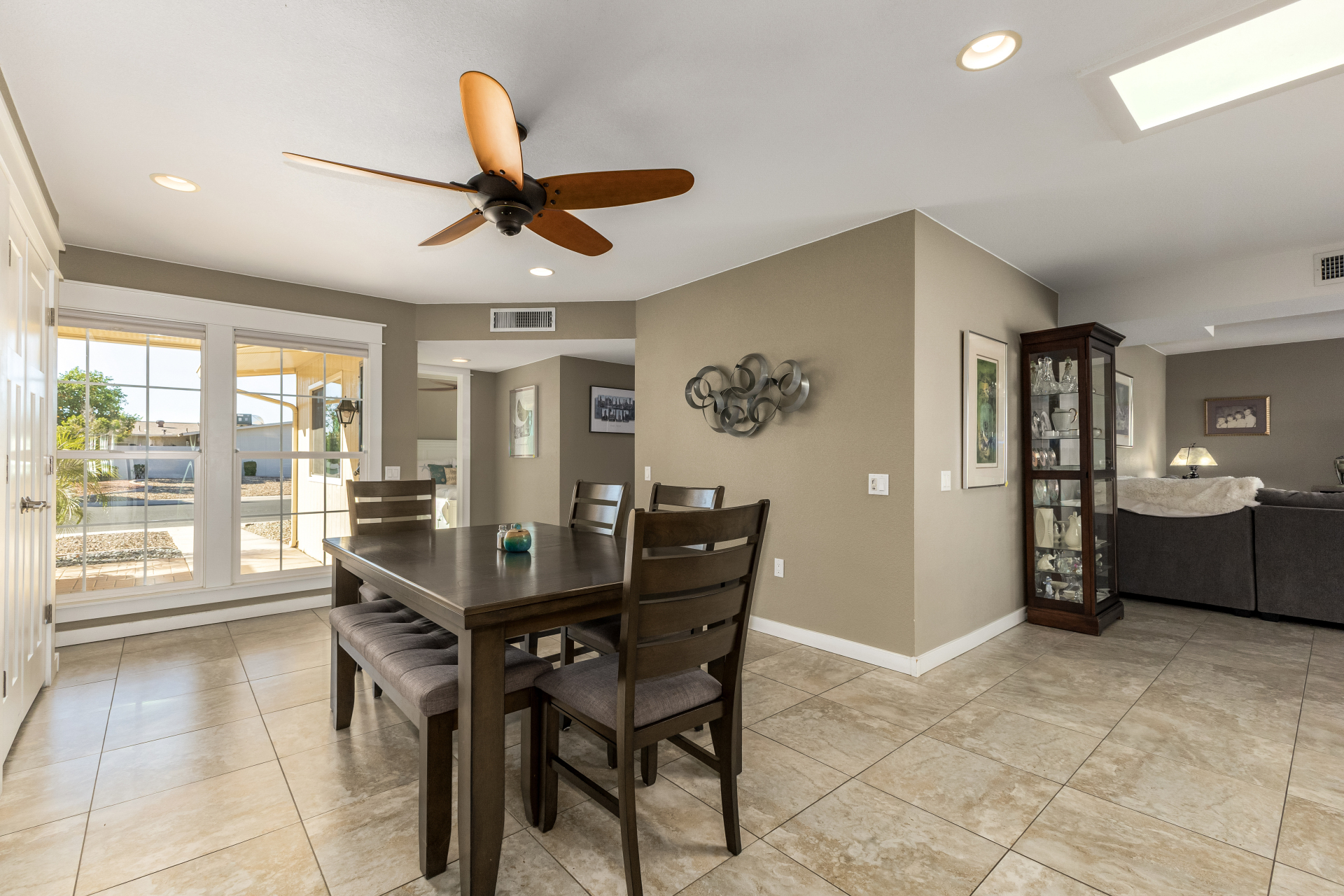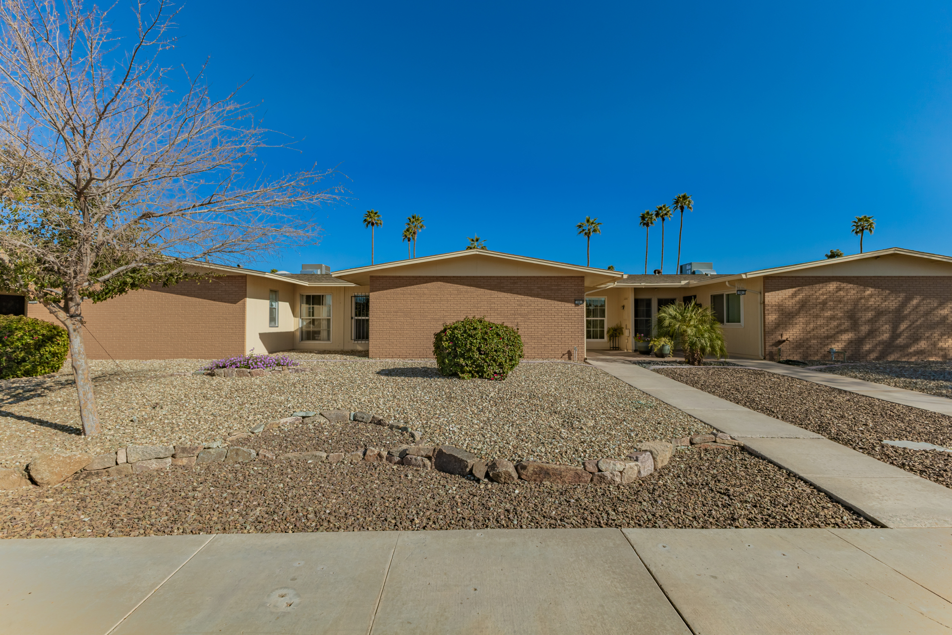 Centrally located in Sun City, Arizona, this 2-bedroom, 2-bath garden apartment is truly one-of-a-kind. It features an open floor plan with tile flooring, new baseboards throughout, flat white ceilings, newer dual-pane windows and sliders, and beautiful window furnishings. The updated kitchen boasts newer cabinetry with pull-outs and soft-close drawers, granite countertops, stainless steel appliances including an induction cooktop, and recessed / pendant lighting — perfectly combining style and functionality. Additional upgrades include replacing interior doors, recessed lighting throughout, inside laundry, and abundant of storage space. Both bathrooms have been tastefully updated with walk-in showers, raised vanities, updated cabinetry, granite countertops, mirrors, lighting, hardware, and toilets.