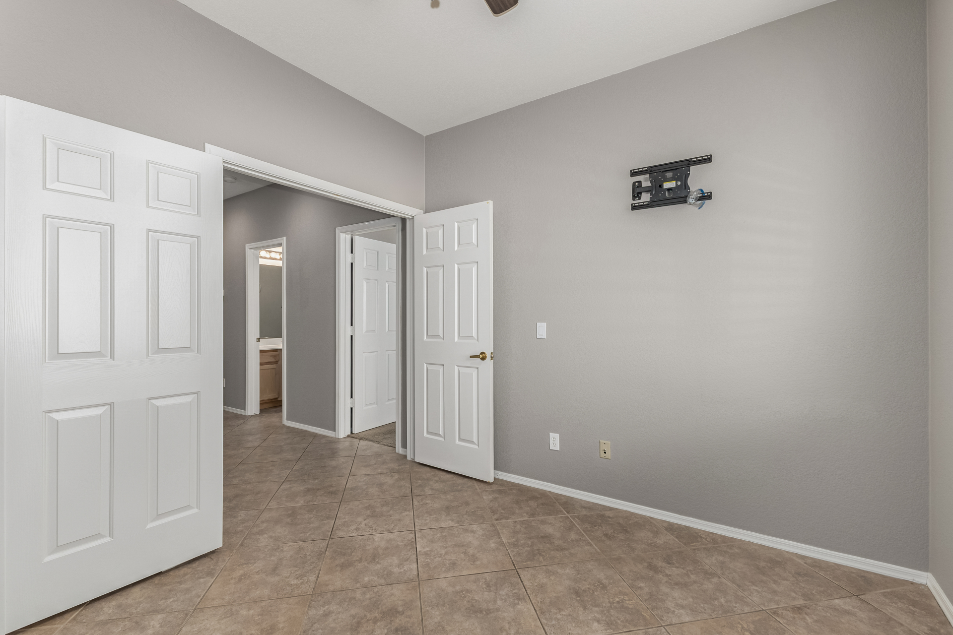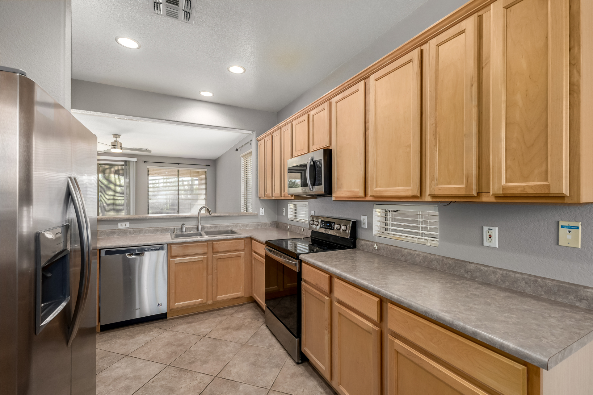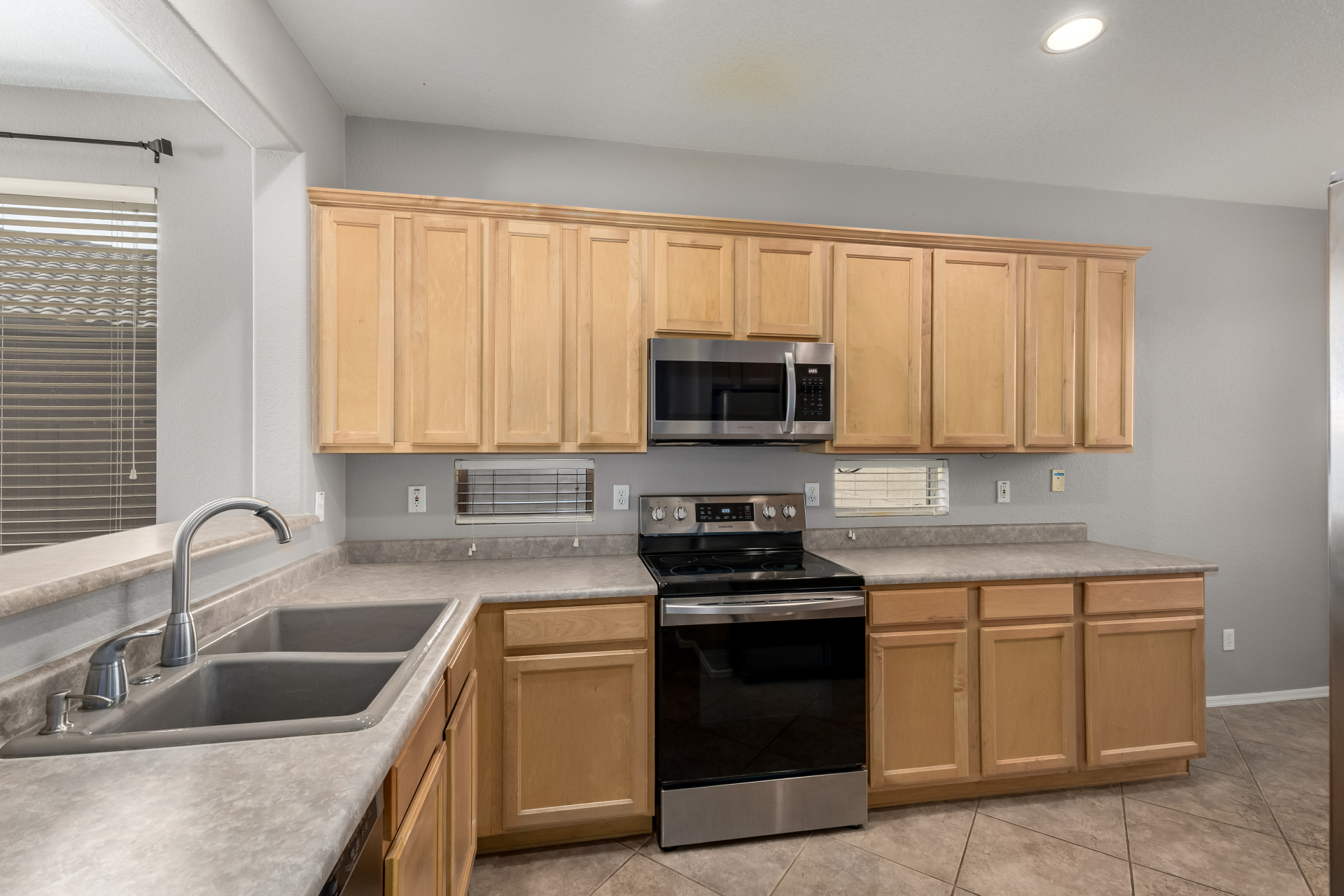 Experience this single-level home on a quiet cul-de-sac! A spacious 3-car garage + RV gate provide flexible parking space. Inside, tile flooring flows throughout, complementing the welcoming living room for entertaining. The eat-in kitchen shines with SS appliances, honey-tone cabinetry, generous counter space, & a convenient pass-through window breakfast bar. Retreat to the main bedroom featuring a private bathroom designed for relaxation with its separate tub/shower, dual sinks, & a walk-in closet. Double doors open to a nice-sized den! Enjoy a sizable backyard with a covered patio, view fence, & plenty of room to add a pool or bring your creative vision to life. Ideally located just minutes from parks, schools, dining, & local amenities. This home is ready to be yours today!
