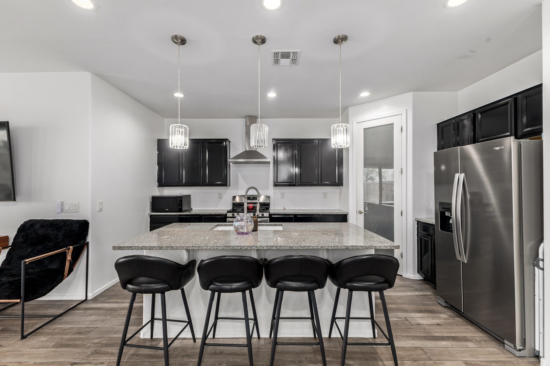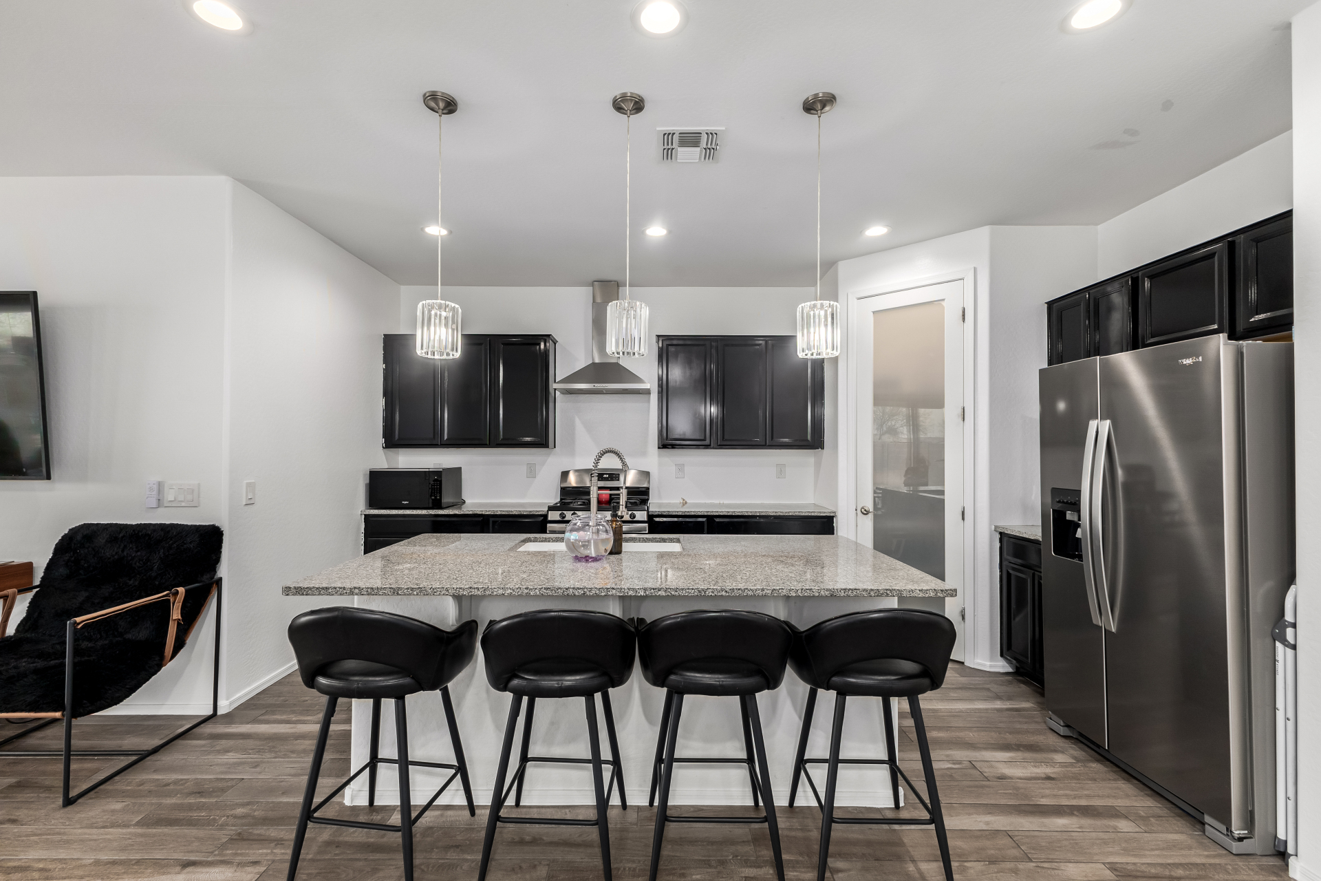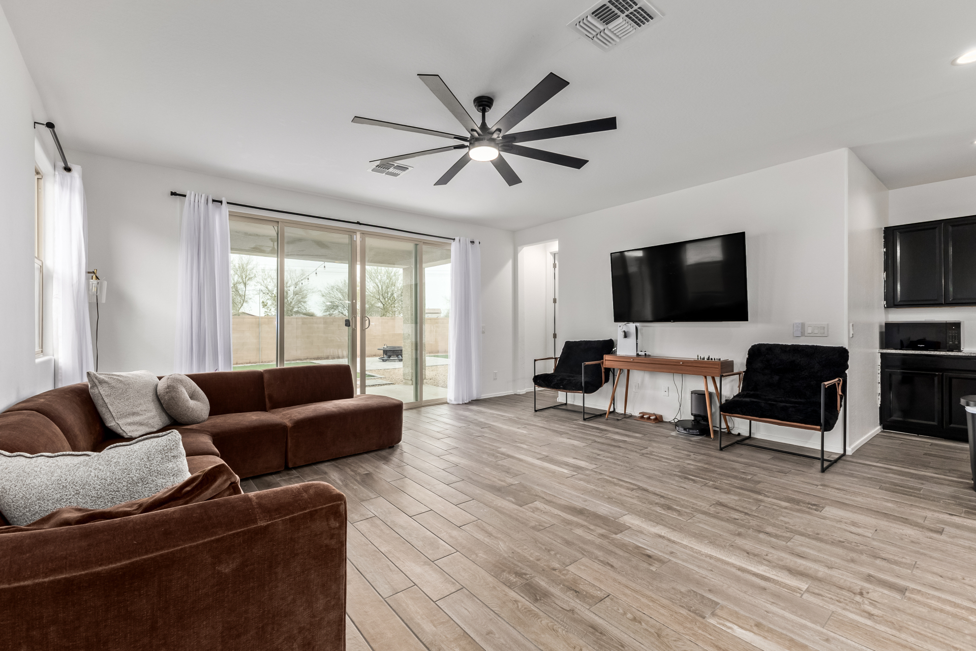 This stunning single-story home awaits you in the desirable Tuscano! The gorgeous façade, manicured landscape, and 3-car plus RV garage are just the beginning! Inside, you'll find a bright and open layout with wood-look tile floors, contemporary lighting, abundant natural light, and stylish neutral colors. The impeccable kitchen is complete with rich black cabinetry, sleek granite counters, stainless steel appliances, and an island for those casual conversations and quick bites. The main bedroom is a true retreat, boasting a walk-in closet and a private bathroom. The backyard includes a covered patio, a nice seating space with pavers, and artificial turf. Come see it before it's gone!