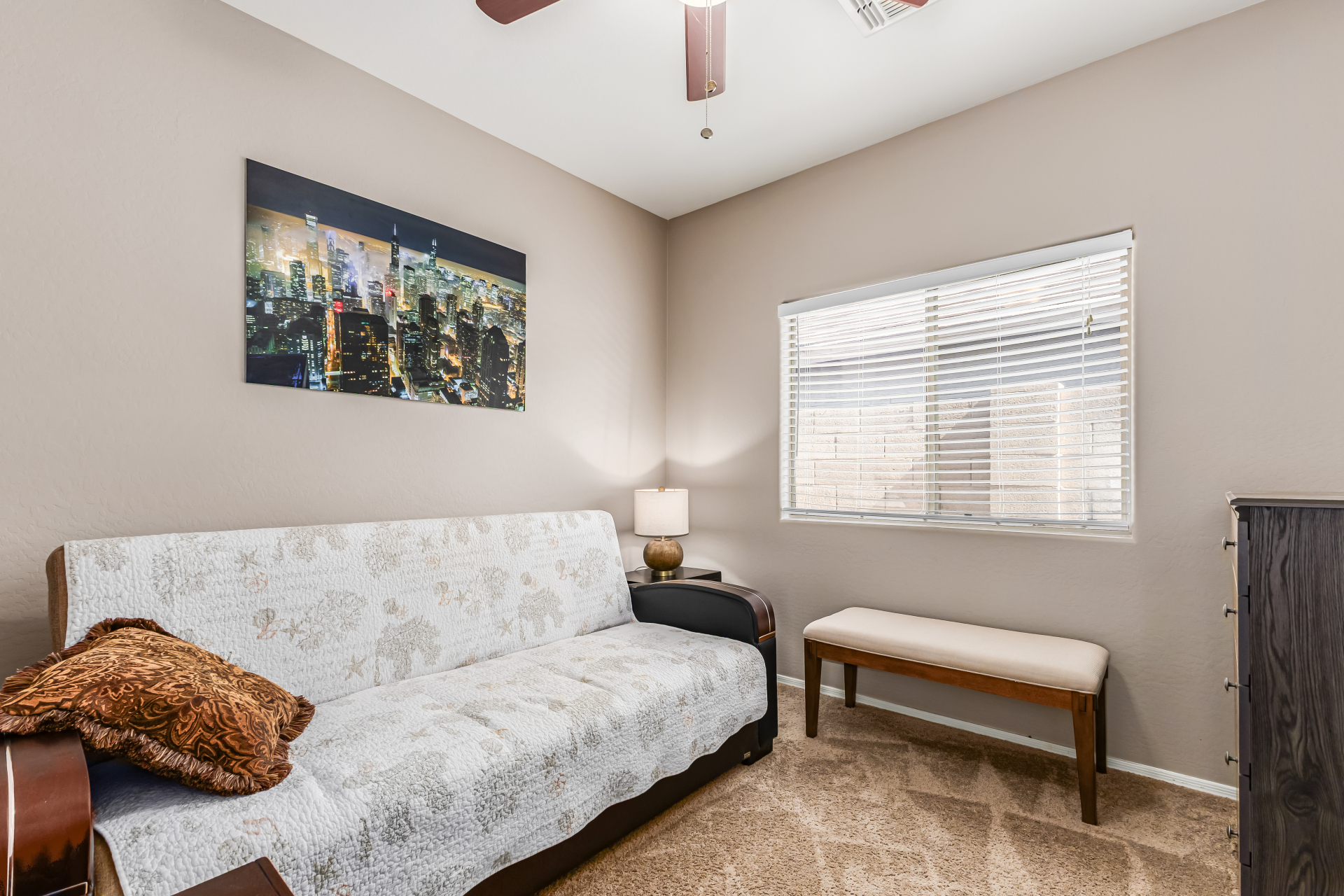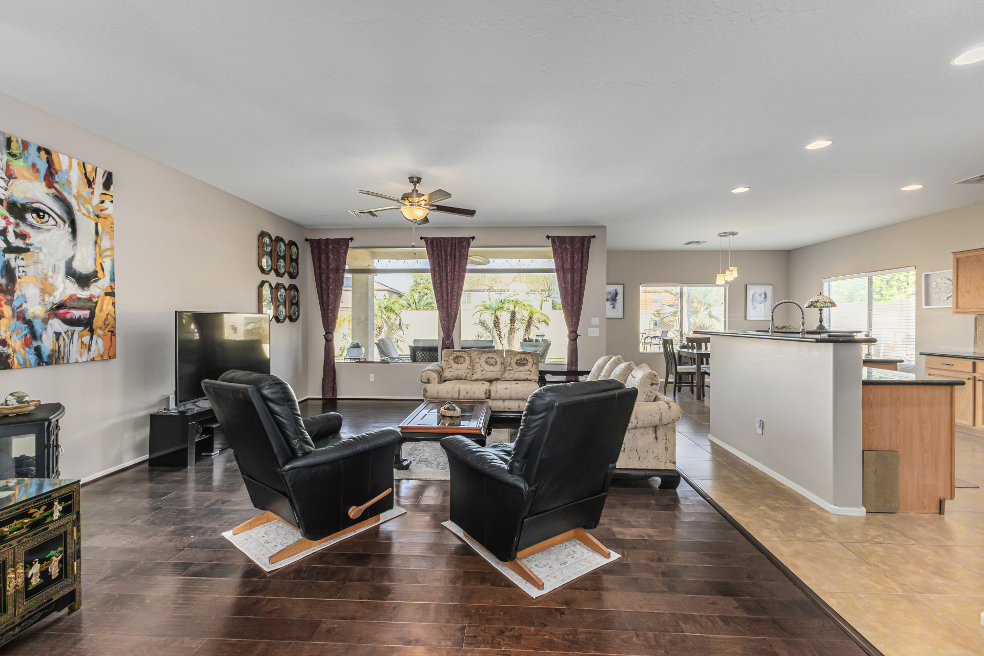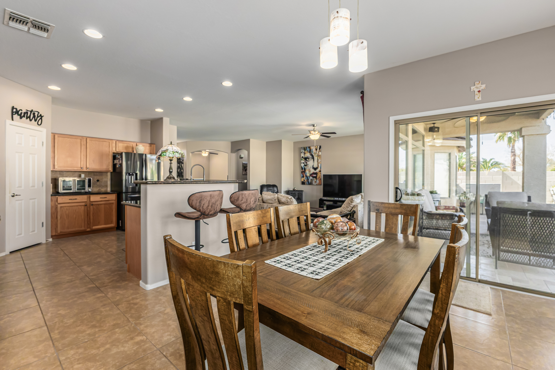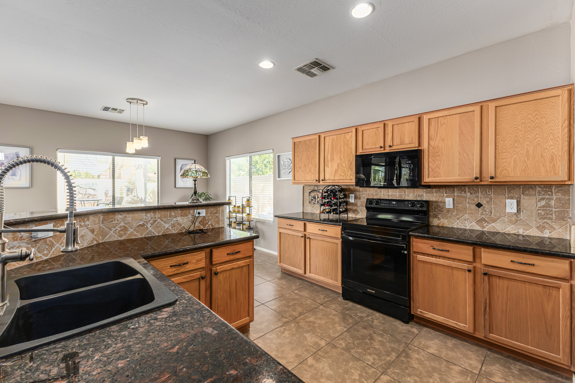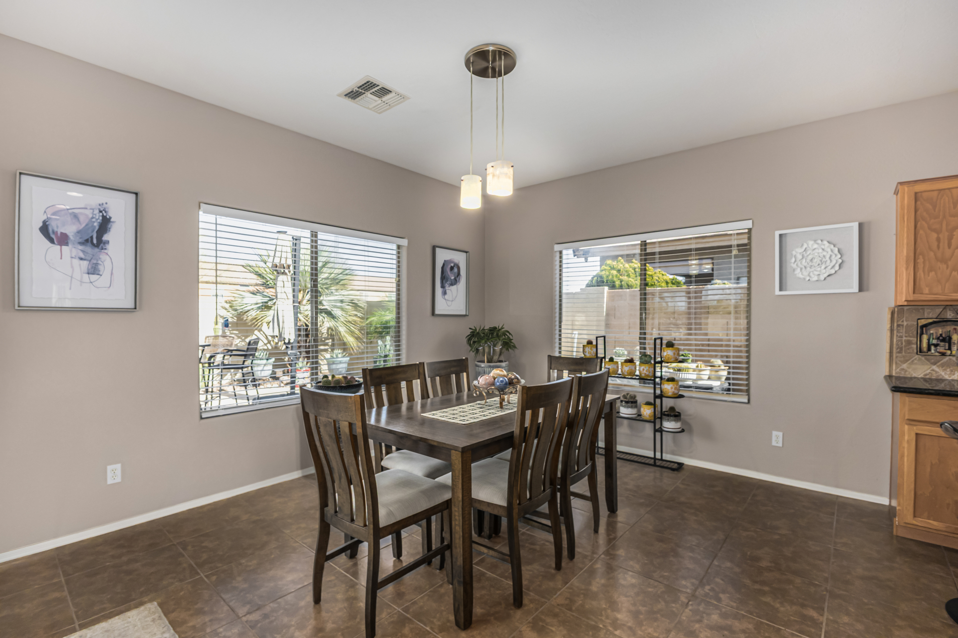 Look no further! This fantastic 3 bed, 2 bath residence in Copper Basin is the one for you! Tasteful stone accents, a no-fuss desert landscape, and a 2 car garage are just the beginning. Come inside to discover a spacious great room w/elegant wood-look flooring in all the right places, high ceilings, and a neutral palette. The eat-in kitchen is equipped w/ample cabinetry, a pantry, granite counters, tile backsplash, built-in appliances, and a two-tiered island. Enjoy a good night's sleep in the primary bedroom, boasting soft carpet, a lovely bay window, and a full bath w/dual sinks. You'll also find a cozy open den ideal for a reading nook. Lastly, the wonderful backyard includes a covered patio, extended seating area, built-in BBQ, artificial turf, and a sparkling blue pool! Act now!