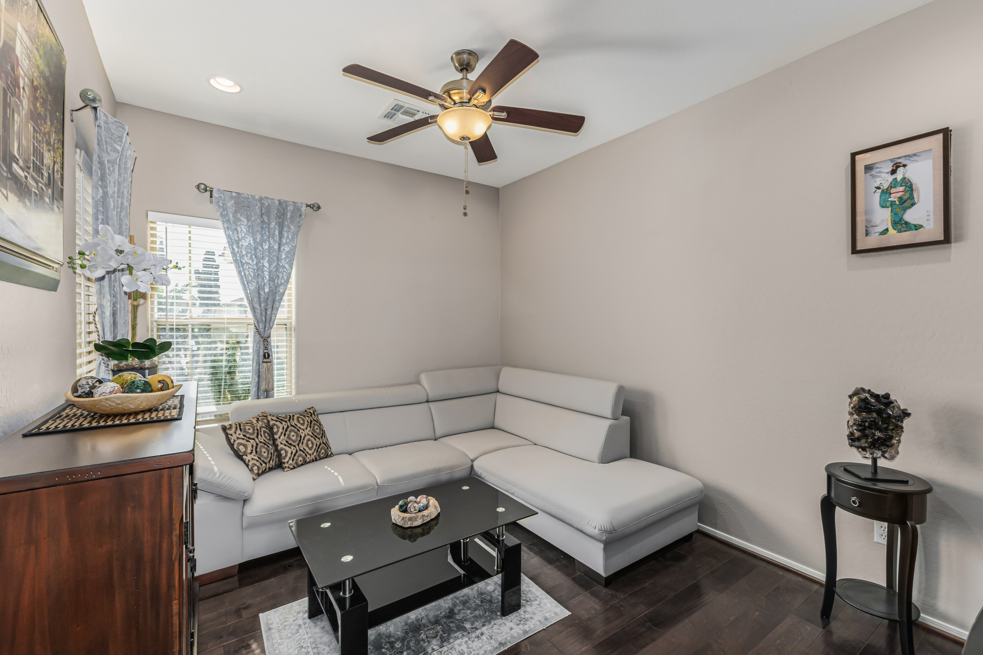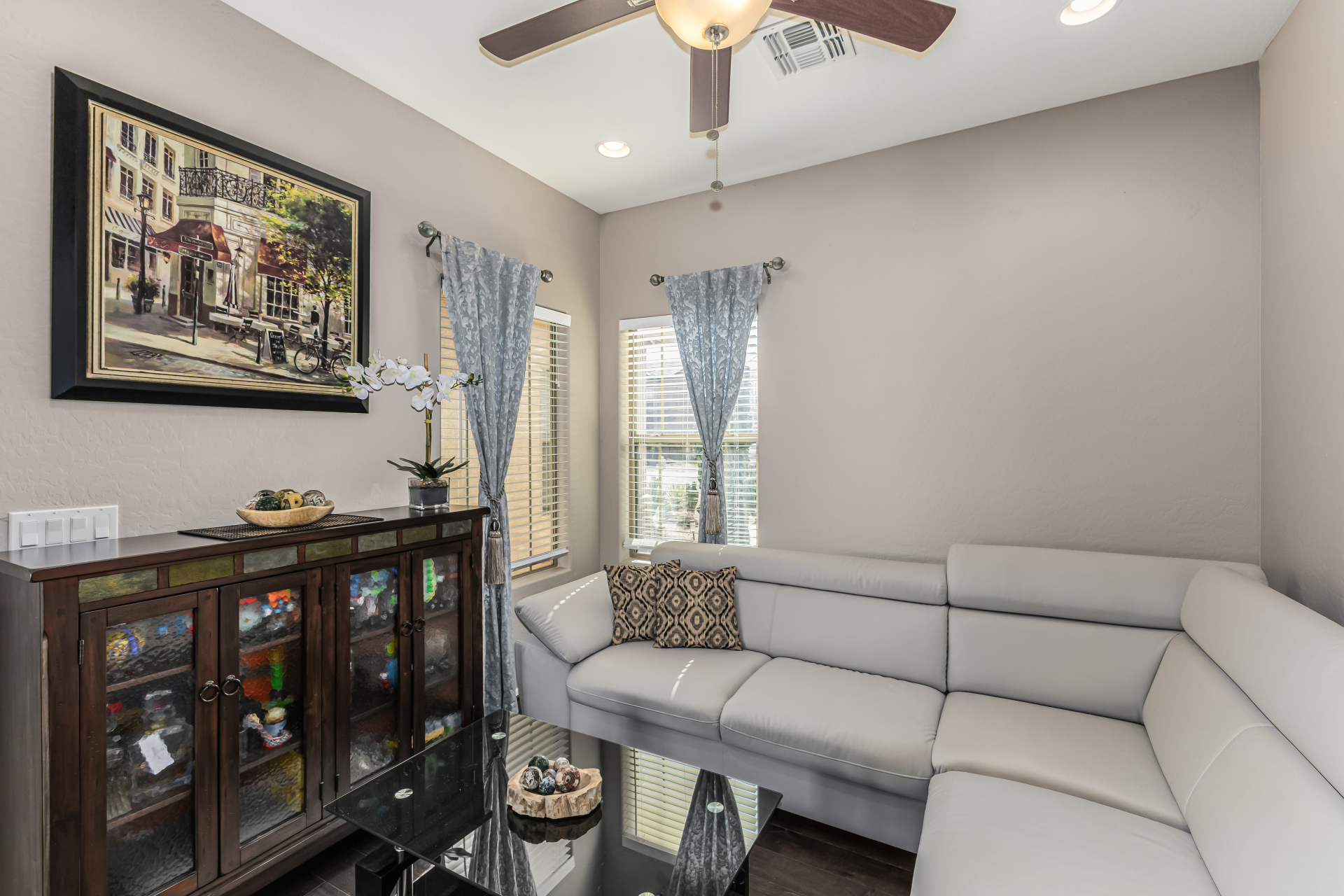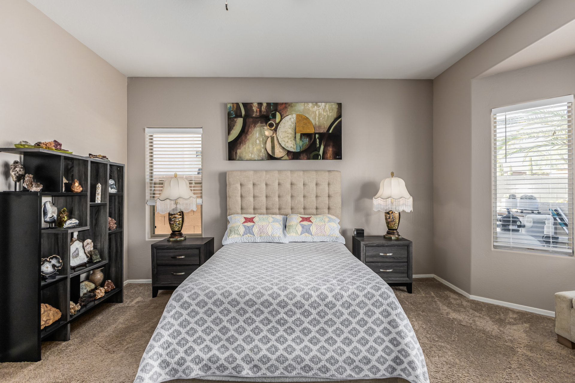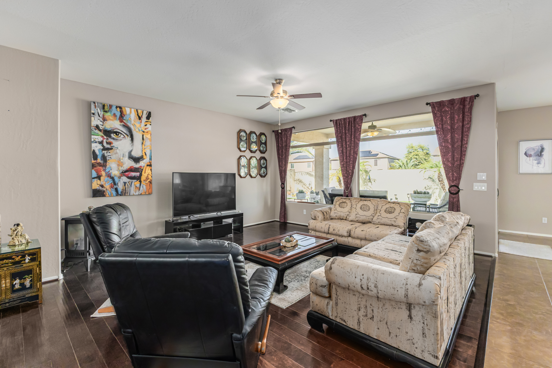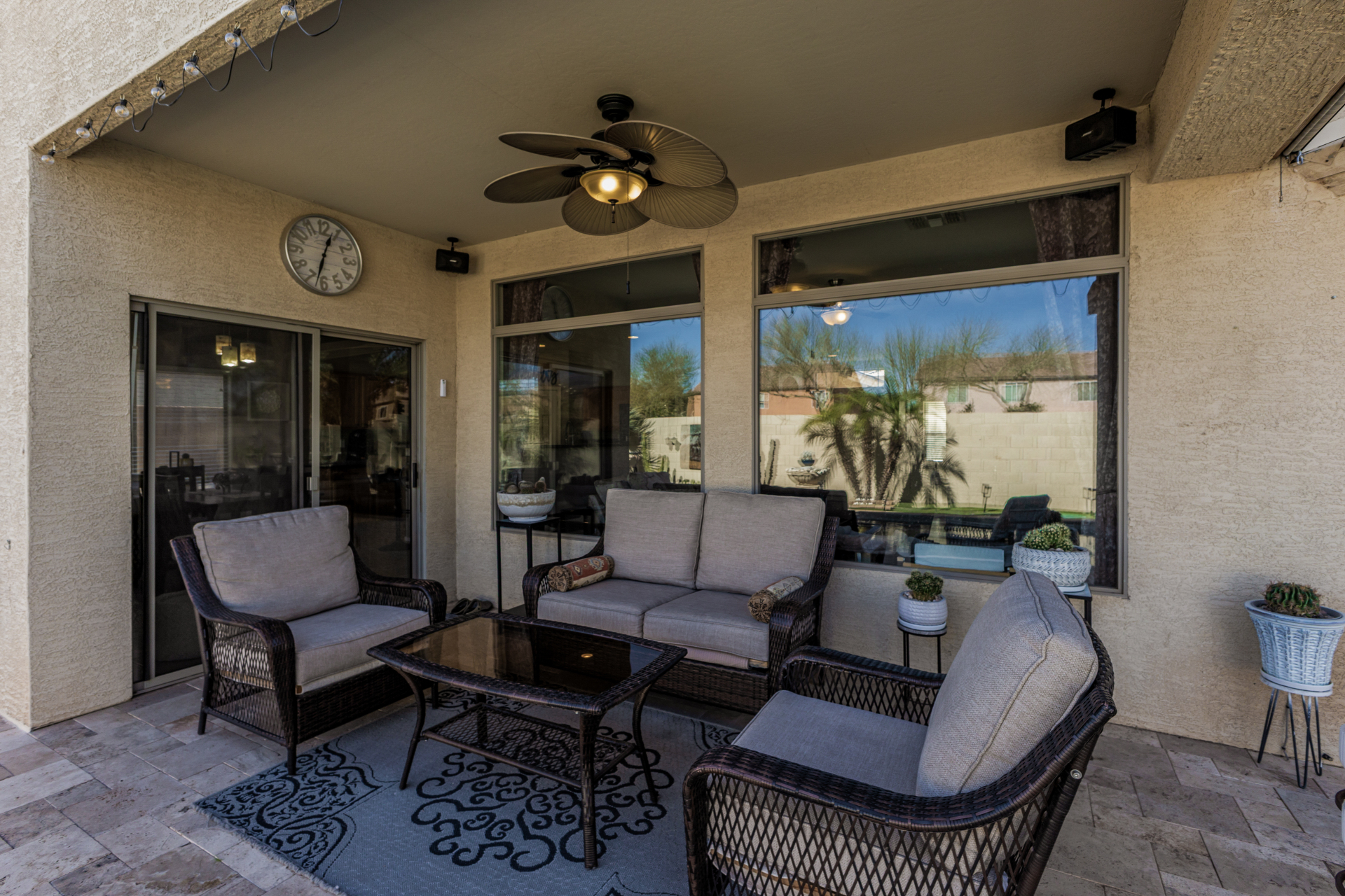 Look no further! This fantastic 3 bed, 2 bath residence in Copper Basin is the one for you! Tasteful stone accents, a no-fuss desert landscape, and a 2 car garage are just the beginning. Come inside to discover a spacious great room w/elegant wood-look flooring in all the right places, high ceilings, and a neutral palette. The eat-in kitchen is equipped w/ample cabinetry, a pantry, granite counters, tile backsplash, built-in appliances, and a two-tiered island. Enjoy a good night's sleep in the primary bedroom, boasting soft carpet, a lovely bay window, and a full bath w/dual sinks. You'll also find a cozy open den ideal for a reading nook. Lastly, the wonderful backyard includes a covered patio, extended seating area, built-in BBQ, artificial turf, and a sparkling blue pool! Act now!