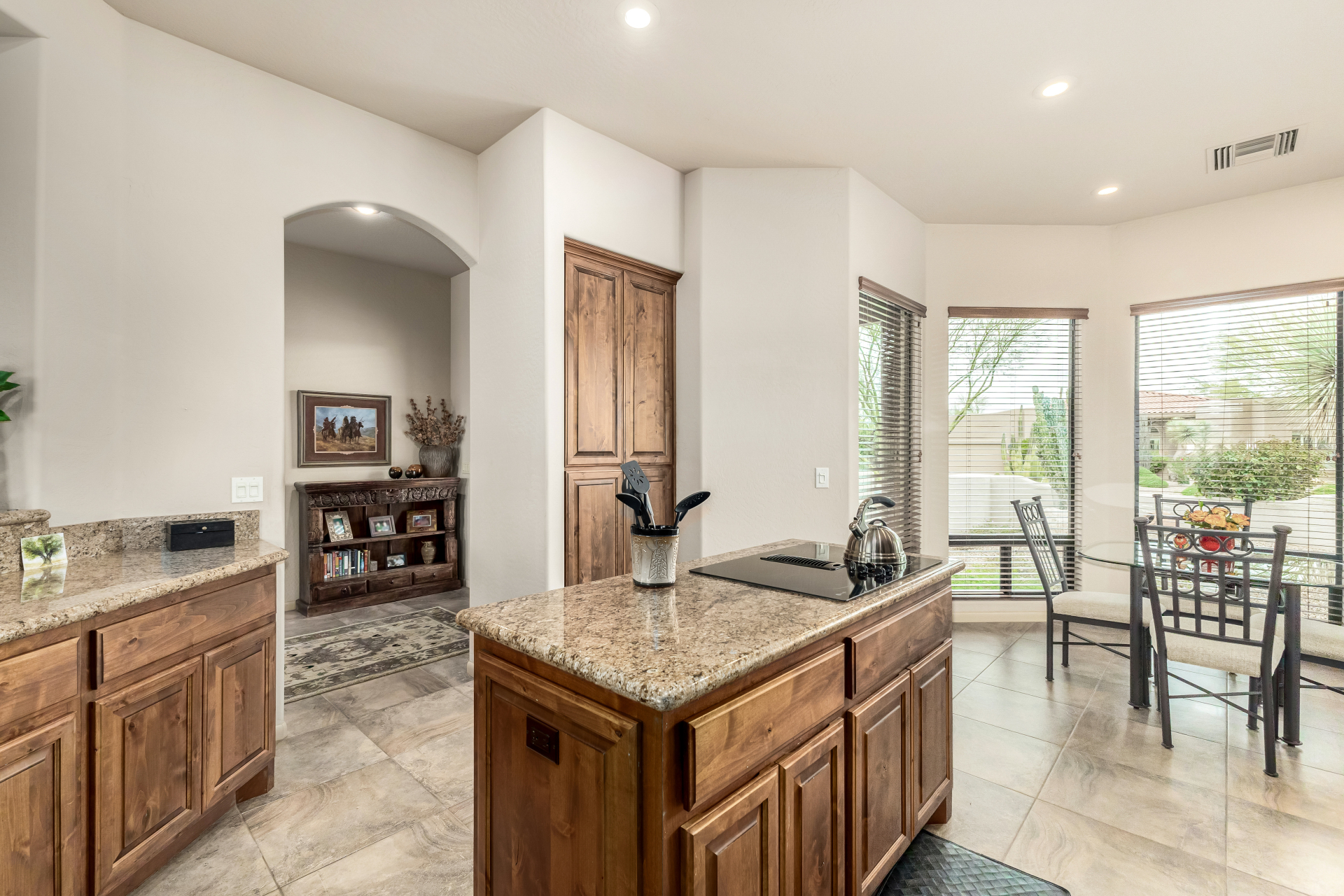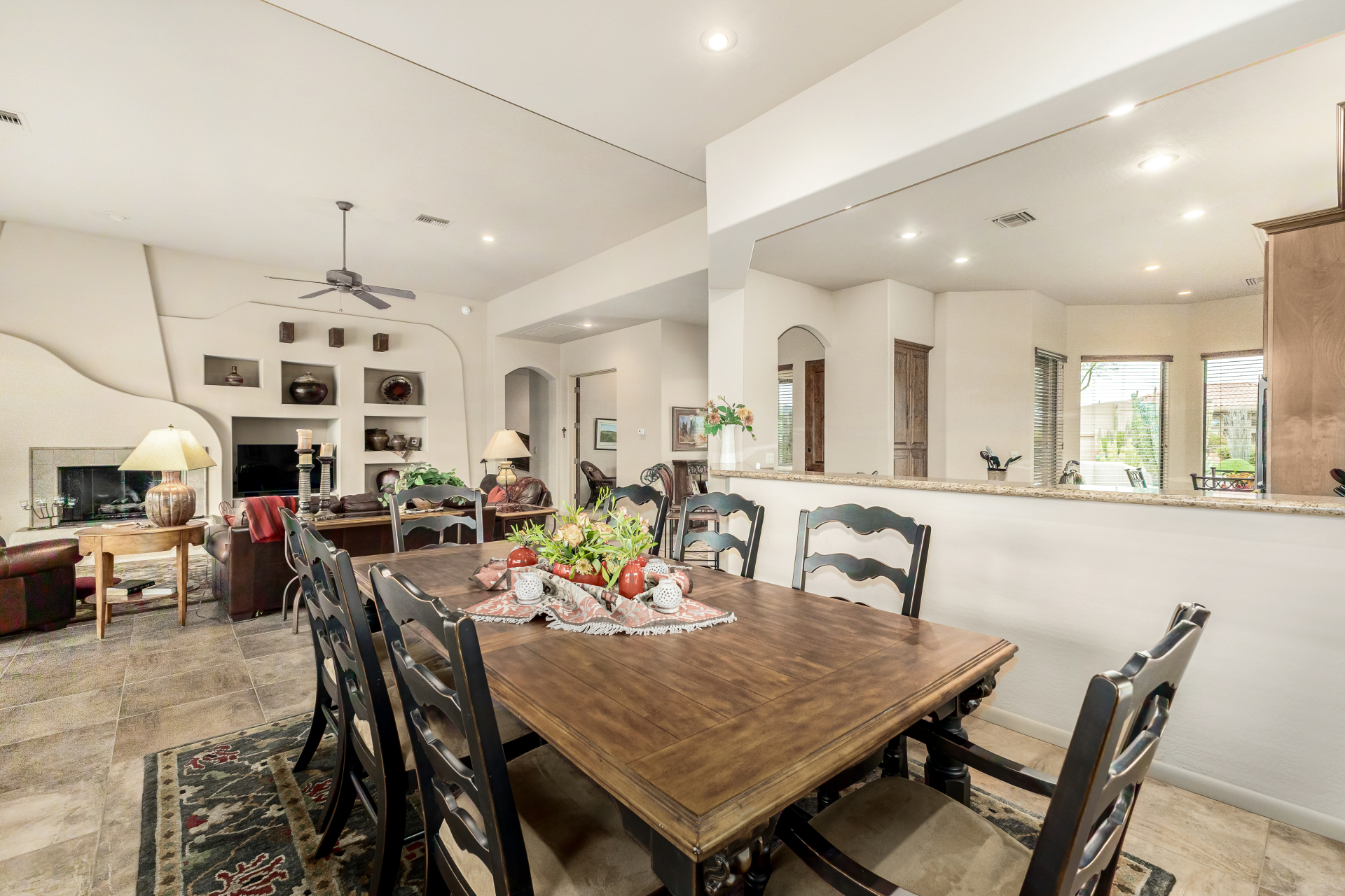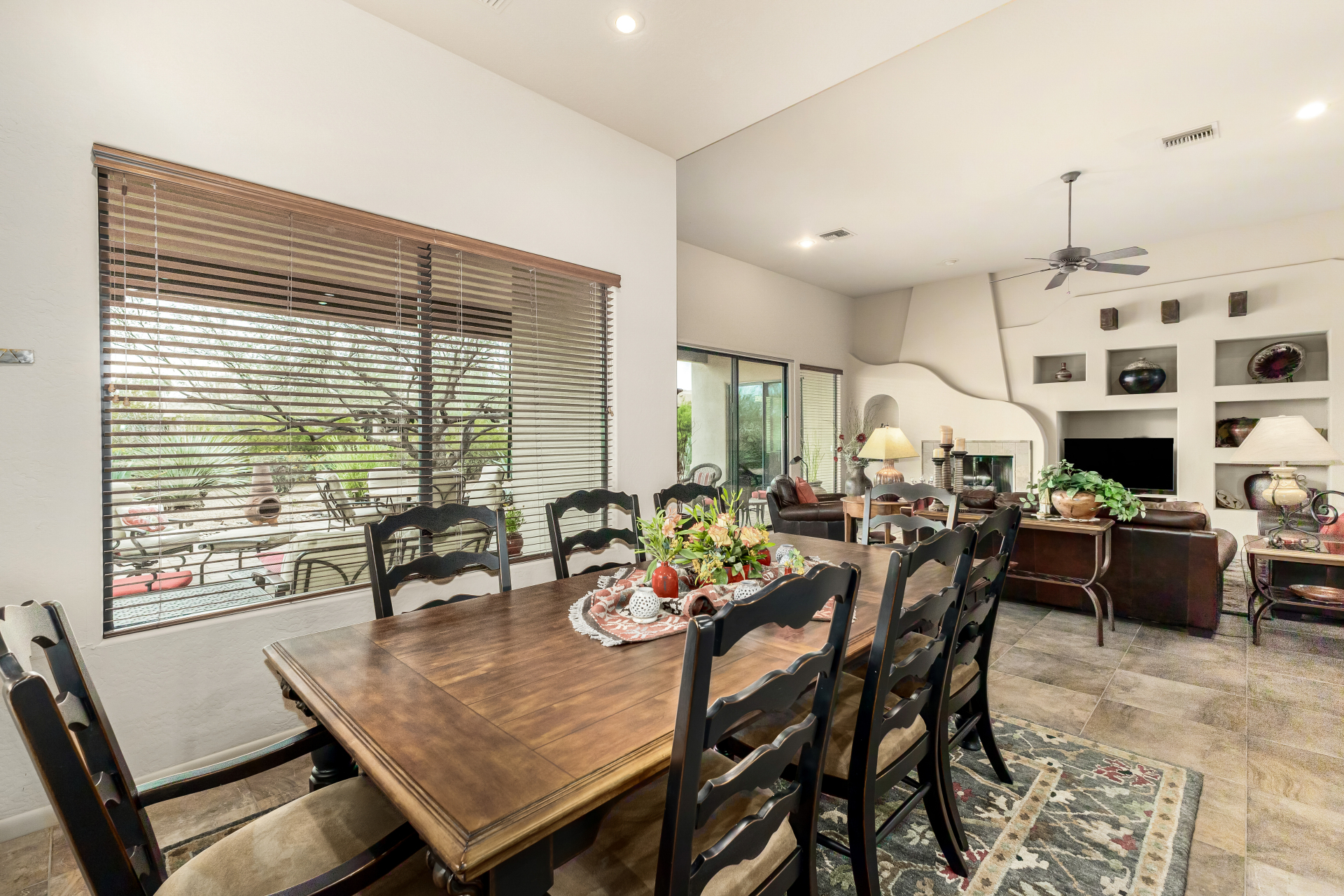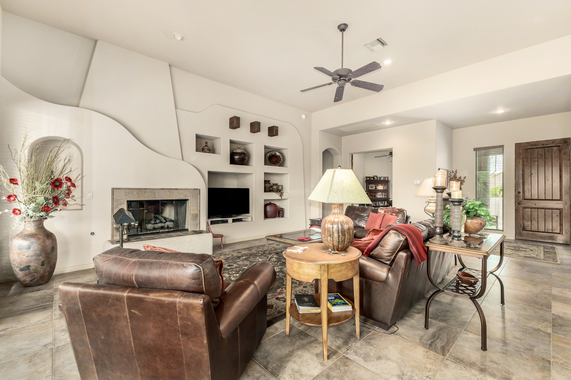 Discover the allure of this exquisite 2-bedroom territorial-style home with a 2.5-car garage and timeless curb appeal. Inside, sleek tile floors guide you into a welcoming living room adorned with elegant wall niches and a cozy gas fireplace perfect for relaxing evenings. Enjoy intimate dinners in the formal dining area, then gather in the beautifully appointed kitchen featuring rich wood cabinetry, granite counters, tile backsplash, wall ovens, essential appliances, a center island, breakfast bar, and a sunny breakfast nook. The serene primary suite offers direct backyard access and a private bath with dual sinks, a soaking tub, and a spacious walk-in closet. A versatile den makes an ideal office or creative space, while the laundry room includes a convenient utility sink...