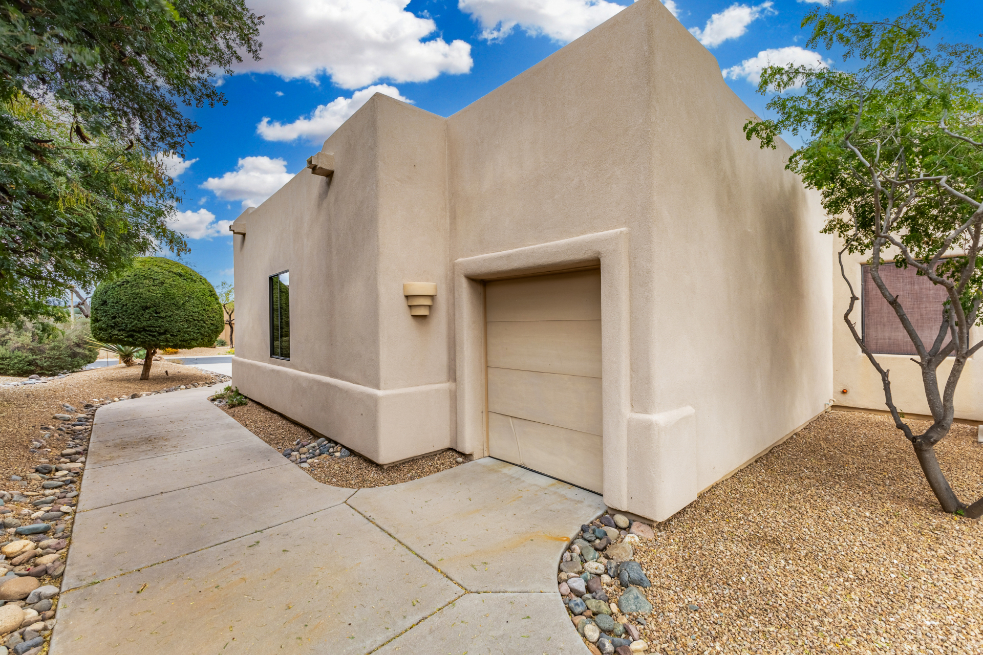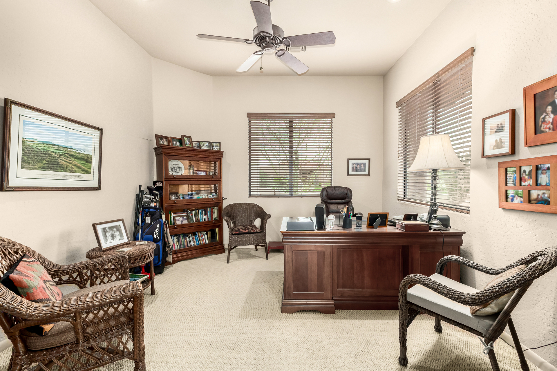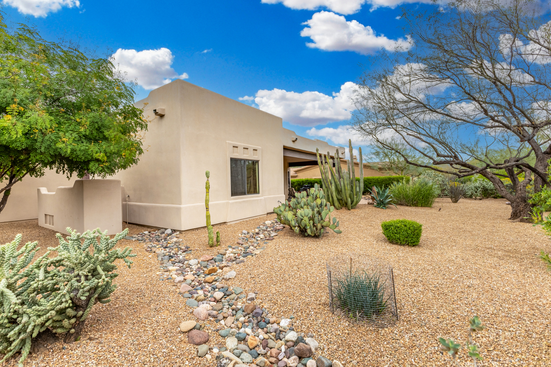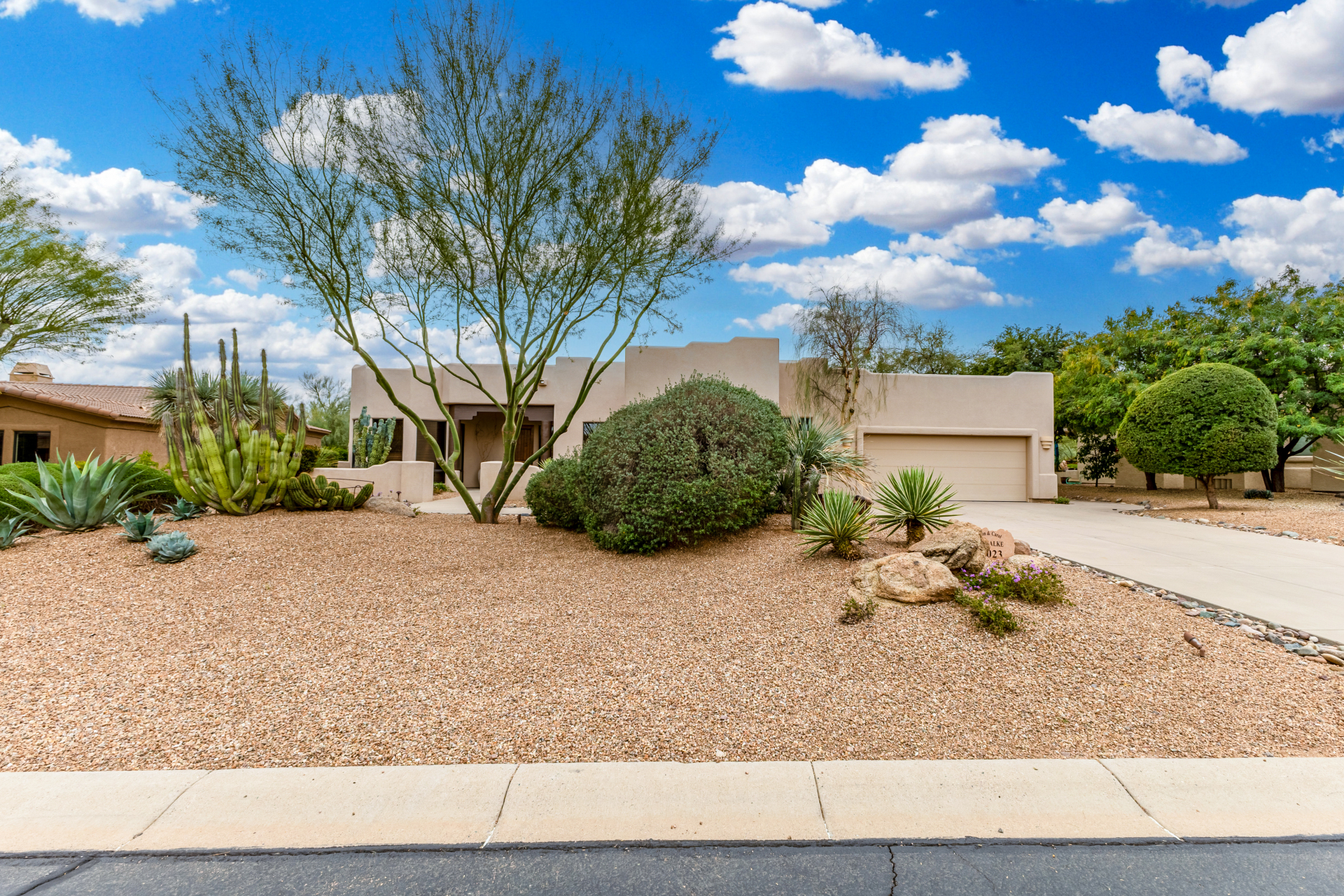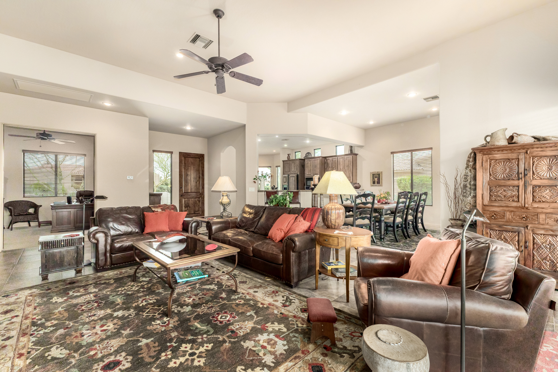 Discover the allure of this exquisite 2-bedroom territorial-style home with a 2.5-car garage and timeless curb appeal. Inside, sleek tile floors guide you into a welcoming living room adorned with elegant wall niches and a cozy gas fireplace perfect for relaxing evenings. Enjoy intimate dinners in the formal dining area, then gather in the beautifully appointed kitchen featuring rich wood cabinetry, granite counters, tile backsplash, wall ovens, essential appliances, a center island, breakfast bar, and a sunny breakfast nook. The serene primary suite offers direct backyard access and a private bath with dual sinks, a soaking tub, and a spacious walk-in closet. A versatile den makes an ideal office or creative space, while the laundry room includes a convenient utility sink...