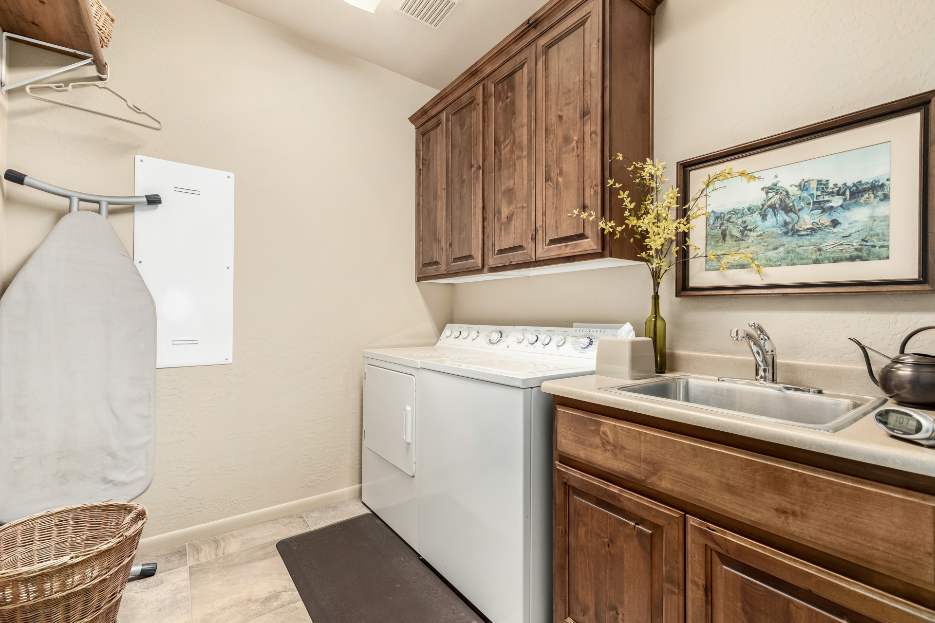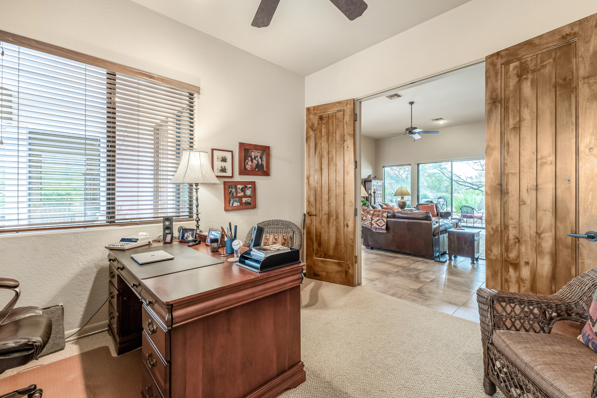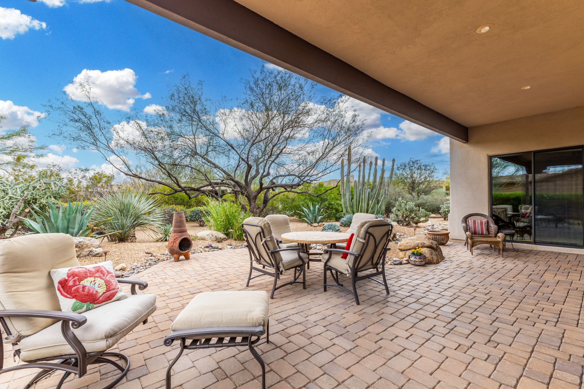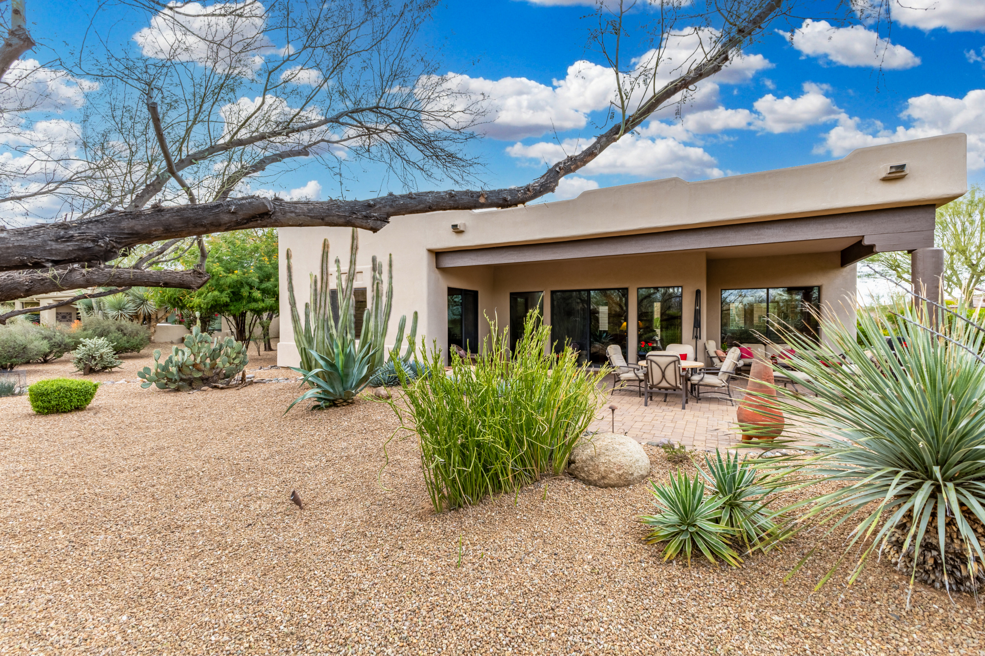 Discover the allure of this exquisite 2-bedroom territorial-style home with a 2.5-car garage and timeless curb appeal. Inside, sleek tile floors guide you into a welcoming living room adorned with elegant wall niches and a cozy gas fireplace perfect for relaxing evenings. Enjoy intimate dinners in the formal dining area, then gather in the beautifully appointed kitchen featuring rich wood cabinetry, granite counters, tile backsplash, wall ovens, essential appliances, a center island, breakfast bar, and a sunny breakfast nook. The serene primary suite offers direct backyard access and a private bath with dual sinks, a soaking tub, and a spacious walk-in closet. A versatile den makes an ideal office or creative space, while the laundry room includes a convenient utility sink...