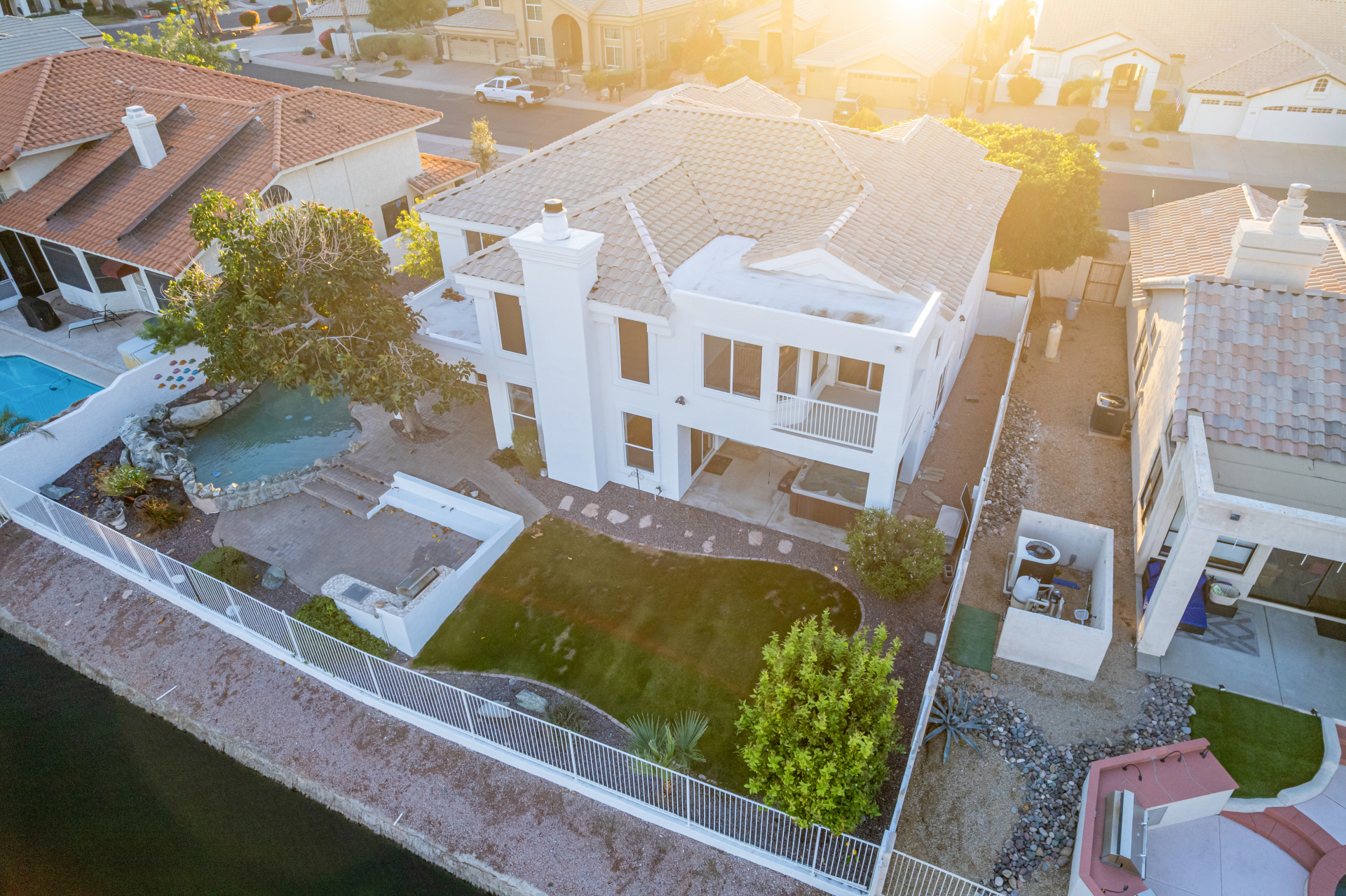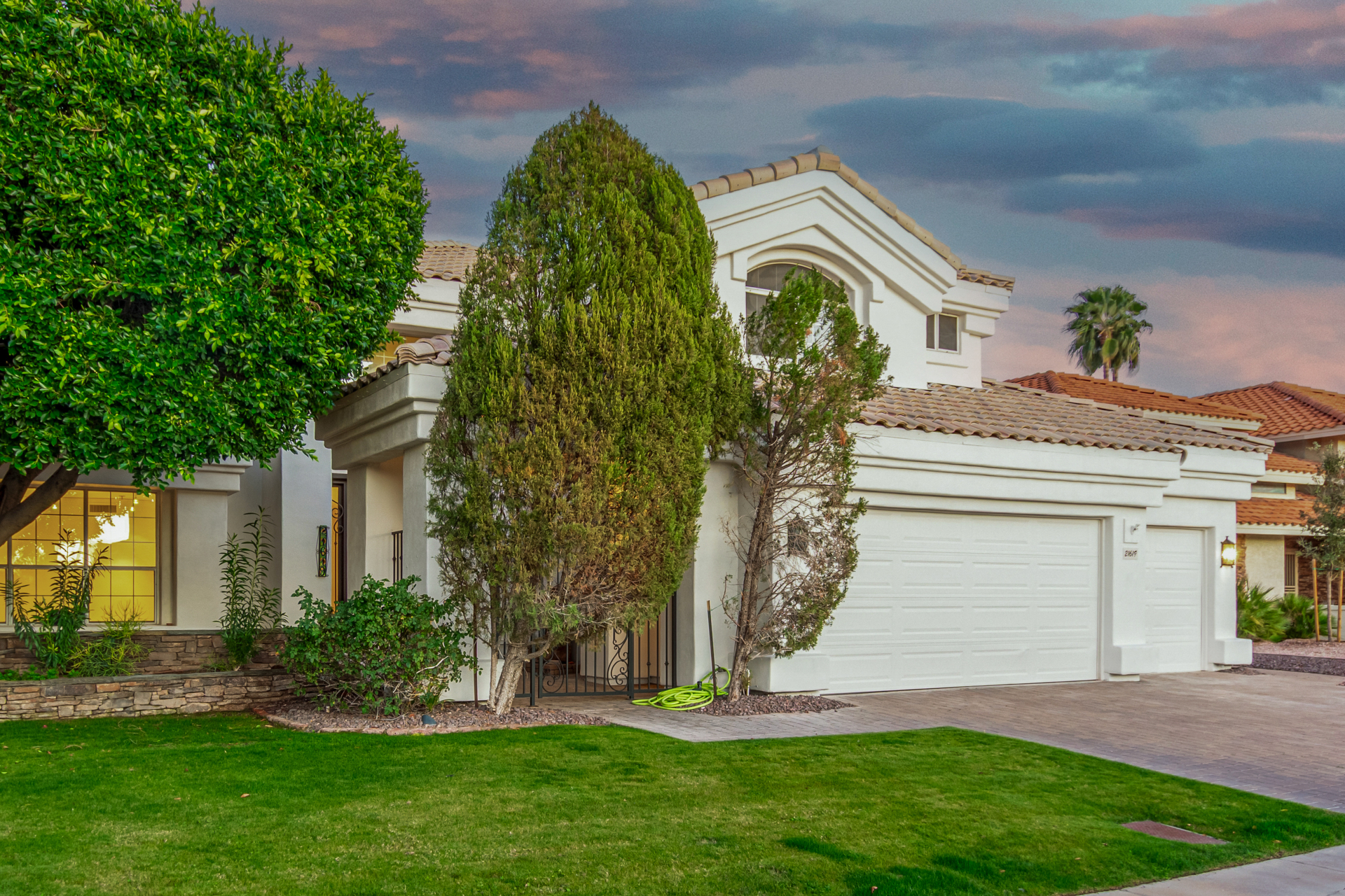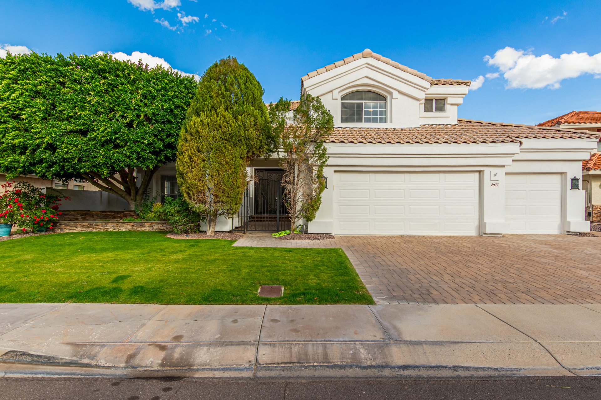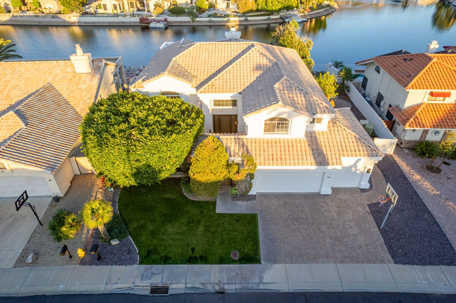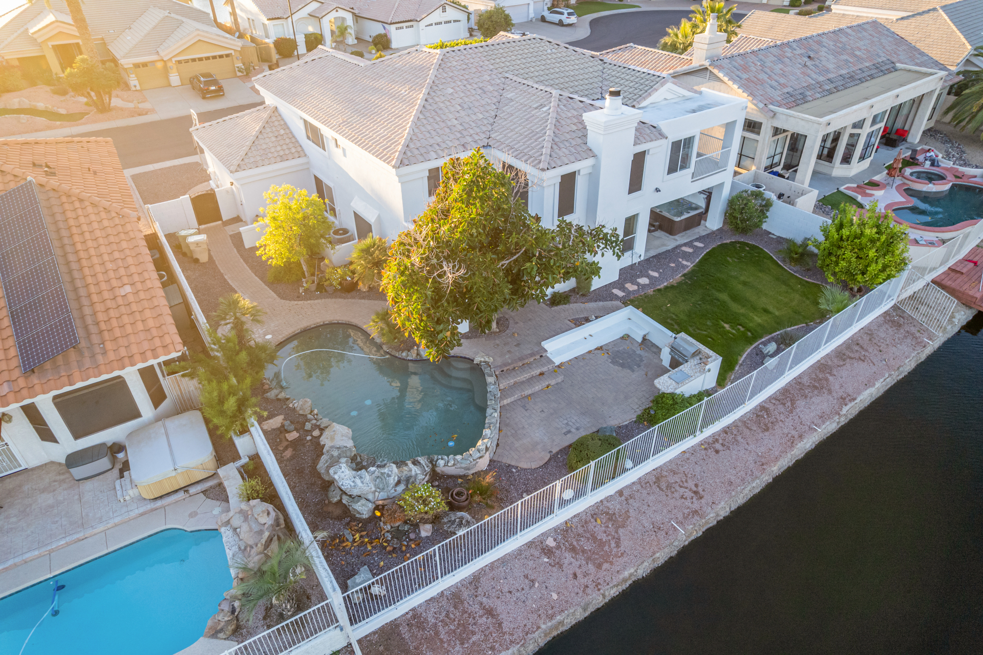 Experience lakeside luxury in the prestigious and highly sought-after Arrowhead Lakes! This impressive 5-bedroom estate captivates from the moment you arrive, boasting lush manicured landscaping, a three-car garage, pavers, and a gated courtyard. Step through the custom iron & glass entry door to be greeted by pure sophistication and timeless design. The grand foyer features a soaring ceiling, a striking chandelier, and exquisite stone flooring. The spacious living room, adorned with track lighting and plush carpeting, is perfect for welcoming guests, while the formal dining room offers sleek wood flooring for stylish entertaining. The expansive family room dazzles with double-height ceilings and a cozy fireplace, creating a warm & inviting atmosphere.