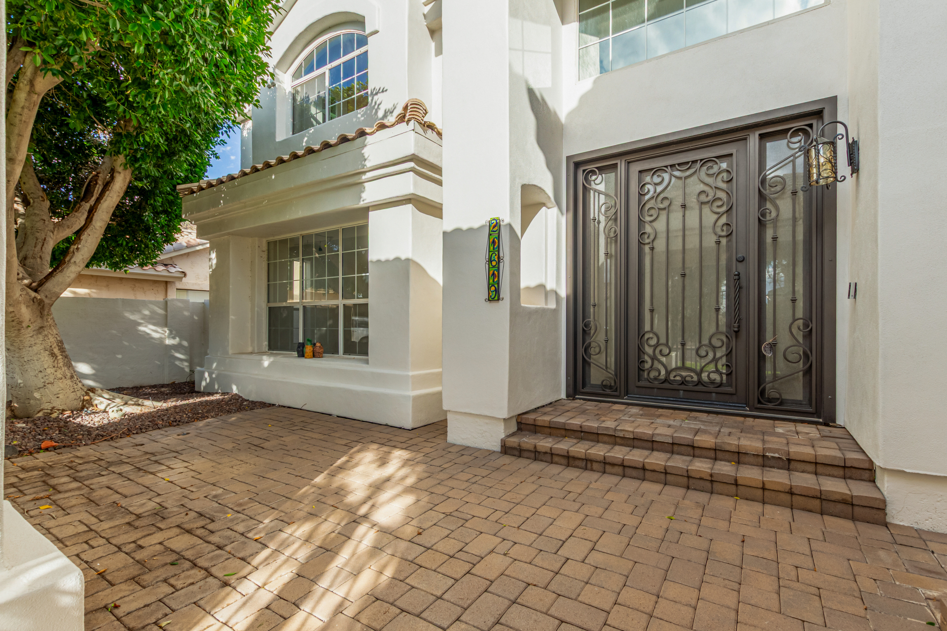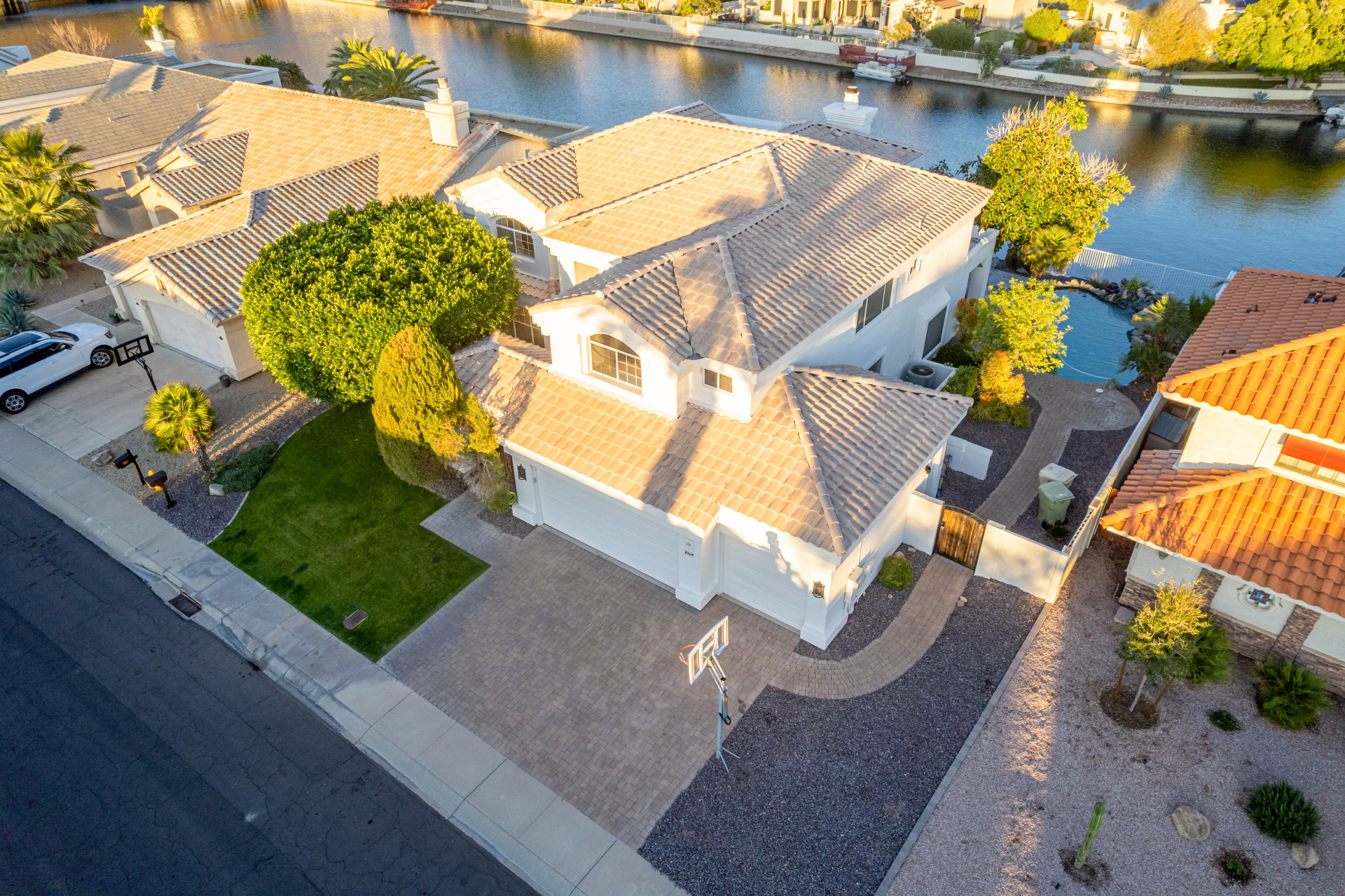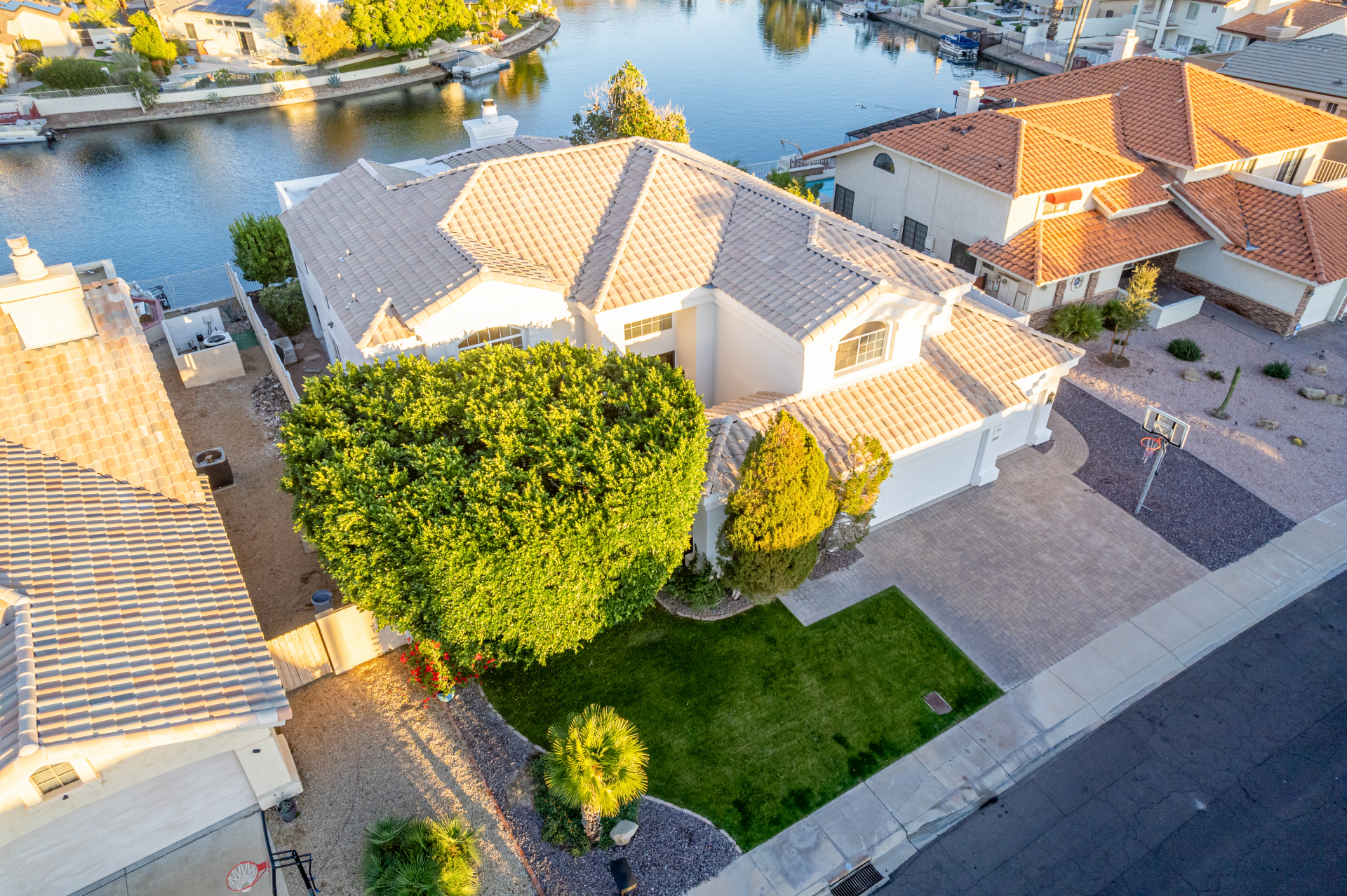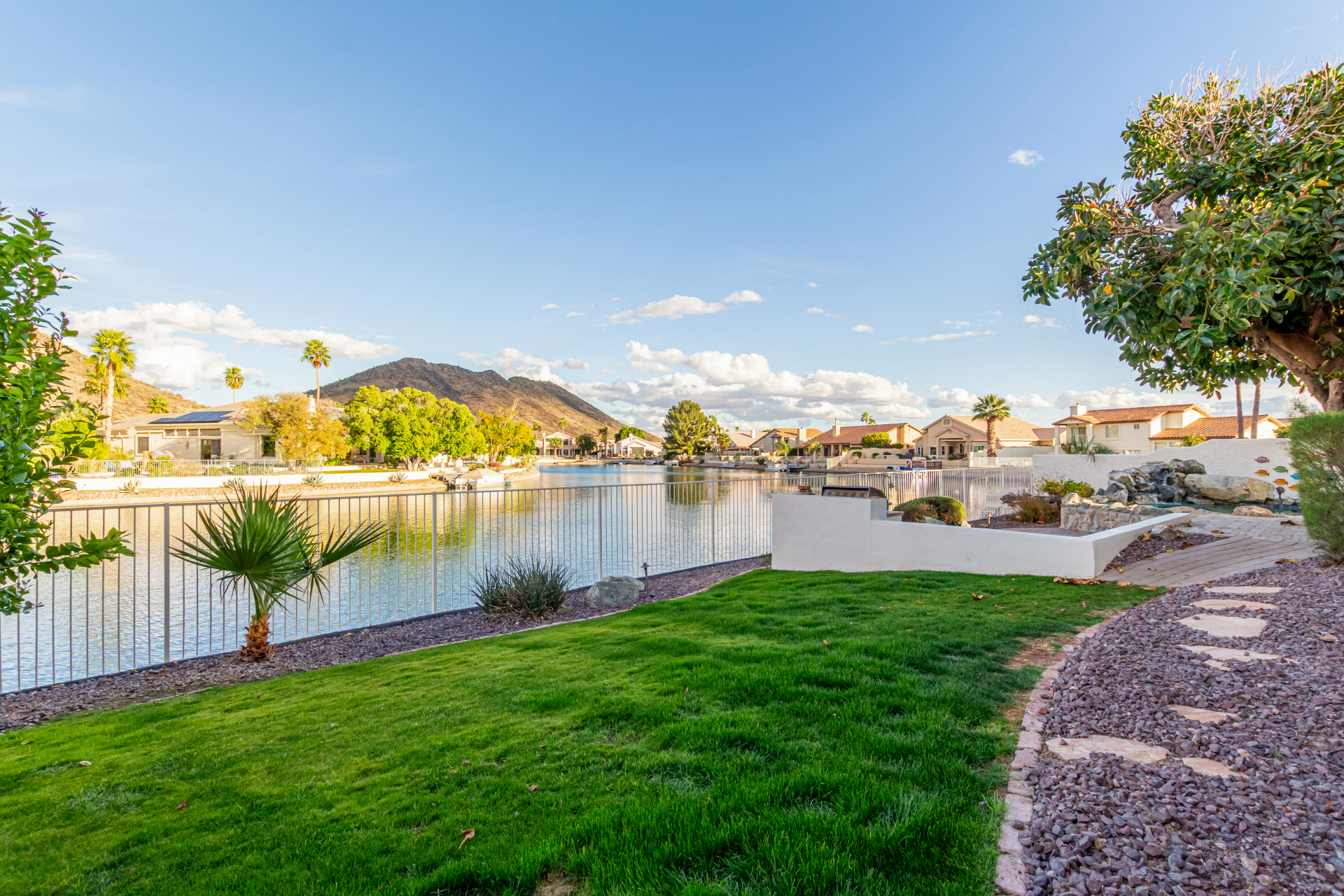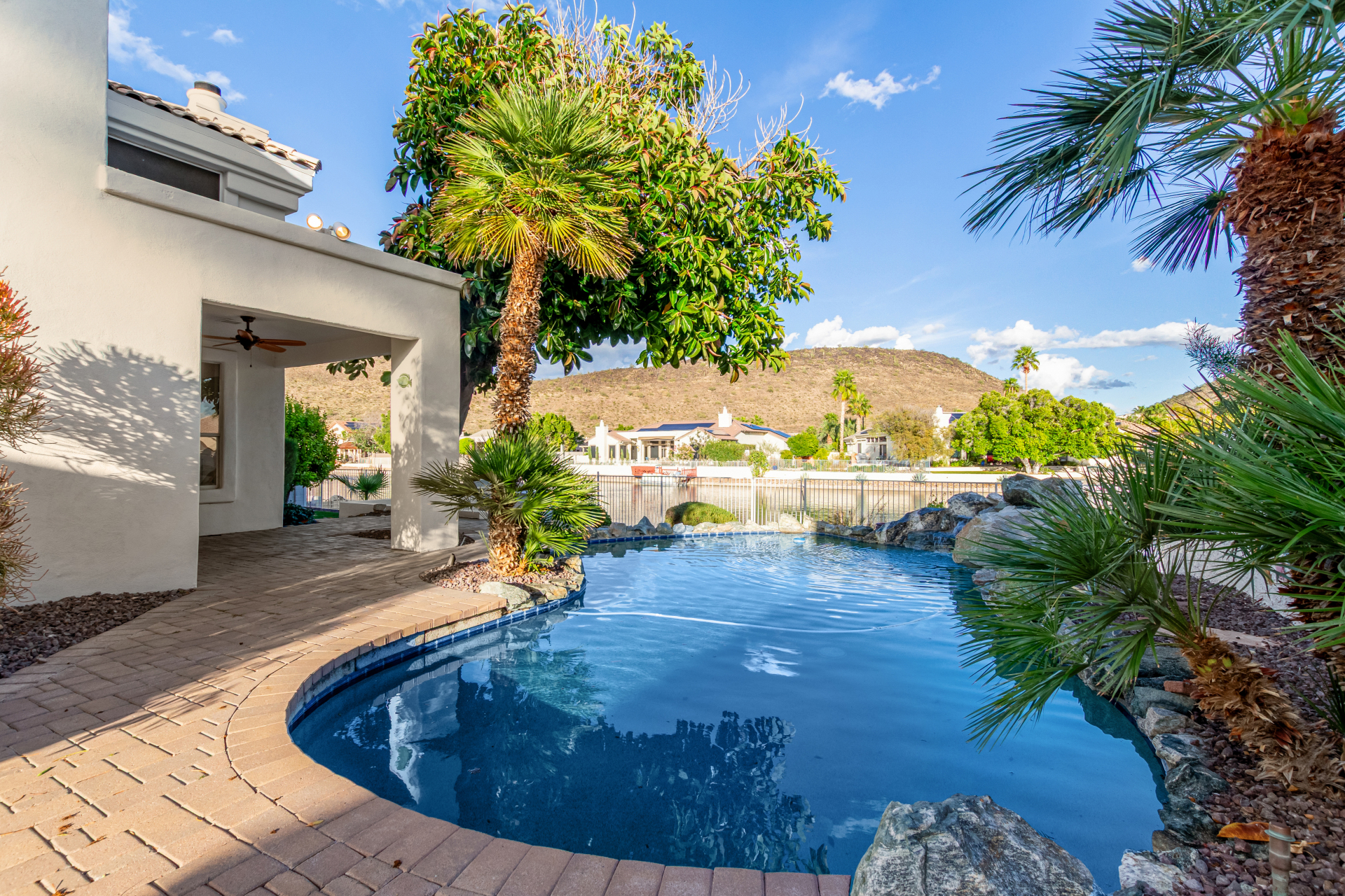 Experience lakeside luxury in the prestigious and highly sought-after Arrowhead Lakes! This impressive 5-bedroom estate captivates from the moment you arrive, boasting lush manicured landscaping, a three-car garage, pavers, and a gated courtyard. Step through the custom iron & glass entry door to be greeted by pure sophistication and timeless design. The grand foyer features a soaring ceiling, a striking chandelier, and exquisite stone flooring. The spacious living room, adorned with track lighting and plush carpeting, is perfect for welcoming guests, while the formal dining room offers sleek wood flooring for stylish entertaining. The expansive family room dazzles with double-height ceilings and a cozy fireplace, creating a warm & inviting atmosphere.