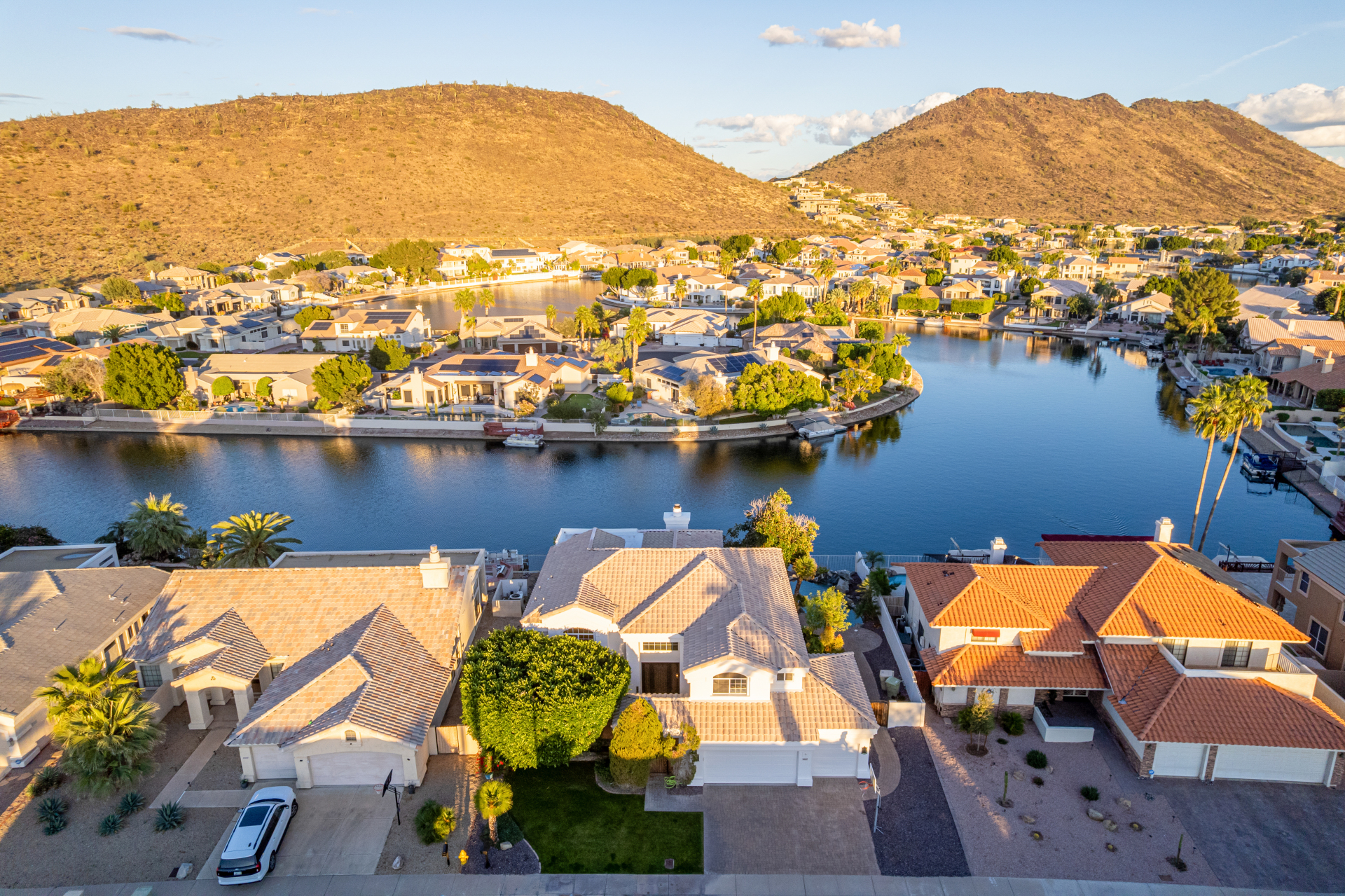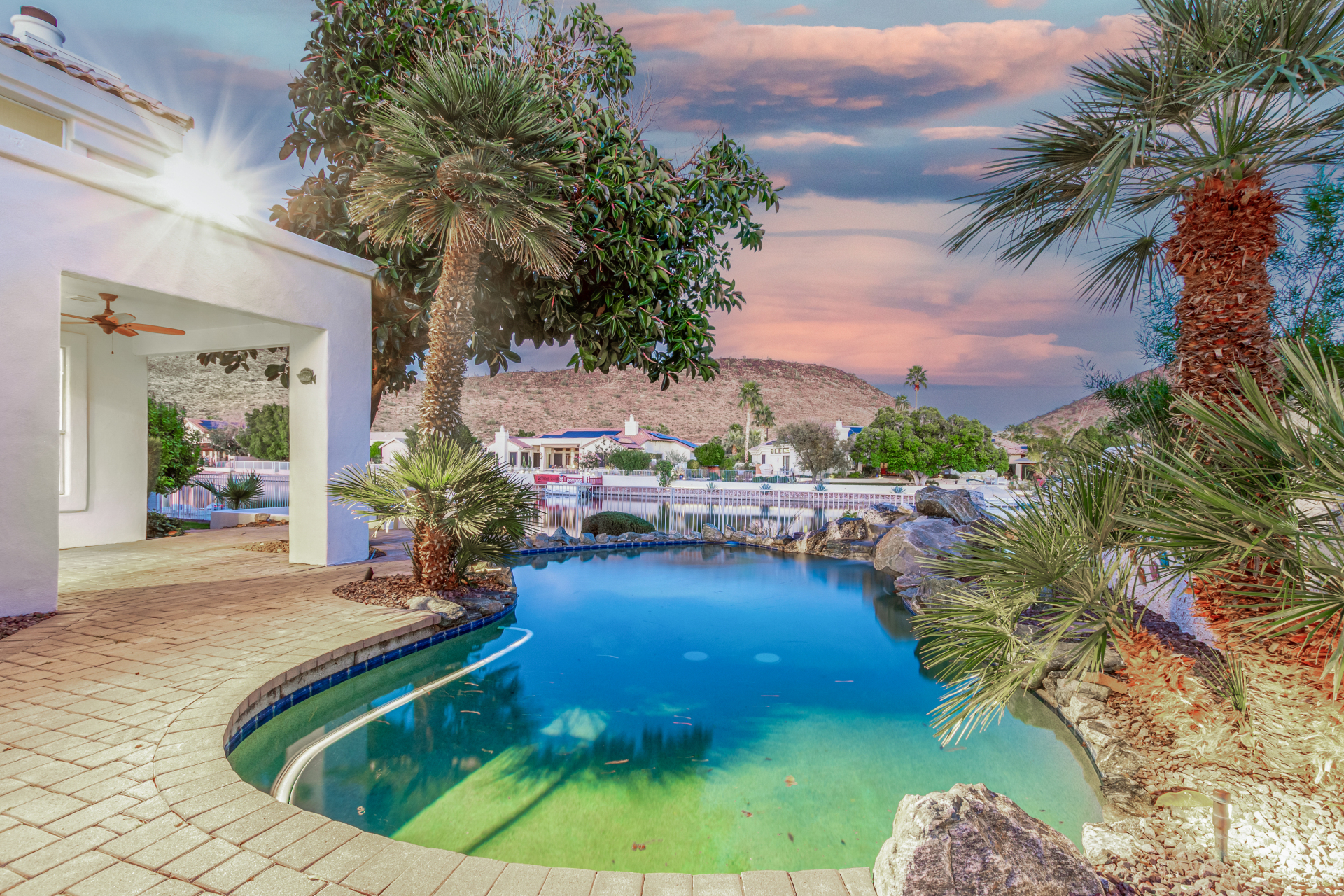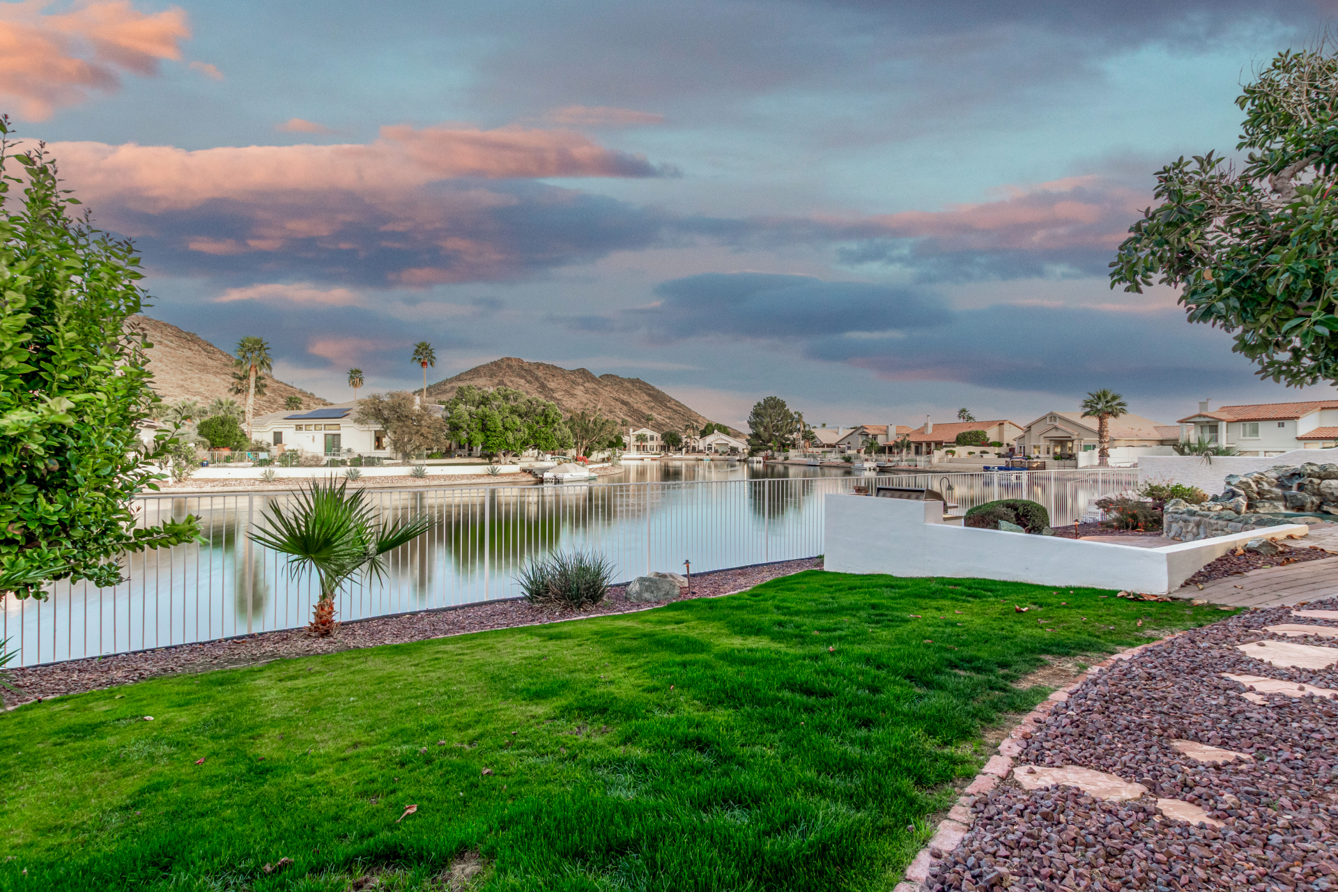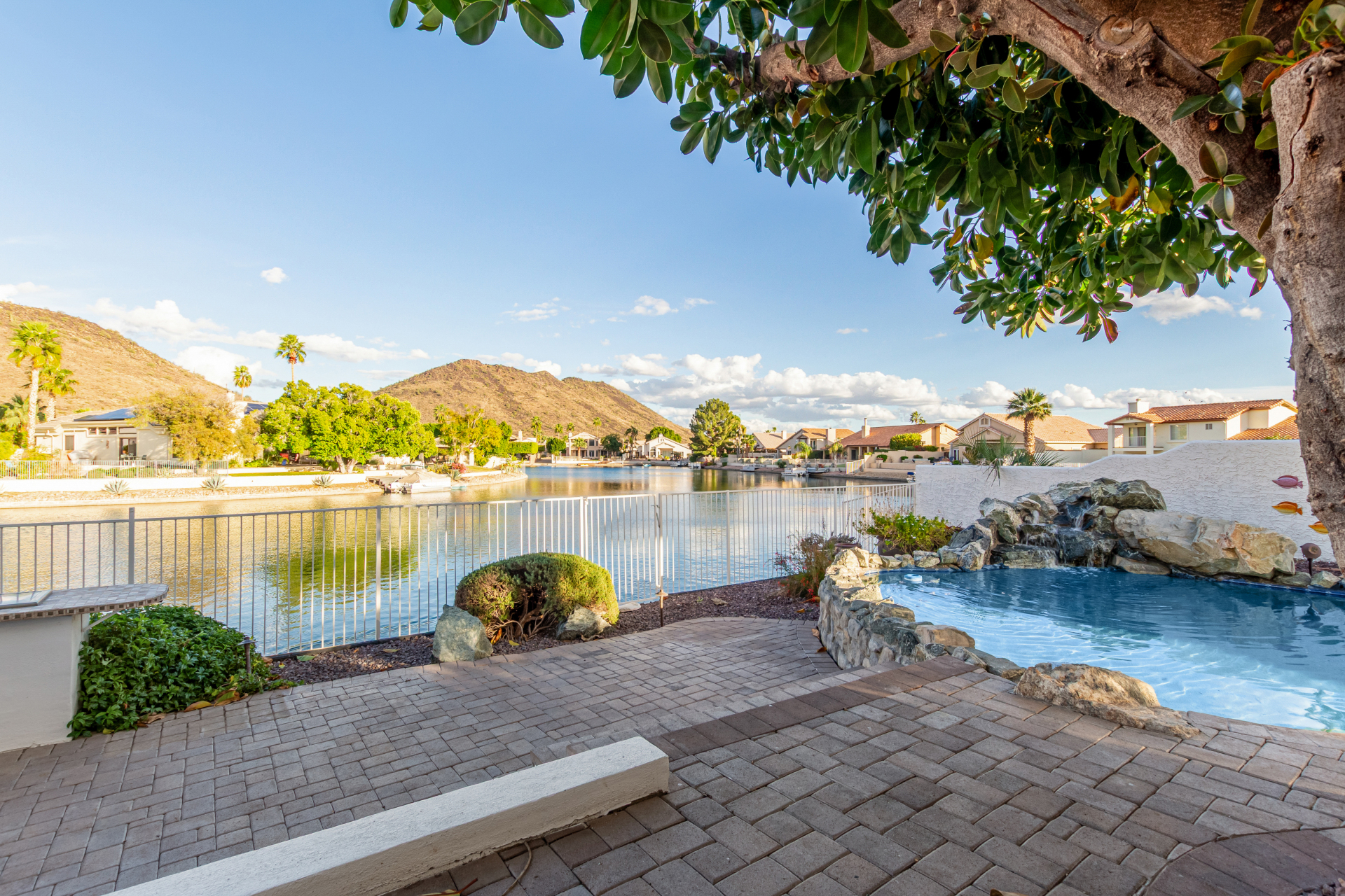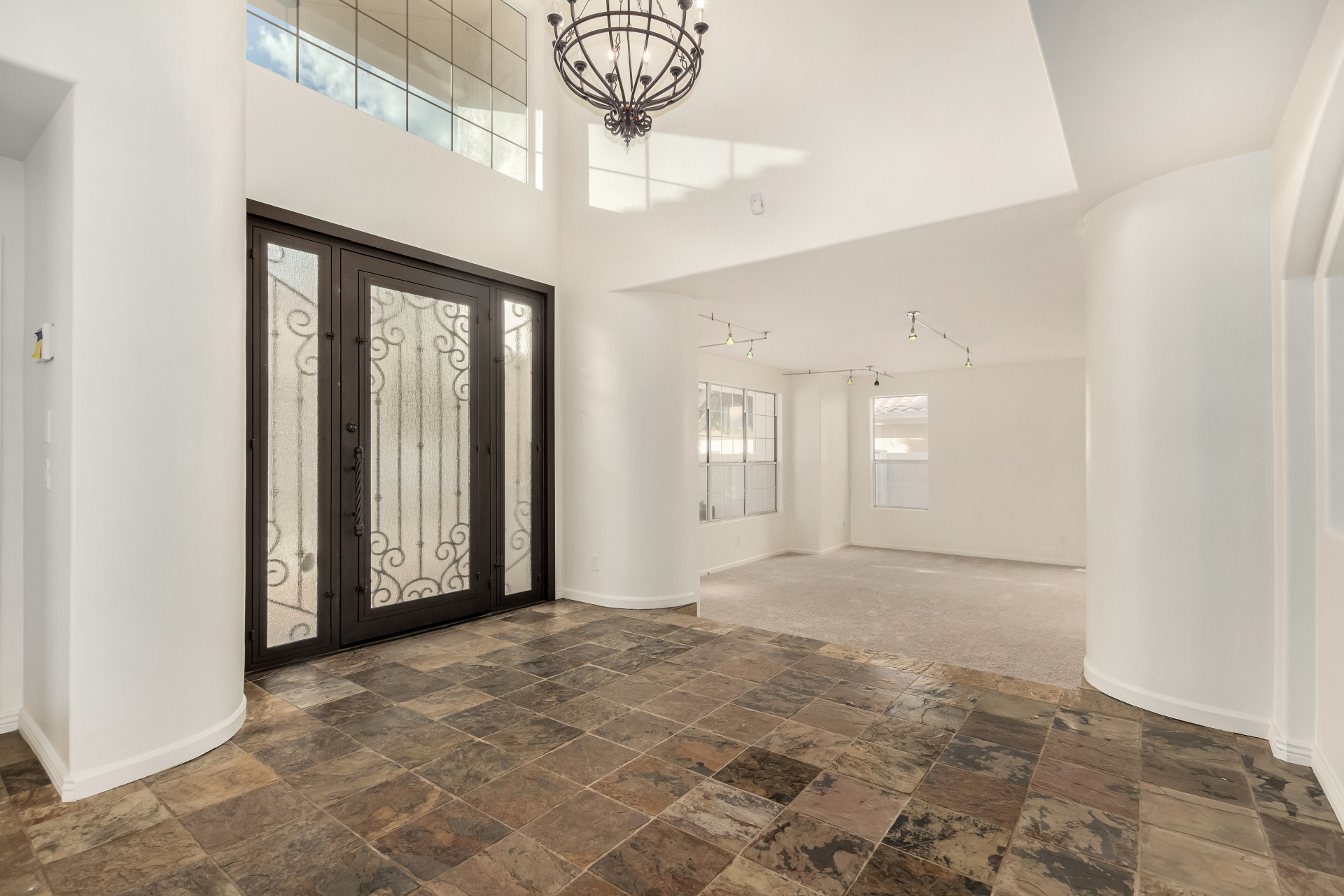 Experience lakeside luxury in the prestigious and highly sought-after Arrowhead Lakes! This impressive 5-bedroom estate captivates from the moment you arrive, boasting lush manicured landscaping, a three-car garage, pavers, and a gated courtyard. Step through the custom iron & glass entry door to be greeted by pure sophistication and timeless design. The grand foyer features a soaring ceiling, a striking chandelier, and exquisite stone flooring. The spacious living room, adorned with track lighting and plush carpeting, is perfect for welcoming guests, while the formal dining room offers sleek wood flooring for stylish entertaining. The expansive family room dazzles with double-height ceilings and a cozy fireplace, creating a warm & inviting atmosphere.