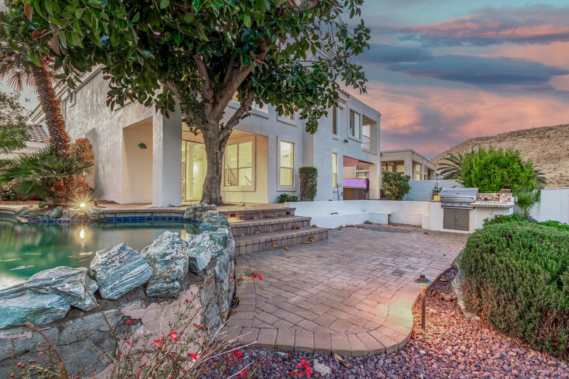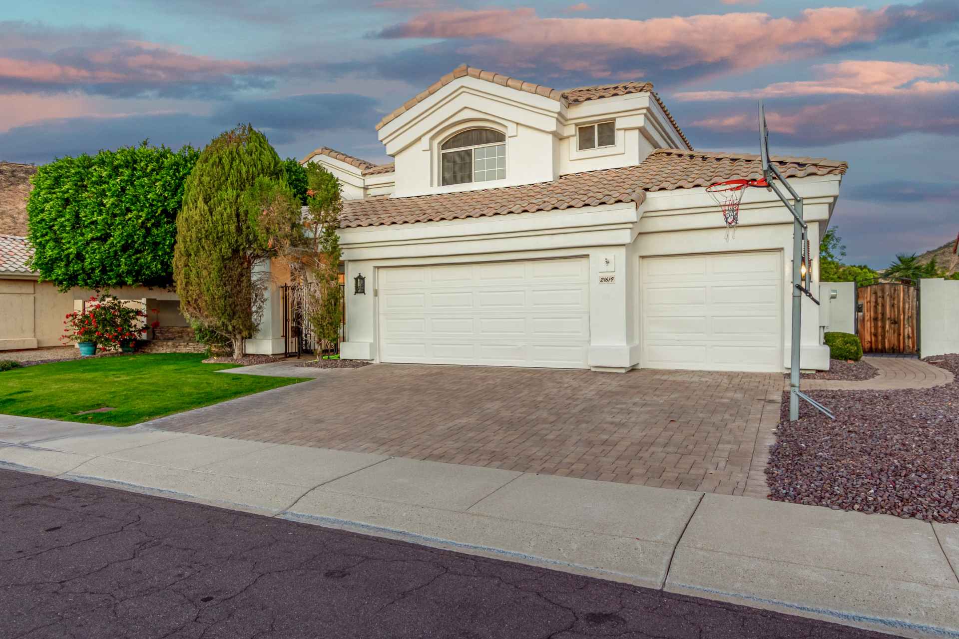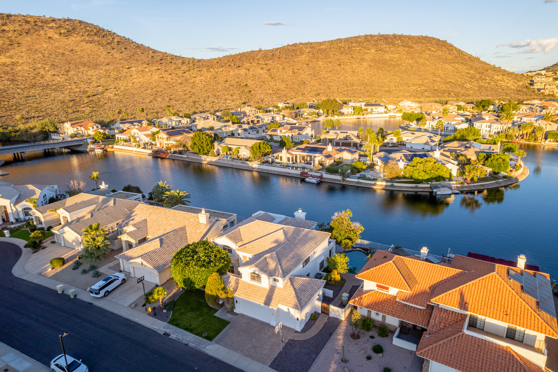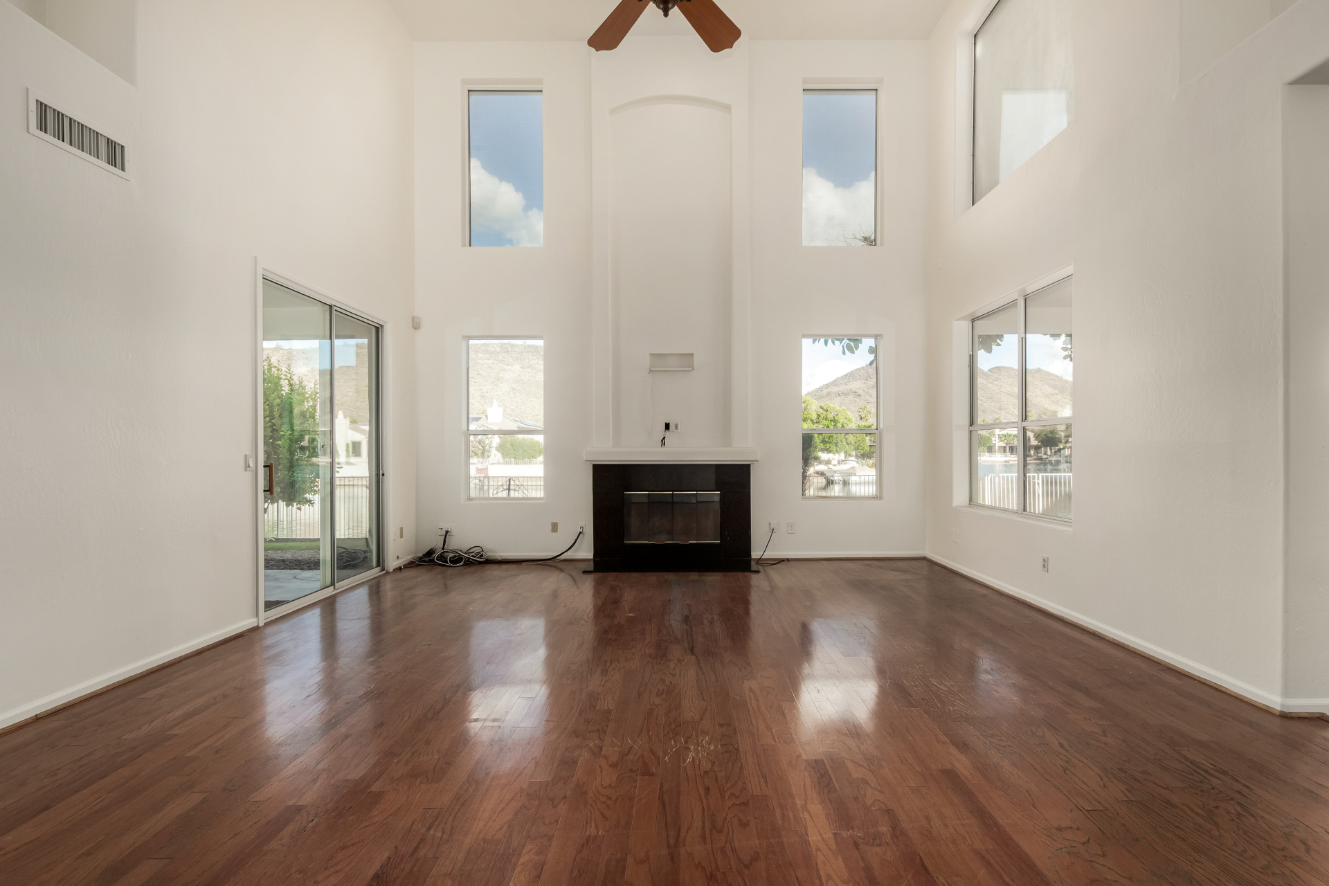 Experience lakeside luxury in the prestigious and highly sought-after Arrowhead Lakes! This impressive 5-bedroom estate captivates from the moment you arrive, boasting lush manicured landscaping, a three-car garage, pavers, and a gated courtyard. Step through the custom iron & glass entry door to be greeted by pure sophistication and timeless design. The grand foyer features a soaring ceiling, a striking chandelier, and exquisite stone flooring. The spacious living room, adorned with track lighting and plush carpeting, is perfect for welcoming guests, while the formal dining room offers sleek wood flooring for stylish entertaining. The expansive family room dazzles with double-height ceilings and a cozy fireplace, creating a warm & inviting atmosphere.