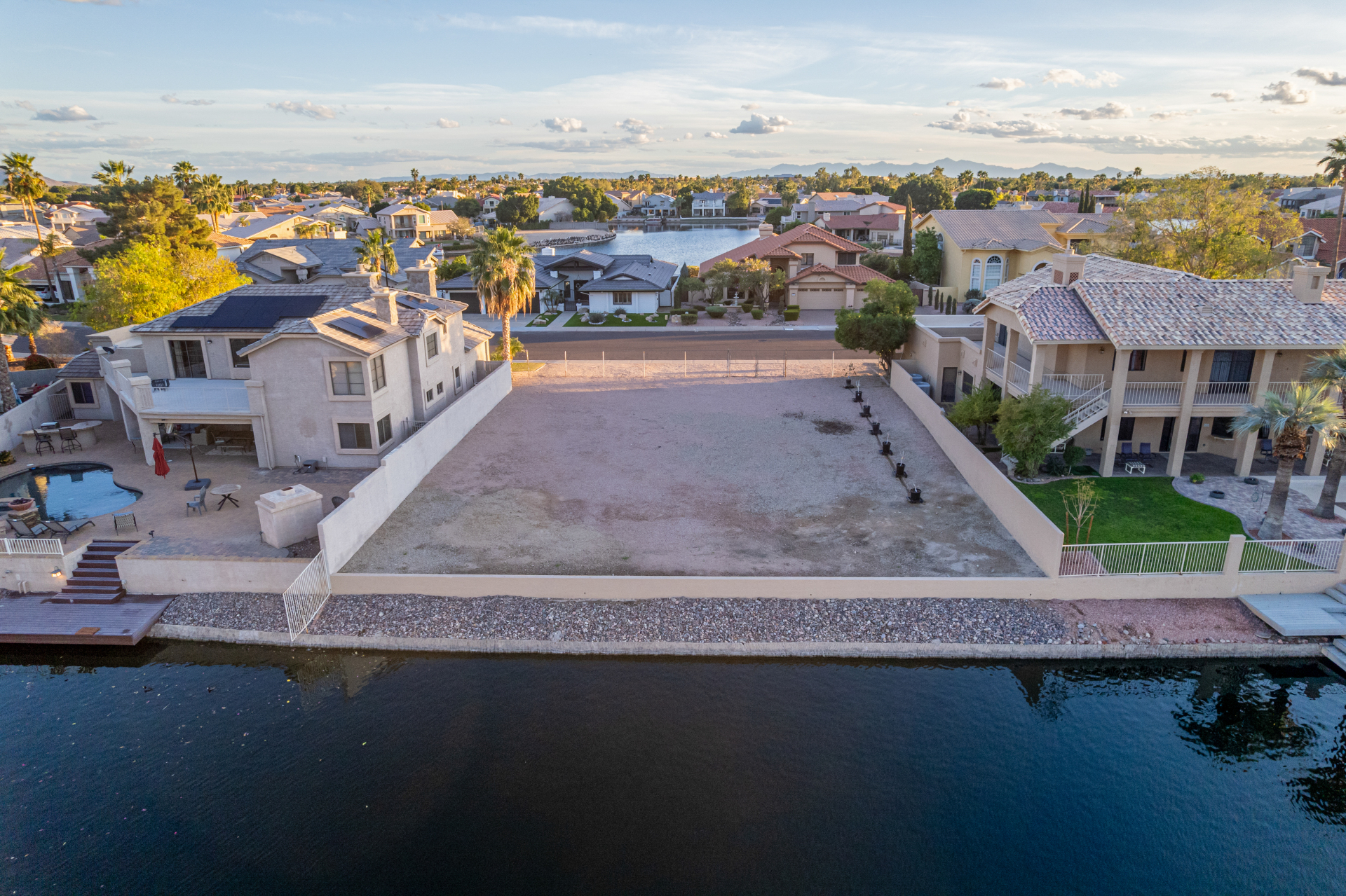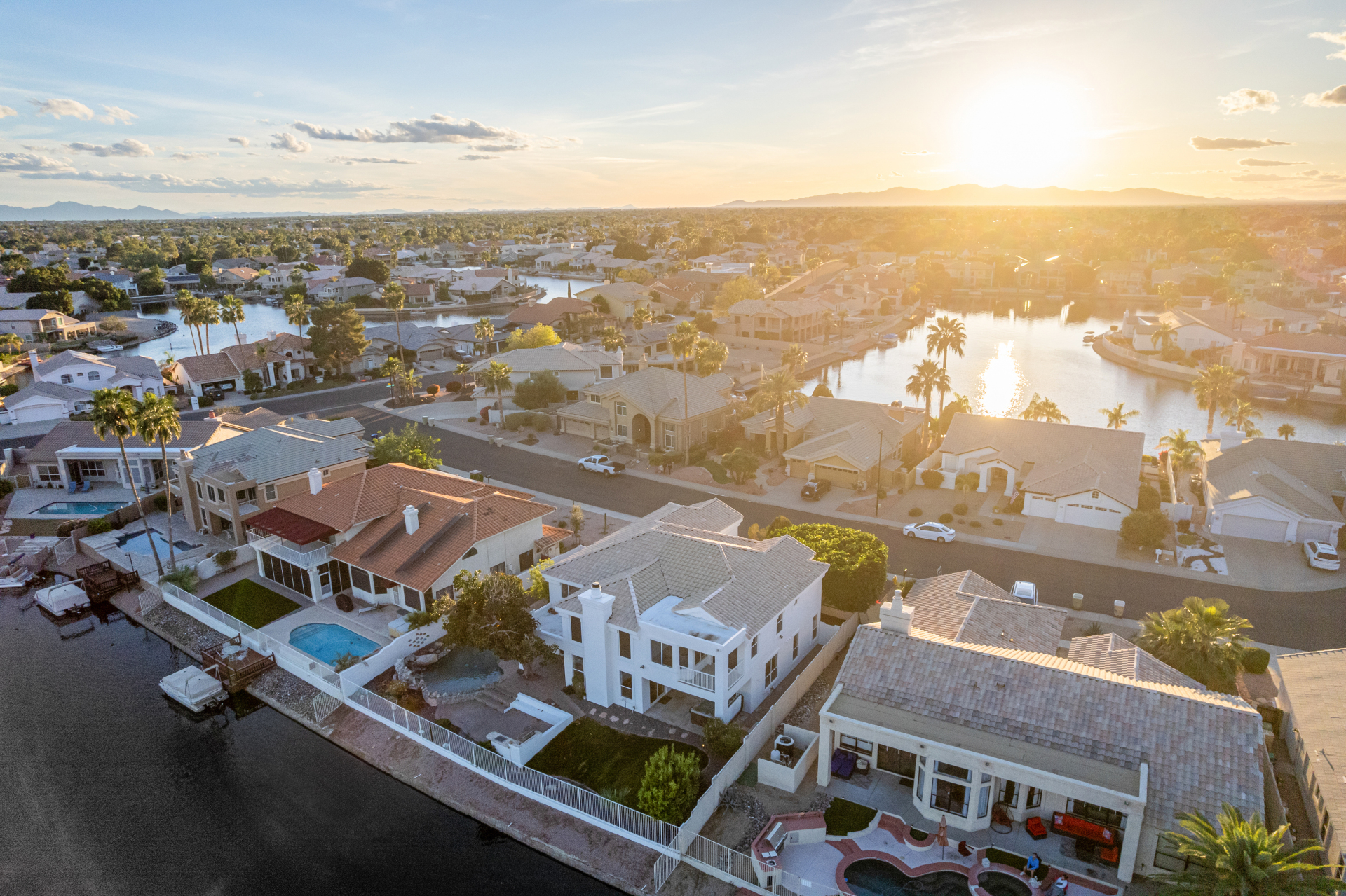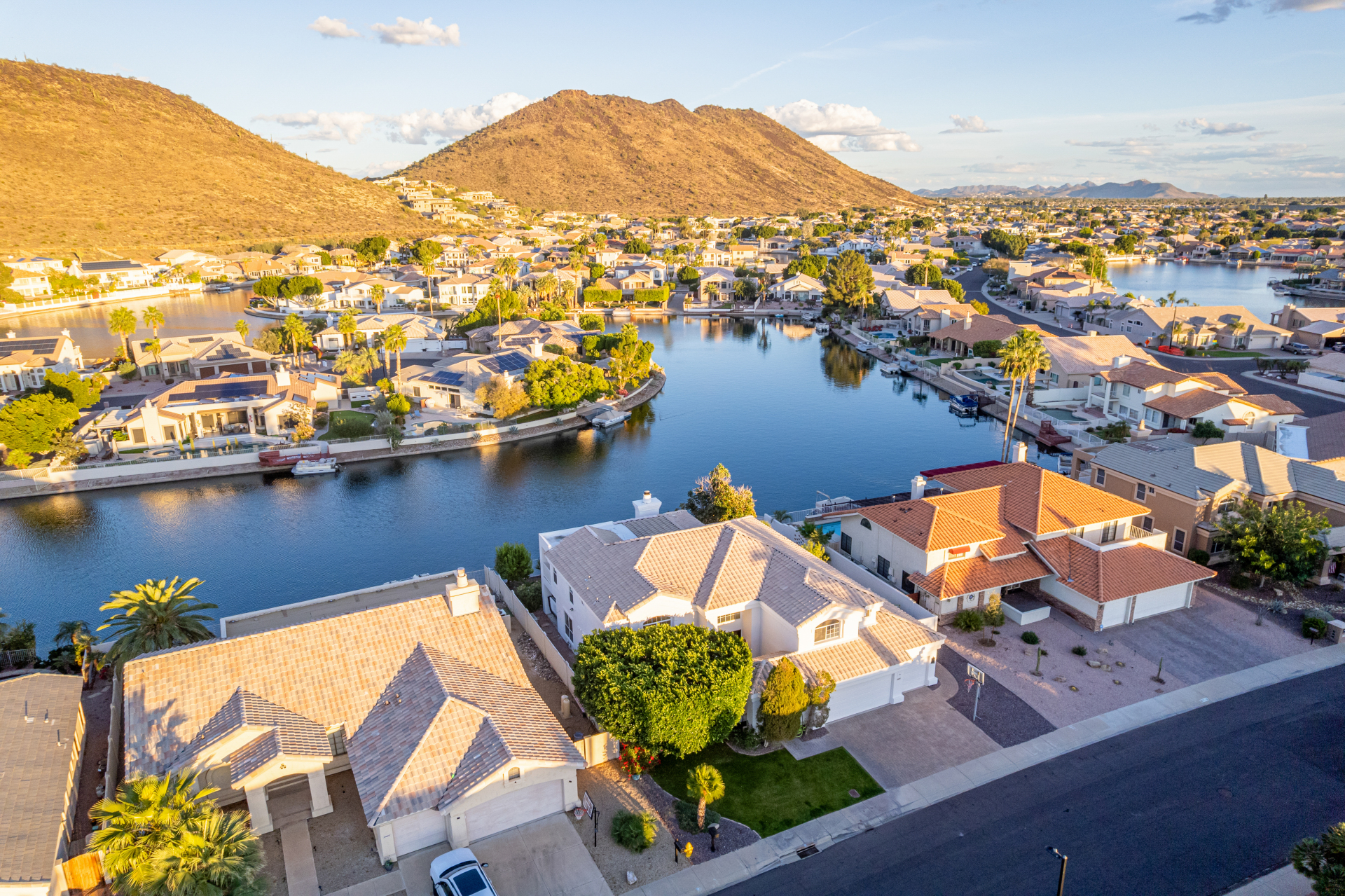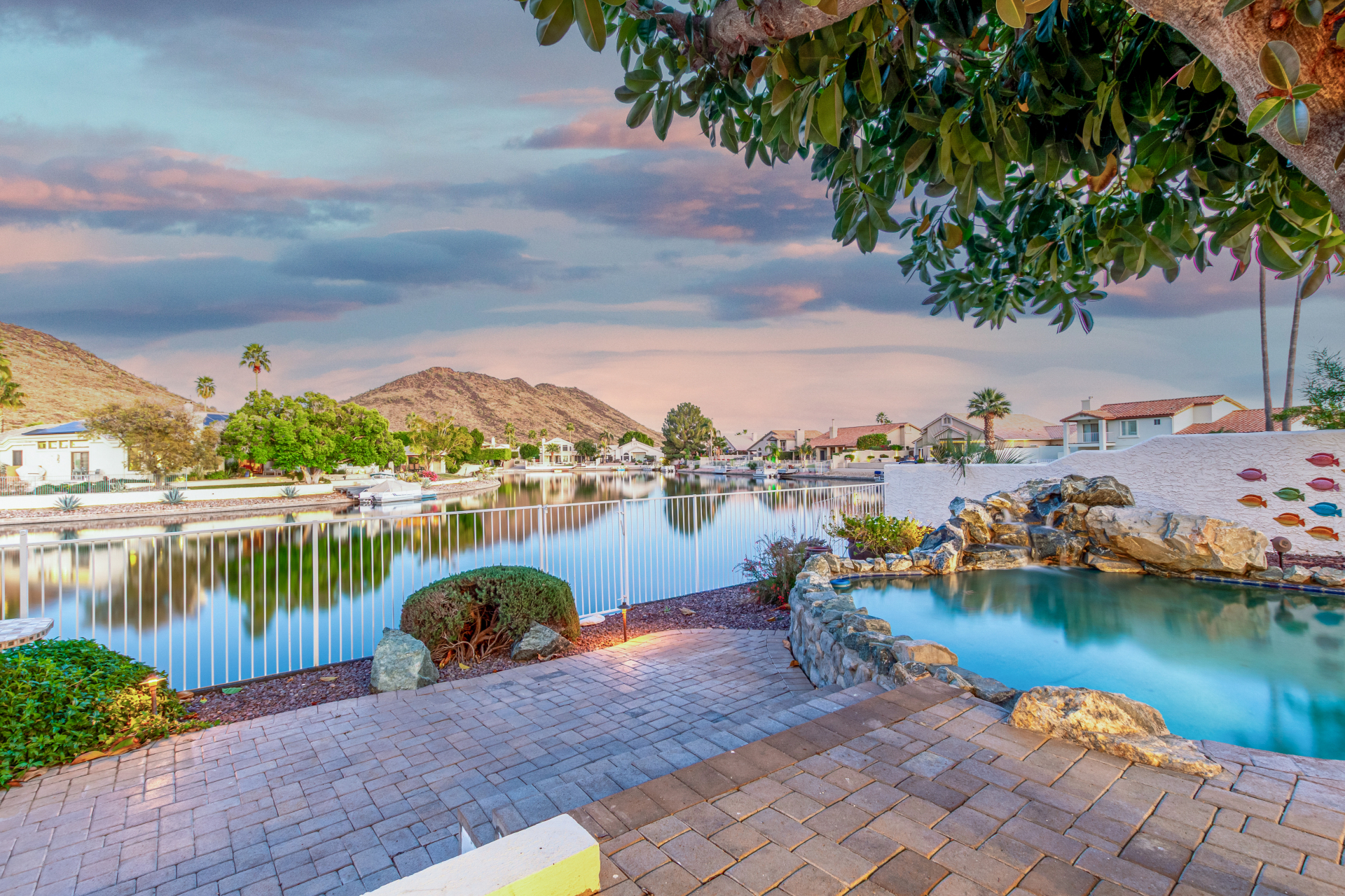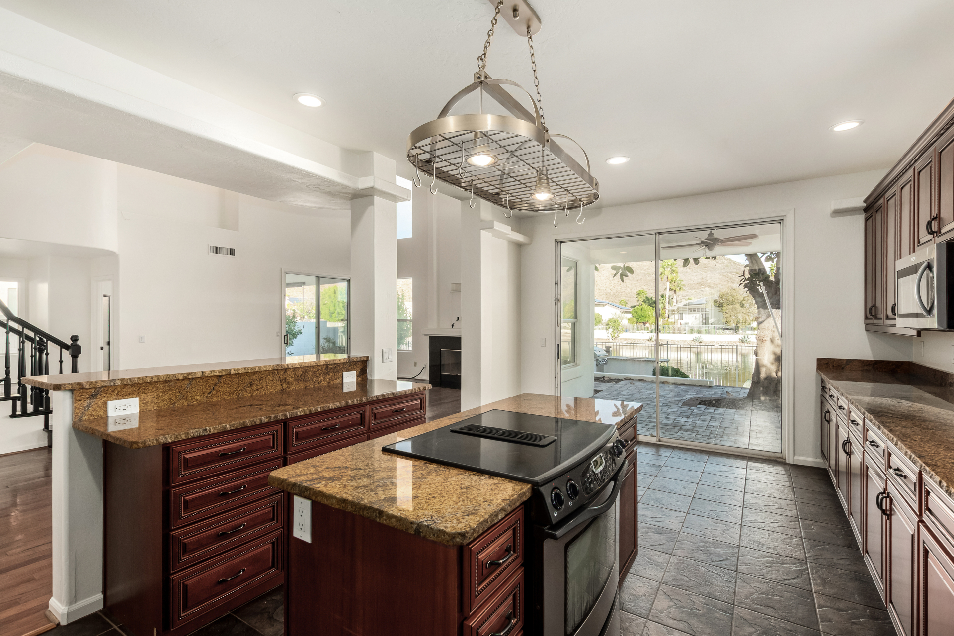 Experience lakeside luxury in the prestigious and highly sought-after Arrowhead Lakes! This impressive 5-bedroom estate captivates from the moment you arrive, boasting lush manicured landscaping, a three-car garage, pavers, and a gated courtyard. Step through the custom iron & glass entry door to be greeted by pure sophistication and timeless design. The grand foyer features a soaring ceiling, a striking chandelier, and exquisite stone flooring. The spacious living room, adorned with track lighting and plush carpeting, is perfect for welcoming guests, while the formal dining room offers sleek wood flooring for stylish entertaining. The expansive family room dazzles with double-height ceilings and a cozy fireplace, creating a warm & inviting atmosphere.