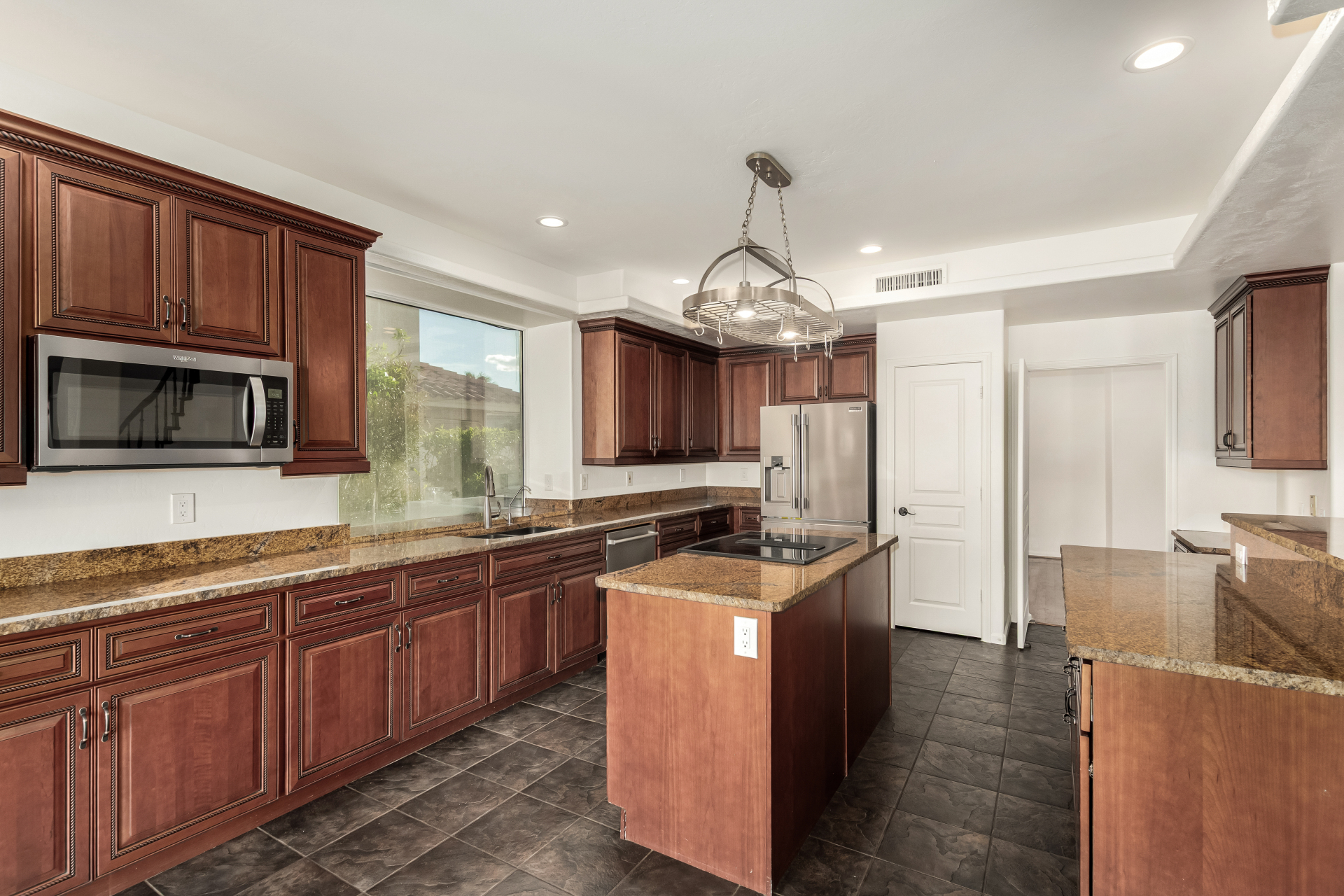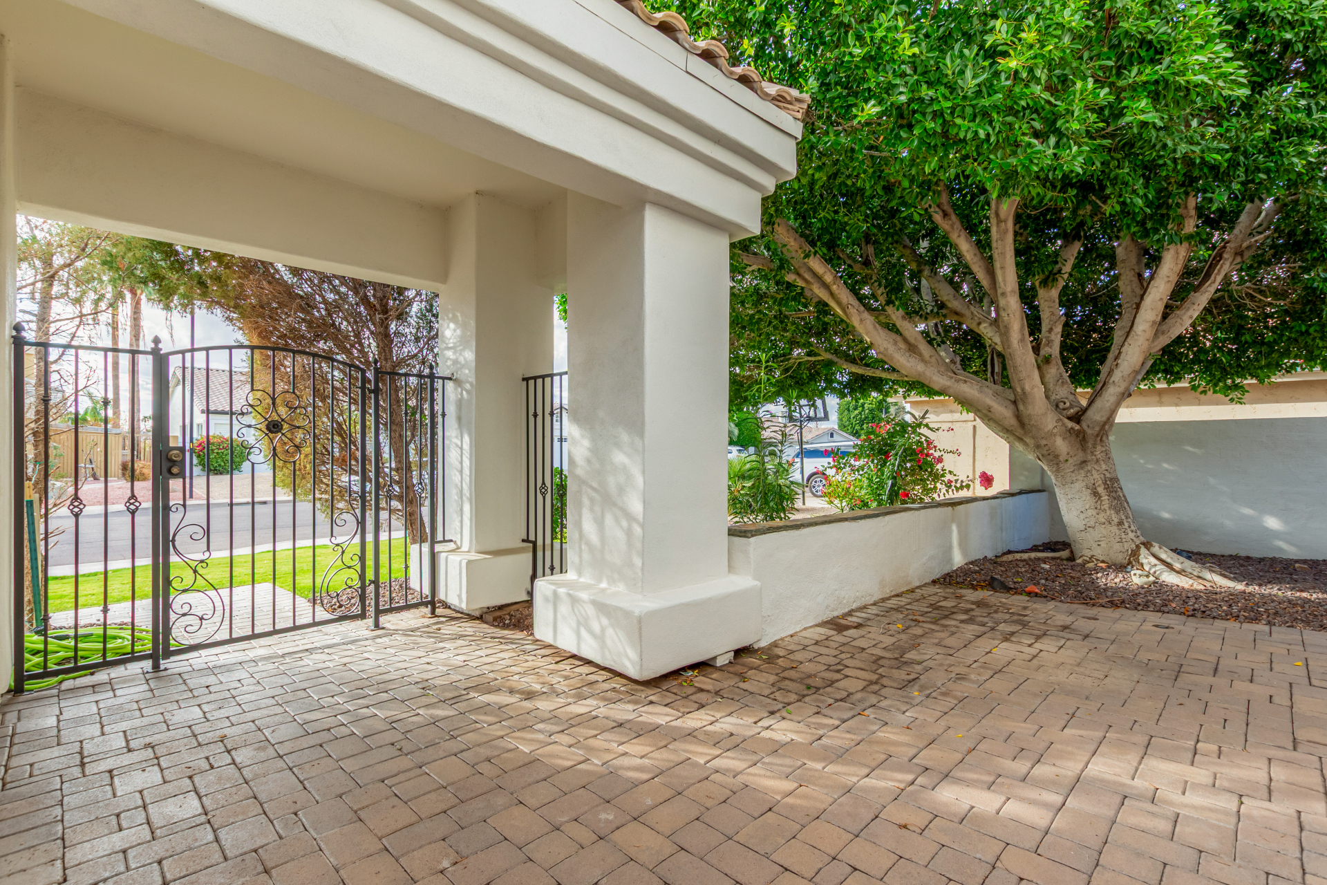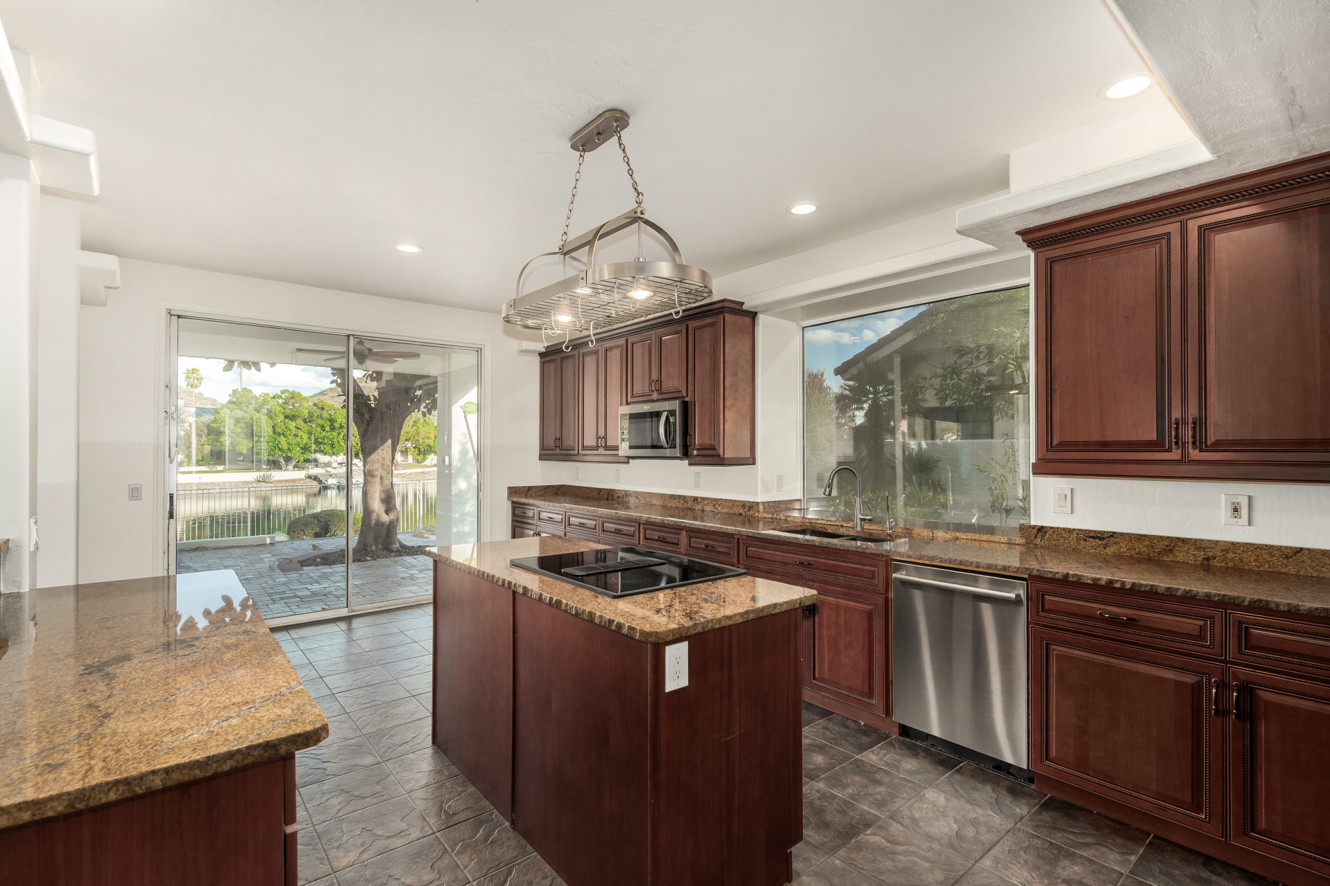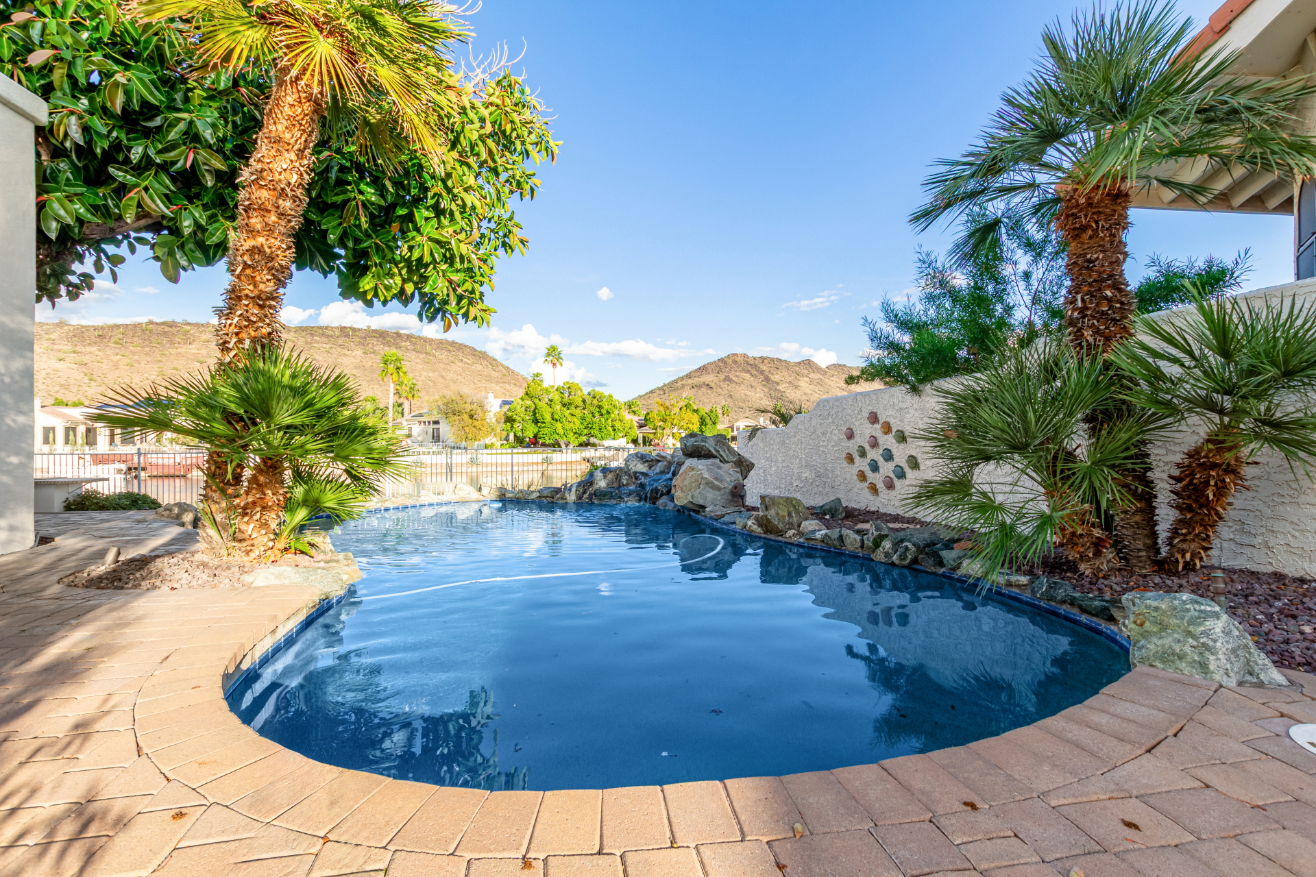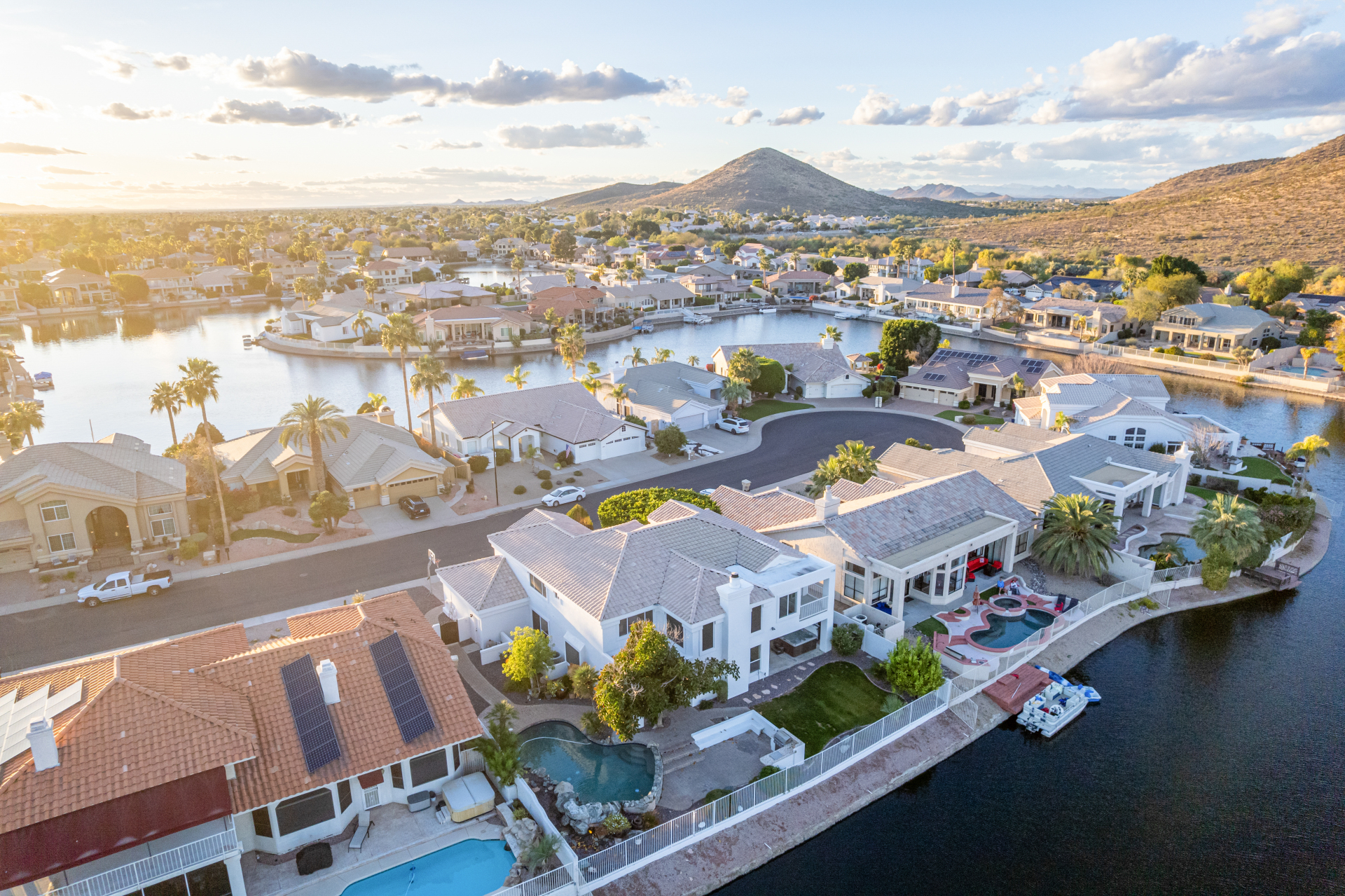 Experience lakeside luxury in the prestigious and highly sought-after Arrowhead Lakes! This impressive 5-bedroom estate captivates from the moment you arrive, boasting lush manicured landscaping, a three-car garage, pavers, and a gated courtyard. Step through the custom iron & glass entry door to be greeted by pure sophistication and timeless design. The grand foyer features a soaring ceiling, a striking chandelier, and exquisite stone flooring. The spacious living room, adorned with track lighting and plush carpeting, is perfect for welcoming guests, while the formal dining room offers sleek wood flooring for stylish entertaining. The expansive family room dazzles with double-height ceilings and a cozy fireplace, creating a warm & inviting atmosphere.