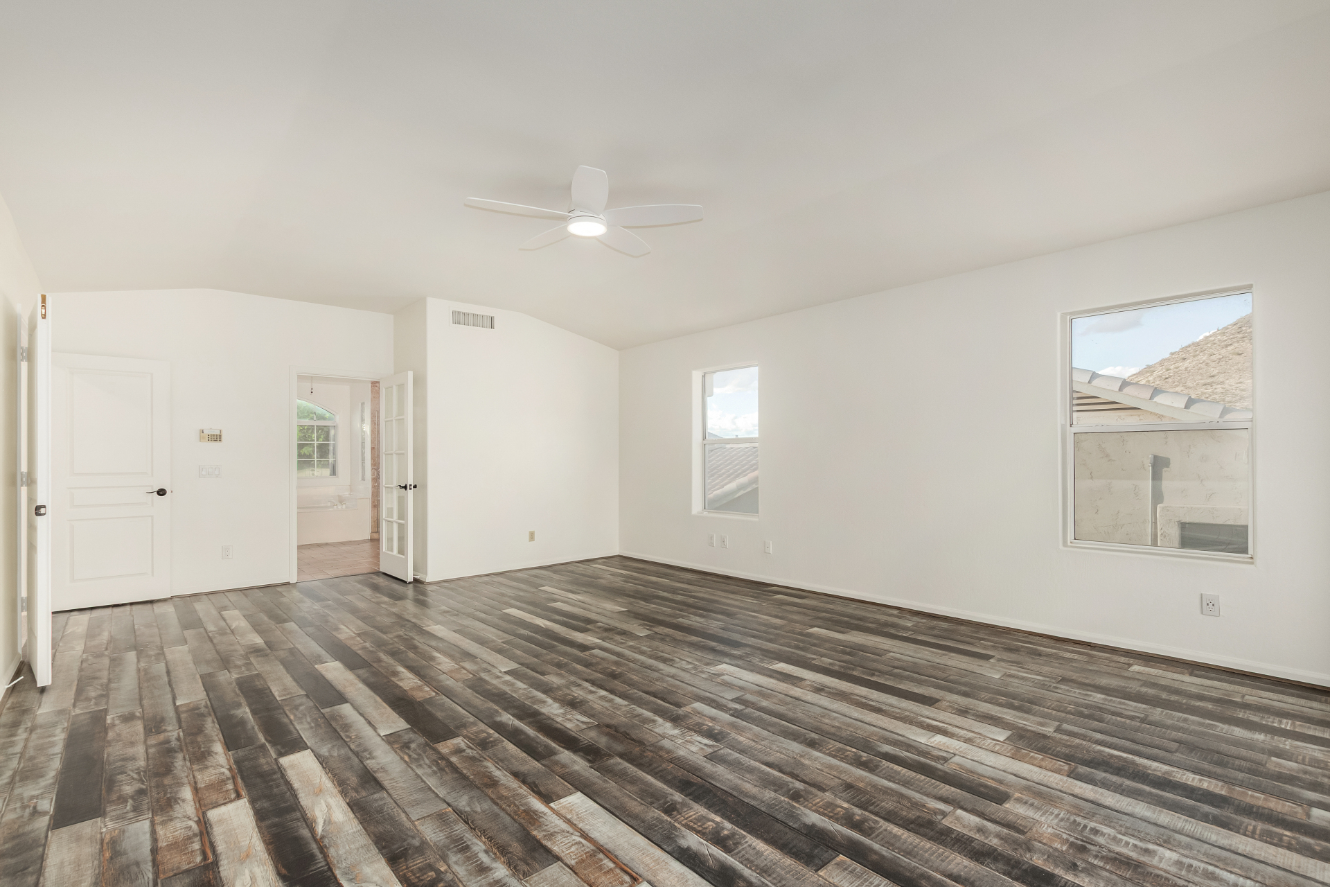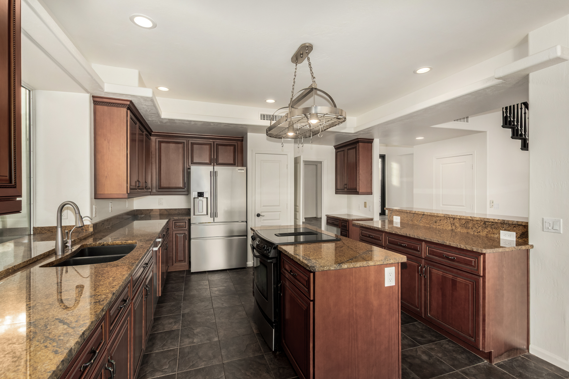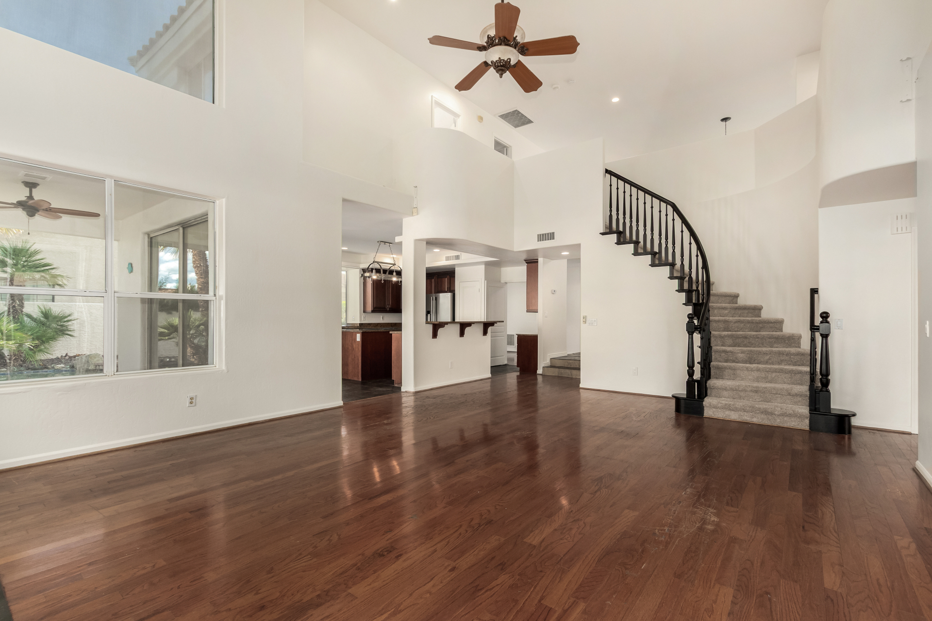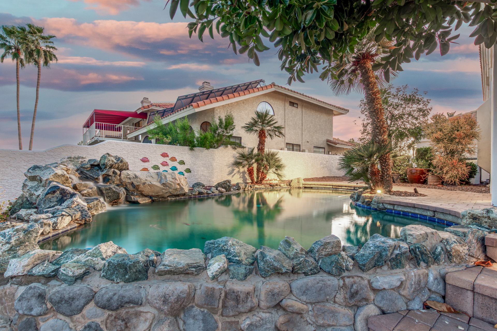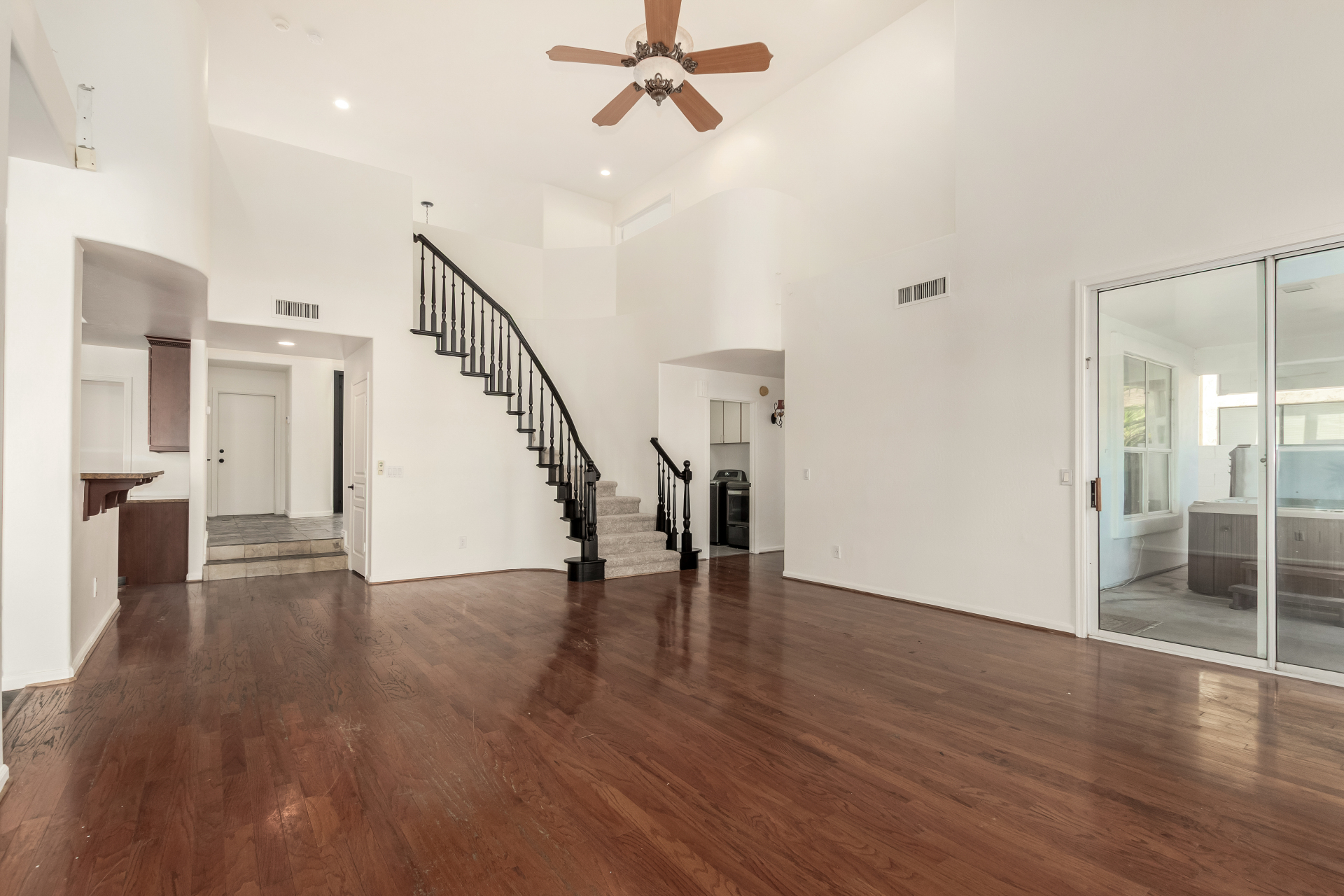 Experience lakeside luxury in the prestigious and highly sought-after Arrowhead Lakes! This impressive 5-bedroom estate captivates from the moment you arrive, boasting lush manicured landscaping, a three-car garage, pavers, and a gated courtyard. Step through the custom iron & glass entry door to be greeted by pure sophistication and timeless design. The grand foyer features a soaring ceiling, a striking chandelier, and exquisite stone flooring. The spacious living room, adorned with track lighting and plush carpeting, is perfect for welcoming guests, while the formal dining room offers sleek wood flooring for stylish entertaining. The expansive family room dazzles with double-height ceilings and a cozy fireplace, creating a warm & inviting atmosphere.