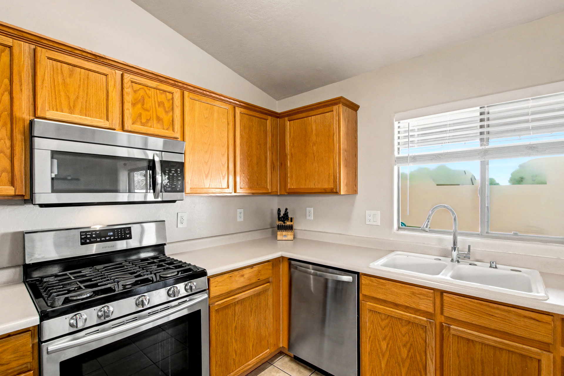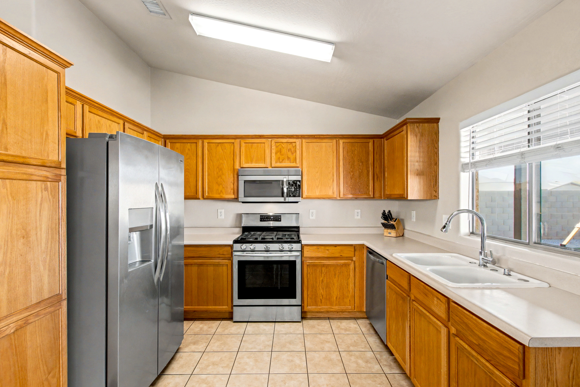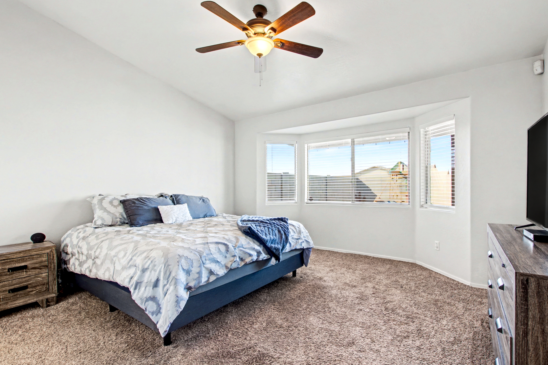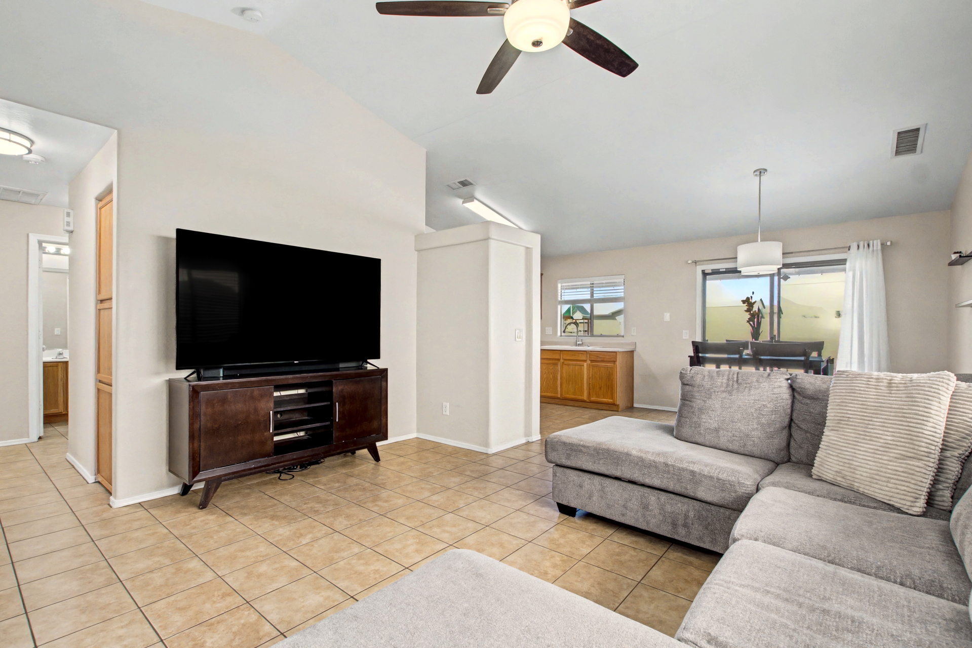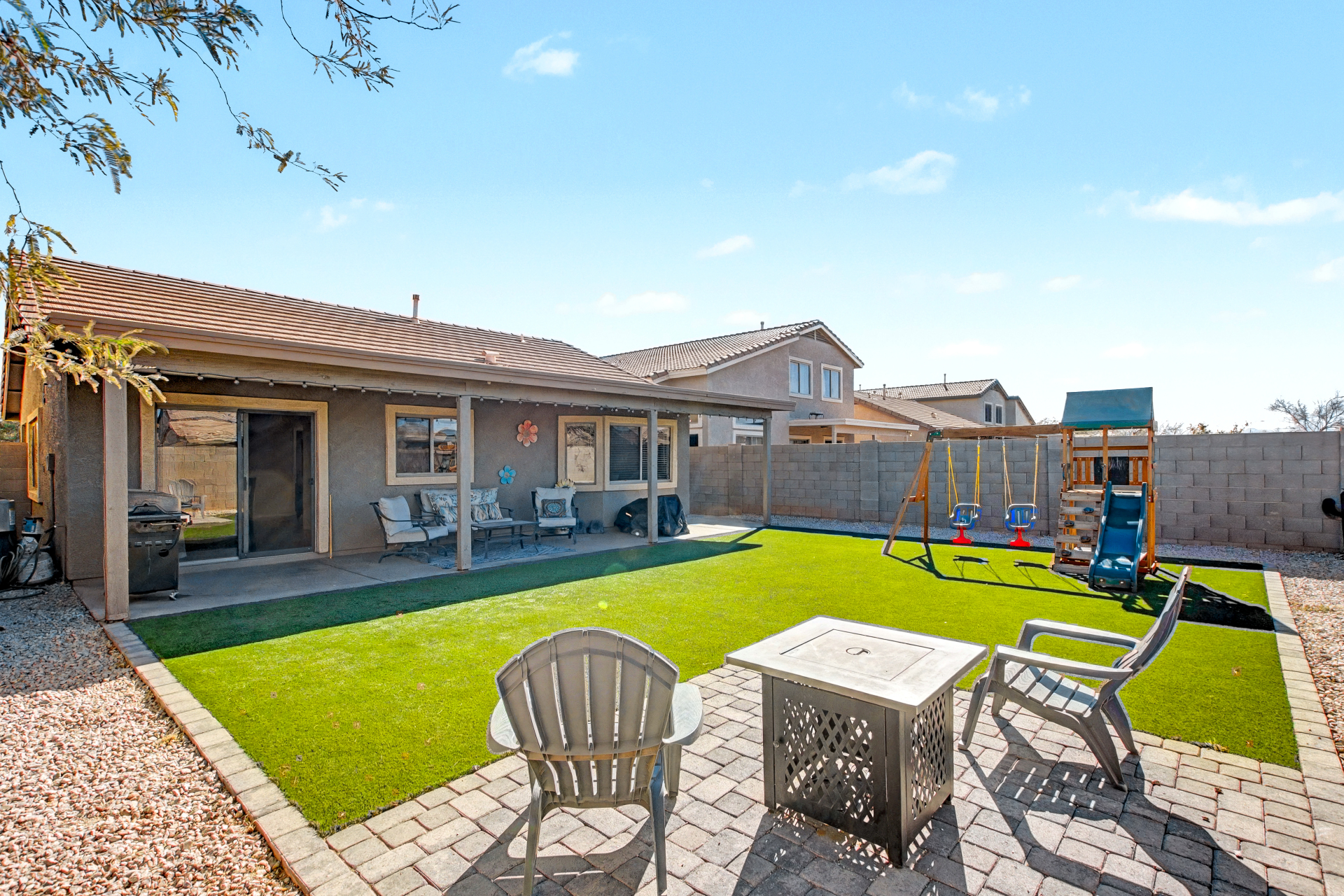 Welcome to this charming single-level home in River Walk Villages! Offering 3 beds, 2 baths, a 2-car garage, and a low-care landscape. Discover an inviting interior that showcases abundant natural light, a neutral palette, tile flooring in common areas, plush carpet in bedrooms, and vaulted ceilings that add to the airy feel. The seamlessly flowing living & dining room is paired with sliding doors to the back. The kitchen boasts SS appliances w/gas range and ample wood cabinetry w/crown molding. Enter the primary bedroom to find a bay window, a walk-in closet, and a full bathroom for added comfort. If you want to relax or have a fun BBQ, the perfectly sized backyard awaits! A full-length covered patio, artificial turf, and well-laid pavers complete the picture. Don't miss this opportunity!