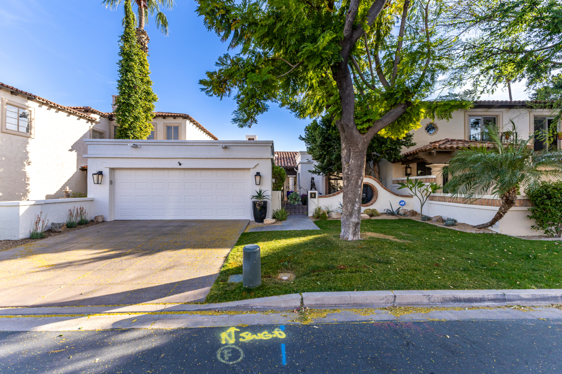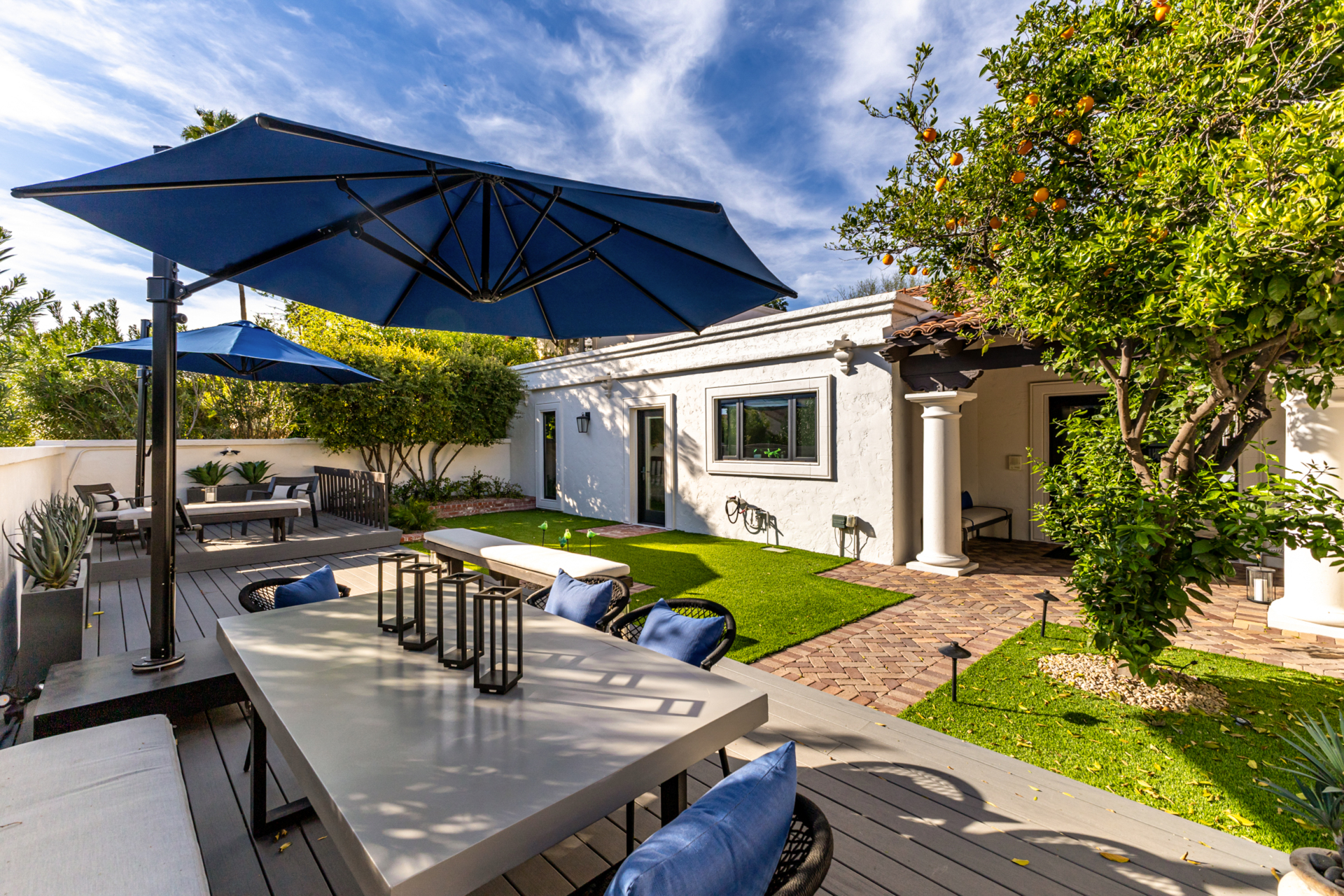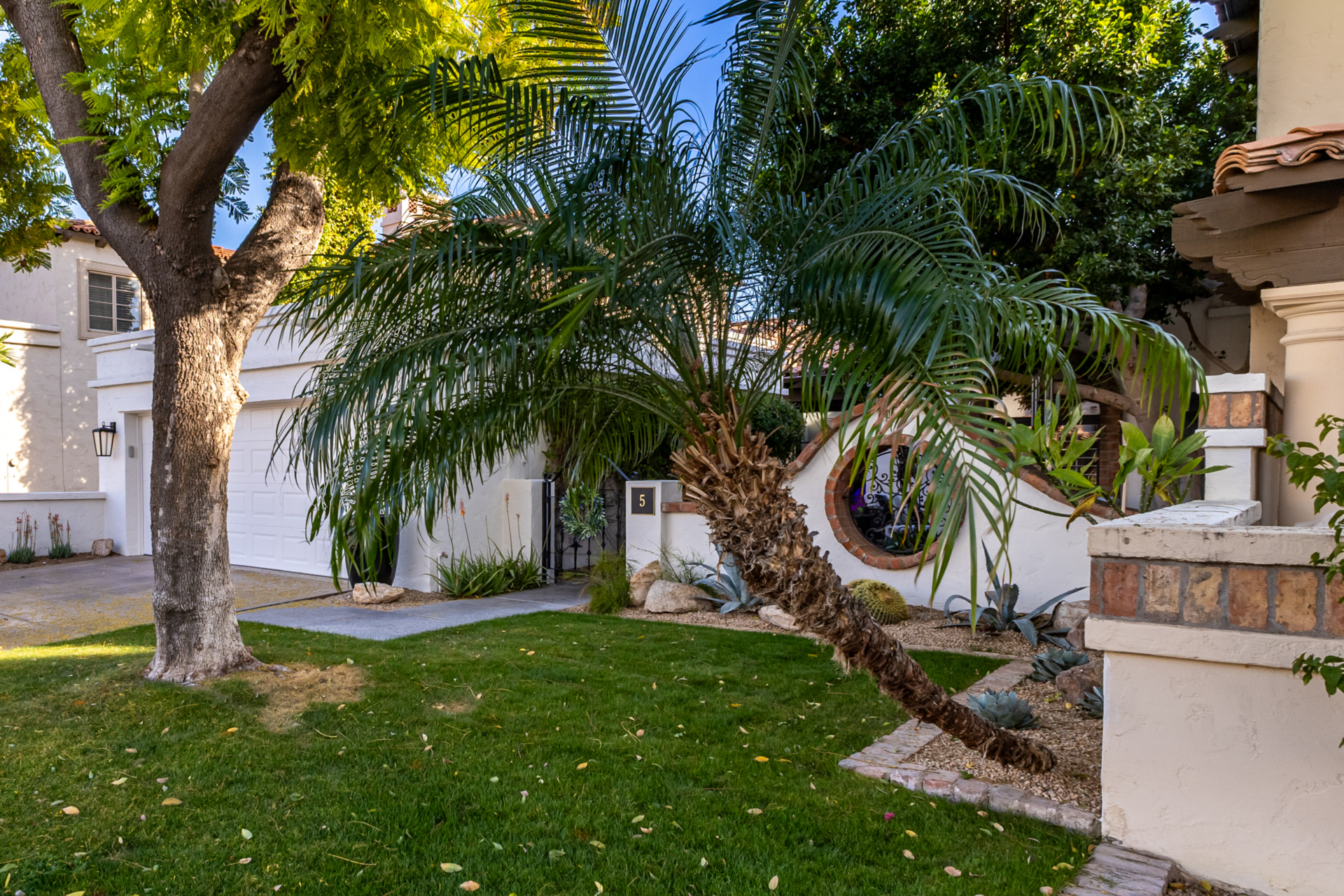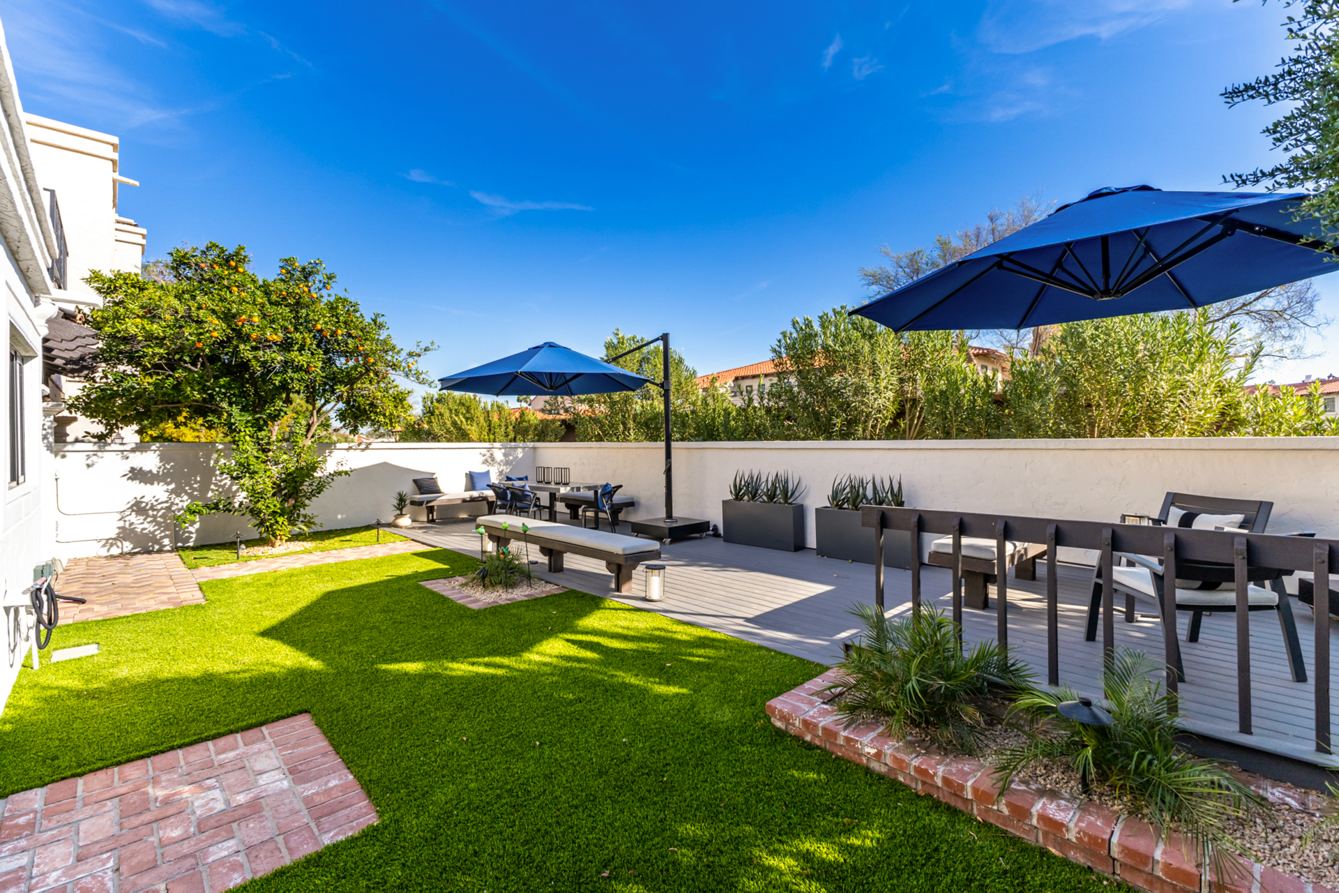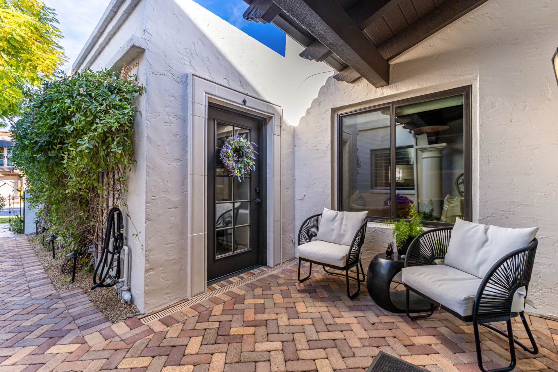 Indulge in refined elegance in this exquisite single-level townhome in the prestigious gated community of Cuernavaca. Offering 2 bedrooms plus a sophisticated den, 2 baths, and a 2-car garage, this home blends timeless design with modern comfort. Wood floors, vaulted ceilings with exposed beams, designer lighting, and a soft neutral palette create an elevated ambiance. The inviting living room features a charming fireplace. The chef-inspired kitchen showcases abundant cabinetry, quartz countertops with matching backsplash, and stainless steel appliances. The serene owner suite offers dual vanities, spa-like shower & custom walk-in closet. Secondary bedroom overlooking custom resort-like backyard complete with multiple sitting areas, lush landscape and syn lawn adds to the beauty.