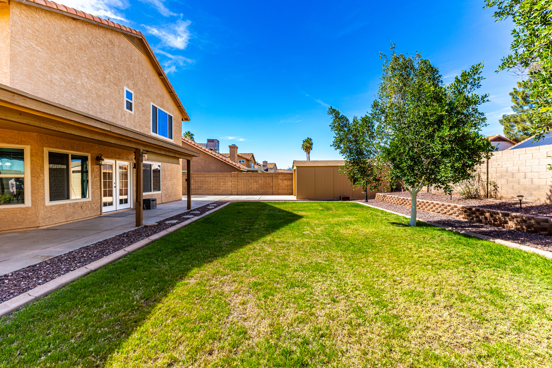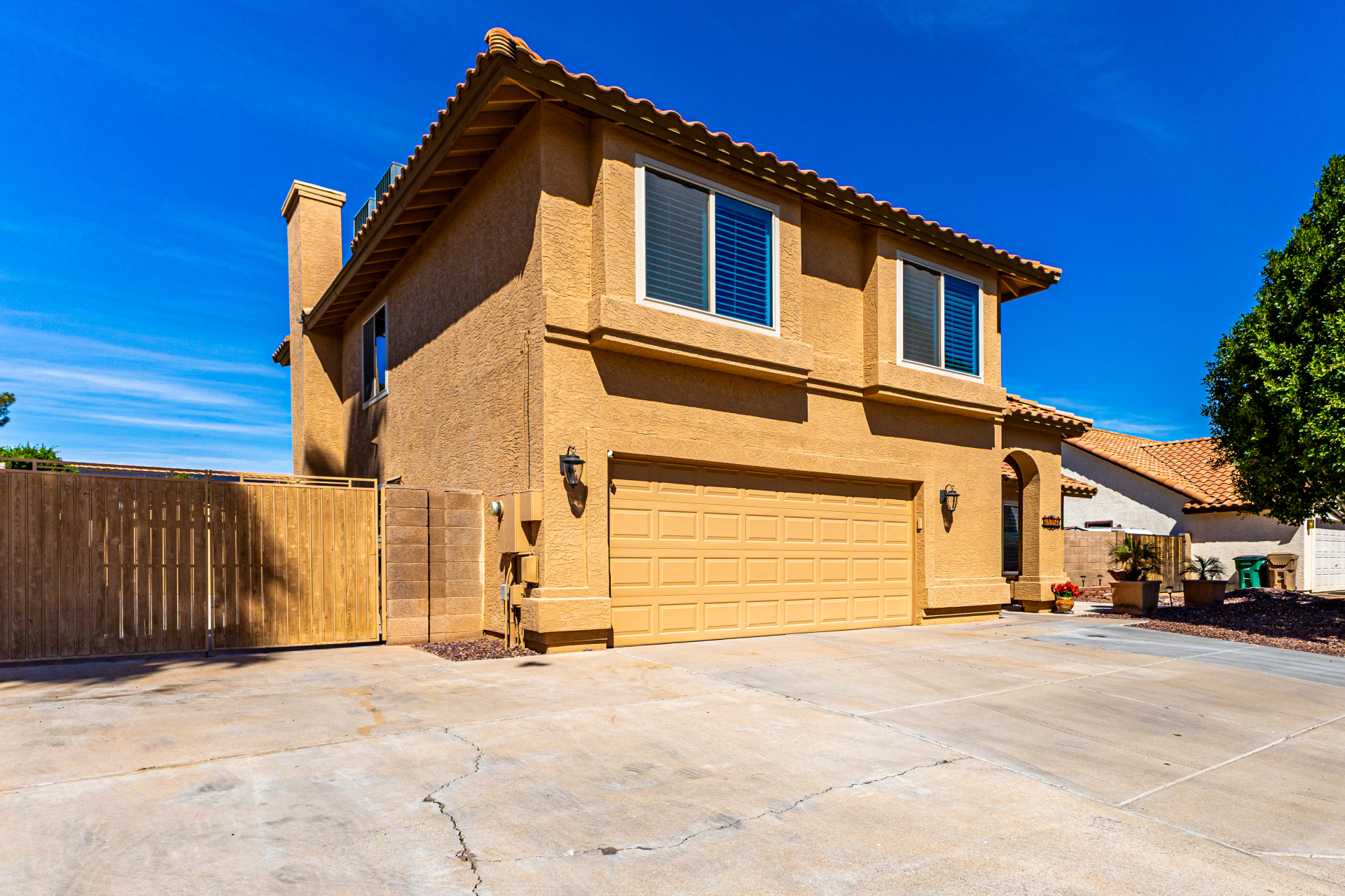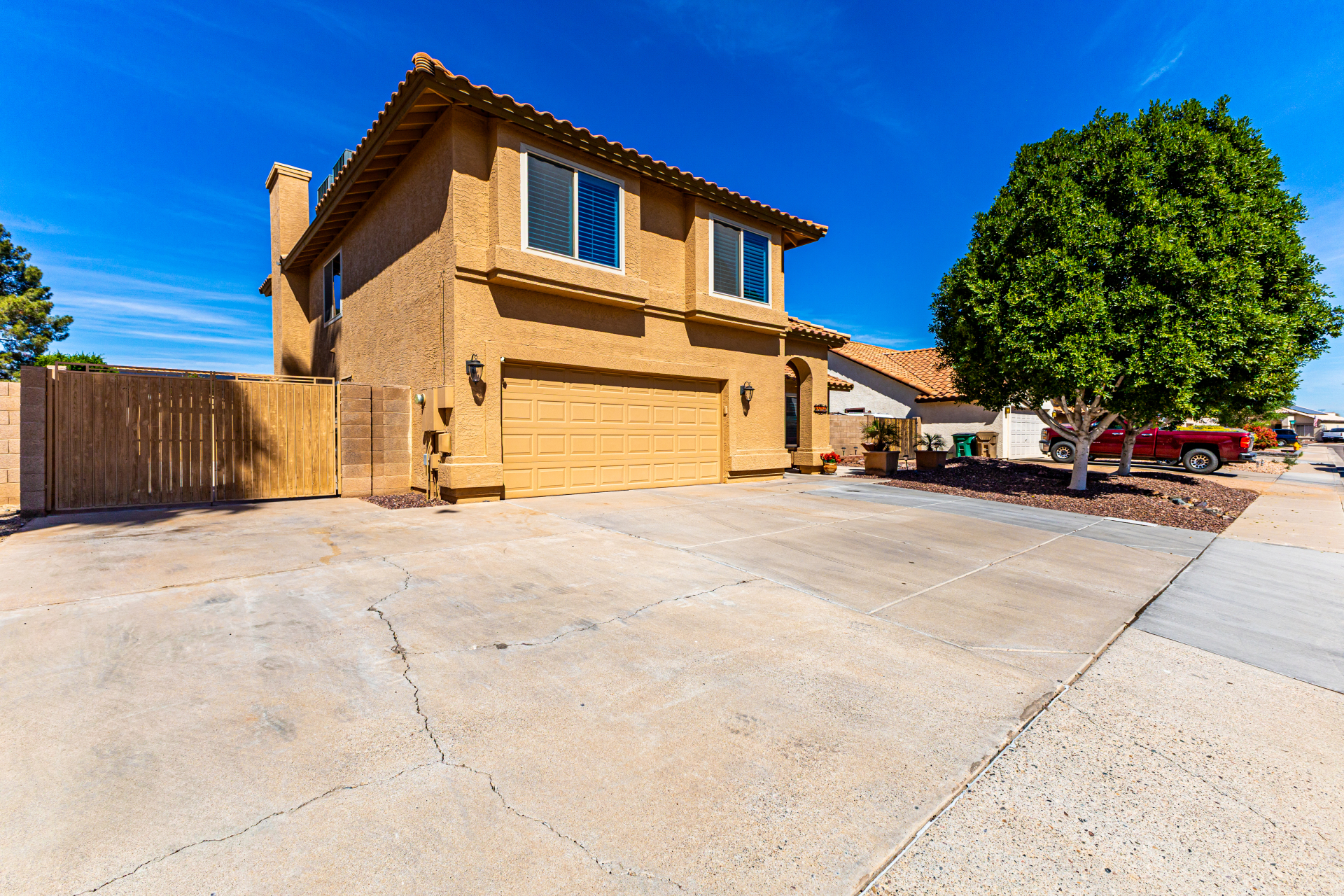 Spacious 4-bedroom, 2.5-bath home offering room to live, work, and store it all! A custom front door welcomes you into soaring vaulted ceilings, formal living and dining areas, and a cozy wood-burning fireplace. All tile downstairs for easy maintenance, with rich wood flooring in the primary suite. The primary and two additional bedrooms feature walk-in closets for generous storage. Enjoy tinted dual-pane nylon frame windows for energy efficiency, plus a newer roof and A/C units (approx. 10 years old). Outside, you'll find a covered patio, grass backyard with landscape lighting, 10' RV gate, extended concrete slab leading to a detached single-car garage, and an extra-wide 2-car garage up front--perfect for toys, tools, or a workshop setup. Solid, functional, and ready for its next chapter.