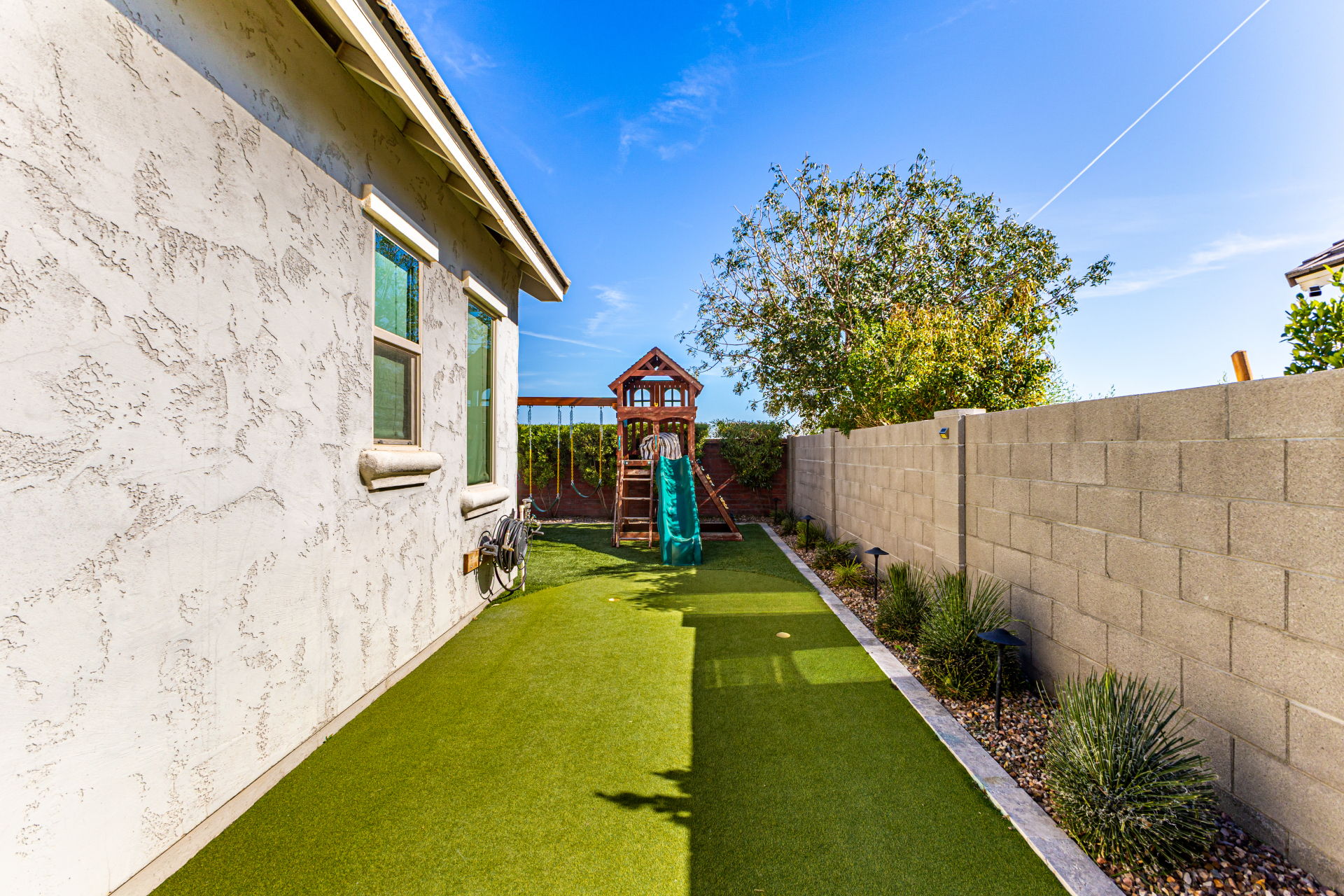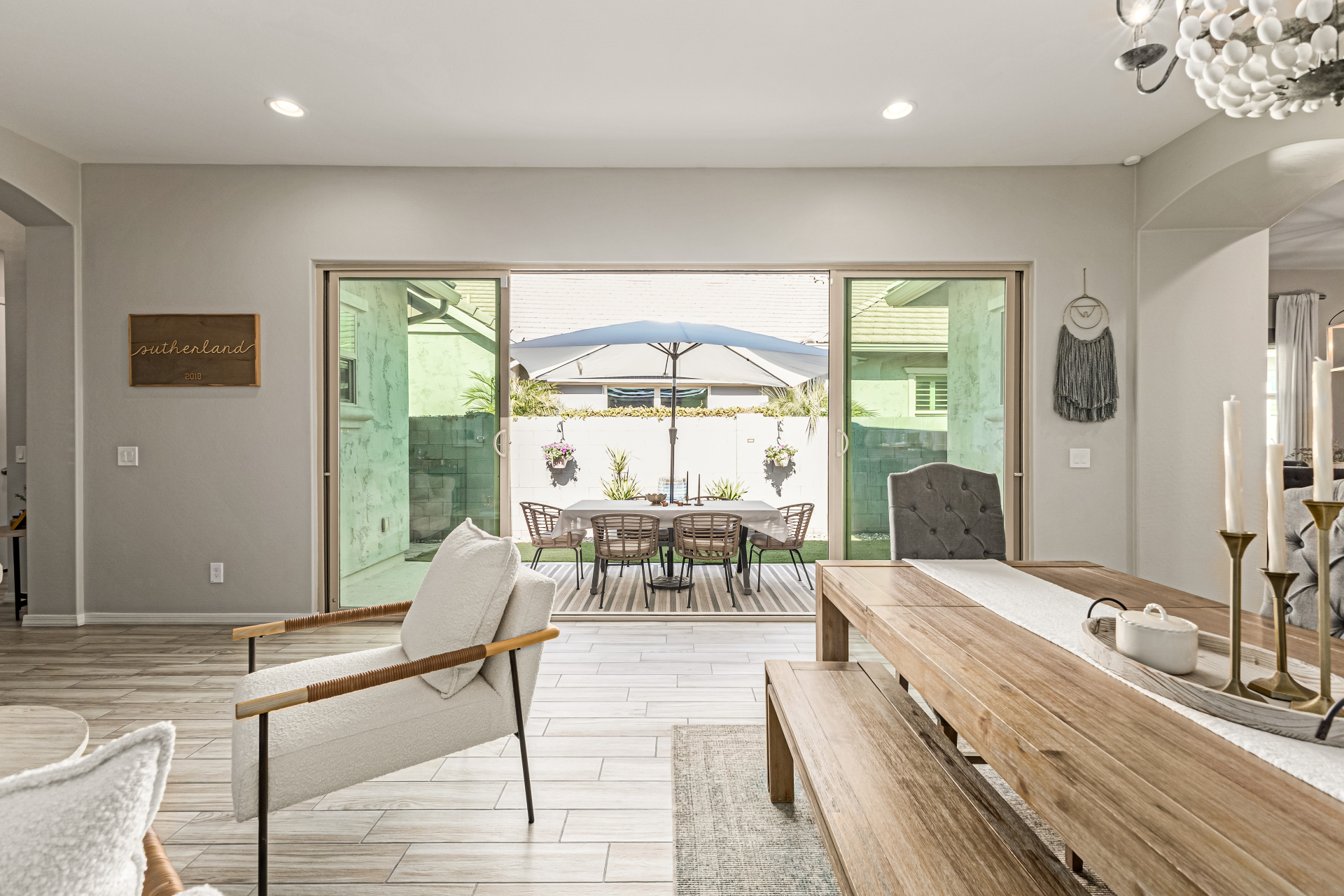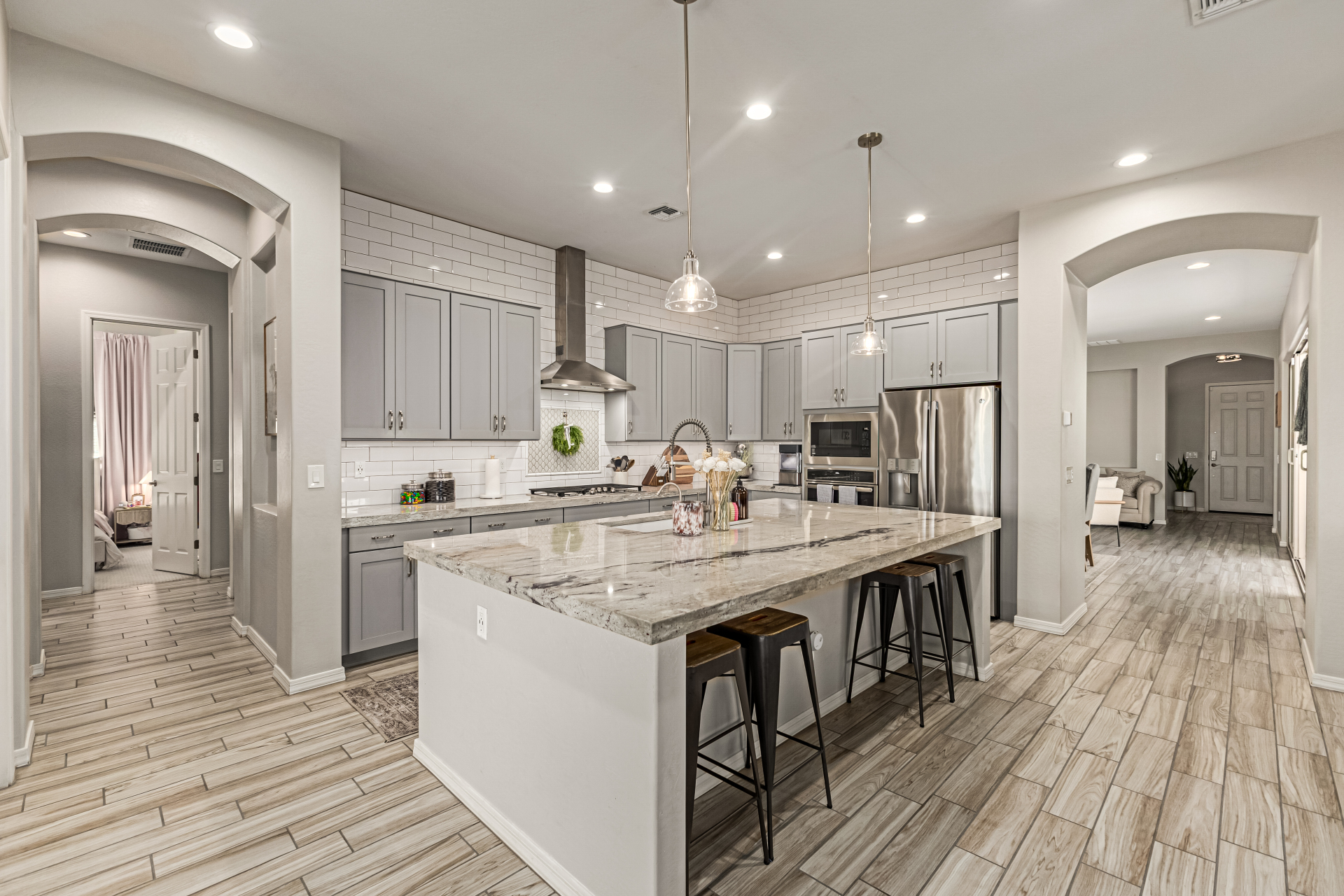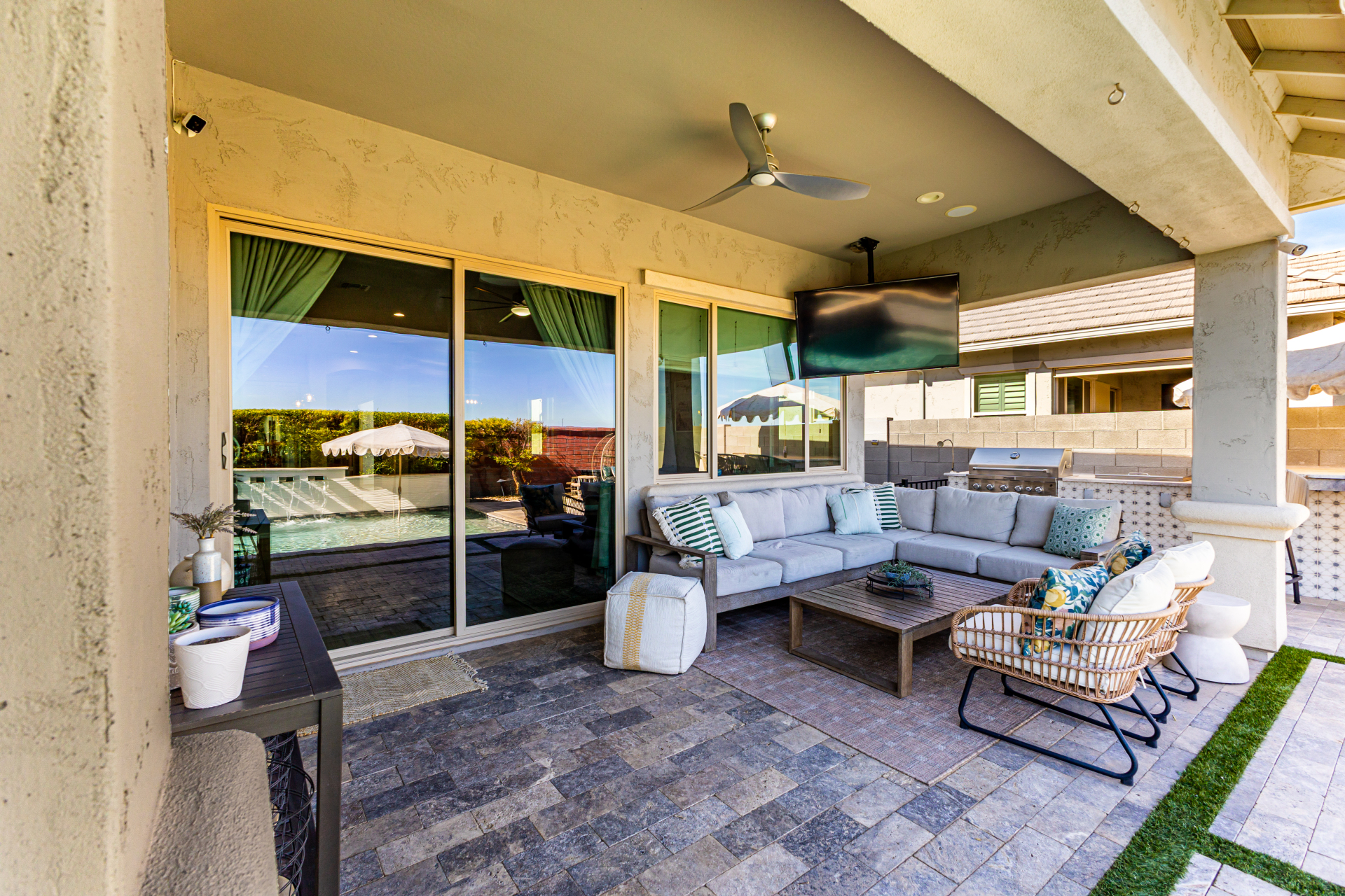 Modern luxury meets resort-style living in this stunning Gilbert home! Amazing single level plan features 4 beds+ den & 3.5 baths! Neutral tile floors & new carpet in bedrooms. The kitchen features an oversized island, gorgeous granite, gas cooktop, Insta-hot water, new dishwasher, custom cabinetry, coffee bar & beverage fridge. You'll love the family room with electric FP, surround sound speakers & views of the pool. The primary suite offers a fully updated spa-like bath w/ new counters, tiled shower w/ 3 shower heads & updated fixtures. Marble counters in guest baths. Enjoy a backyard oasis with a pool & spa (added in 2022), travertine decking & built-in gas BBQ--perfect for Arizona entertaining. Don't miss the putting green, patio misters, tankless water heater & overhead garage racks.