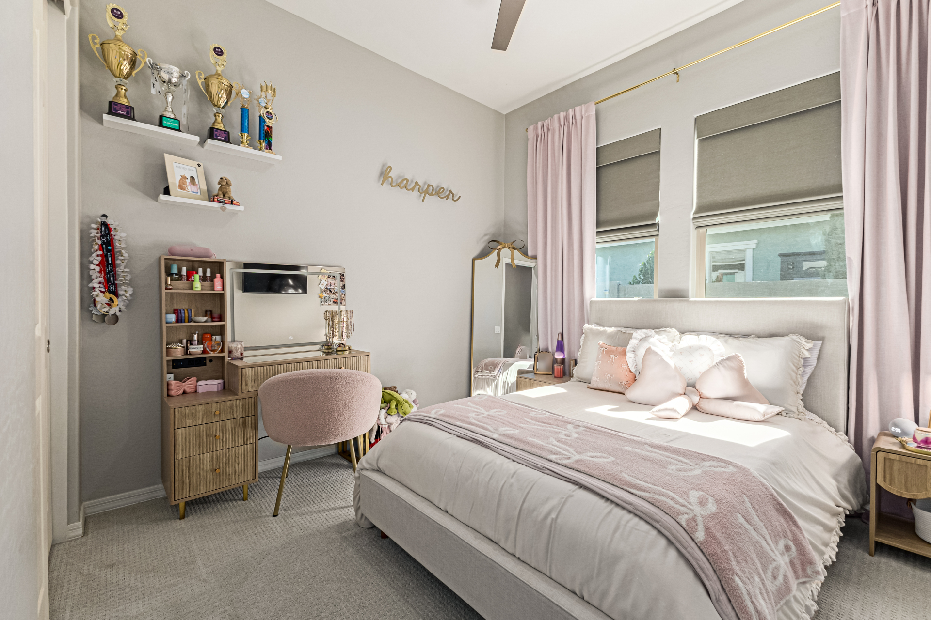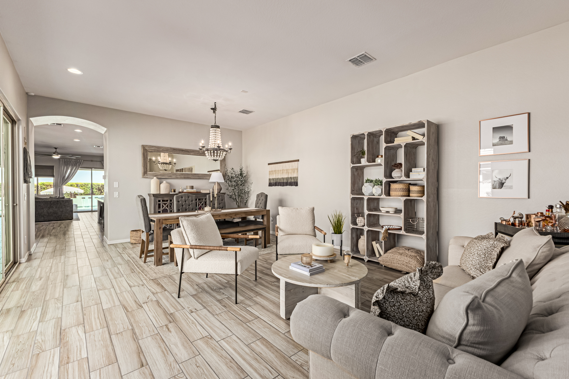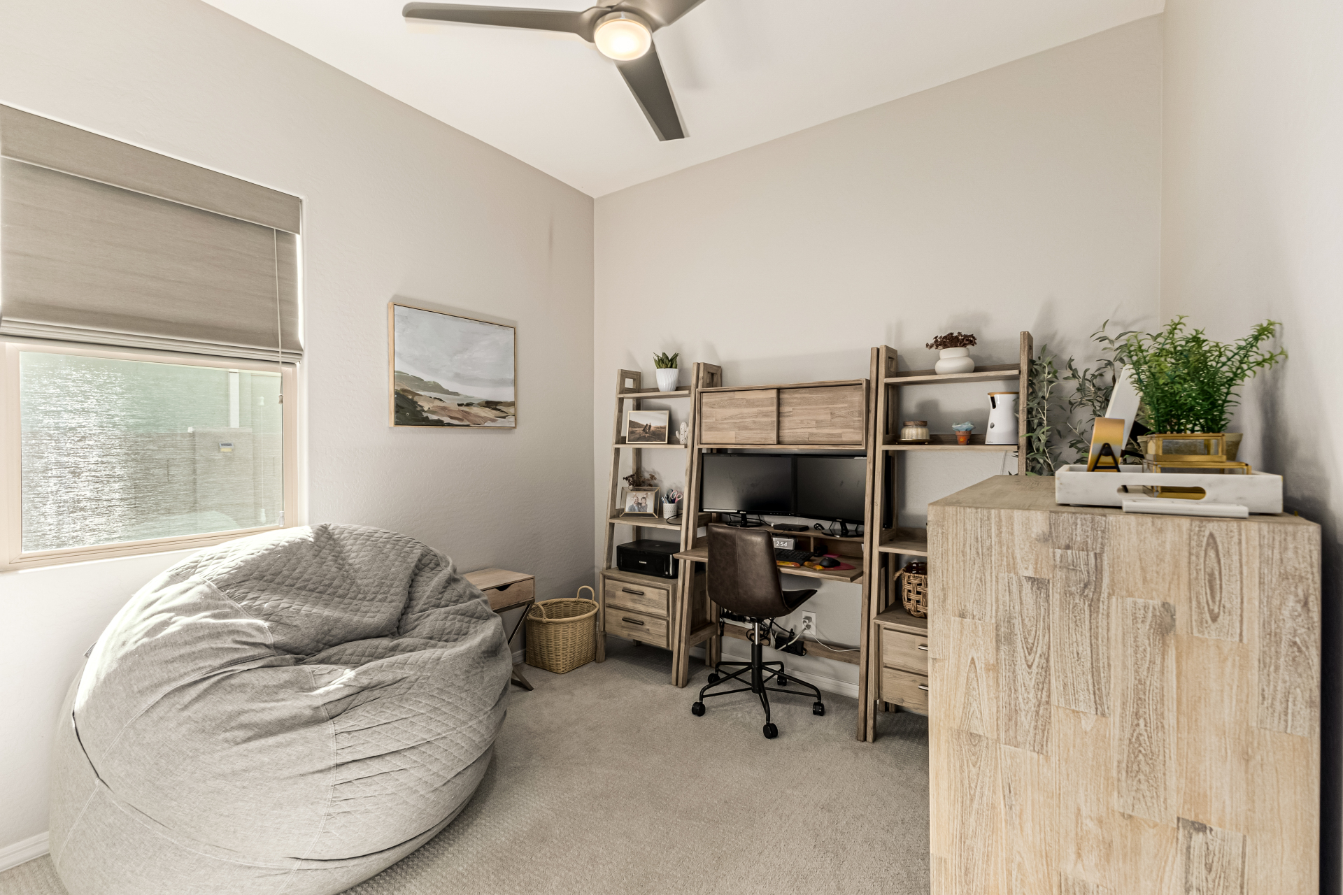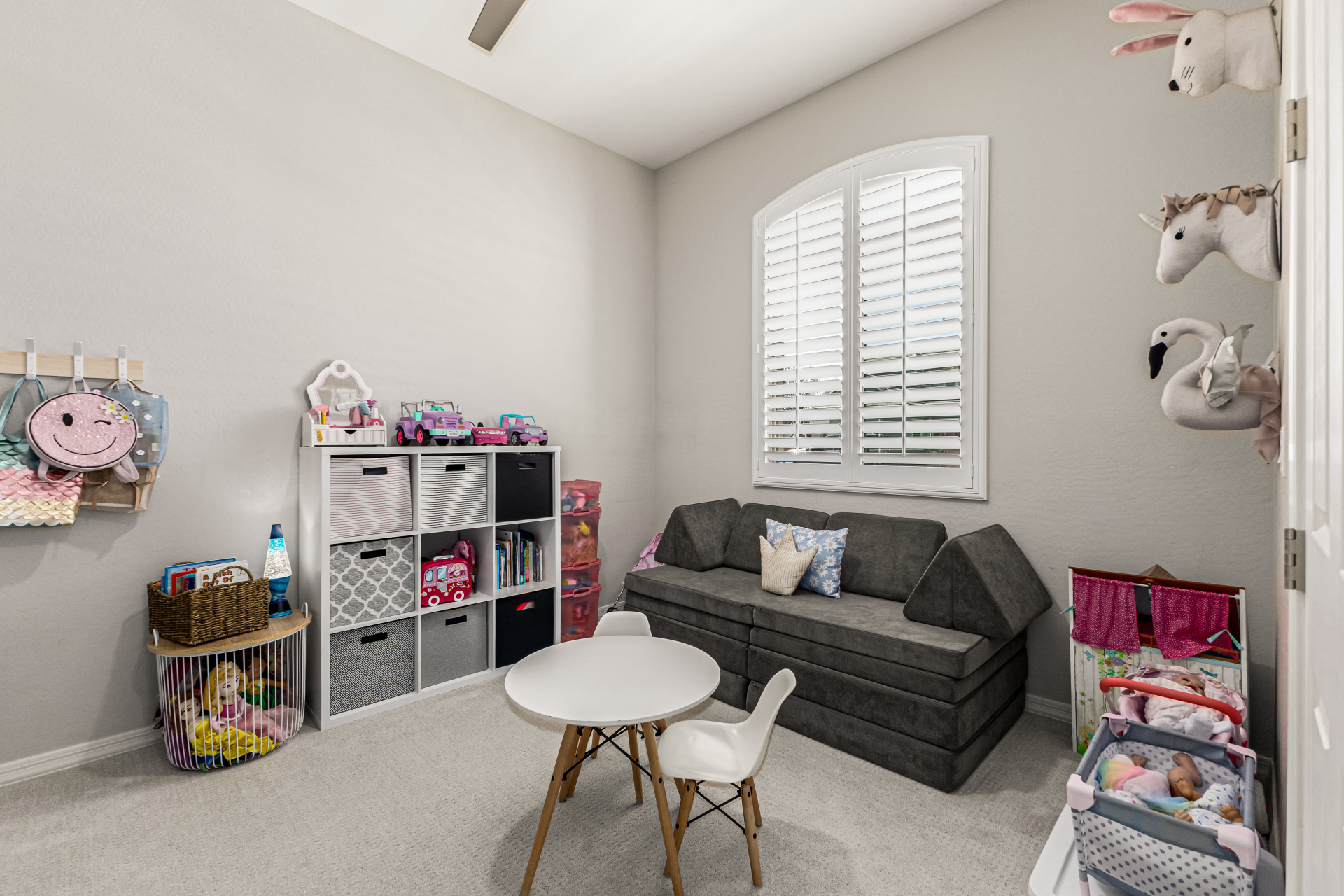 Modern luxury meets resort-style living in this stunning Gilbert home! Amazing single level plan features 4 beds+ den & 3.5 baths! Neutral tile floors & new carpet in bedrooms. The kitchen features an oversized island, gorgeous granite, gas cooktop, Insta-hot water, new dishwasher, custom cabinetry, coffee bar & beverage fridge. You'll love the family room with electric FP, surround sound speakers & views of the pool. The primary suite offers a fully updated spa-like bath w/ new counters, tiled shower w/ 3 shower heads & updated fixtures. Marble counters in guest baths. Enjoy a backyard oasis with a pool & spa (added in 2022), travertine decking & built-in gas BBQ--perfect for Arizona entertaining. Don't miss the putting green, patio misters, tankless water heater & overhead garage racks.