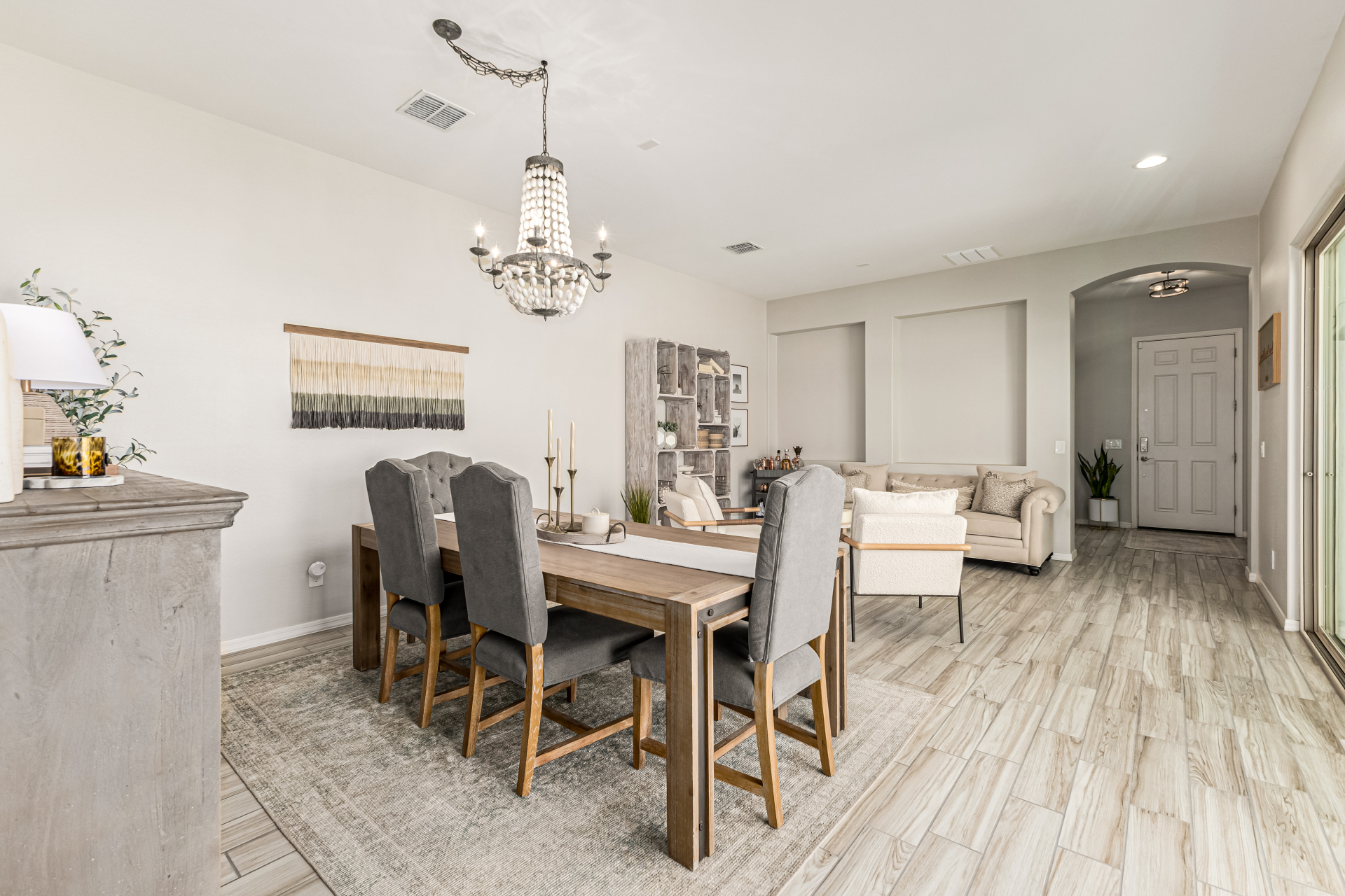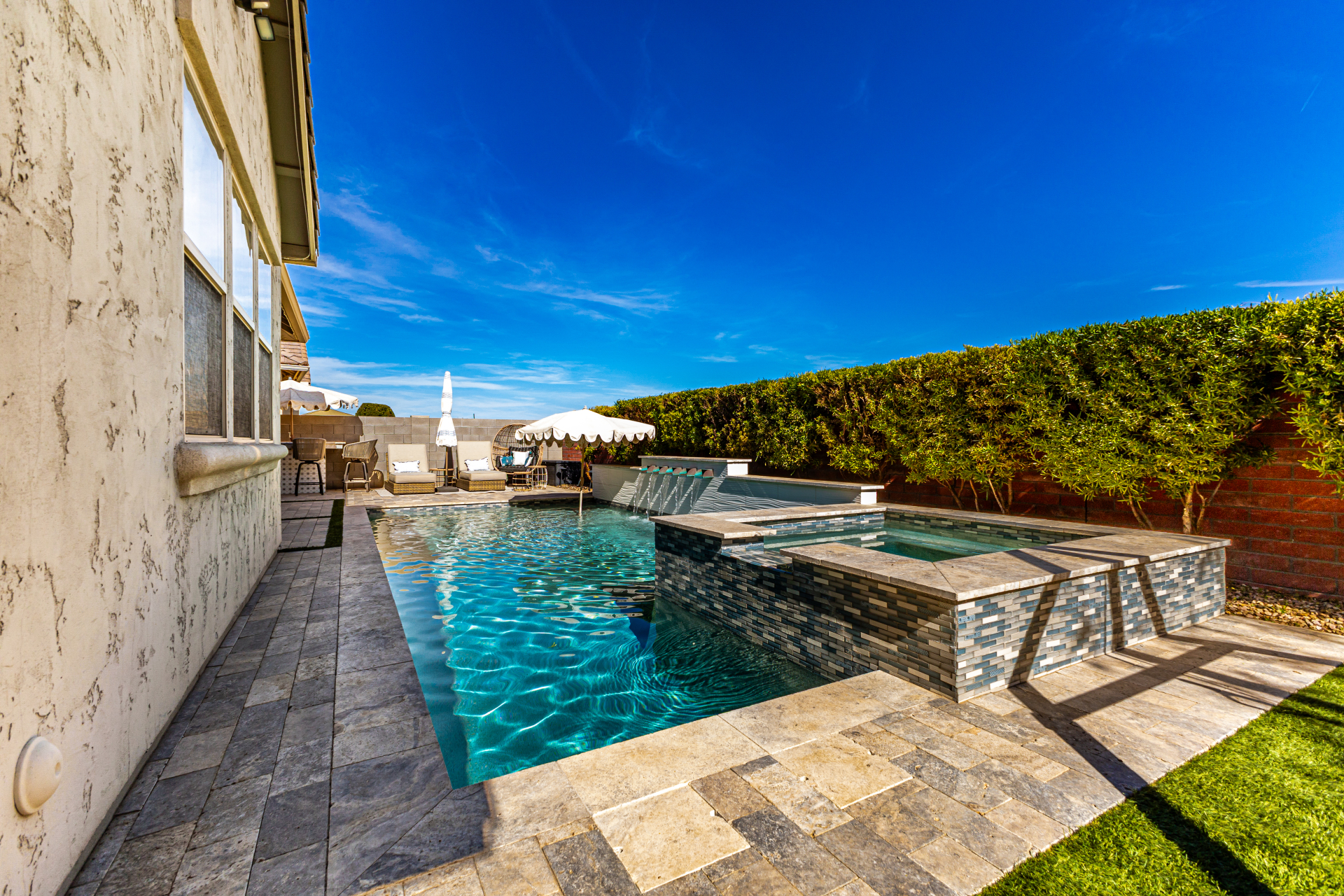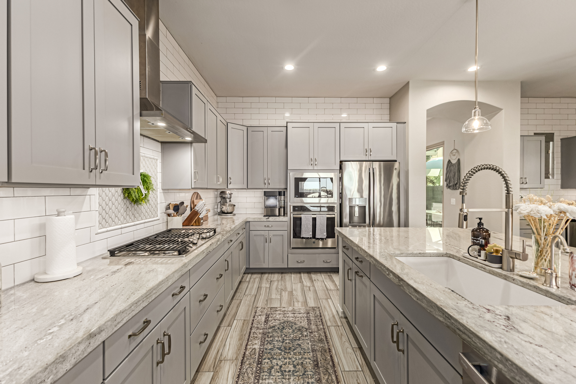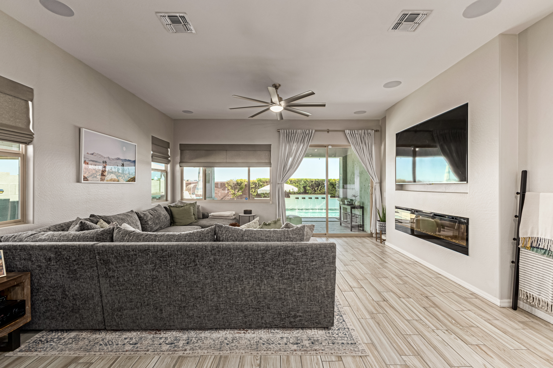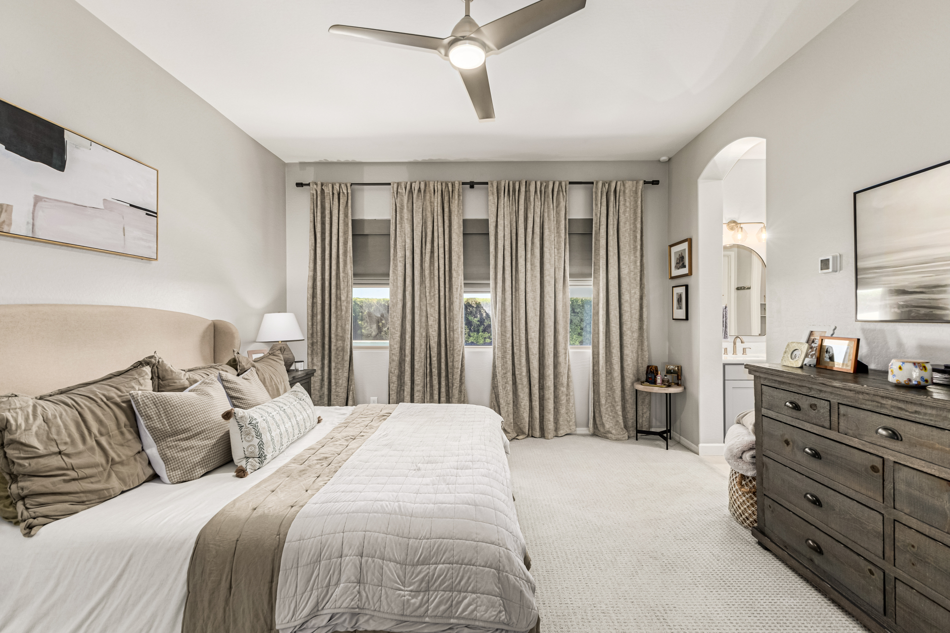 Modern luxury meets resort-style living in this stunning Gilbert home! Amazing single level plan features 4 beds+ den & 3.5 baths! Neutral tile floors & new carpet in bedrooms. The kitchen features an oversized island, gorgeous granite, gas cooktop, Insta-hot water, new dishwasher, custom cabinetry, coffee bar & beverage fridge. You'll love the family room with electric FP, surround sound speakers & views of the pool. The primary suite offers a fully updated spa-like bath w/ new counters, tiled shower w/ 3 shower heads & updated fixtures. Marble counters in guest baths. Enjoy a backyard oasis with a pool & spa (added in 2022), travertine decking & built-in gas BBQ--perfect for Arizona entertaining. Don't miss the putting green, patio misters, tankless water heater & overhead garage racks.