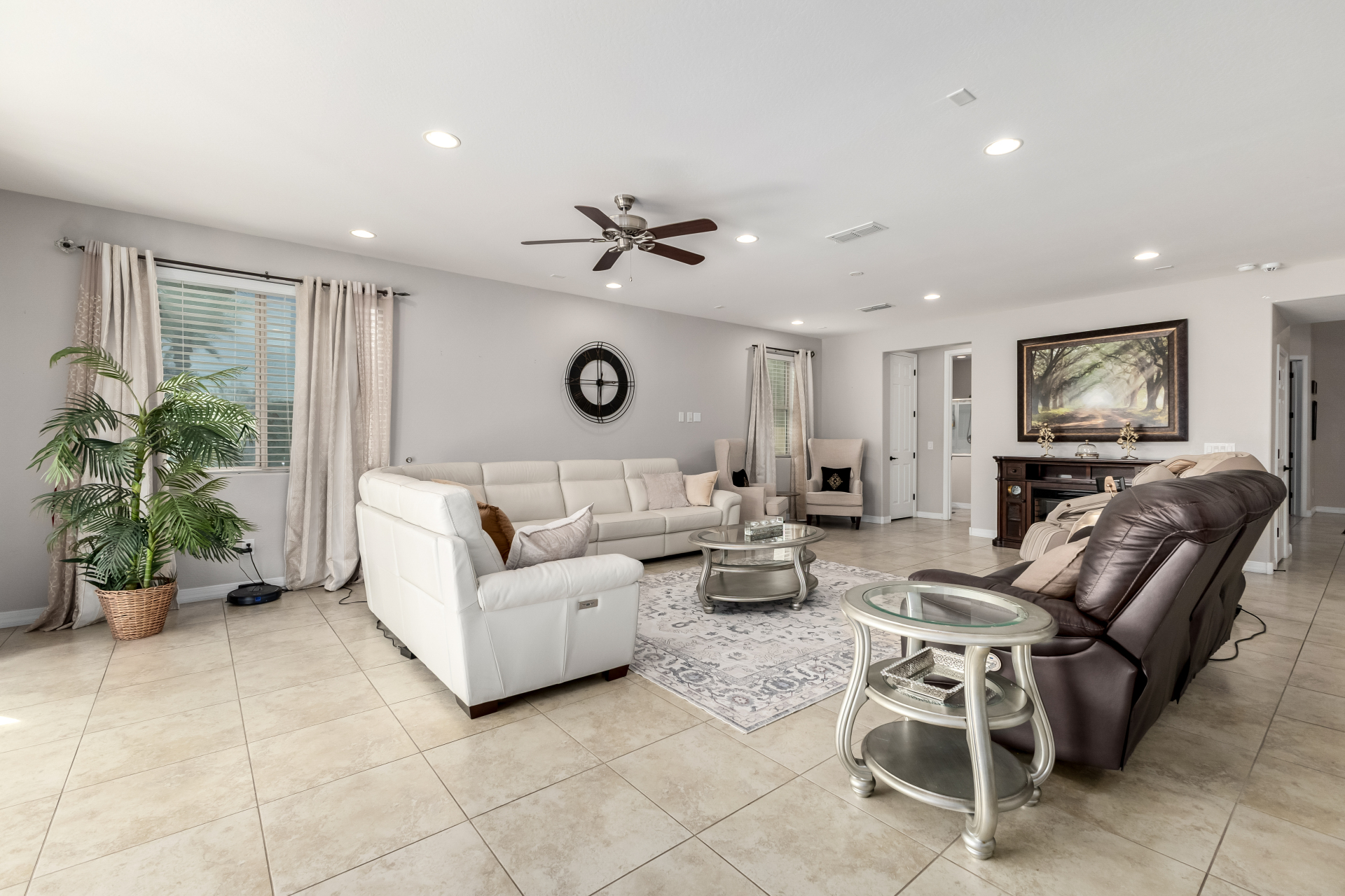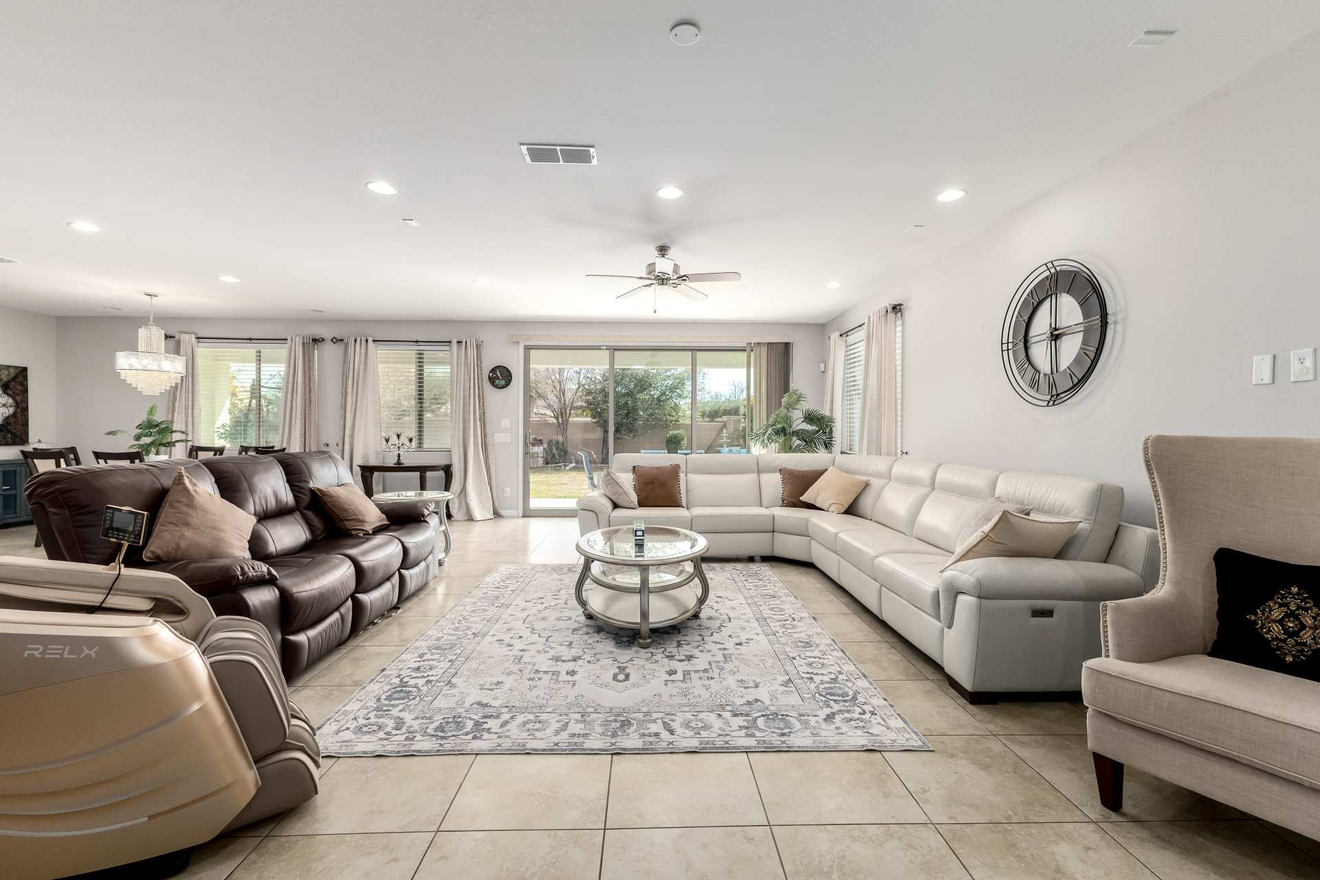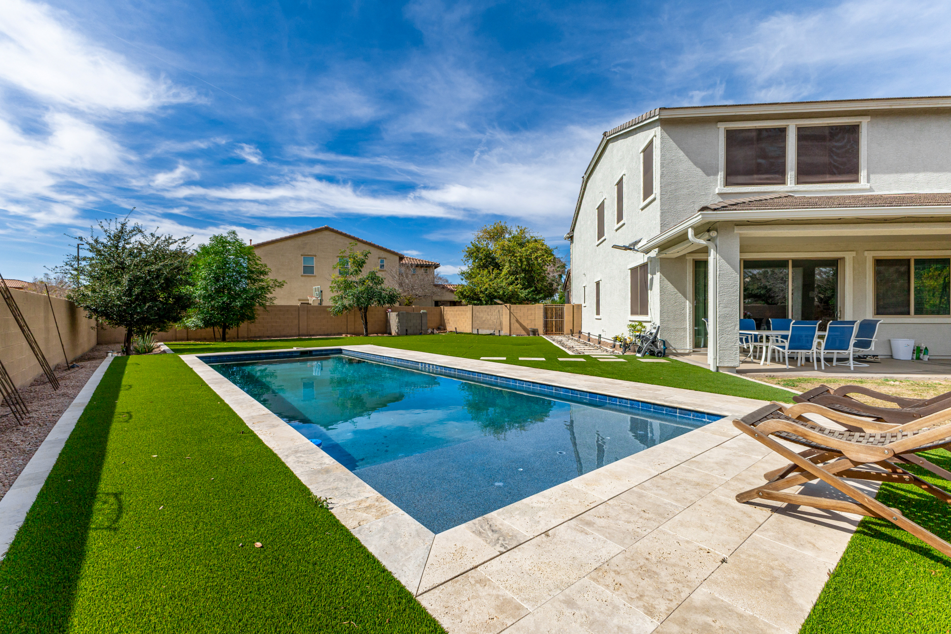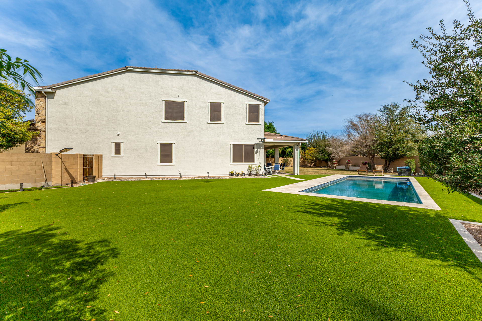 This stunning six bed, four bath home is located in the highly desirable Lyons Gate community of Gilbert and sits on an impressive 14,476 sq ft lot, nearly one-third of an acre. The backyard is an entertainer's dream featuring a crystal clear play pool and turf installed in 2023, beautifully landscaped yards with a mix of synthetic turf and natural grass, large covered patios in both the front and back, an RV gate, and a four-car tandem garage. Inside features an oversized kitchen with stainless appliances, two dishwashers, a butler's pantry, soft water, and reverse osmosis. Tile flooring in main areas and carpeted bedrooms. Spacious layout with multiple living areas and ample storage throughout. Major updates include new exterior paint, February 2026 and a water heater replaced in 2023.