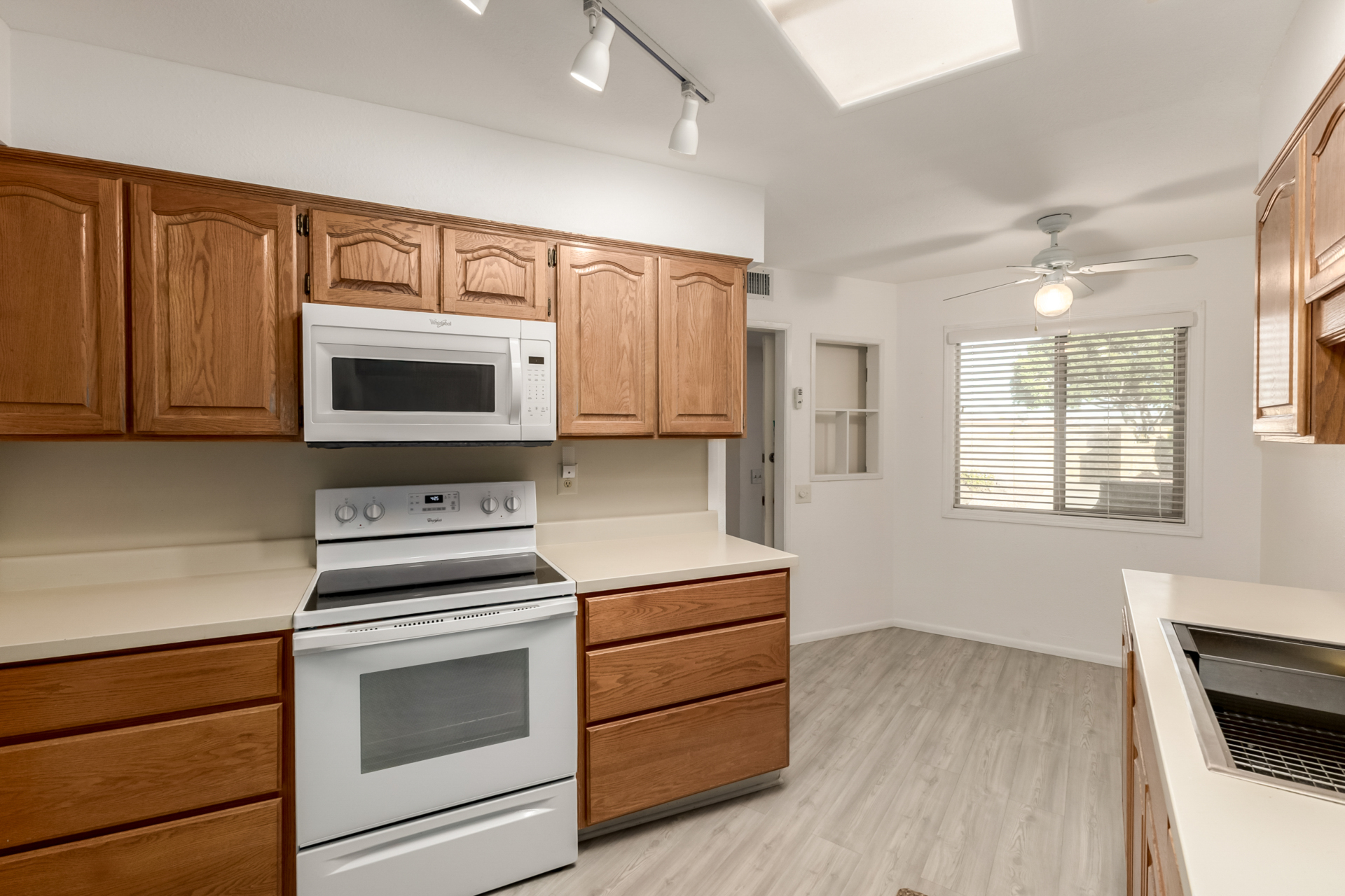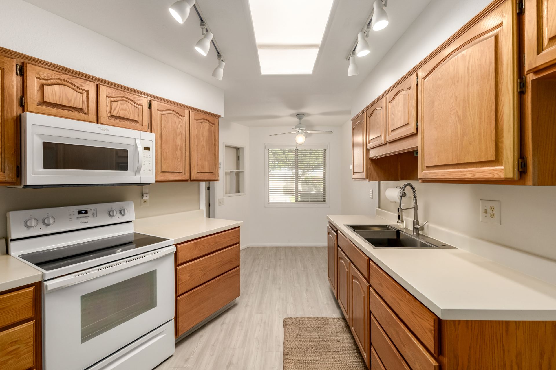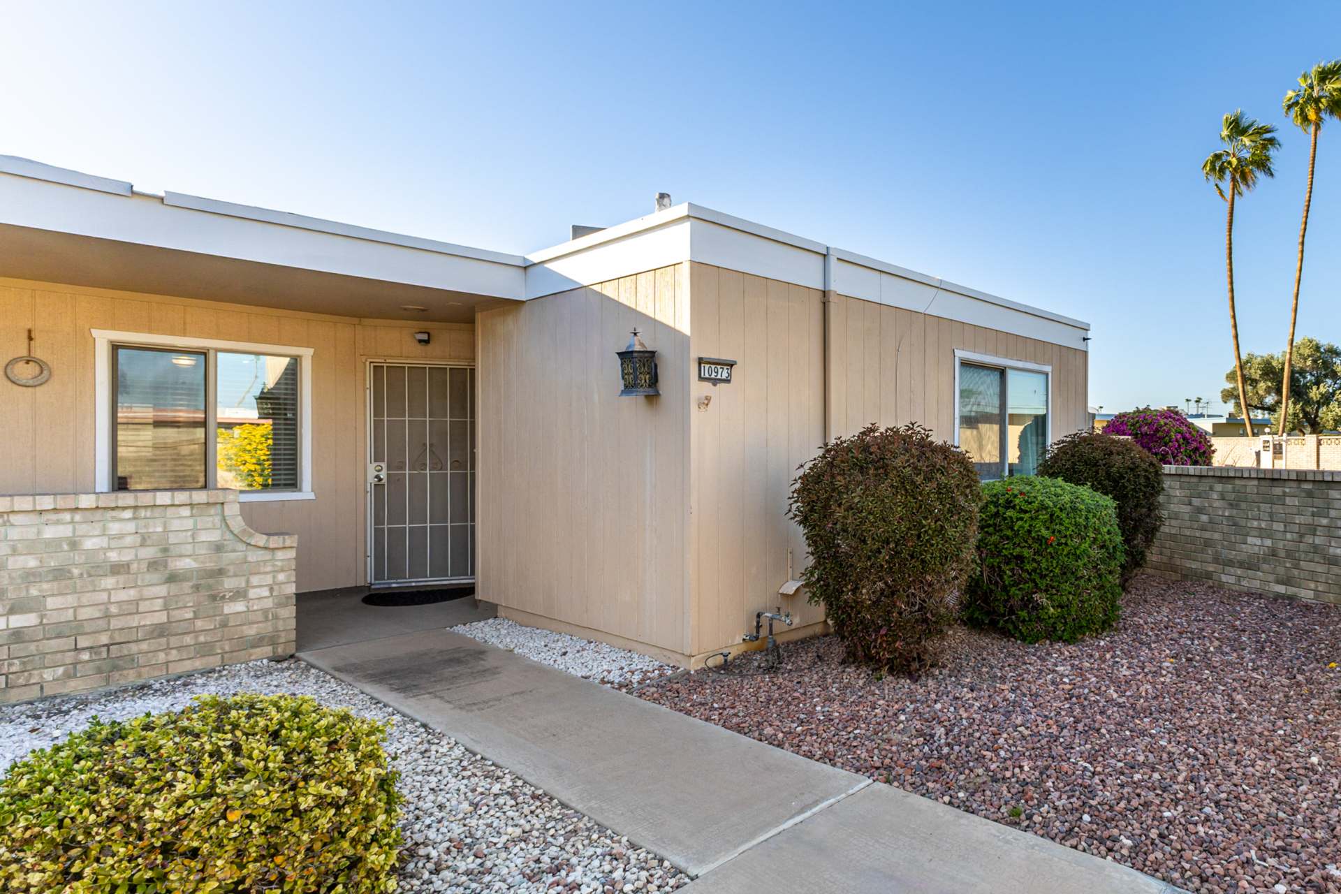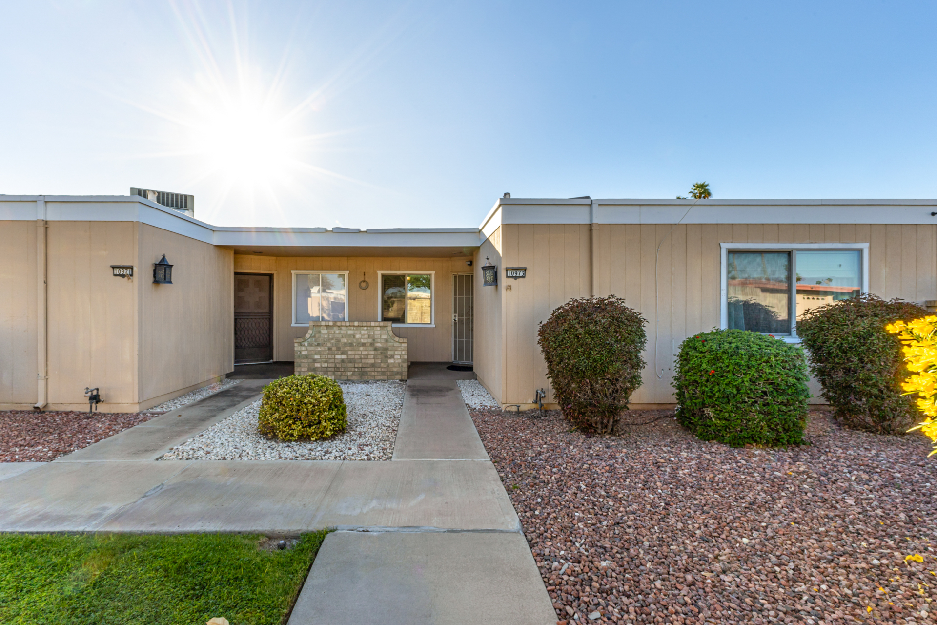 A charming 2 bed, 1 bath townhome in Sun City is now for sale! Featuring a sizeable front yard and a 1 car garage, this end-unit gem is sure to be the one for you! Inside you will find a large dining & living area w/high ceilings, perfect for entertaining. Elegant wood-look flooring, soft carpet in all the right places, skylights, and neutral palette throughout! The kitchen comes equipped w/ample cabinetry, plenty of counter space, built-in appliances, a pantry, track lighting, and a breakfast nook. Double doors open up to the primary suite, showcasing a walk-in closet for all your belongings. Lastly, the large covered patio is the perfect place for spending a relaxing summer evening! What are you waiting for? Don't miss out!